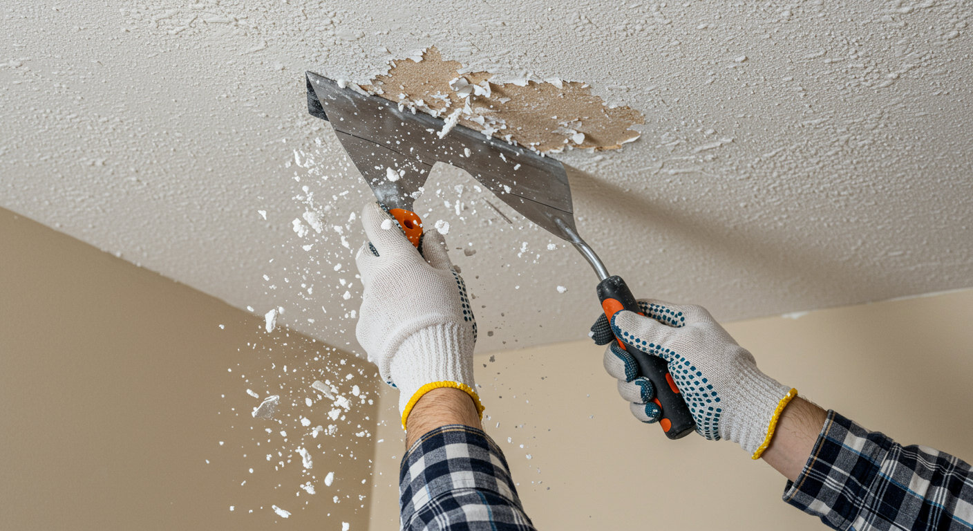 Smoothing your ceiling’s texture with a scraper isn’t the most fun way to spend a weekend, but the payoff is worth it.