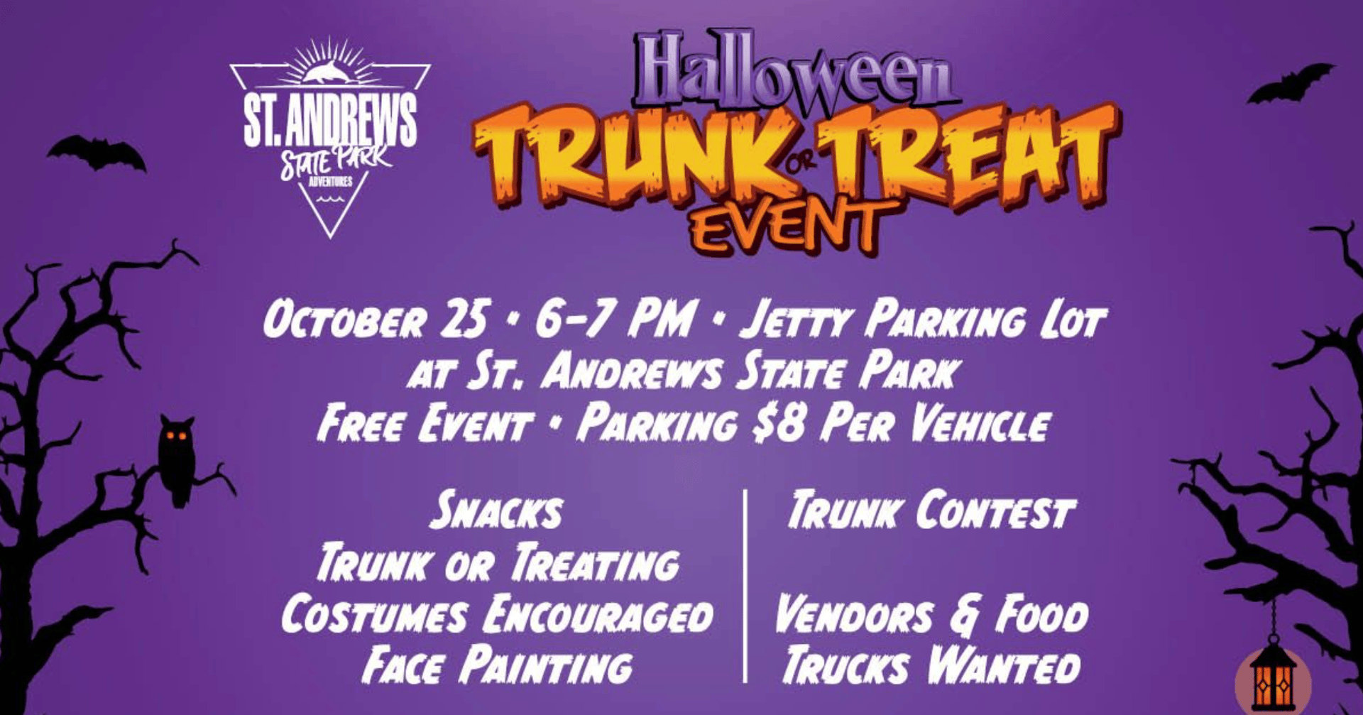 Celebrate Halloween under the stars at St. Andrews State Park with a fun, family-friendly Trunk-or-Treat on October 25 from 6–7 PM in the Jetty Parking Lot. Enjoy decorated trunks for trick-or-treating, face painting, games, snacks, and a trunk decorating contest. Costumes are encouraged, and parking is $8 per vehicle. This free-entry event promises a safe and spooktacular evening for all ages! More information can be found