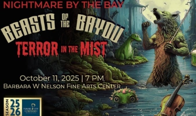 Step into the eerie world of Nightmare by the Bay – Beasts of the Bayou: Terror in the Mist, an immersive Halloween experience blending folklore, original storytelling, and haunting symphonic music conducted by Sergey Bogza and performed by the Panama City Symphony Orchestra. Now in its third season, this production brings costumes, cinematography, and epic performances together to create a thrilling journey through the mysterious and spooky bayou—perfect for fans of suspense, spectacle, and seasonal chills. Costumes are optional, but encouraged for those ready to embrace their inner beast. Tickets can be purchased