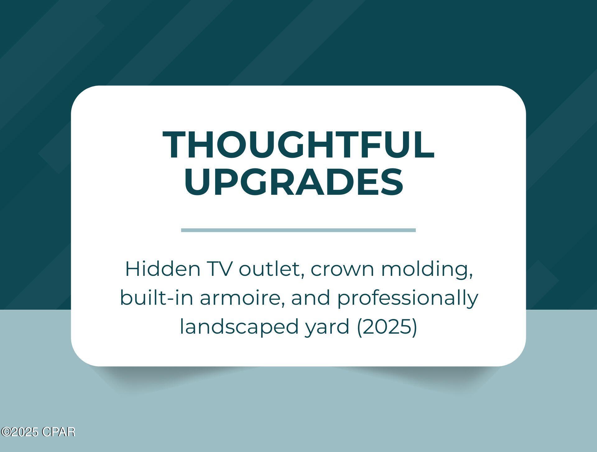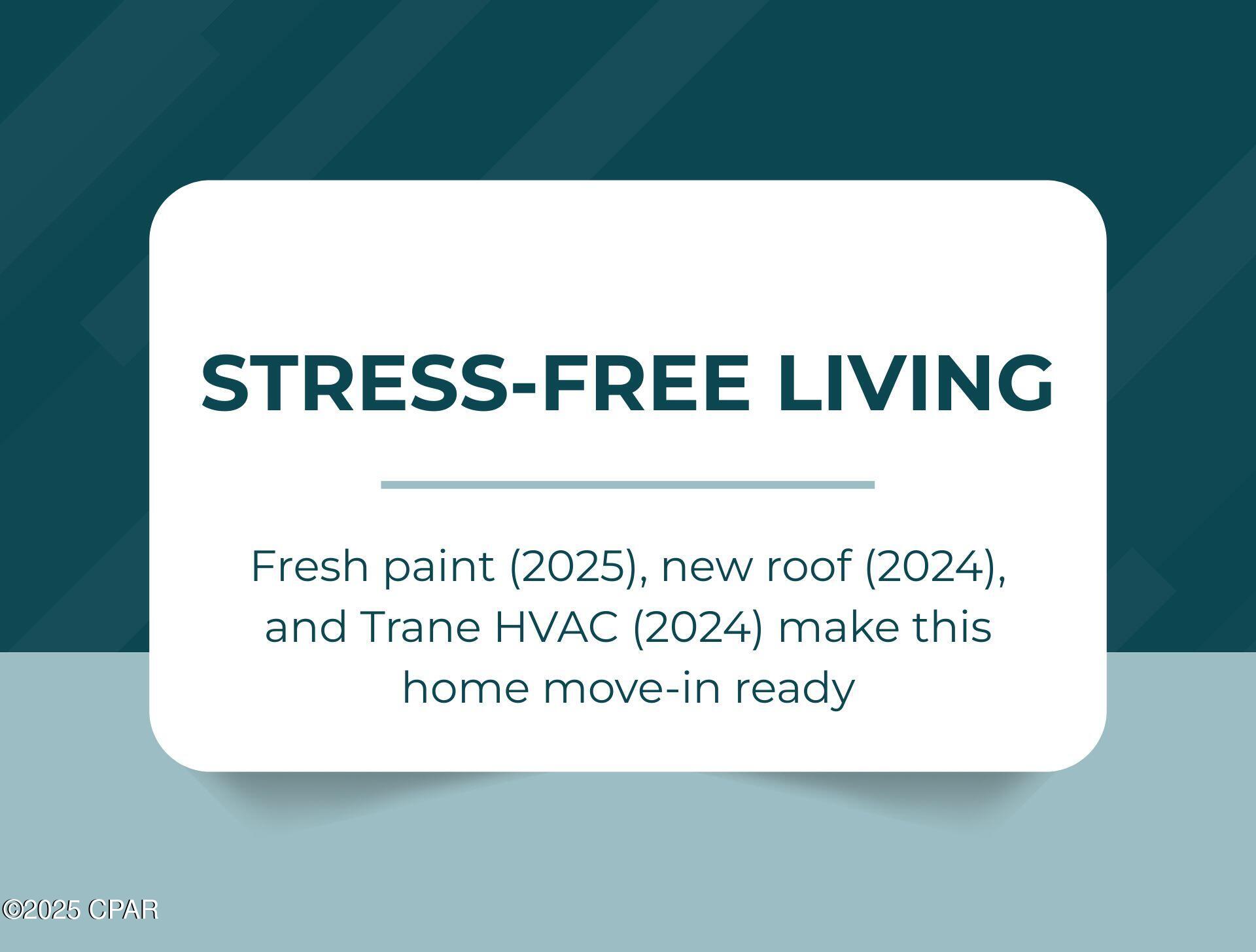 CURRENTLY UNDER CONTRACT, SELLER WILL CONSIDER BACKUP OFFERS **3.625% ASSUMABLE VA LOAN** This beautifully updated home is exceptionally maintained, move-in ready, and packed with thoughtful upgrades. Situated on a spacious .34-acre corner lot in Palmetto Trace, you're just minutes from Pier Park, Frank Brown Park, and the white sand beaches of Panama City Beach. Inside, you'll find 2,351 square feet of living space with a smart split-bedroom layout that offers both comfort and privacy. The primary suite features a large walk-in closet with built-in armoire, a garden tub, separate walk-in shower, bidet toilet, water closet, and generous linen storage. Across the home, two guest bedrooms share a full bath. Two versatile bonus rooms upfront offer endless possibilities - use them as home offices, play or media rooms, or extra guest quarters. The open-concept family room connects to the kitchen and breakfast area, all freshly painted in 2025 and designed for everyday ease and entertaining alike. The kitchen features under-cabinet lighting that brightens prep space and adds a modern touch, while a hidden outlet behind the family room TV and under the couch keeps cords tucked away. Crown moulding adds a polished finish throughout. Step outside to a fully fenced backyard oasis - professionally landscaped in 2025 and enclosed with a newer vinyl privacy fence (2023). The coated sandstone patio features three new fan/light fixtures, a hot/cold outdoor shower, and is already wired for cable TV. Additional updates include a new roof (2024) and new Trane HVAC system (2024). The oversized two-car garage is a true standout with epoxy flooring, multiple storage closets, a dedicated closet for hurricane shutters and the water heater, plus pull-down stairs leading to a large, walkable attic. Located in the golf cart-friendly community of Palmetto Trace, this home sits on a premier corner lot just across from the community pool. With low quarterly HOA dues, sidewalks, pet-friendly walking areas, and access to two resort-style pools, you can truly enjoy the best of coastal living - without ever needing to start the car. See it for yourself today!
