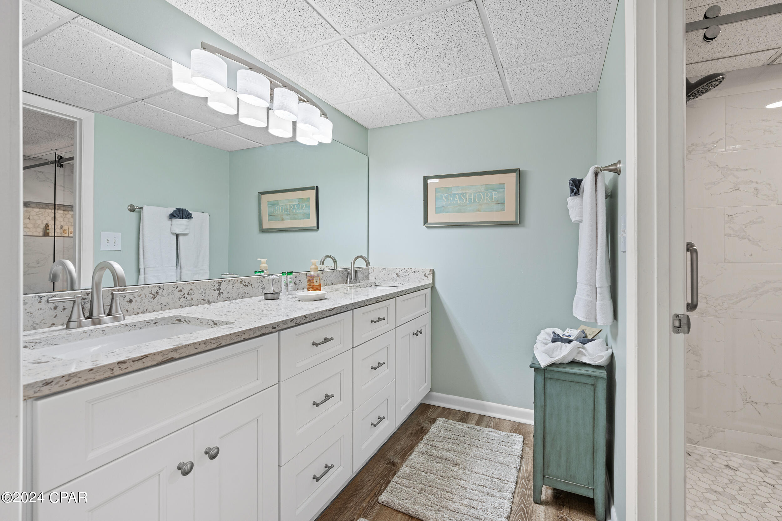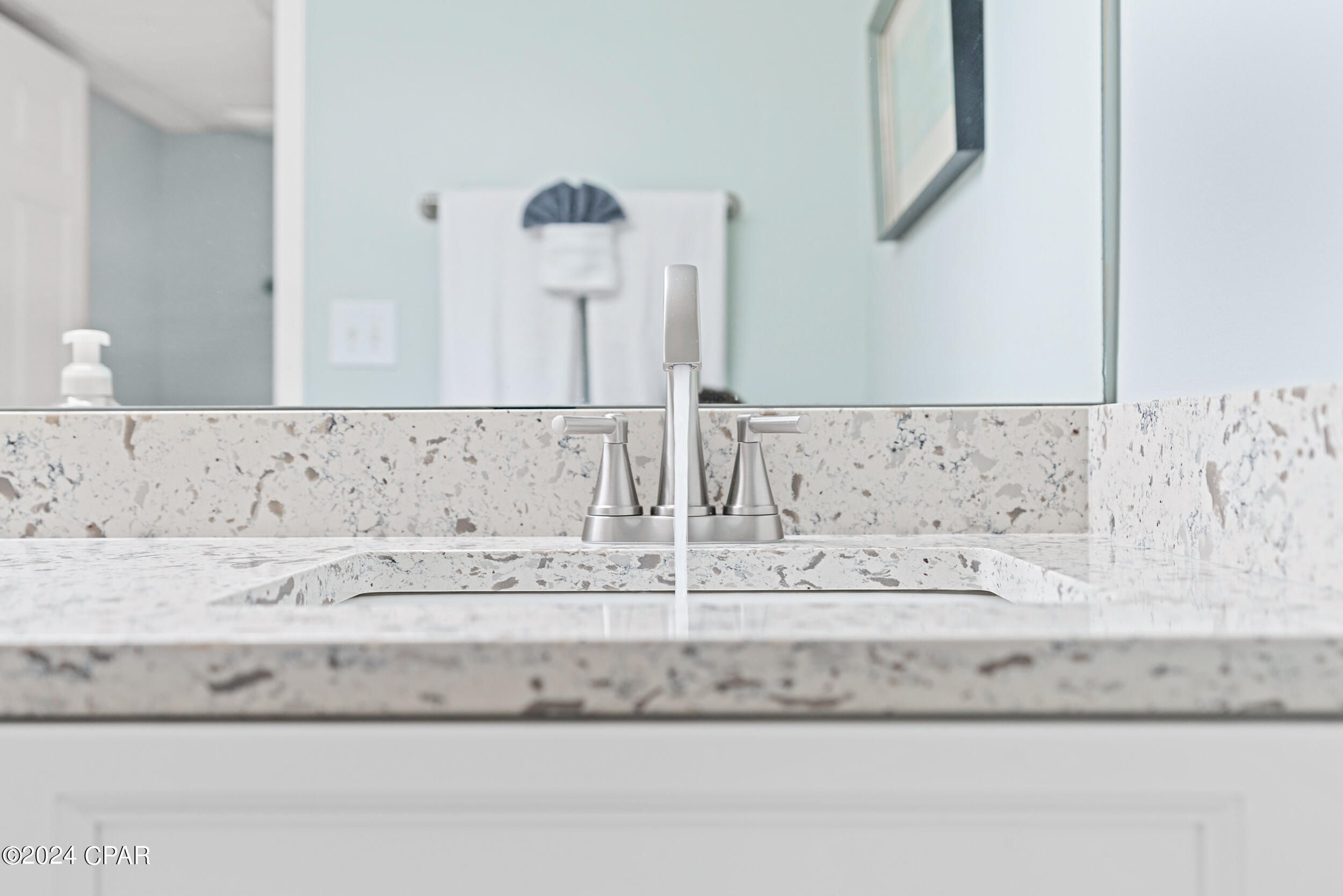 Floor-to-ceiling glass offers breathtaking views of the Gulf from anywhere in the condo, whether you are in the open living area or in one of the bedrooms. The master bedroom, with a king-sized bed and mattress that were changed last year, offers a comfortable retreat; the second bedroom comes with two full beds. Both bedrooms have ensuite baths featuring quartz countertops, double vanities and stainless steel fixtures. The master bathroom has a walk-in shower with custom tile.