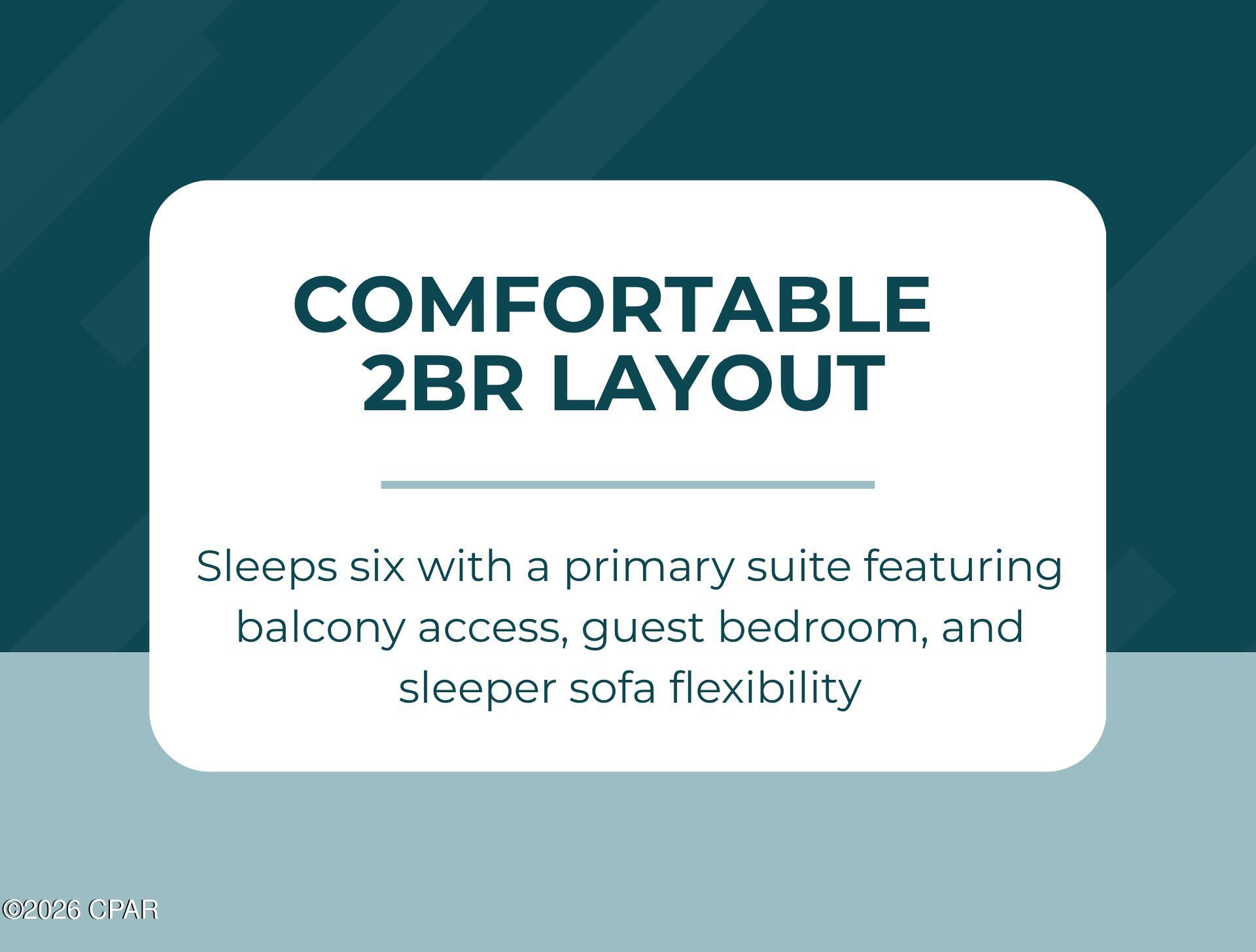 The 2BR/2BA layout comfortably sleeps six, with a primary suite featuring an ensuite bath and direct balcony access, a guest bedroom, and a sleeper sofa in the living area. Both bathrooms include tub/shower combinations, offering flexible arrangements for owners and guests alike.