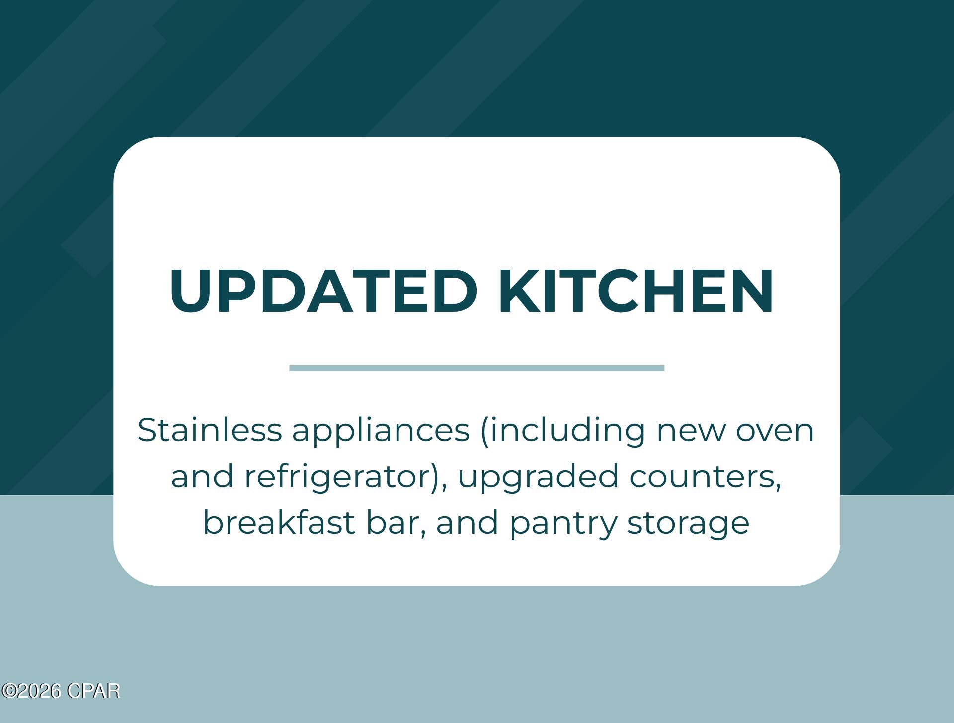 The kitchen is well-appointed with stainless steel appliances, including a new oven and refrigerator purchased this year, along with upgraded countertops, sinks, and electrical at the island. A breakfast bar and pantry provide additional seating and storage, enhancing the practicality and comfort of the space. A stacked washer and dryer in the unit adds everyday convenience.