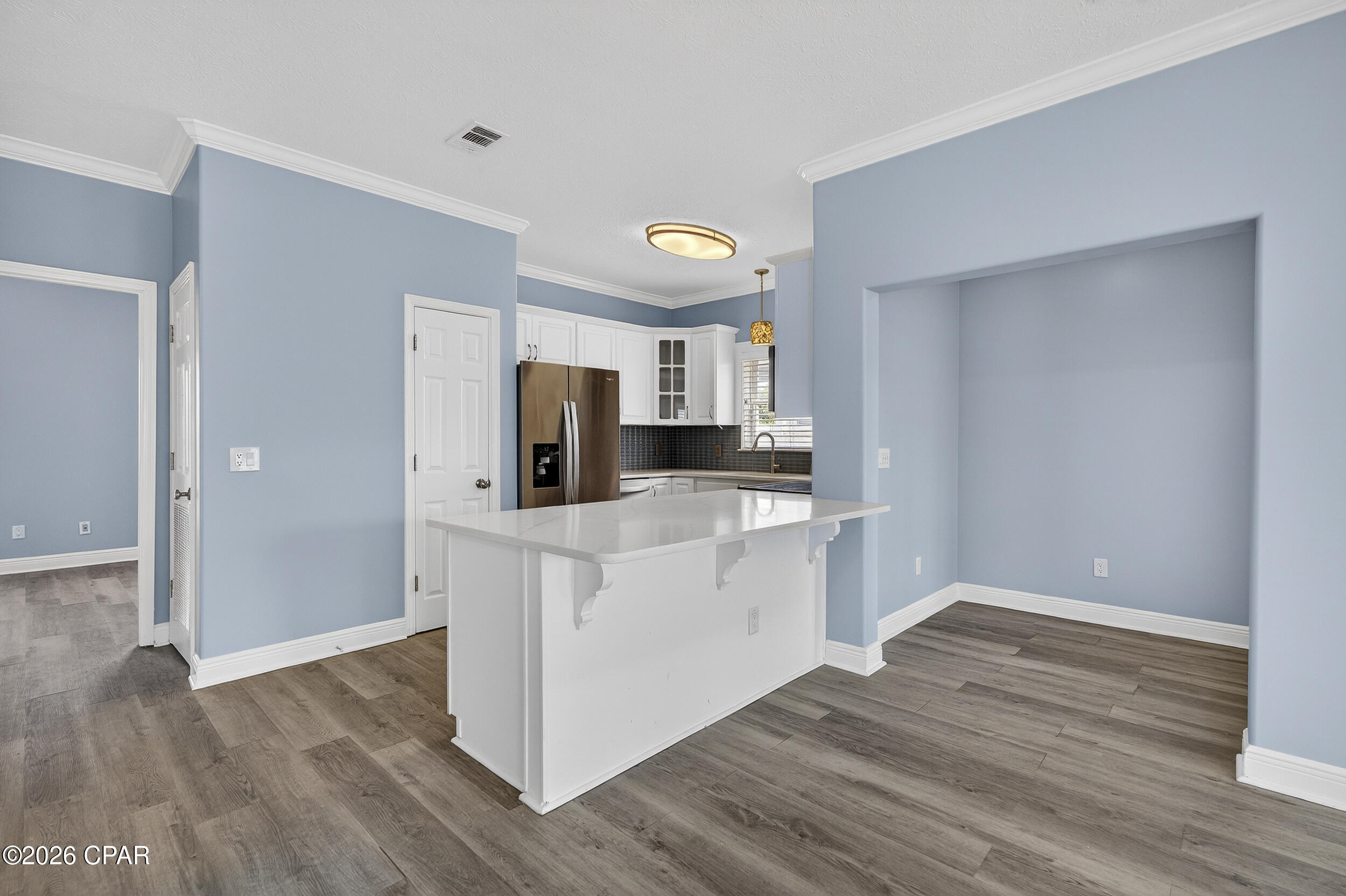 Designed for effortless coastal living, this 3BR/3BA two-story home features a bright, open layout with 9-foot ceilings, abundant natural light, and a durable metal roof. Updated 9'' luxury vinyl plank flooring runs throughout, delivering the look of hardwood with the durability and low maintenance ideal for a beach home or rental property. The living, dining, and kitchen areas flow seamlessly, creating a comfortable and inviting space. The kitchen is well-appointed and functional, featuring quartz countertops, a wave-textured backsplash, stainless steel appliances, and a breakfast bar for casual dining.