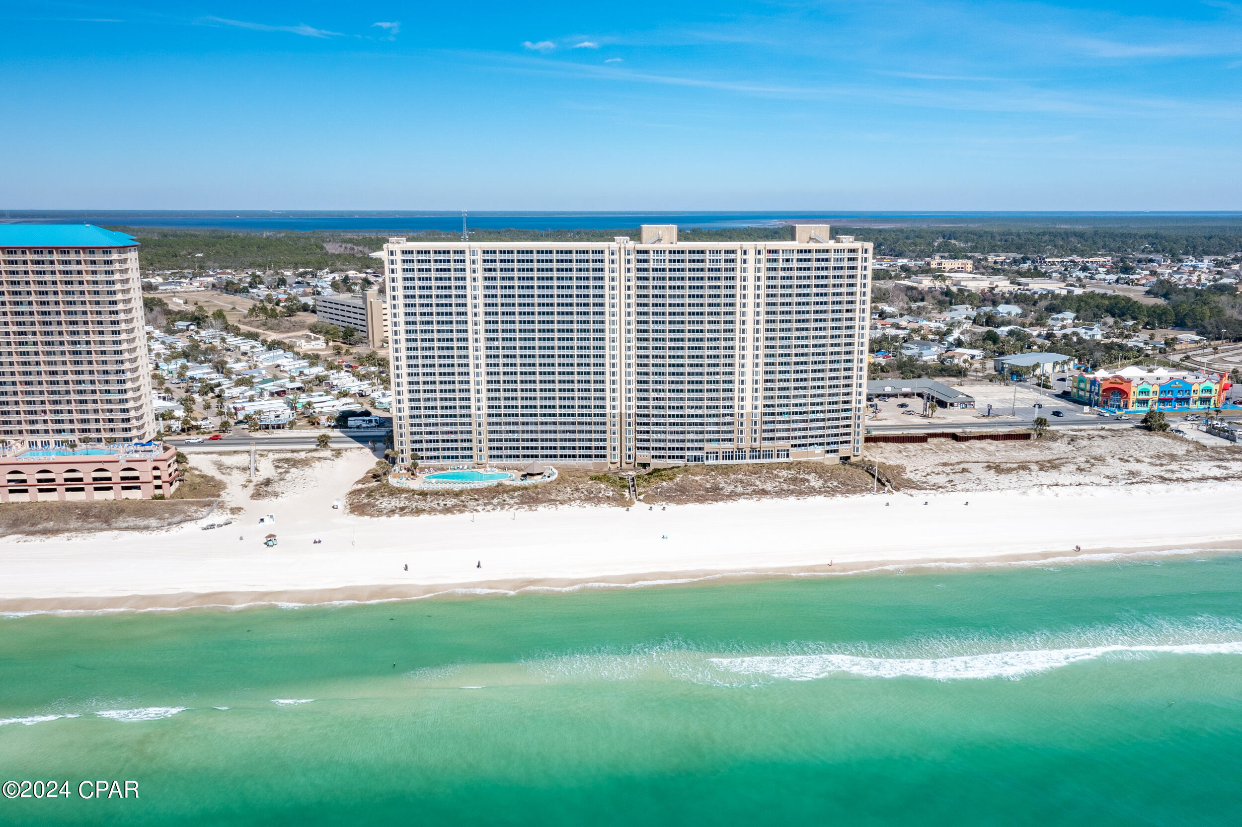 This property has sold! Discover similar listings by reaching out to us for an updated list of available properties that match your preferences. *END-UNIT, LOW-FLOOR** Escape to the beach with this fantastic 2BR/2BA+BUNKS condo at Emerald Beach Resort. Situated on a low floor, this end-unit condo offers quick and easy access to the beach and resort amenities, sparing you the hassle of lengthy elevator waits. Take in the sweeping panoramic views from sunrise to sunset of the Gulf from the master bedroom, open-plan living area, and covered private balcony. Fully-tiled for effortless maintenance, this condo comes fully furnished, accommodating up to 8 guests comfortably. The master bedroom boasts a spacious ensuite bathroom complete with a soaking tub and separate shower; the hall bunk area and second bedroom ensure ample sleeping space for all. Granite countertops adorn the kitchen, complemented by modern appliances, while a stacked LG washer/dryer in the laundry room adds convenience. Emerald Beach Resort is directly on the beach and conveniently close to Pier Park and many of Panama City Beach's popular dining, entertainment, and shopping establishments. Despite its proximity to everything, you might find you'll never even need to leave the resort for a perfect beach getaway. Emerald Beach's wealth of amenities includes three pools (one gulf-front and a kiddie pool for the little ones), hot tubs, a beachside tiki bar, an onsite Starbucks, a fully-equipped fitness center, a convenience store, and a sky bar...all promising endless opportunities for fun and relaxation. With its prime location and exceptional features, this end-unit condo is not just a great rental property - it's a gateway to unforgettable vacation experiences. Schedule your viewing today and experience the joy of owning at the beach.