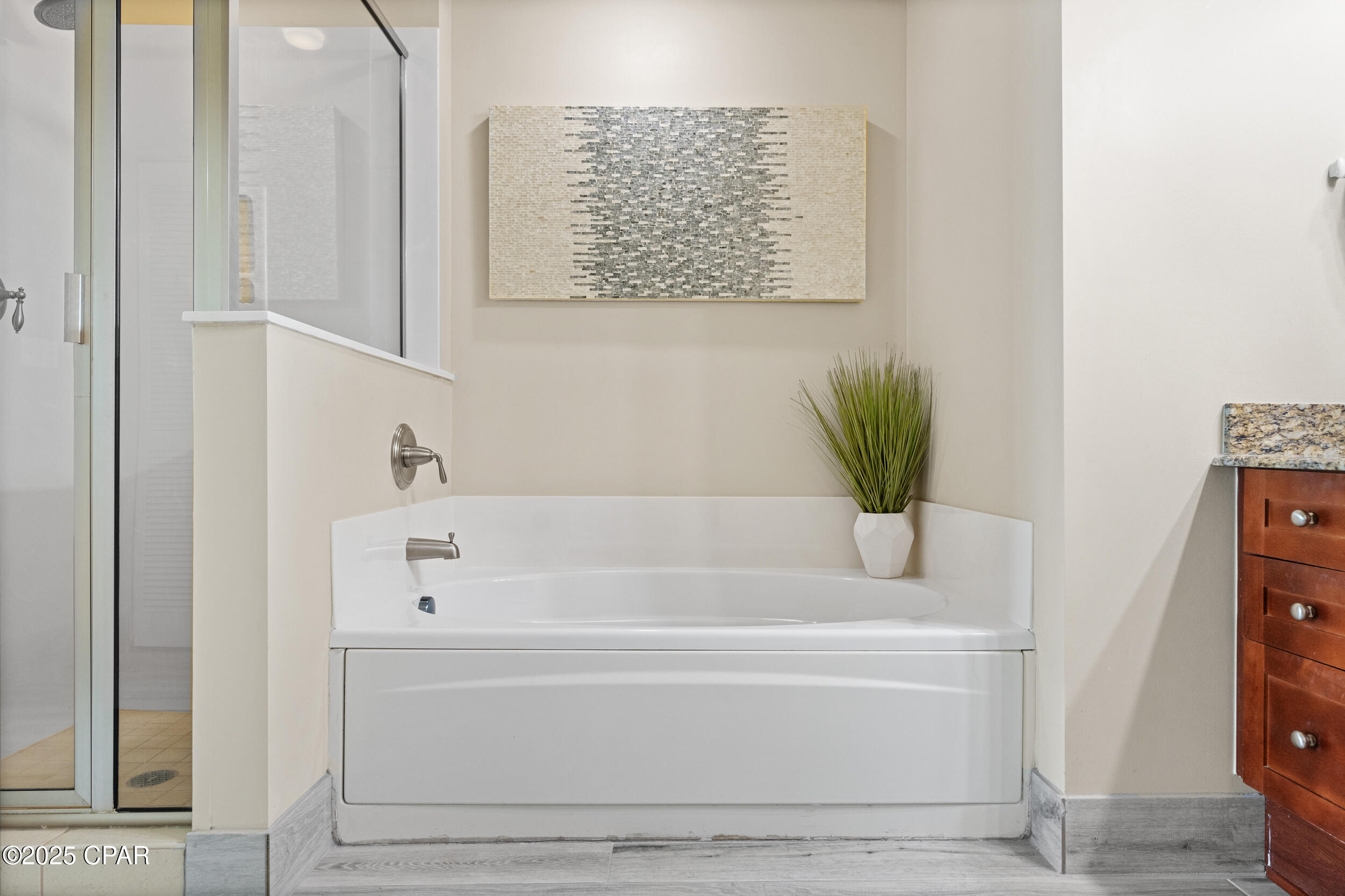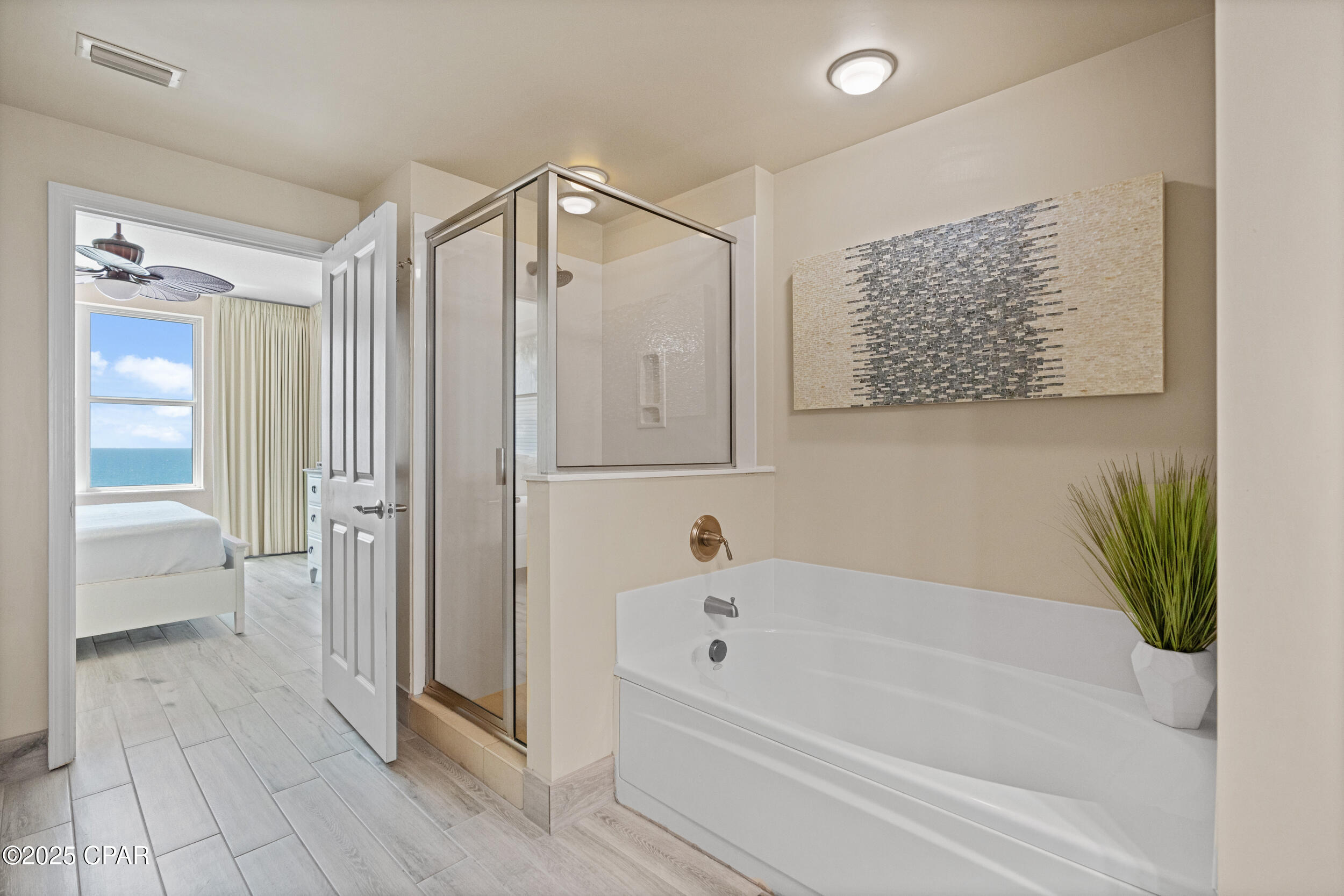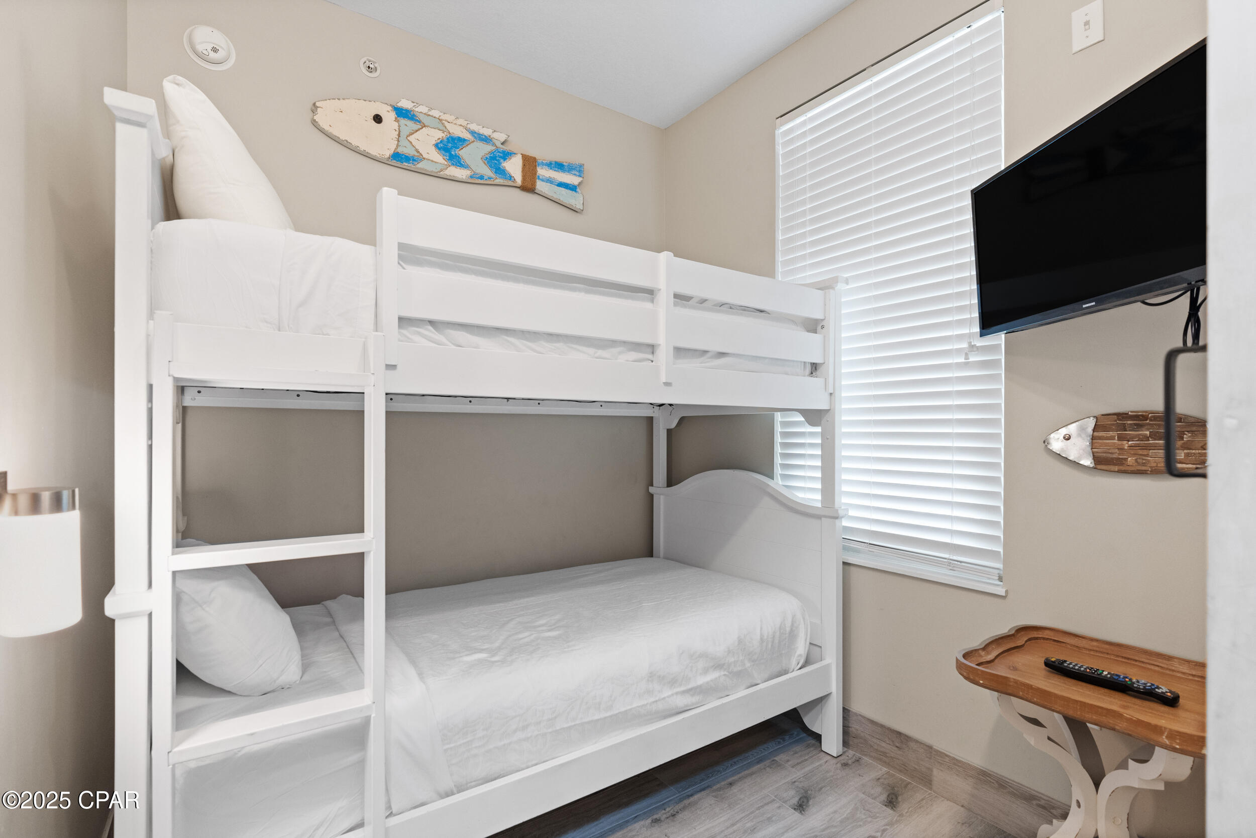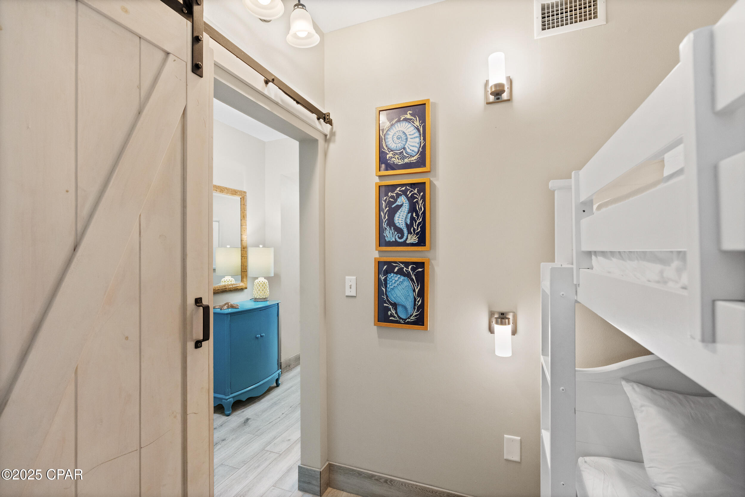 **SOLID-SURFACE FLOORING THROUGHOUT** This Gulf-front 1BR/2BA condo with bunks at Aqua offers the ideal combination of luxury, functionality, and income potential. Comfortably sleeping six, this well-designed layout features a master suite that opens directly onto the private balcony, where you'll enjoy sweeping views of the Gulf. The en suite bath includes dual vanities, a jacuzzi tub, and a separate walk-in shower. A custom barn door encloses the bunk area, offering added privacy and a modern design element that guests love.