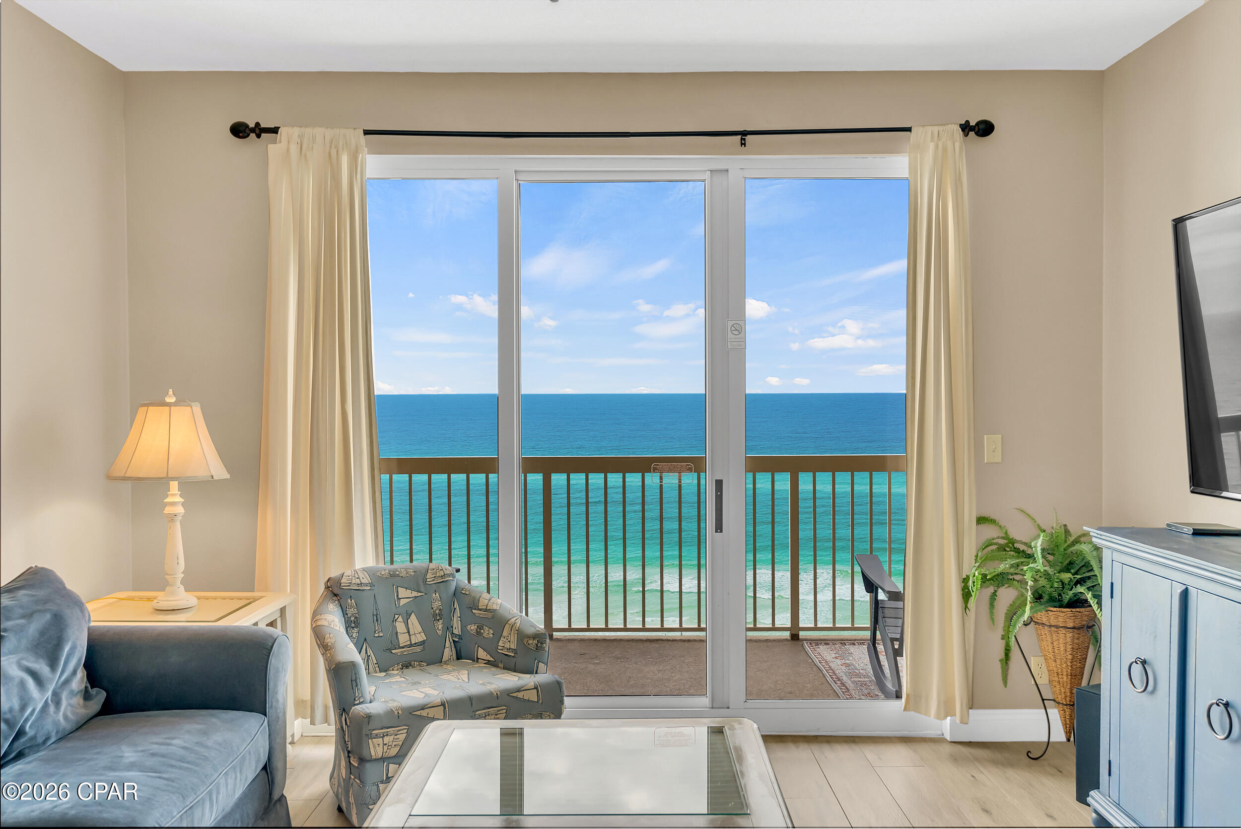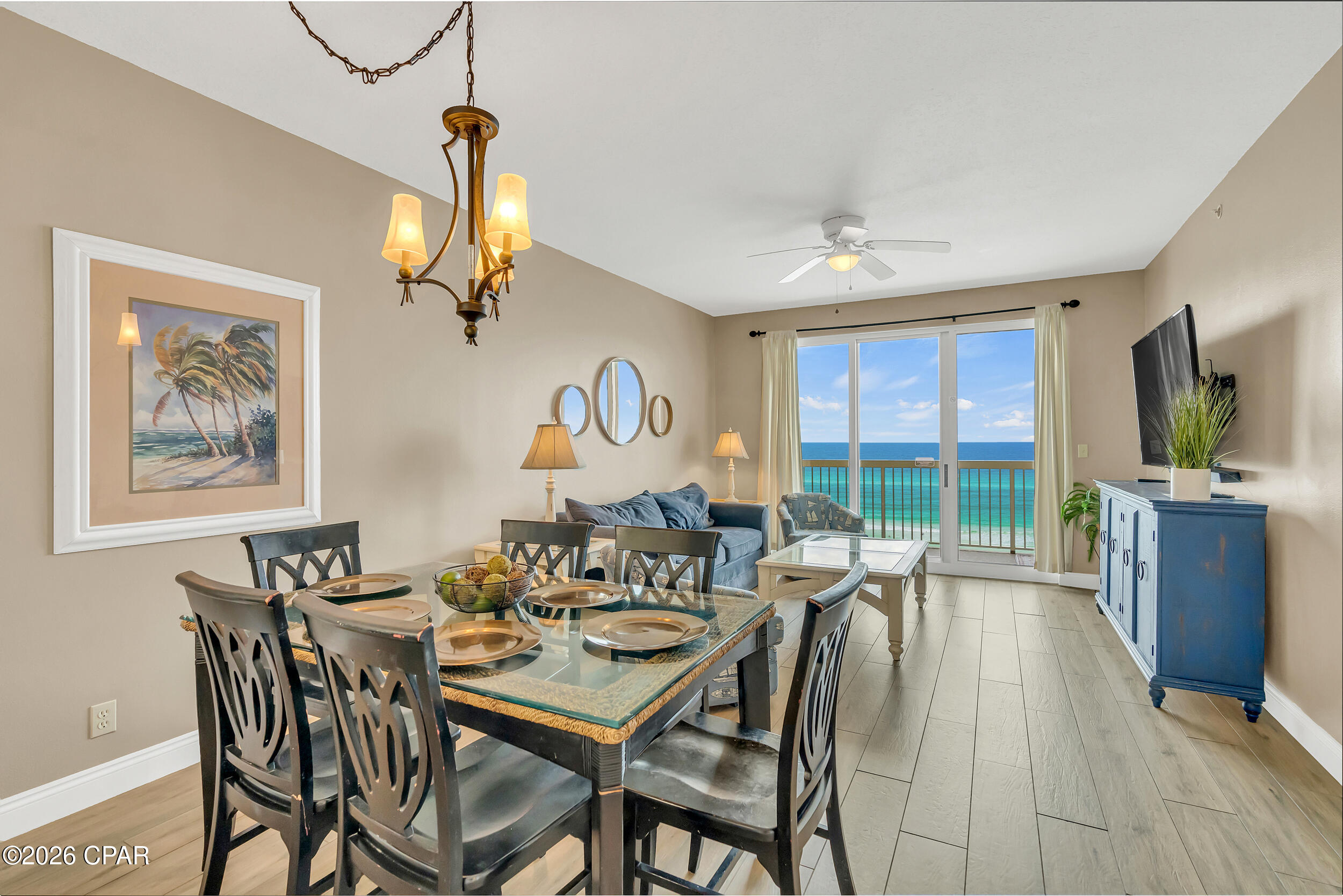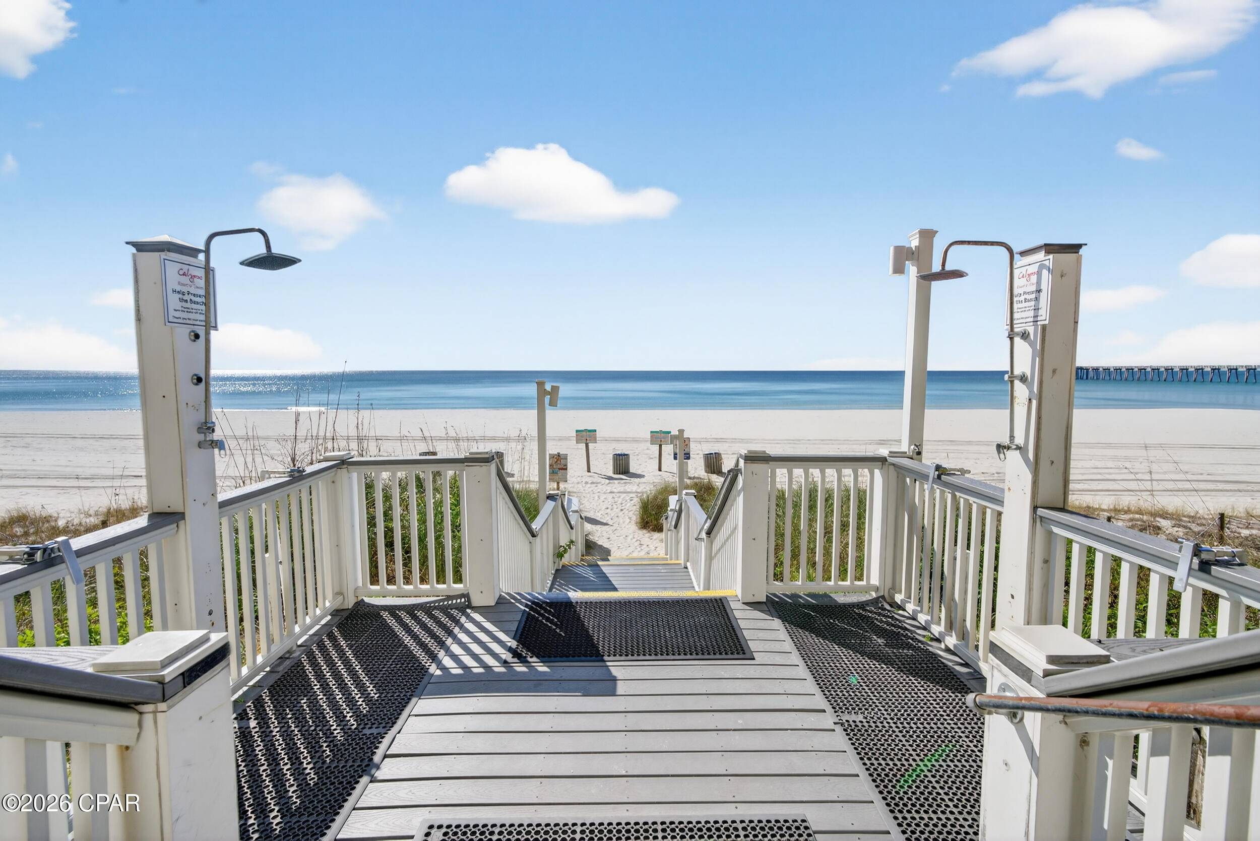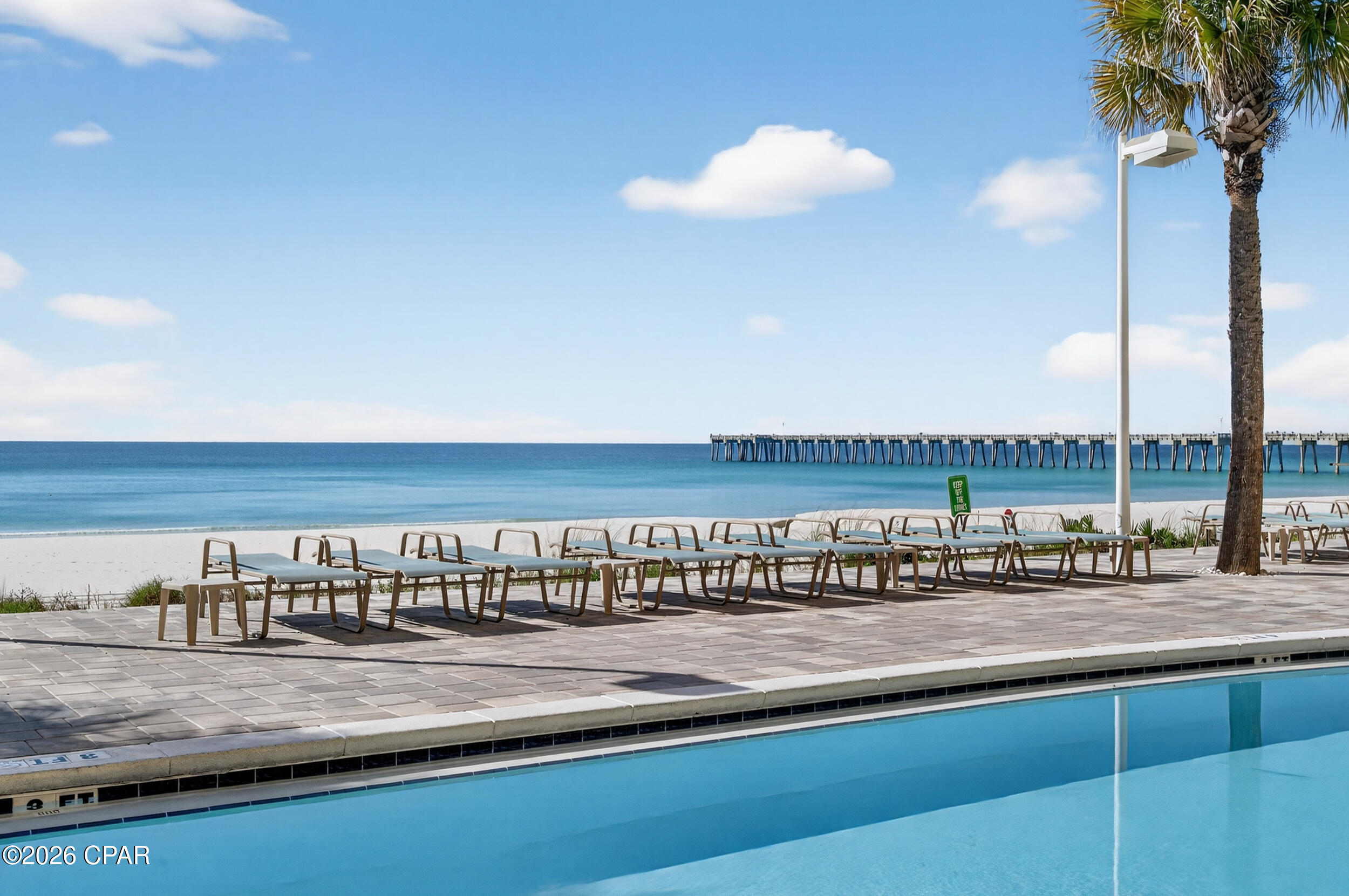 Enjoy breathtaking gulf views, a desirable floor plan, and exceptional resort amenities in this 2BR/2BA+BUNKS at Calypso. Perfect for short-term rentals or as a vacation home, this spacious getaway features a gulf-front primary suite with balcony access and a bonus bunk room that gives it the feel of a 3-bedroom unit. High above the crowds, you'll appreciate the peaceful privacy, gorgeous water vistas, and relaxing sounds of the surf - all while being just steps away from the area's top attractions. Inside, durable tile flooring runs throughout, ideal for beach living and effortless upkeep. The open living and dining areas are filled with natural light, with floor-to-ceiling sliding glass doors that lead out to your private balcony where the views stretch for miles. The fully-stocked kitchen features granite countertops and brand new stainless steel appliances. A walk-in laundry room and wet bar adds extra convenience. Full furnished and rental ready, this condo comfortably sleeps 8 guests. Calypso Resort offers more than just a place to stay. Spend days lounging by one of the two beachfront pools, grabbing a drink at the tiki bar, or working out at the fitness center. And when you're ready to explore, Pier Park, with its vast offering of dining, shopping and entertainment, is right across the street. New attractions like Topgolf and Dolly Parton's pirate-themed dinner theater will also being more excitement to the area when they open this year. Its location puts everything within easy reach. This condo is a great opportunity for someone looking to own in one of Panama City Beach's favorite resorts - come take a look and see why Calypso remains a top pick year after year.
