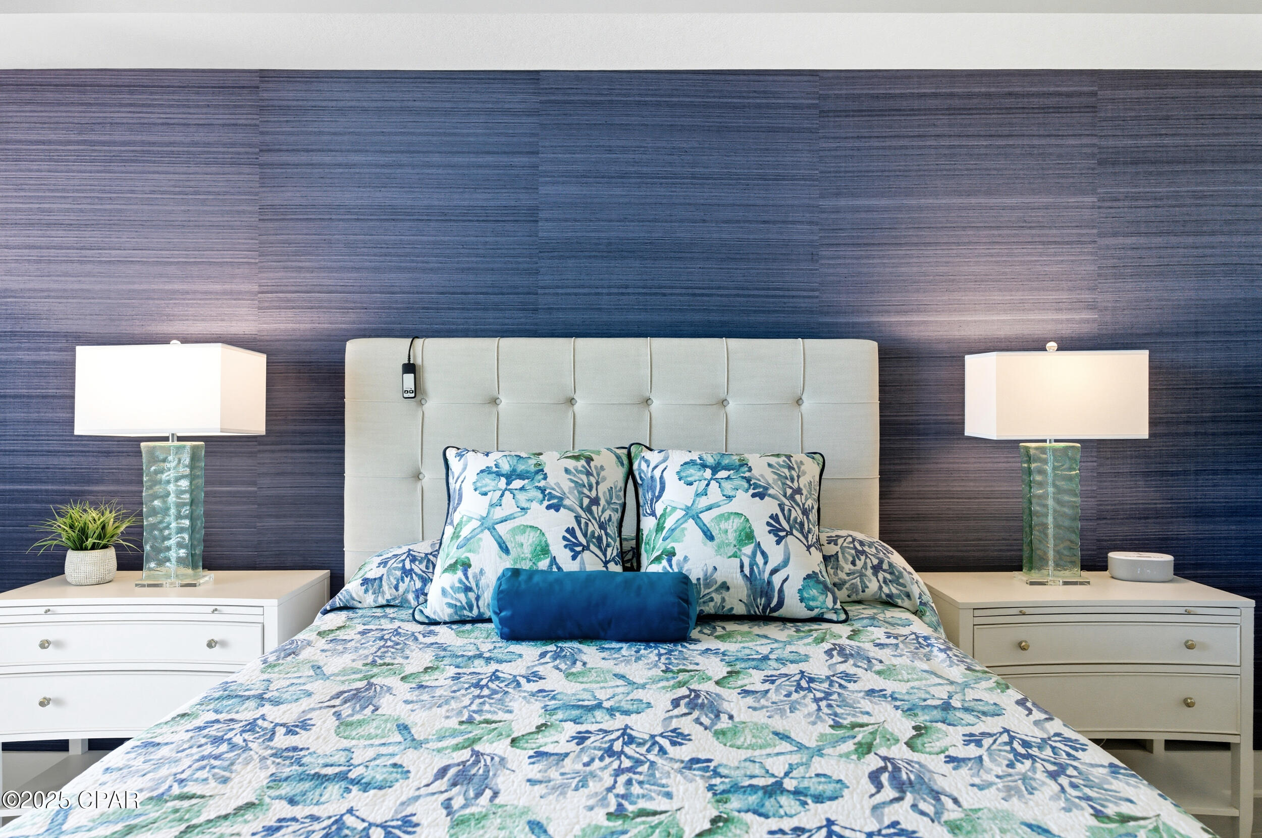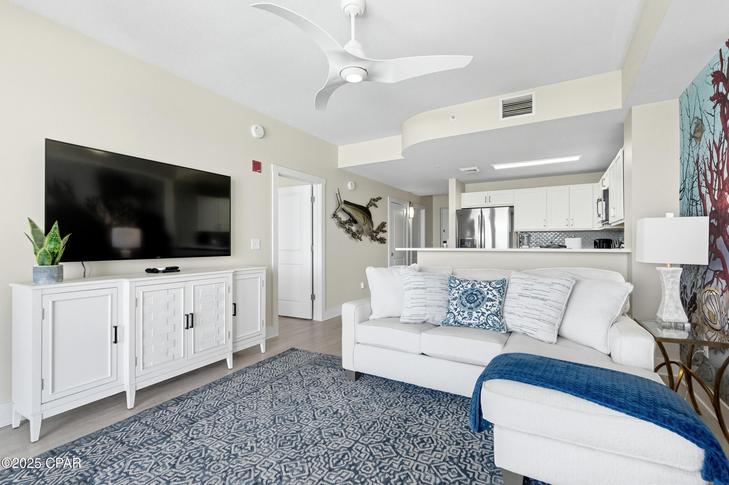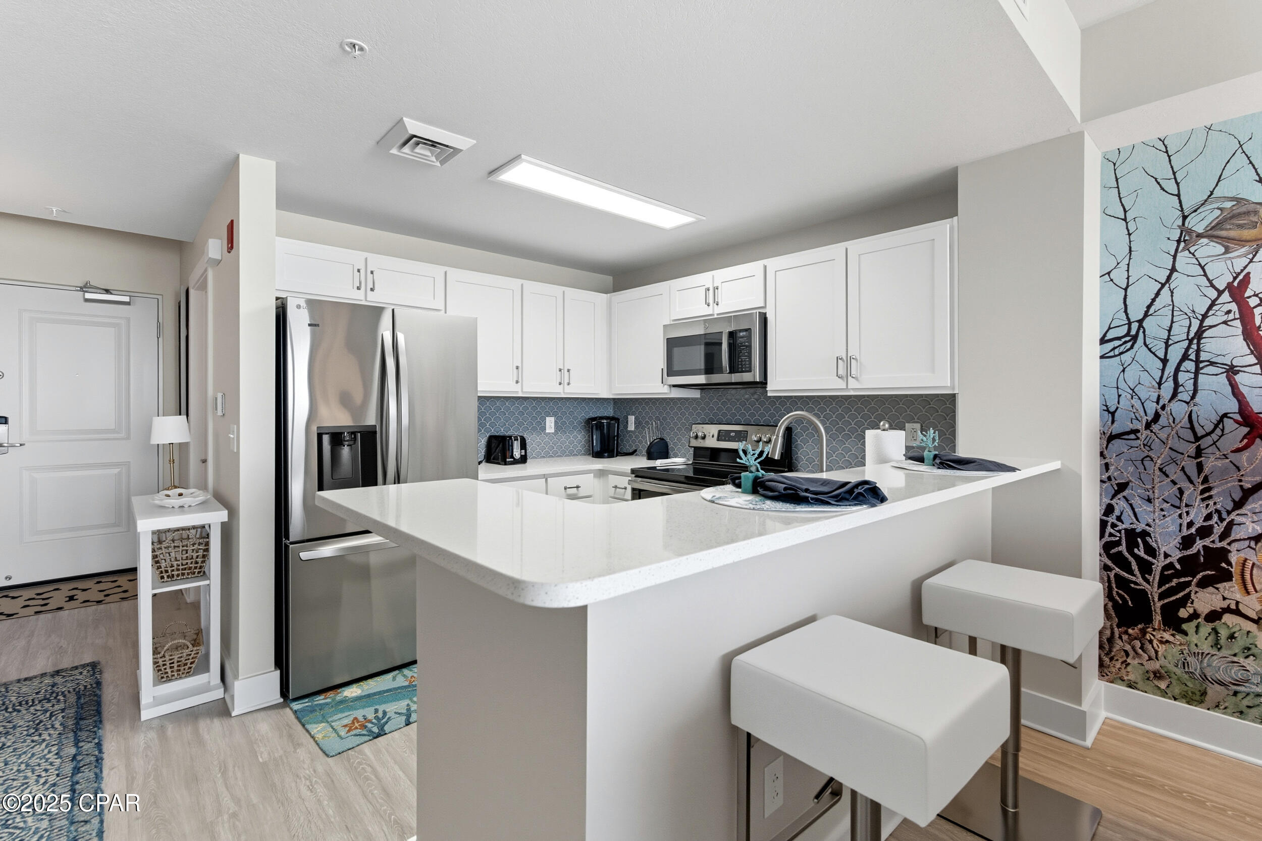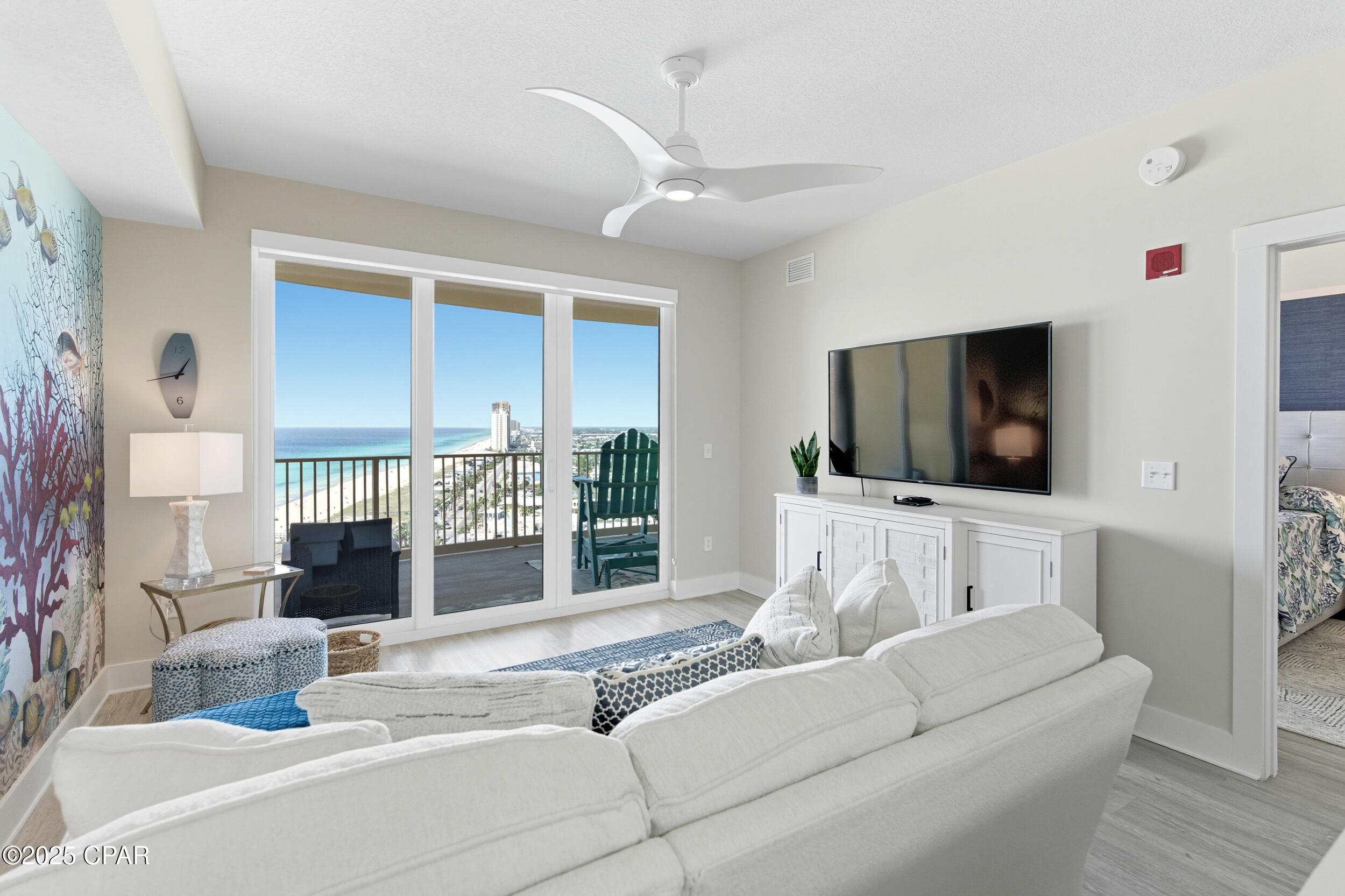 Floor-to-ceiling glass doors fill the open-concept kitchen and living area with natural light and lead to a spacious, rounded 10-ft balcony - one of the largest in PCB - perfect for sunset watching or enjoying morning coffee above the surf. Inside, EVP flooring runs throughout for effortless upkeep and lasting style. The modern kitchen features quartz countertops, a scalloped tile backsplash, and stainless appliances. A custom coral reef mural in the living area adds a touch of playful coastal character. The Gulf-view primary suite also features a sliding glass door that opens directly to the balcony. Both bathrooms have updated walk-in showers. Previously owner-occupied and meticulously maintained, this condo is offered fully furnished with tasteful coastal decor and is ready for rental or personal use.