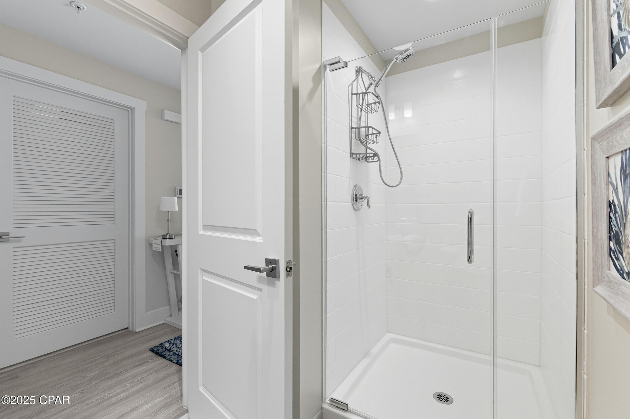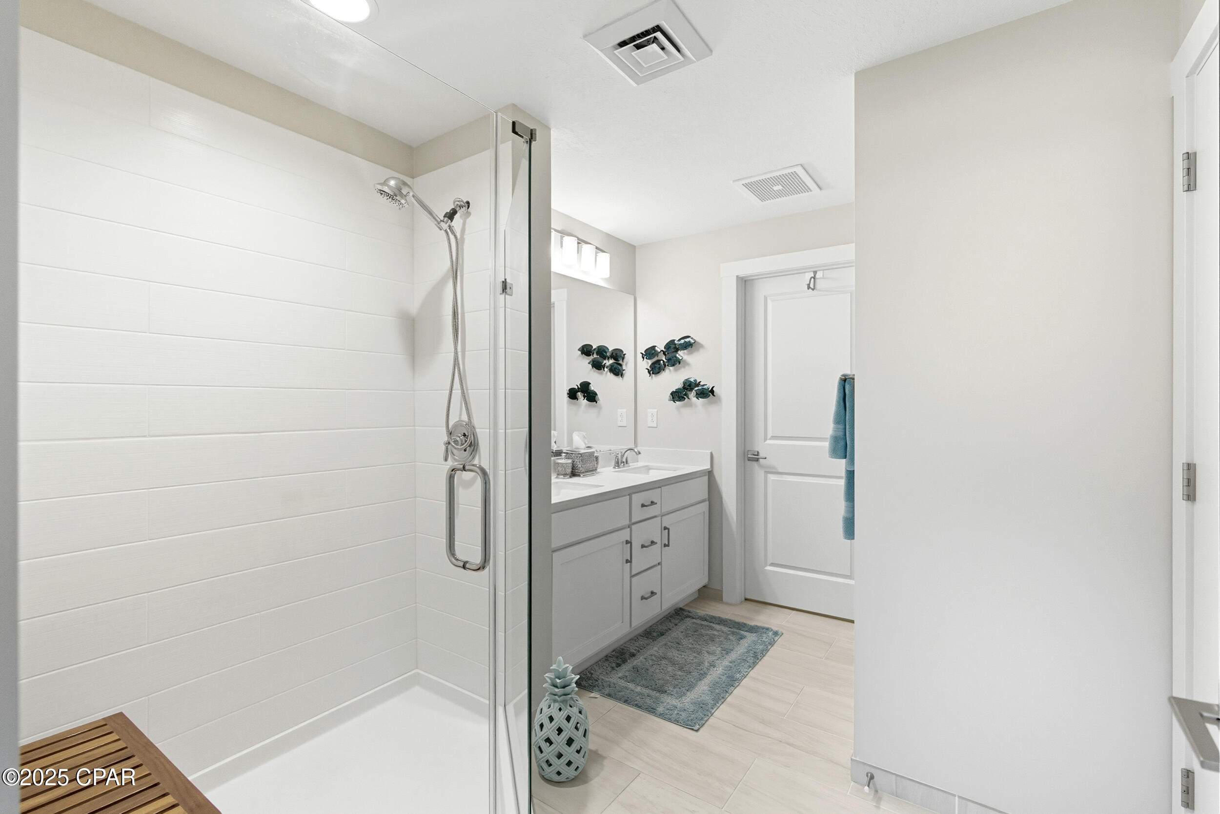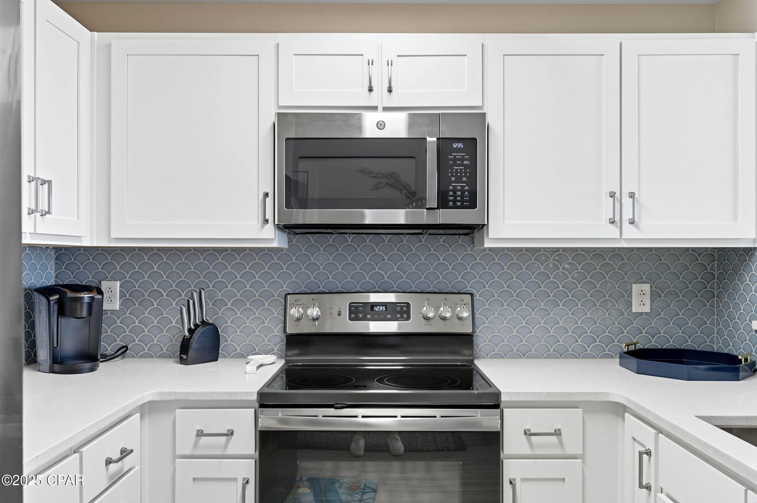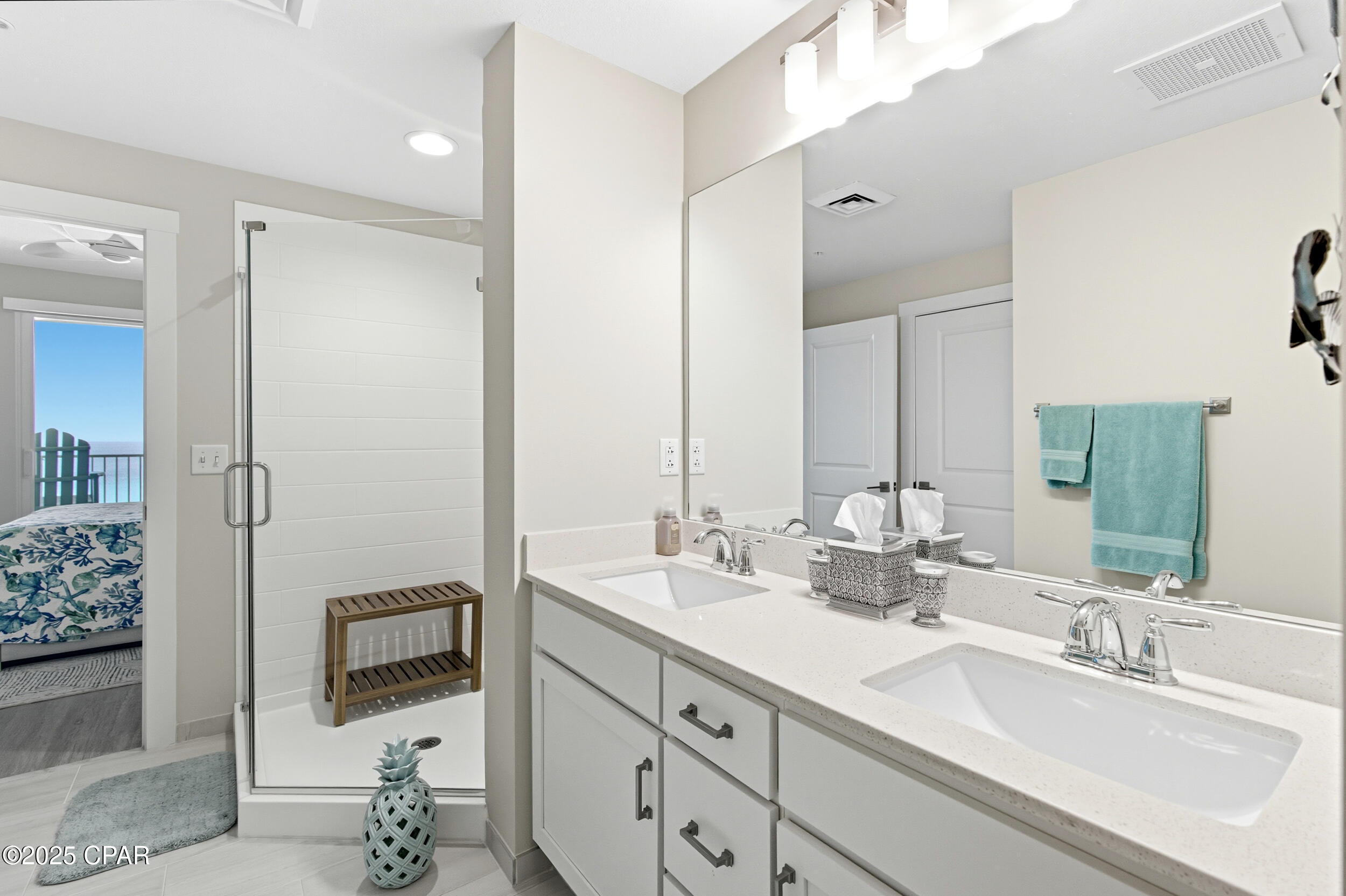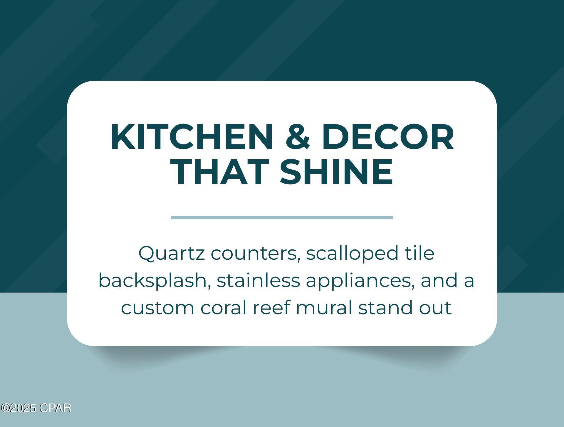 Floor-to-ceiling glass doors fill the open-concept kitchen and living area with natural light and lead to a spacious, rounded 10-ft balcony - one of the largest in PCB - perfect for sunset watching or enjoying morning coffee above the surf. Inside, EVP flooring runs throughout for effortless upkeep and lasting style. The modern kitchen features quartz countertops, a scalloped tile backsplash, and stainless appliances. A custom coral reef mural in the living area adds a touch of playful coastal character. The Gulf-view primary suite also features a sliding glass door that opens directly to the balcony. Both bathrooms have updated walk-in showers. Previously owner-occupied and meticulously maintained, this condo is offered fully furnished with tasteful coastal decor and is ready for rental or personal use.
