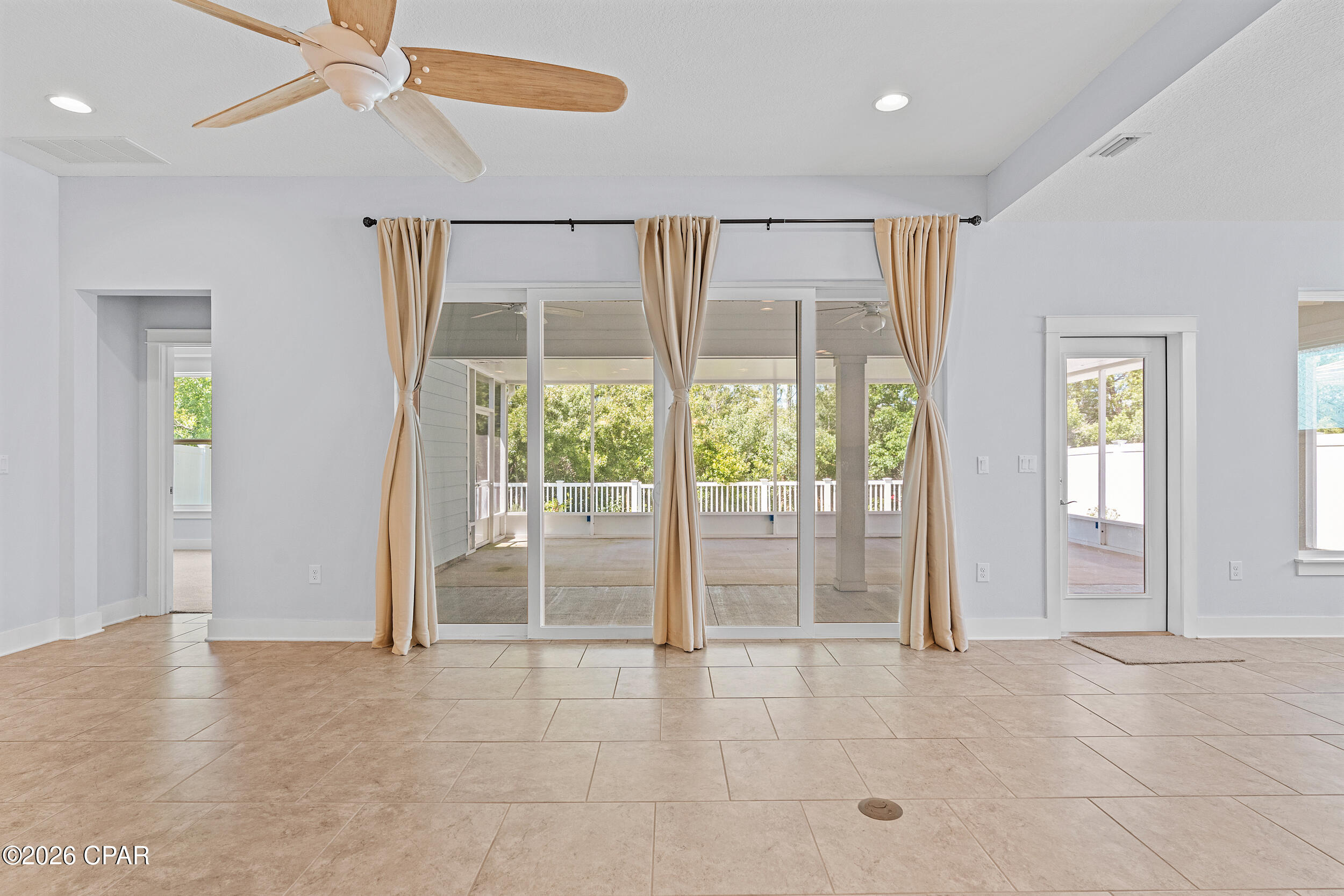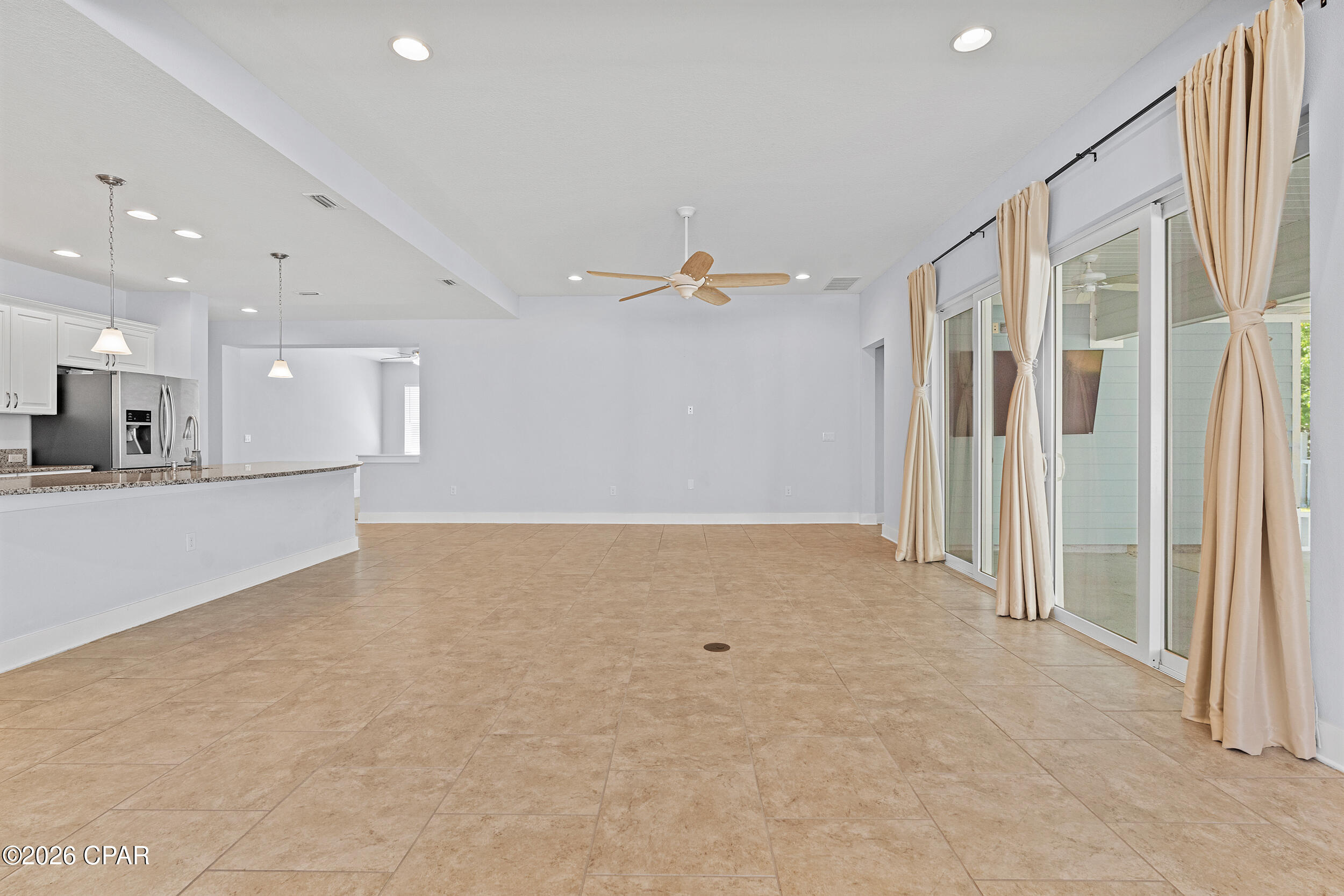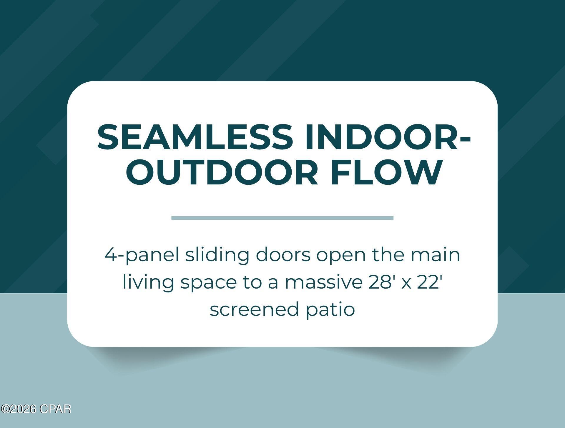 A standout feature is the 4-panel sliding glass door that opens fully from the main living space to the expansive 28' x 22' screened patio, creating true indoor-outdoor living. This design not only brings in abundant natural light but also allows the living area to expand seamlessly into the covered outdoor space -- ideal for gatherings, game days, or quiet evenings overlooking preserved green space.