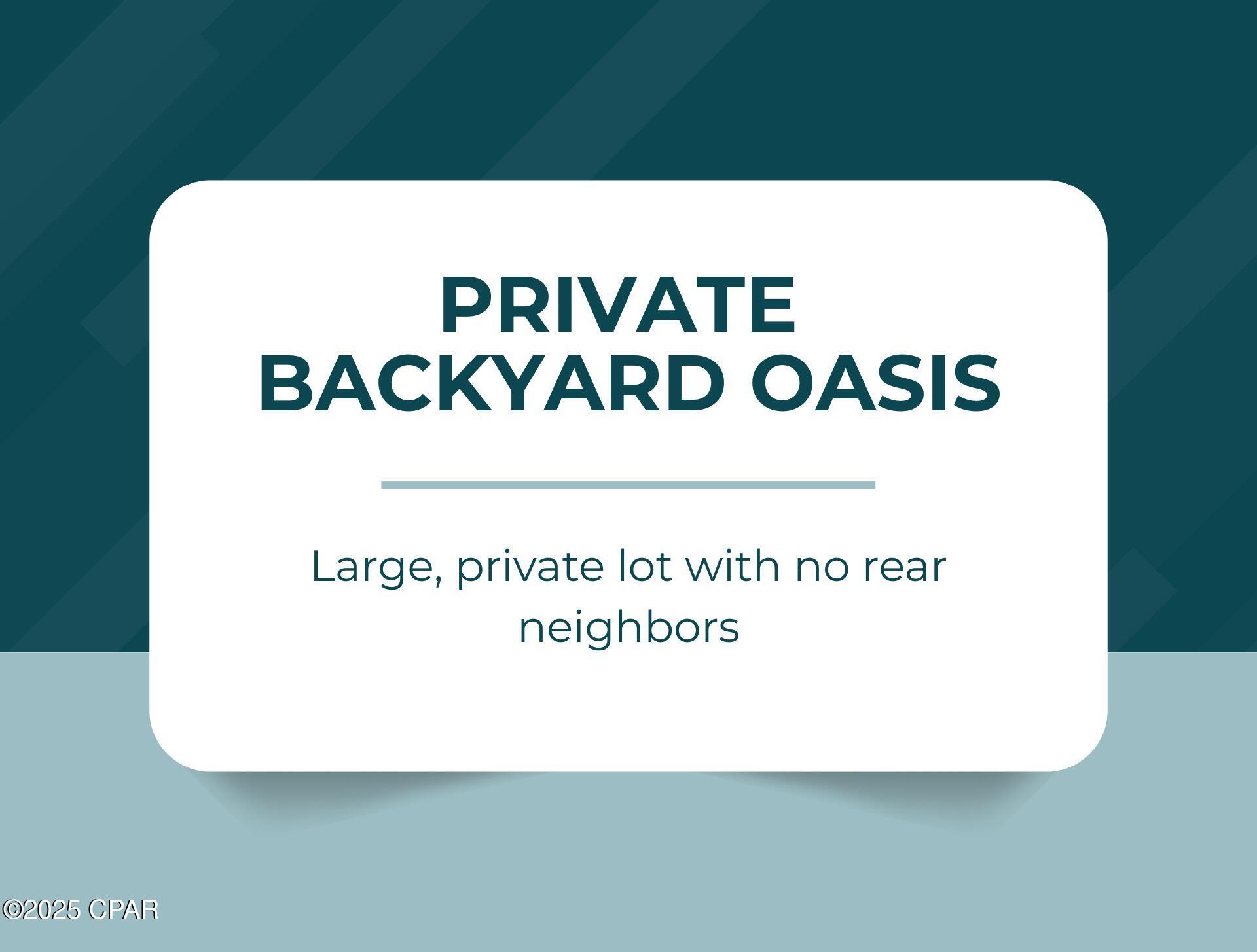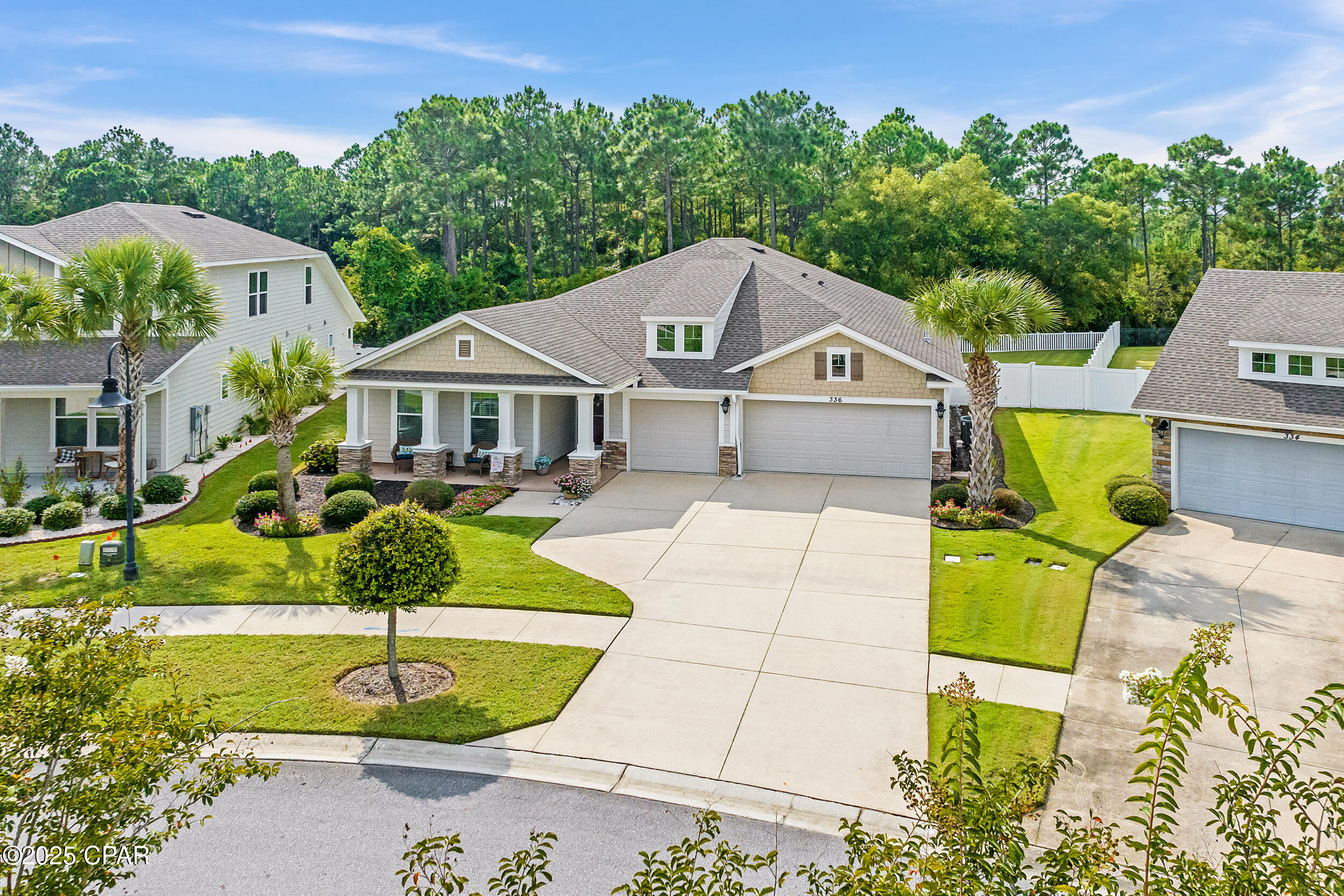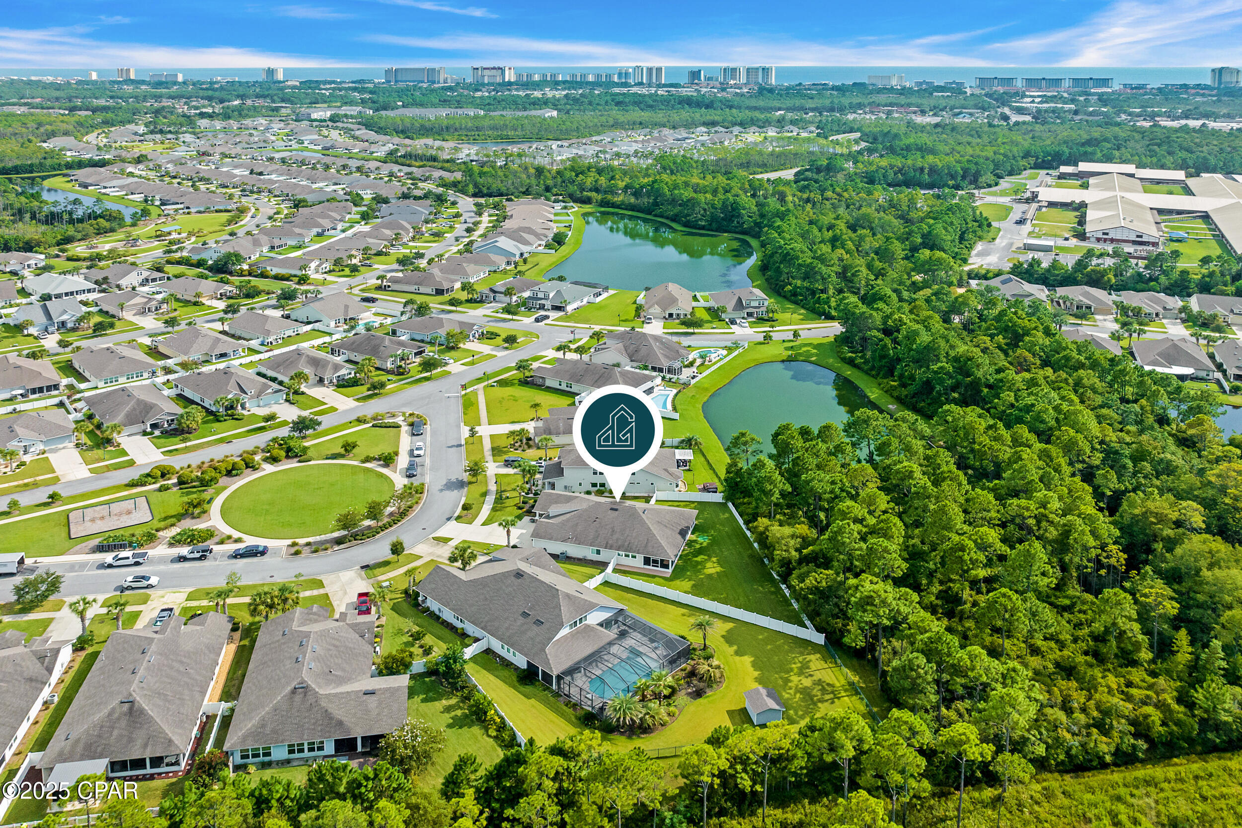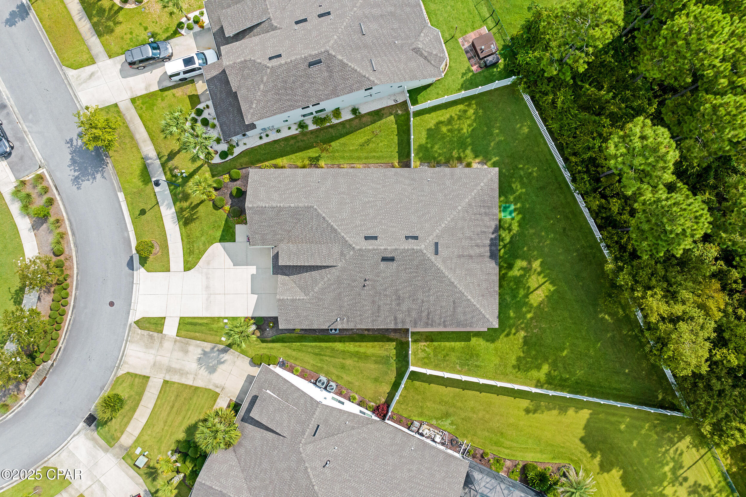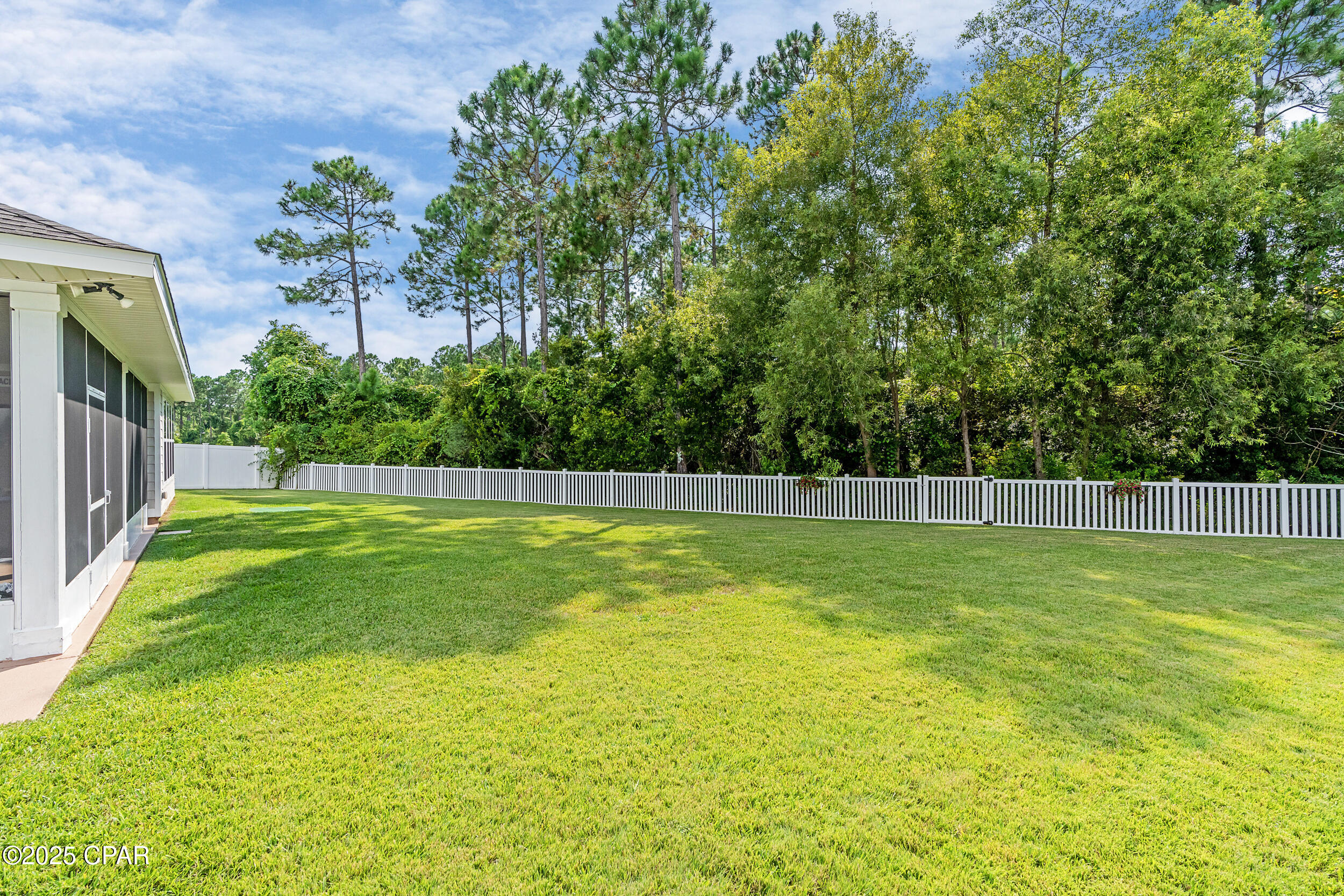 CURRENTLY UNDER CONTRACT, SELLER WILL CONSIDER BACKUP OFFERS. Set on one of the largest and most private lots in Breakfast Point, this 4BR/3BA home pairs open, modern living with a backyard designed for space and serenity. The oversized yard backs to wooded conservation land, creating a lush natural backdrop with no rear neighbors and shade in the mornings and afternoons. From the extended covered lanai, it's the perfect setting to relax, entertain, or simply enjoy the view. Inside, the open layout connects the living, dining, and kitchen areas under 10' ceilings with a tray ceiling detail in the great room. The kitchen combines style and function with granite counters, stainless steel appliances, under-cabinet lighting, a generous breakfast bar, and five pull-out cabinets for easy storage. A separate counter space makes an ideal coffee bar, while extra cabinetry keeps everything organized. The split floor plan offers flexibility, with one bedroom and bath tucked at the front of the home for guests, while the primary suite features double vanities, a soaking tub, and a walk-in glass shower. Additional highlights include a formal dining room, mudroom, ceiling speakers in the great room, cable outlets in every bedroom, composite wood flooring throughout with tile in the baths and laundry, and a 3-car garage. Out front, the home overlooks a neighborhood park with plenty of visitor parking, and a streetlight keeps the yard well lit in the evenings. Breakfast Point is known for its central location - Publix, shopping, and restaurants are just outside the neighborhood, schools are within walking distance, and the beach and Pier Park are only minutes away.