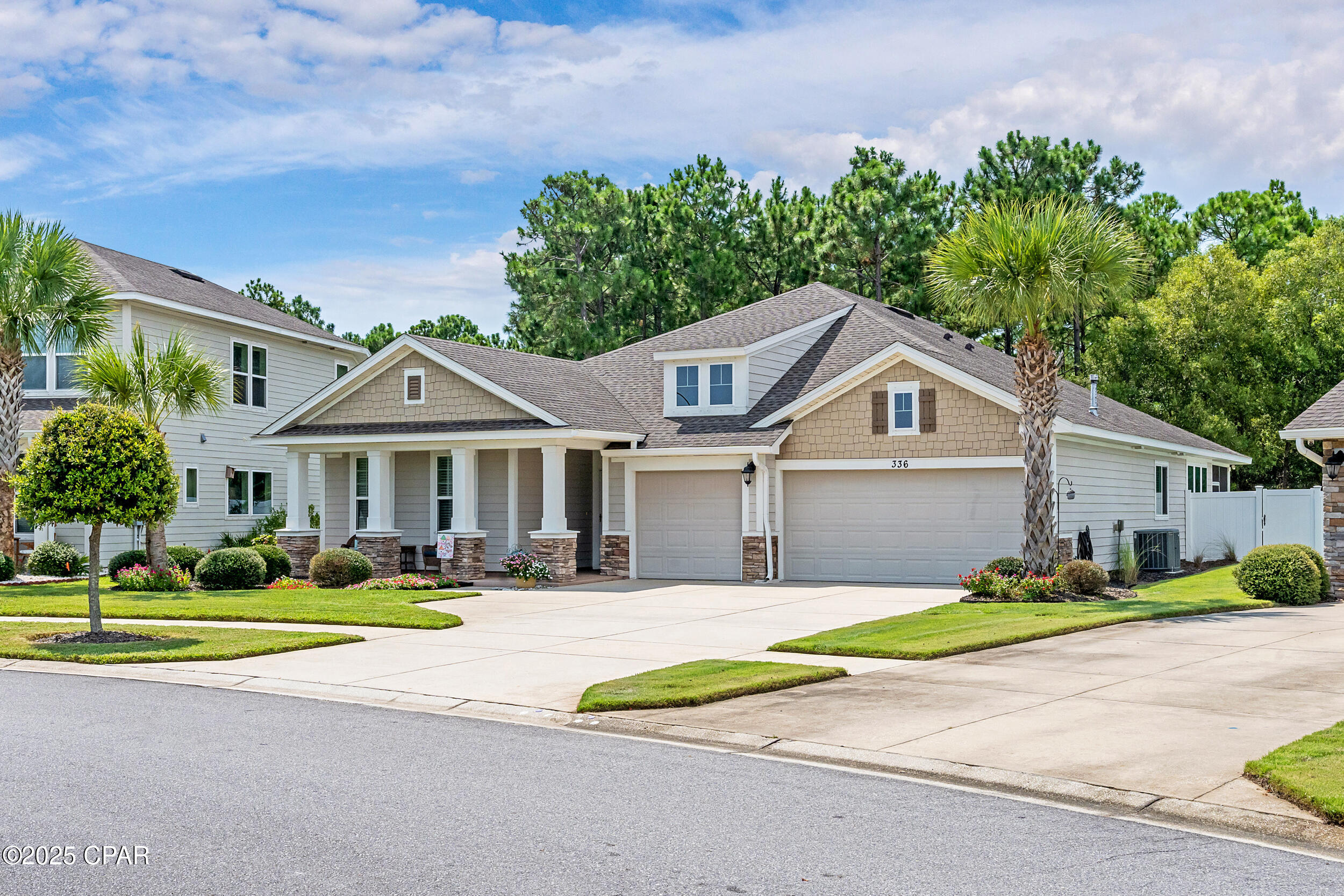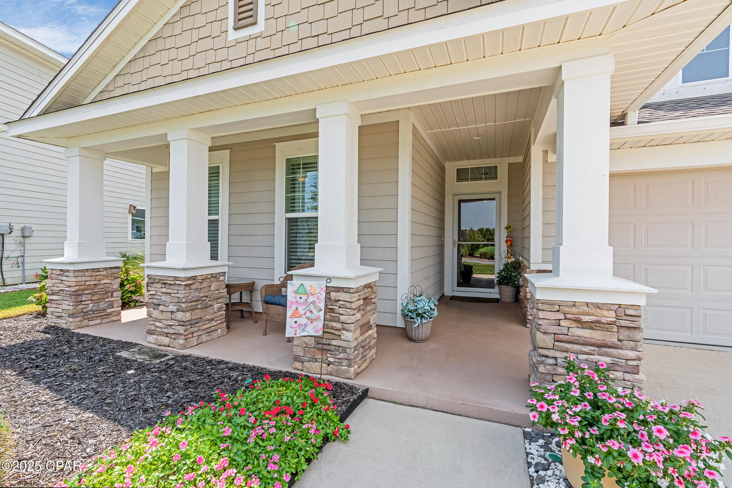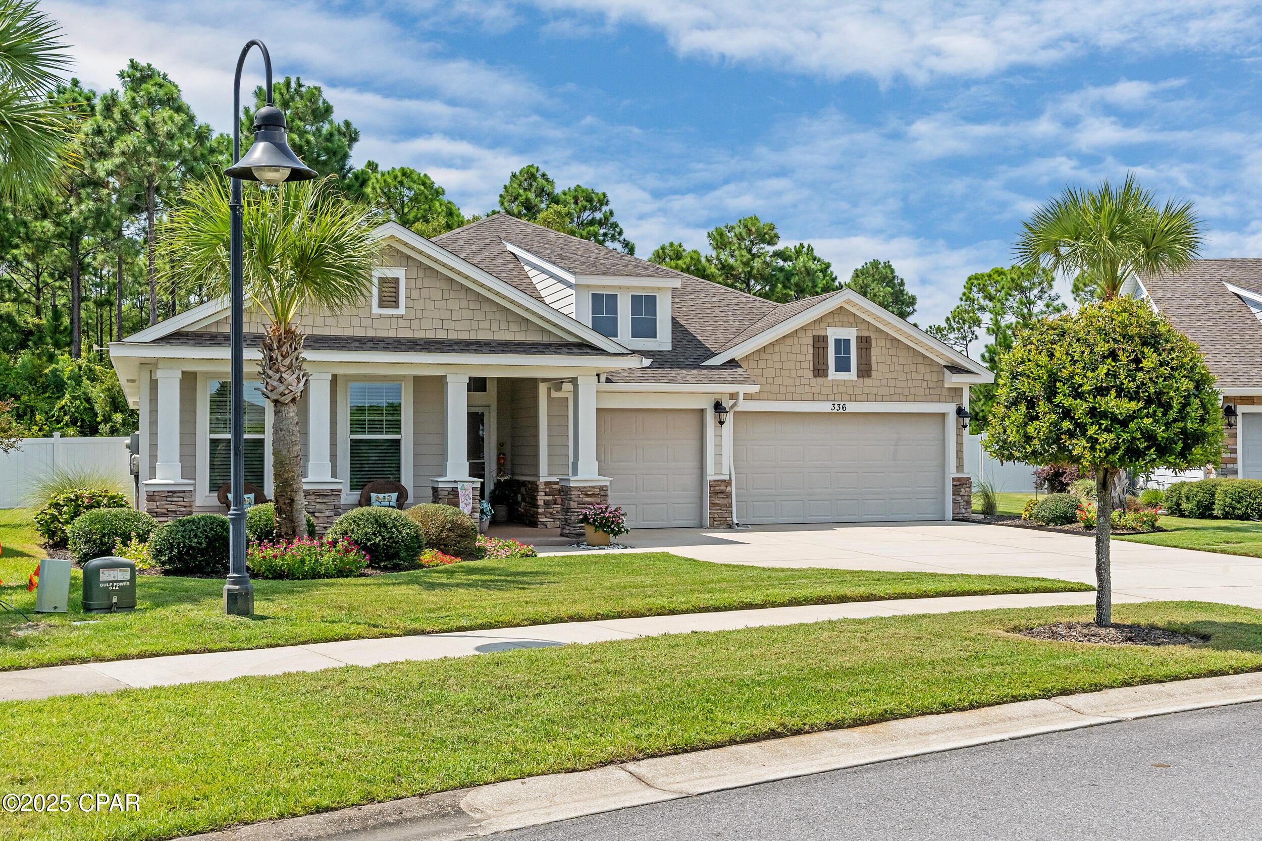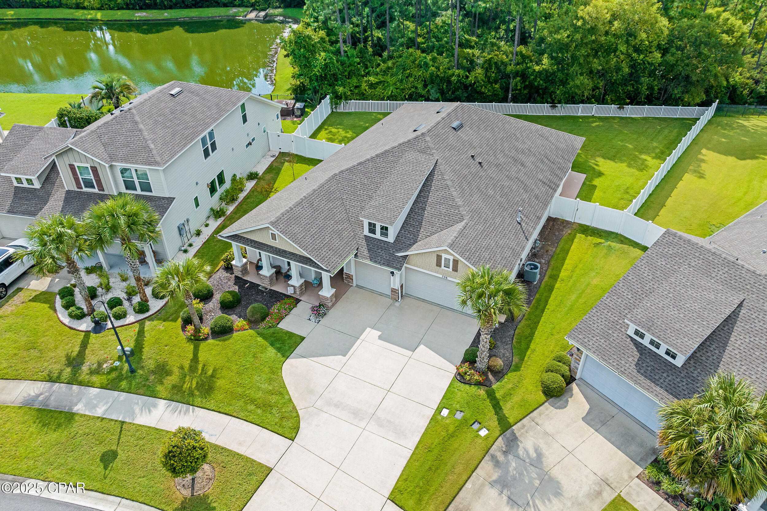 CURRENTLY UNDER CONTRACT, SELLER WILL CONSIDER BACKUP OFFERS. Set on one of the largest and most private lots in Breakfast Point, this 4BR/3BA home pairs open, modern living with a backyard designed for space and serenity. The oversized yard backs to wooded conservation land, creating a lush natural backdrop with no rear neighbors and shade in the mornings and afternoons. From the extended covered lanai, it's the perfect setting to relax, entertain, or simply enjoy the view. Inside, the open layout connects the living, dining, and kitchen areas under 10' ceilings with a tray ceiling detail in the great room. The kitchen combines style and function with granite counters, stainless steel appliances, under-cabinet lighting, a generous breakfast bar, and five pull-out cabinets for easy storage. A separate counter space makes an ideal coffee bar, while extra cabinetry keeps everything organized. The split floor plan offers flexibility, with one bedroom and bath tucked at the front of the home for guests, while the primary suite features double vanities, a soaking tub, and a walk-in glass shower. Additional highlights include a formal dining room, mudroom, ceiling speakers in the great room, cable outlets in every bedroom, composite wood flooring throughout with tile in the baths and laundry, and a 3-car garage. Out front, the home overlooks a neighborhood park with plenty of visitor parking, and a streetlight keeps the yard well lit in the evenings. Breakfast Point is known for its central location - Publix, shopping, and restaurants are just outside the neighborhood, schools are within walking distance, and the beach and Pier Park are only minutes away.