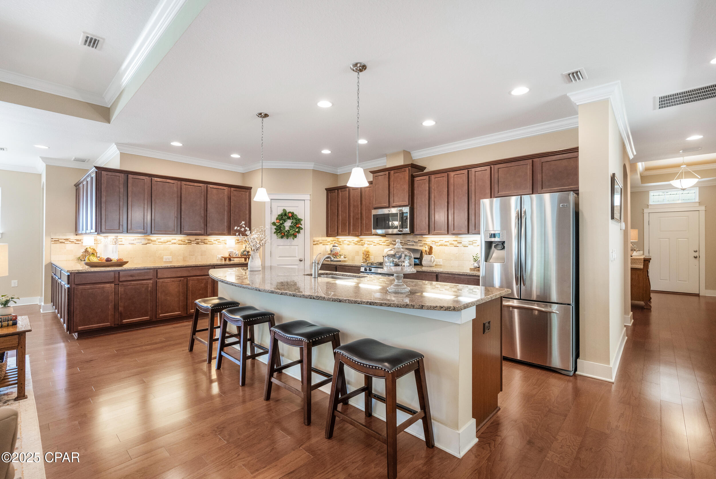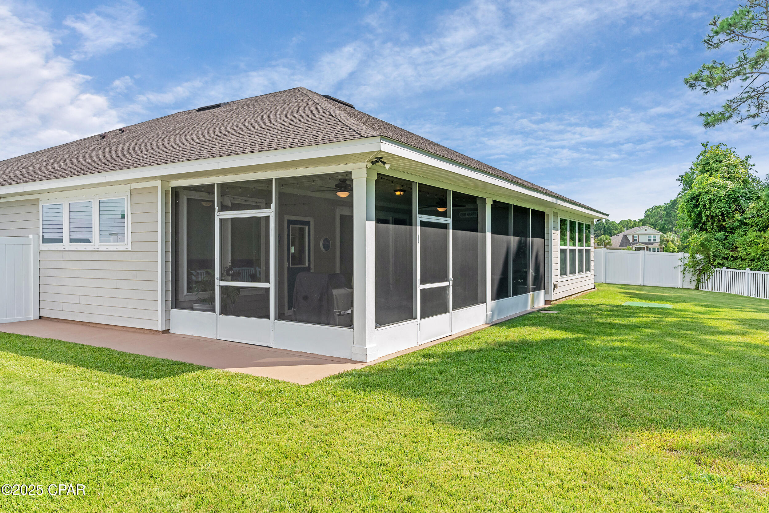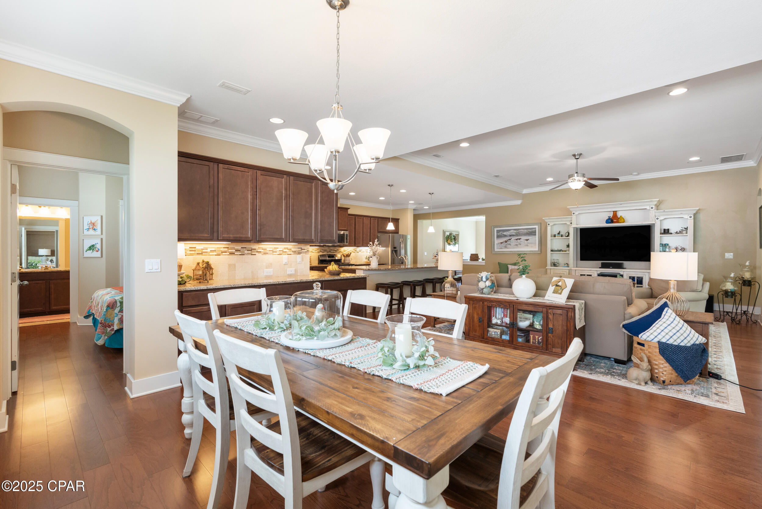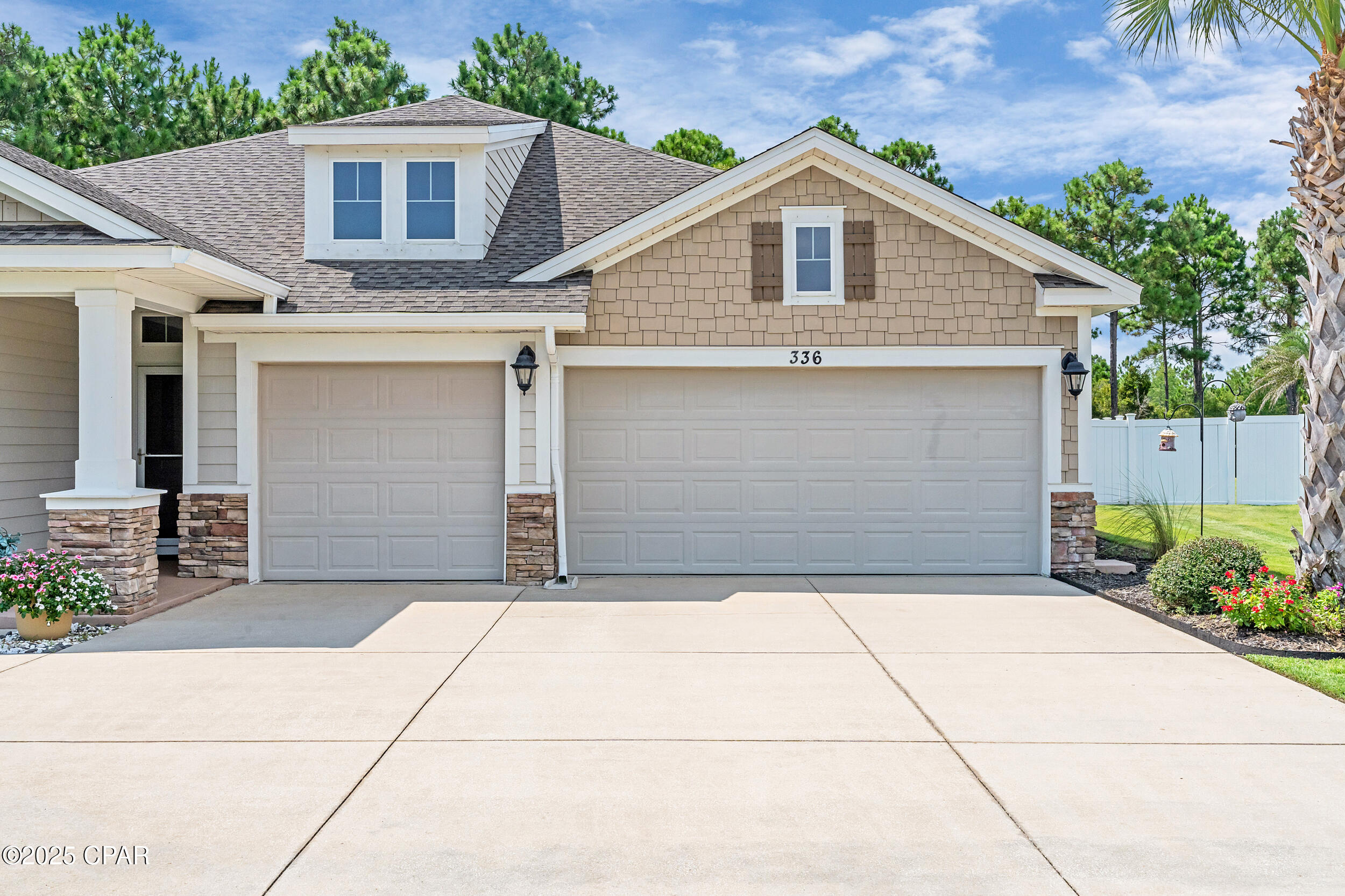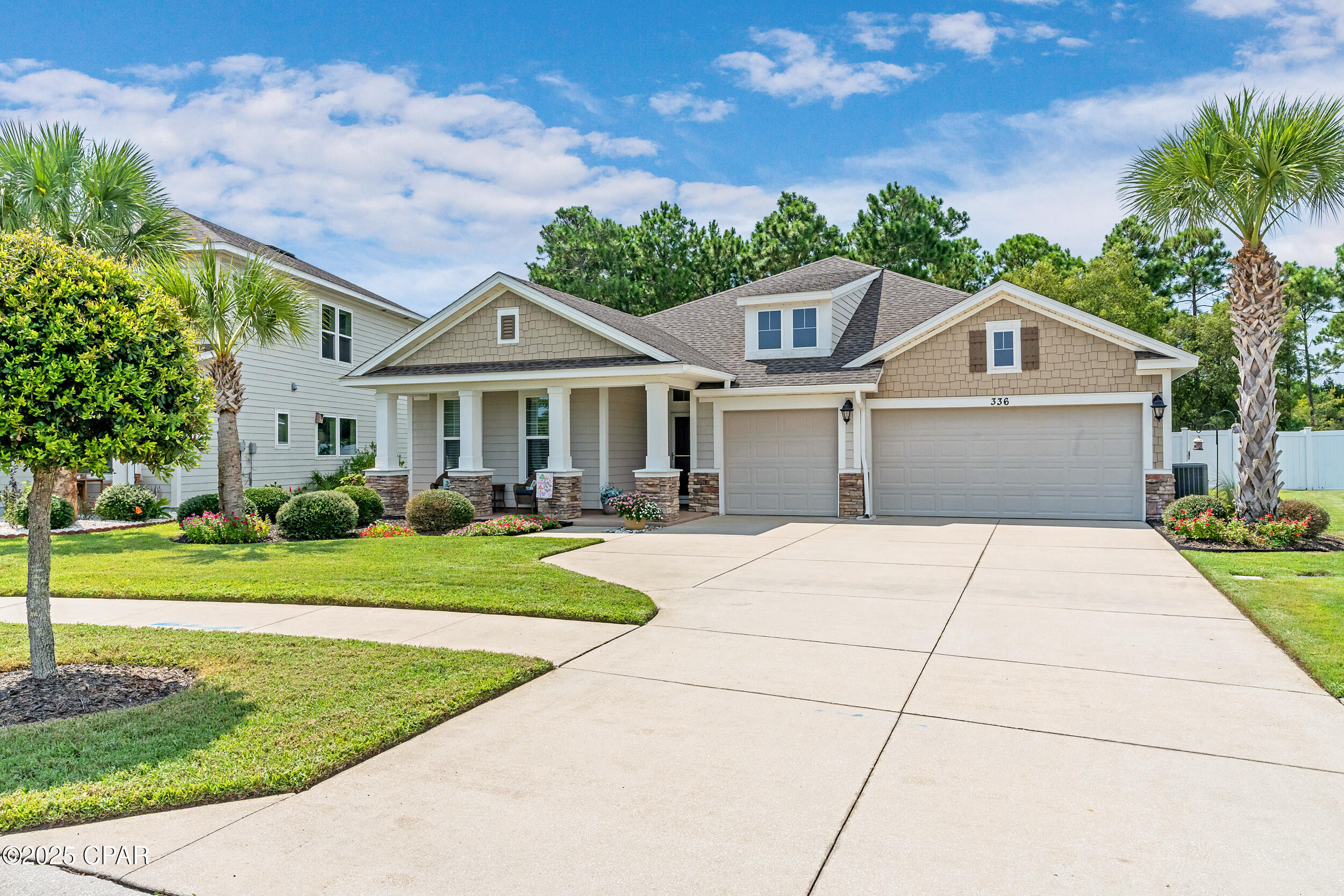 CURRENTLY UNDER CONTRACT, SELLER WILL CONSIDER BACKUP OFFERS. Set on one of the largest and most private lots in Breakfast Point, this 4BR/3BA home pairs open, modern living with a backyard designed for space and serenity. The oversized yard backs to wooded conservation land, creating a lush natural backdrop with no rear neighbors and shade in the mornings and afternoons. From the extended covered lanai, it's the perfect setting to relax, entertain, or simply enjoy the view. Inside, the open layout connects the living, dining, and kitchen areas under 10' ceilings with a tray ceiling detail in the great room. The kitchen combines style and function with granite counters, stainless steel appliances, under-cabinet lighting, a generous breakfast bar, and five pull-out cabinets for easy storage. A separate counter space makes an ideal coffee bar, while extra cabinetry keeps everything organized. The split floor plan offers flexibility, with one bedroom and bath tucked at the front of the home for guests, while the primary suite features double vanities, a soaking tub, and a walk-in glass shower. Additional highlights include a formal dining room, mudroom, ceiling speakers in the great room, cable outlets in every bedroom, composite wood flooring throughout with tile in the baths and laundry, and a 3-car garage. Out front, the home overlooks a neighborhood park with plenty of visitor parking, and a streetlight keeps the yard well lit in the evenings. Breakfast Point is known for its central location - Publix, shopping, and restaurants are just outside the neighborhood, schools are within walking distance, and the beach and Pier Park are only minutes away.