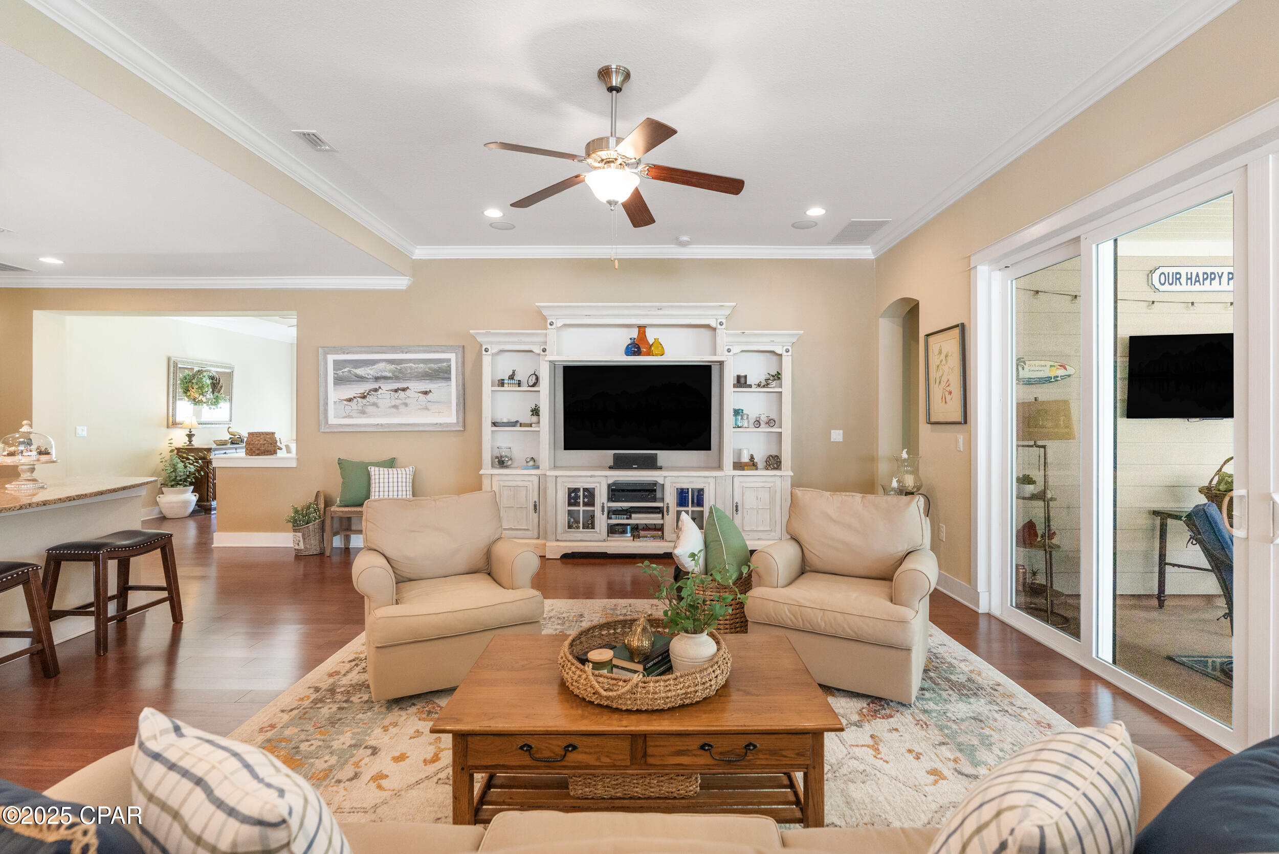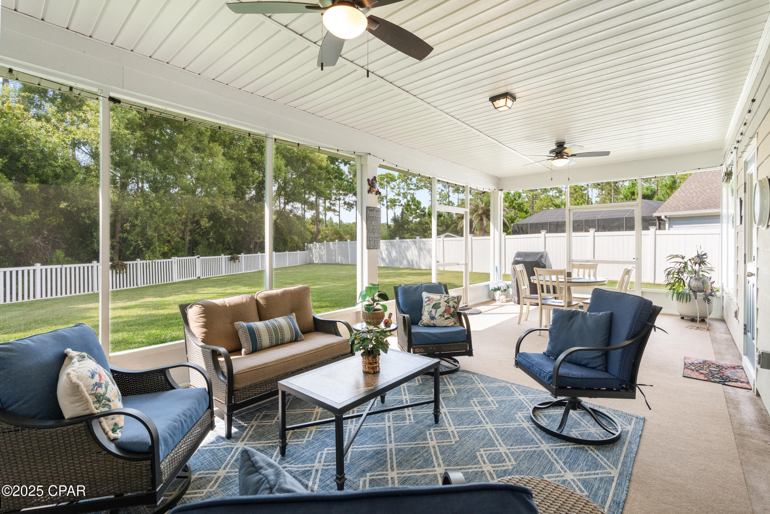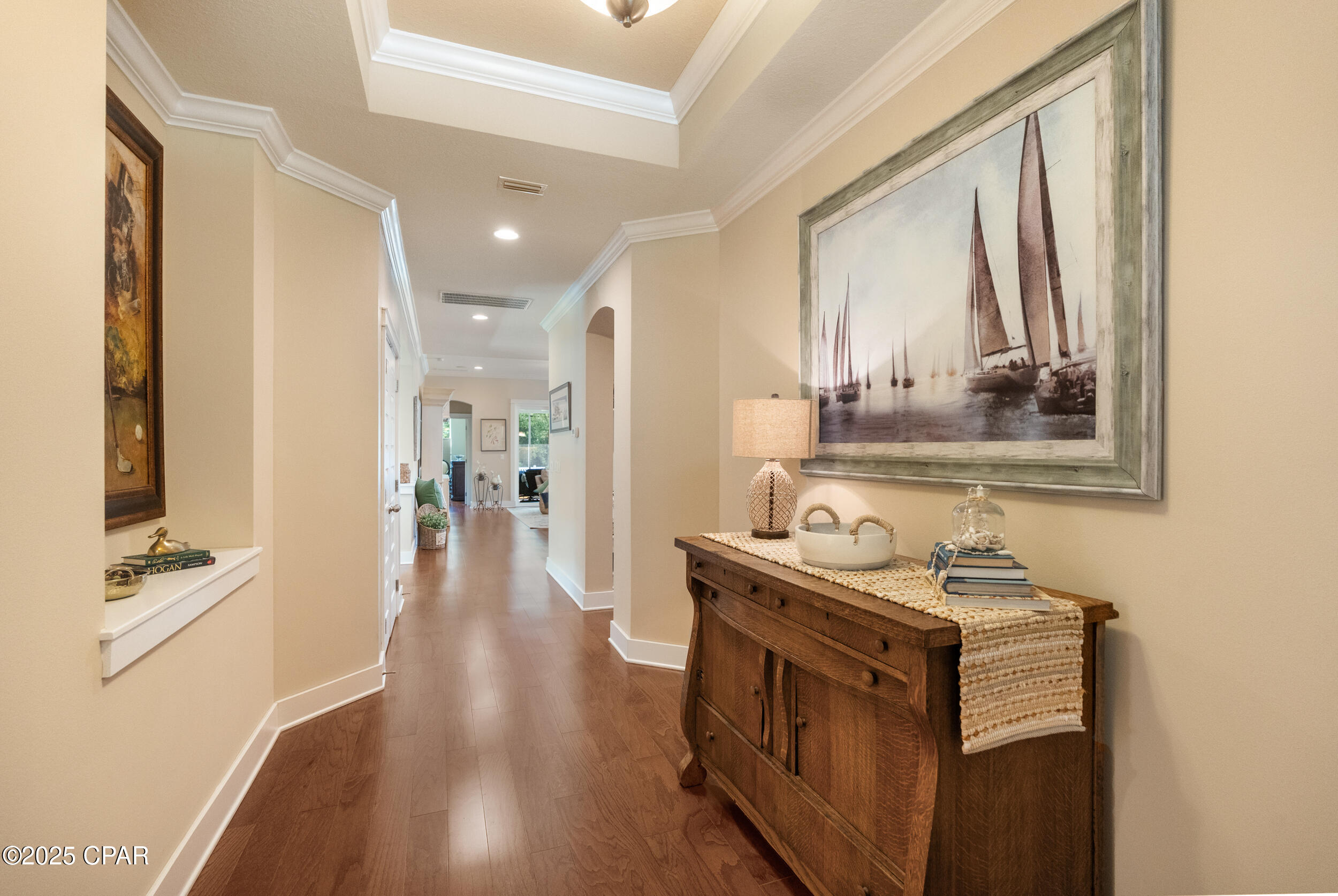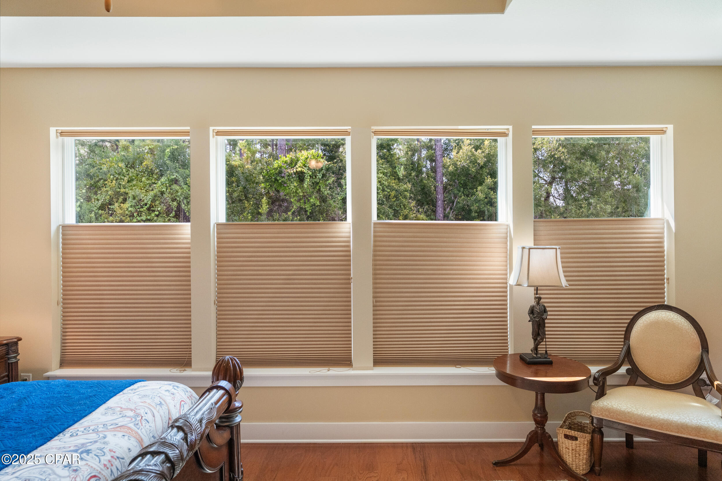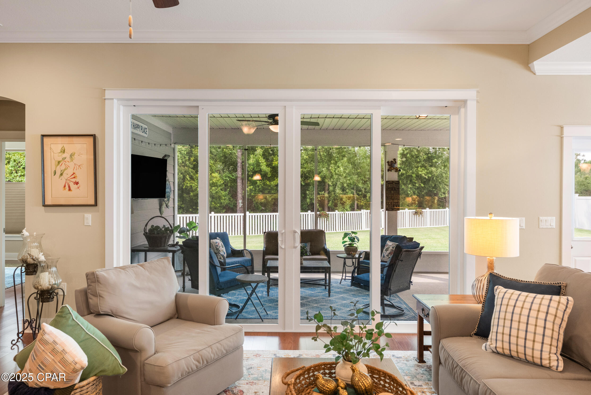 CURRENTLY UNDER CONTRACT, SELLER WILL CONSIDER BACKUP OFFERS. Set on one of the largest and most private lots in Breakfast Point, this 4BR/3BA home pairs open, modern living with a backyard designed for space and serenity. The oversized yard backs to wooded conservation land, creating a lush natural backdrop with no rear neighbors and shade in the mornings and afternoons. From the extended covered lanai, it's the perfect setting to relax, entertain, or simply enjoy the view. Inside, the open layout connects the living, dining, and kitchen areas under 10' ceilings with a tray ceiling detail in the great room. The kitchen combines style and function with granite counters, stainless steel appliances, under-cabinet lighting, a generous breakfast bar, and five pull-out cabinets for easy storage. A separate counter space makes an ideal coffee bar, while extra cabinetry keeps everything organized. The split floor plan offers flexibility, with one bedroom and bath tucked at the front of the home for guests, while the primary suite features double vanities, a soaking tub, and a walk-in glass shower. Additional highlights include a formal dining room, mudroom, ceiling speakers in the great room, cable outlets in every bedroom, composite wood flooring throughout with tile in the baths and laundry, and a 3-car garage. Out front, the home overlooks a neighborhood park with plenty of visitor parking, and a streetlight keeps the yard well lit in the evenings. Breakfast Point is known for its central location - Publix, shopping, and restaurants are just outside the neighborhood, schools are within walking distance, and the beach and Pier Park are only minutes away.