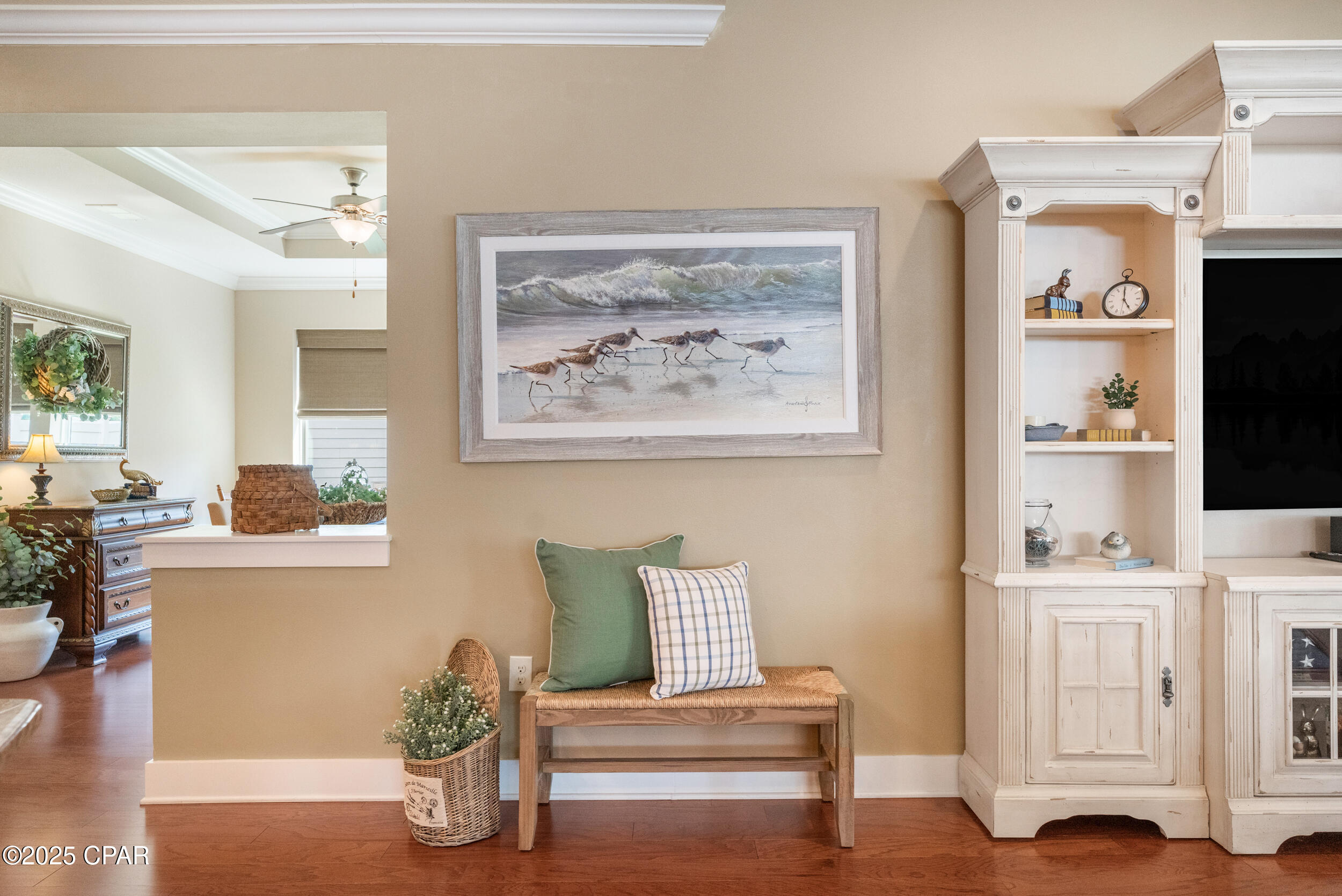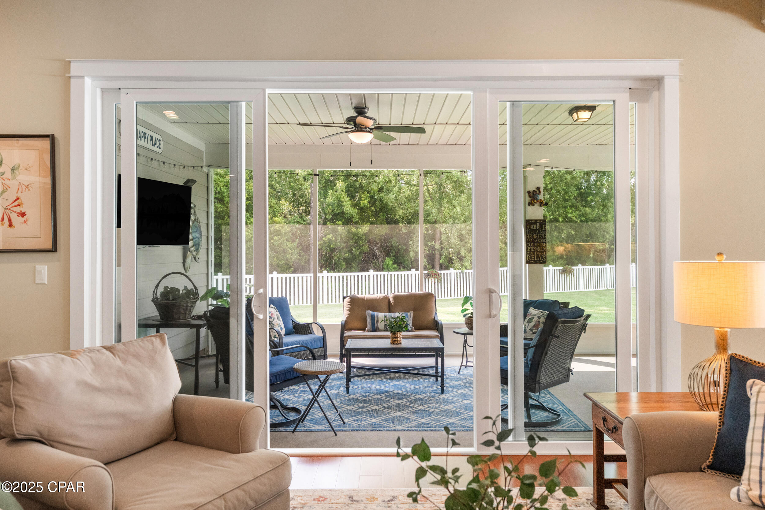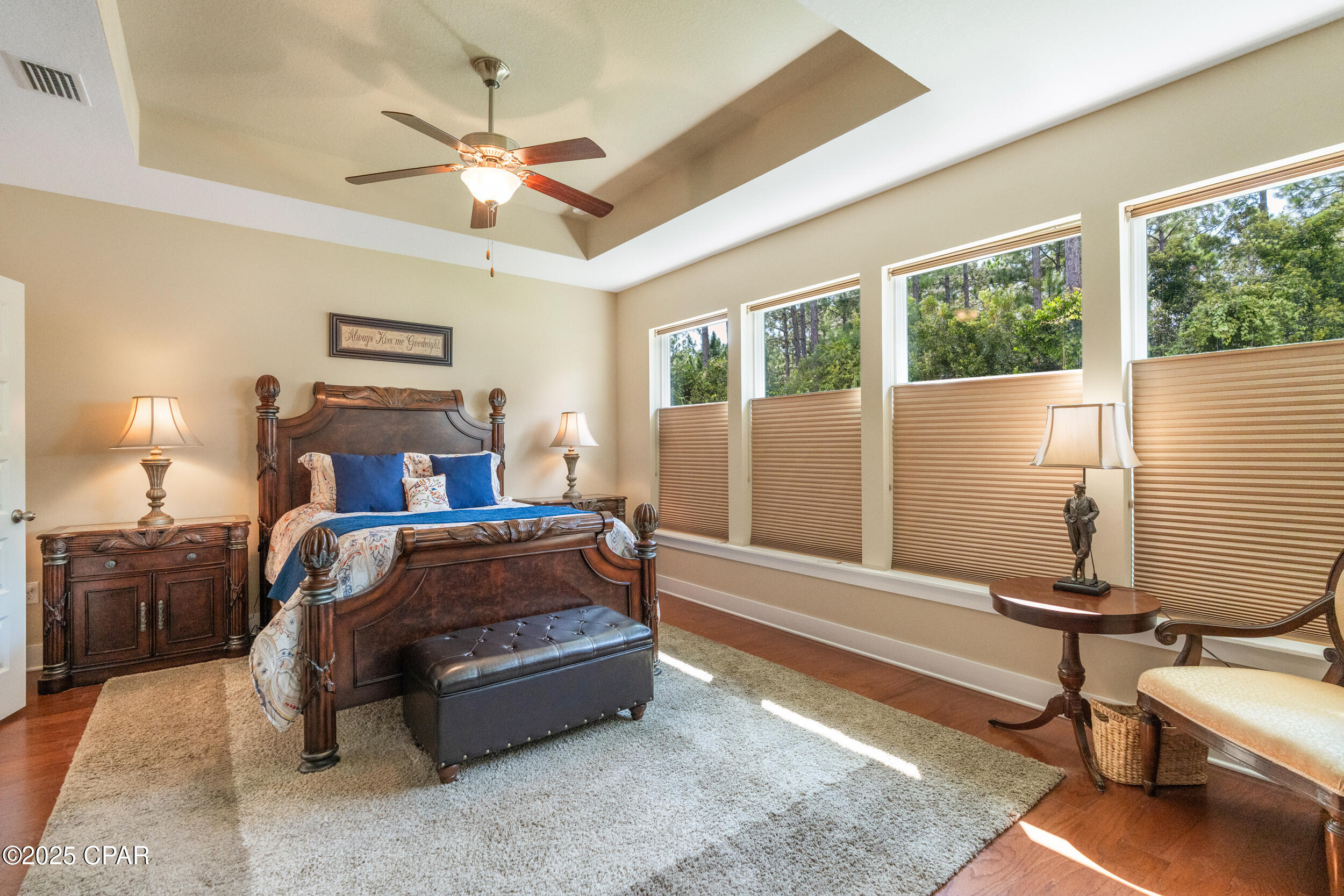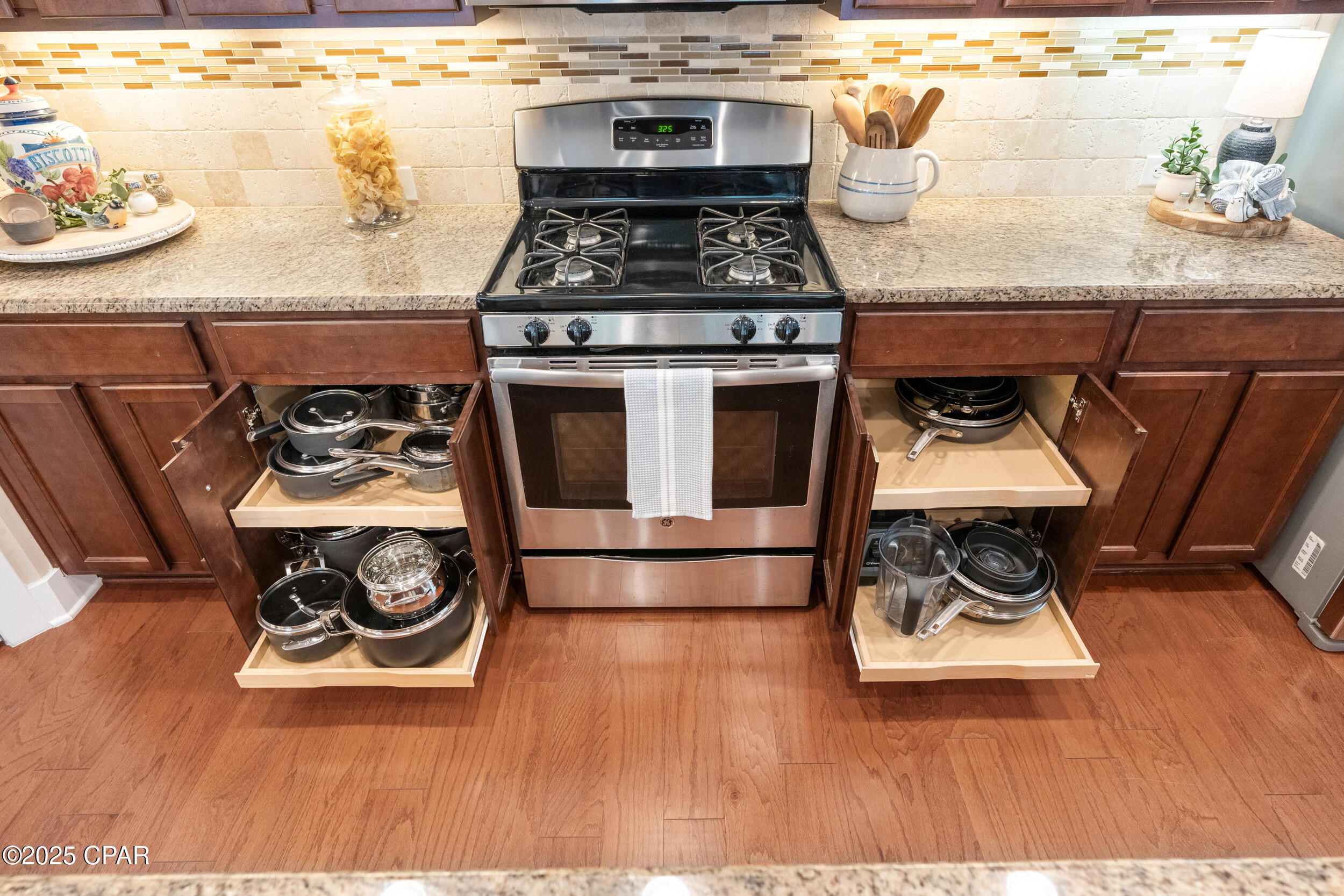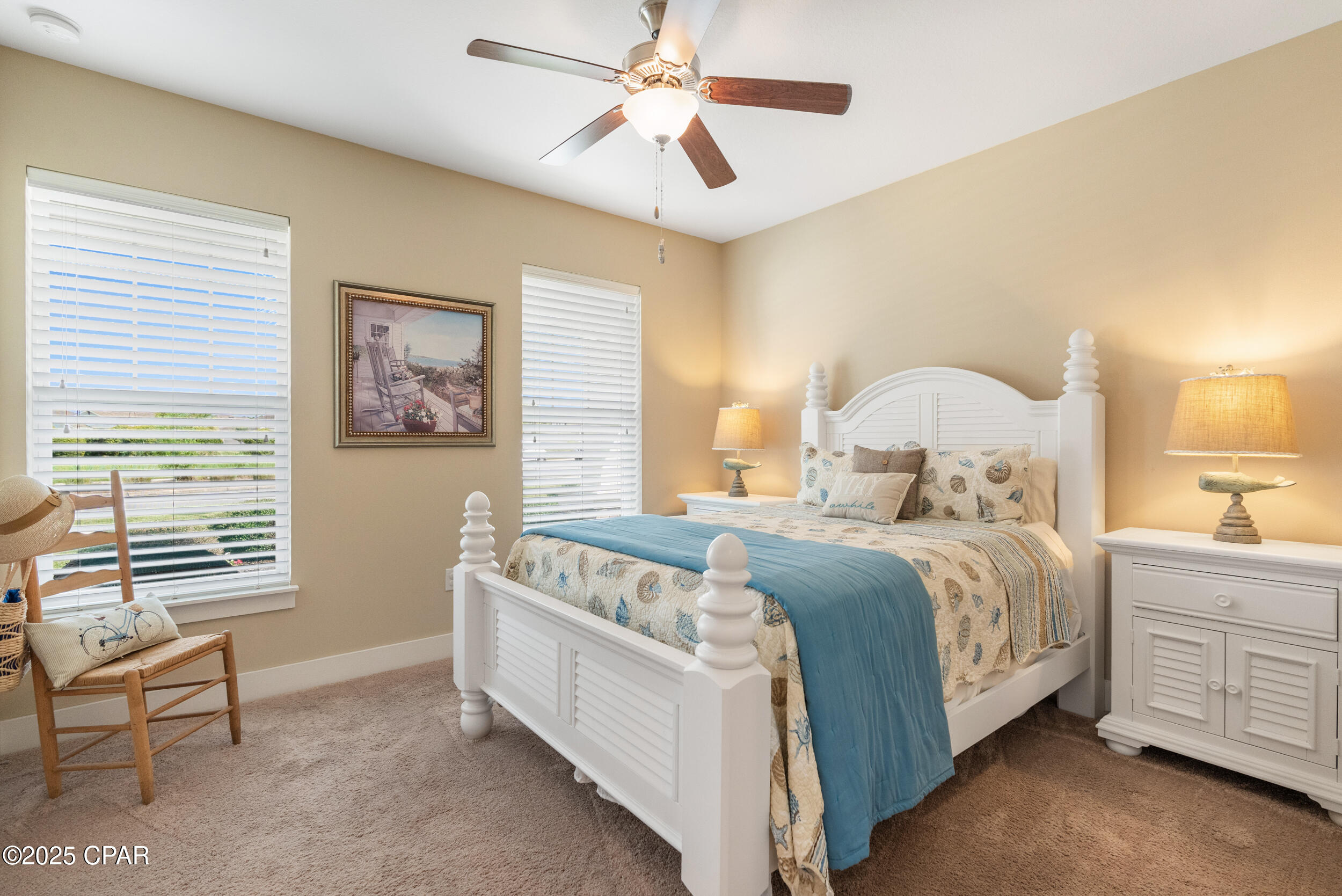 CURRENTLY UNDER CONTRACT, SELLER WILL CONSIDER BACKUP OFFERS. Set on one of the largest and most private lots in Breakfast Point, this 4BR/3BA home pairs open, modern living with a backyard designed for space and serenity. The oversized yard backs to wooded conservation land, creating a lush natural backdrop with no rear neighbors and shade in the mornings and afternoons. From the extended covered lanai, it's the perfect setting to relax, entertain, or simply enjoy the view. Inside, the open layout connects the living, dining, and kitchen areas under 10' ceilings with a tray ceiling detail in the great room. The kitchen combines style and function with granite counters, stainless steel appliances, under-cabinet lighting, a generous breakfast bar, and five pull-out cabinets for easy storage. A separate counter space makes an ideal coffee bar, while extra cabinetry keeps everything organized. The split floor plan offers flexibility, with one bedroom and bath tucked at the front of the home for guests, while the primary suite features double vanities, a soaking tub, and a walk-in glass shower. Additional highlights include a formal dining room, mudroom, ceiling speakers in the great room, cable outlets in every bedroom, composite wood flooring throughout with tile in the baths and laundry, and a 3-car garage. Out front, the home overlooks a neighborhood park with plenty of visitor parking, and a streetlight keeps the yard well lit in the evenings. Breakfast Point is known for its central location - Publix, shopping, and restaurants are just outside the neighborhood, schools are within walking distance, and the beach and Pier Park are only minutes away.