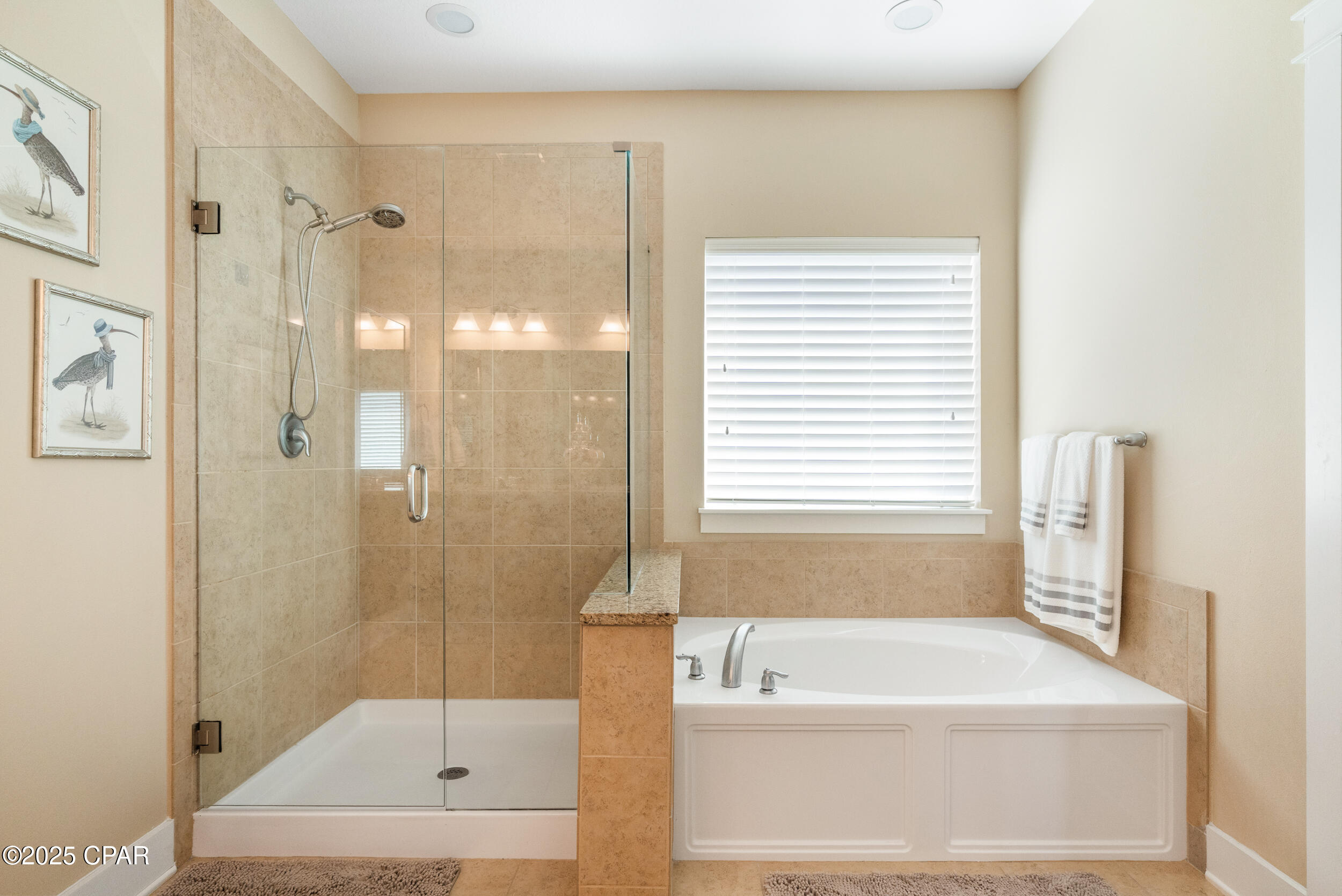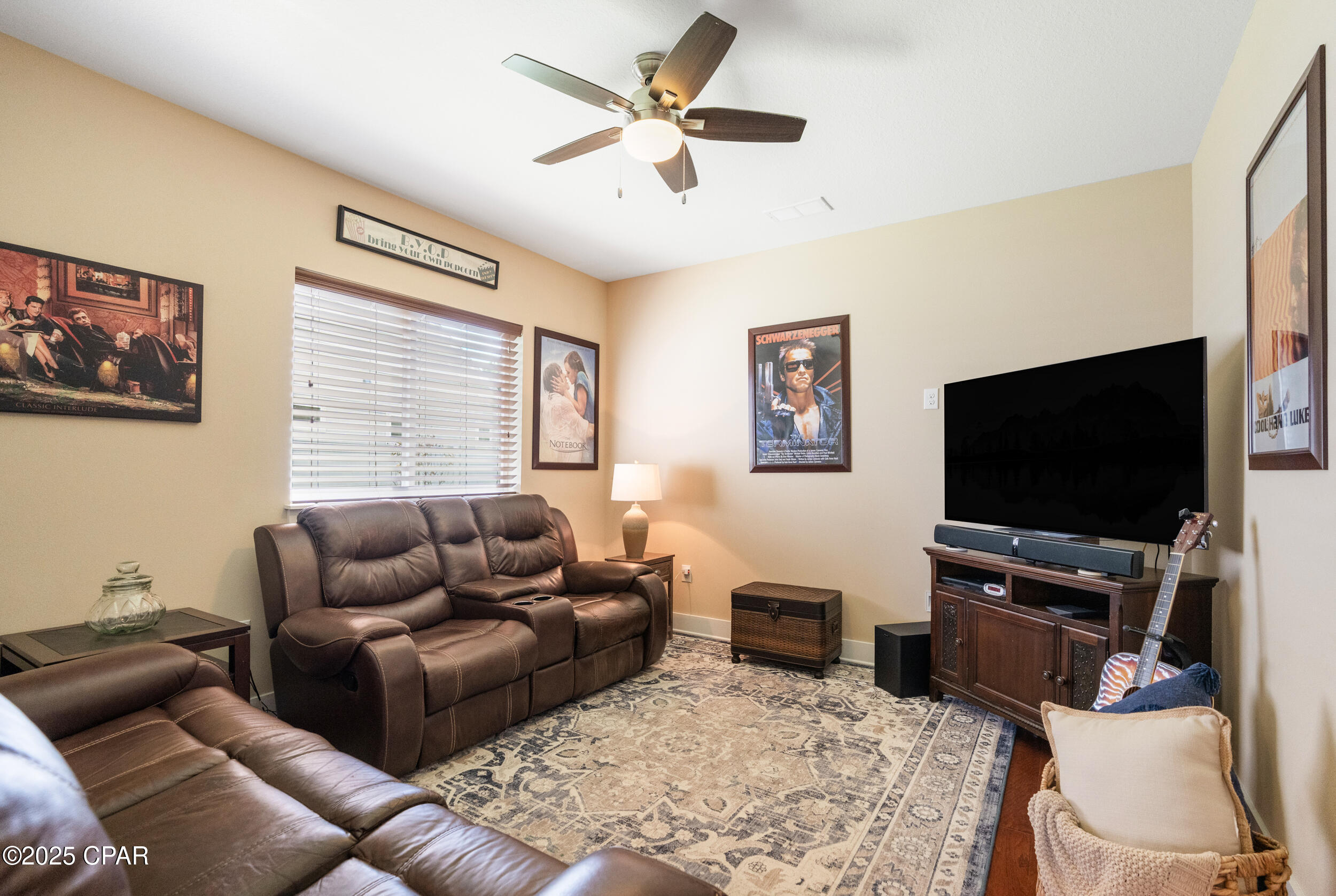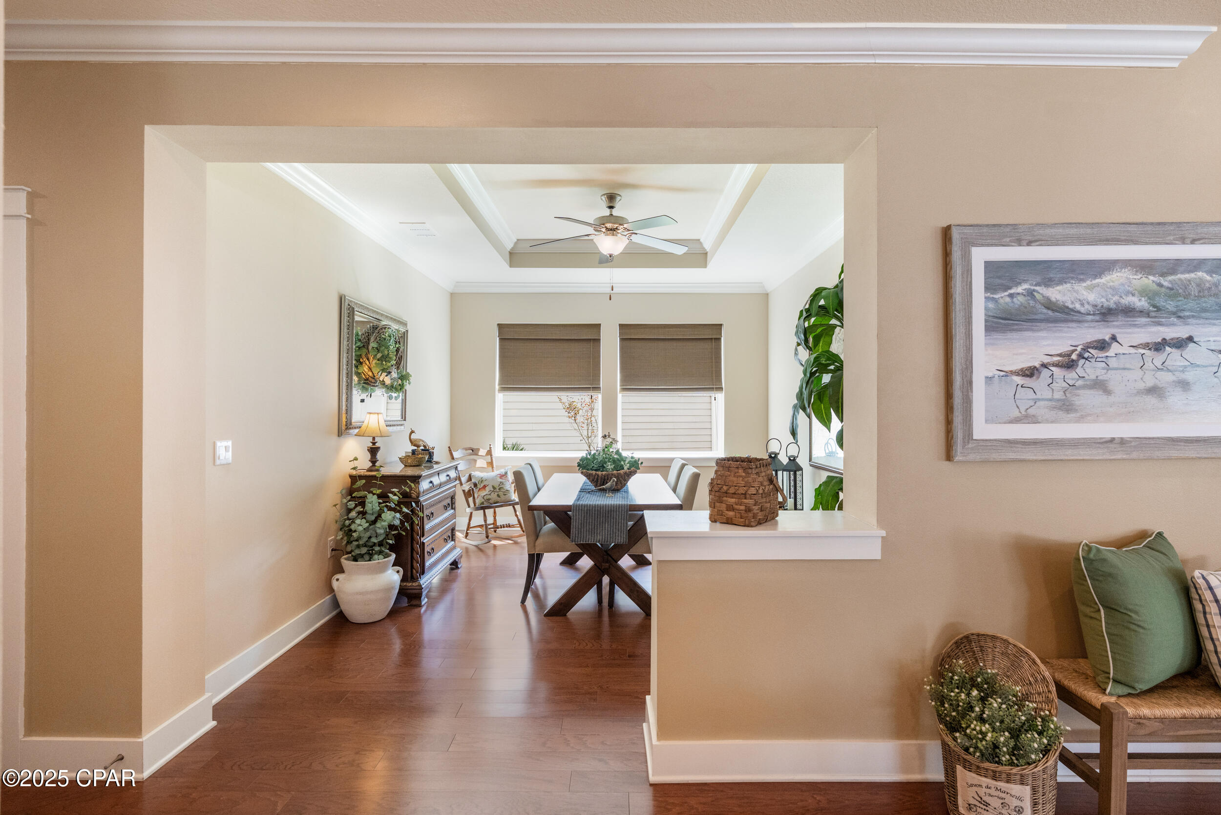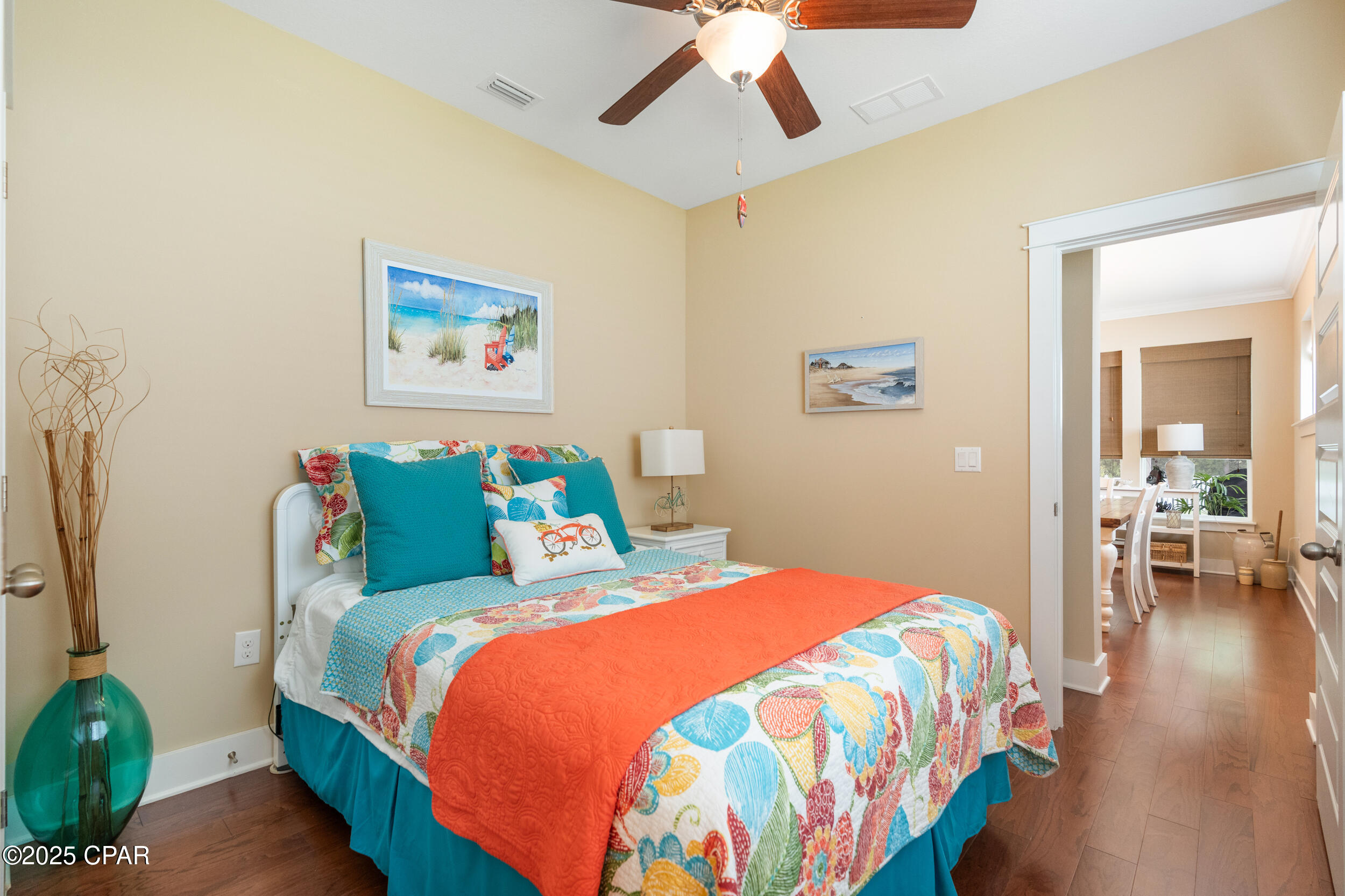 CURRENTLY UNDER CONTRACT, SELLER WILL CONSIDER BACKUP OFFERS. Set on one of the largest and most private lots in Breakfast Point, this 4BR/3BA home pairs open, modern living with a backyard designed for space and serenity. The oversized yard backs to wooded conservation land, creating a lush natural backdrop with no rear neighbors and shade in the mornings and afternoons. From the extended covered lanai, it's the perfect setting to relax, entertain, or simply enjoy the view. Inside, the open layout connects the living, dining, and kitchen areas under 10' ceilings with a tray ceiling detail in the great room. The kitchen combines style and function with granite counters, stainless steel appliances, under-cabinet lighting, a generous breakfast bar, and five pull-out cabinets for easy storage. A separate counter space makes an ideal coffee bar, while extra cabinetry keeps everything organized. The split floor plan offers flexibility, with one bedroom and bath tucked at the front of the home for guests, while the primary suite features double vanities, a soaking tub, and a walk-in glass shower. Additional highlights include a formal dining room, mudroom, ceiling speakers in the great room, cable outlets in every bedroom, composite wood flooring throughout with tile in the baths and laundry, and a 3-car garage. Out front, the home overlooks a neighborhood park with plenty of visitor parking, and a streetlight keeps the yard well lit in the evenings. Breakfast Point is known for its central location - Publix, shopping, and restaurants are just outside the neighborhood, schools are within walking distance, and the beach and Pier Park are only minutes away.