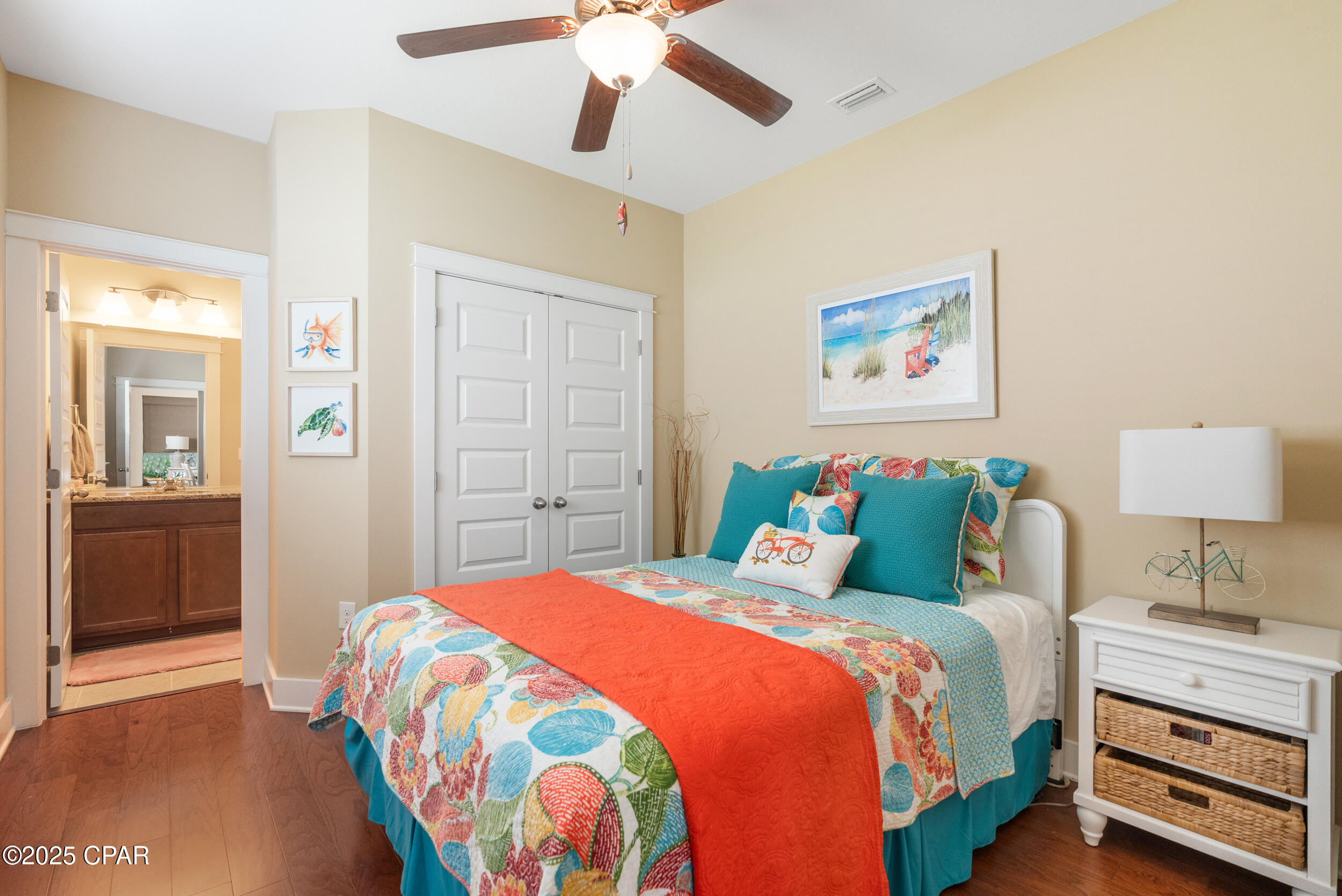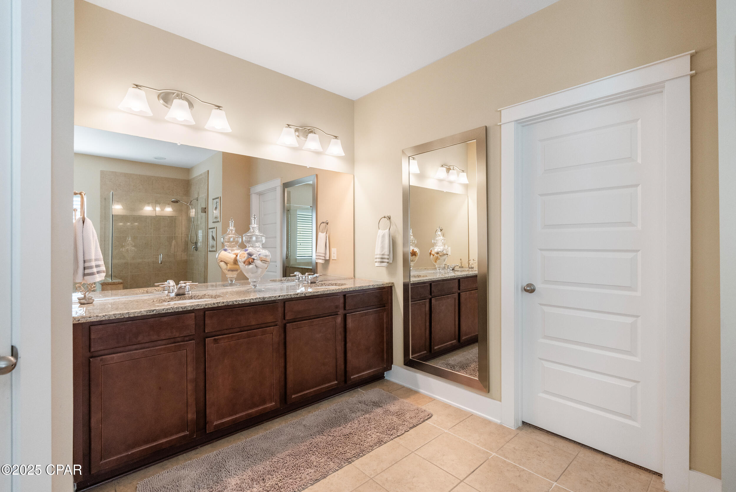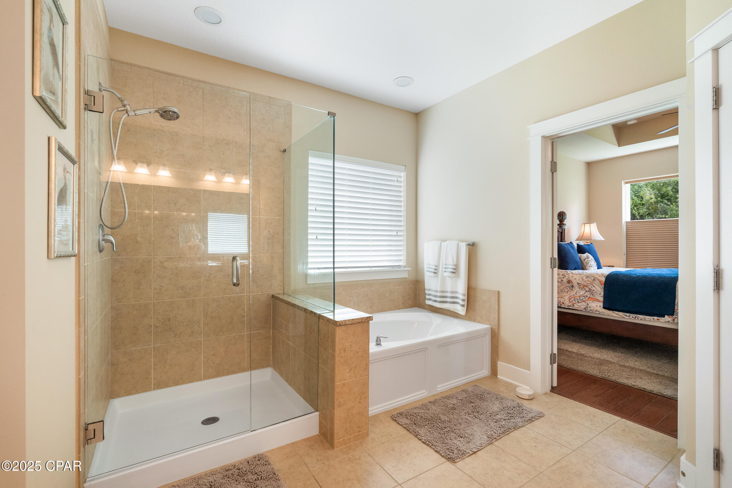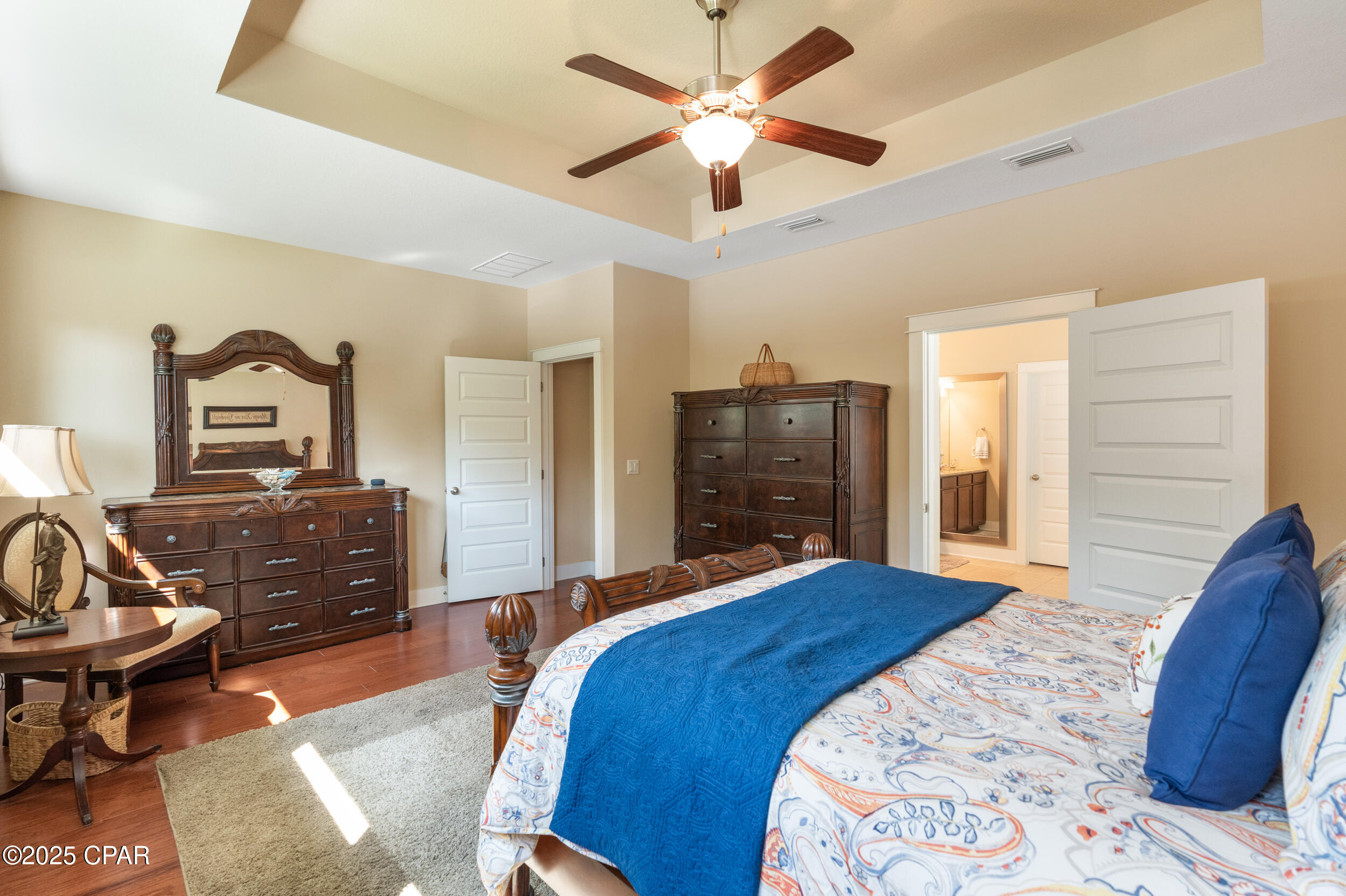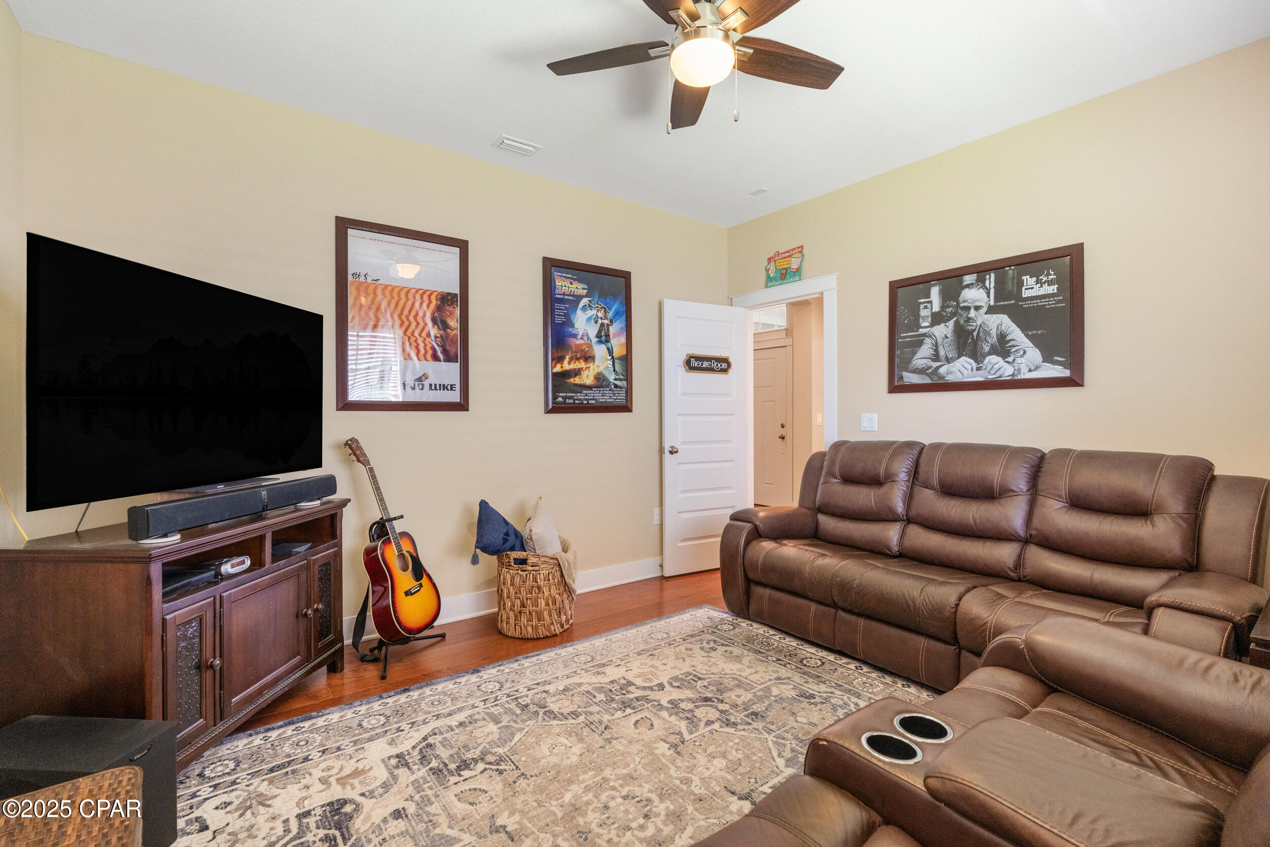 CURRENTLY UNDER CONTRACT, SELLER WILL CONSIDER BACKUP OFFERS. Set on one of the largest and most private lots in Breakfast Point, this 4BR/3BA home pairs open, modern living with a backyard designed for space and serenity. The oversized yard backs to wooded conservation land, creating a lush natural backdrop with no rear neighbors and shade in the mornings and afternoons. From the extended covered lanai, it's the perfect setting to relax, entertain, or simply enjoy the view. Inside, the open layout connects the living, dining, and kitchen areas under 10' ceilings with a tray ceiling detail in the great room. The kitchen combines style and function with granite counters, stainless steel appliances, under-cabinet lighting, a generous breakfast bar, and five pull-out cabinets for easy storage. A separate counter space makes an ideal coffee bar, while extra cabinetry keeps everything organized. The split floor plan offers flexibility, with one bedroom and bath tucked at the front of the home for guests, while the primary suite features double vanities, a soaking tub, and a walk-in glass shower. Additional highlights include a formal dining room, mudroom, ceiling speakers in the great room, cable outlets in every bedroom, composite wood flooring throughout with tile in the baths and laundry, and a 3-car garage. Out front, the home overlooks a neighborhood park with plenty of visitor parking, and a streetlight keeps the yard well lit in the evenings. Breakfast Point is known for its central location - Publix, shopping, and restaurants are just outside the neighborhood, schools are within walking distance, and the beach and Pier Park are only minutes away.