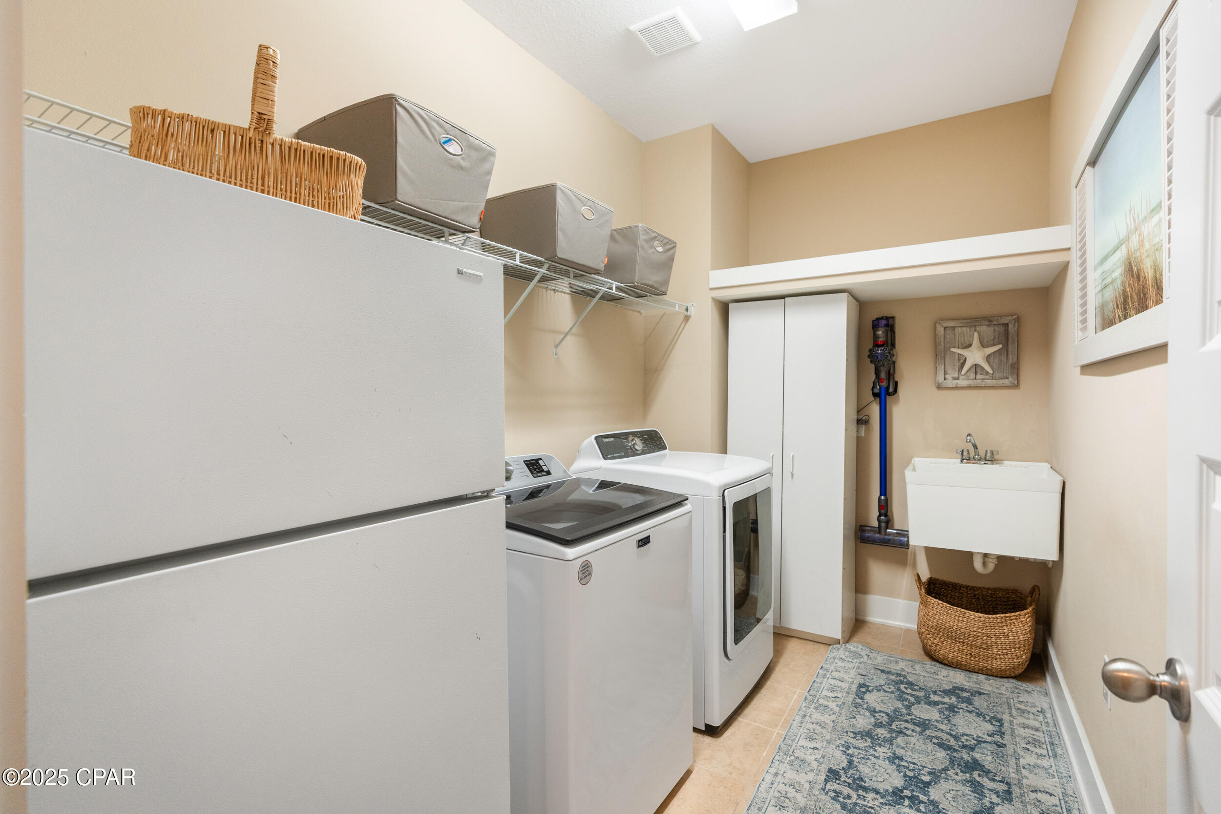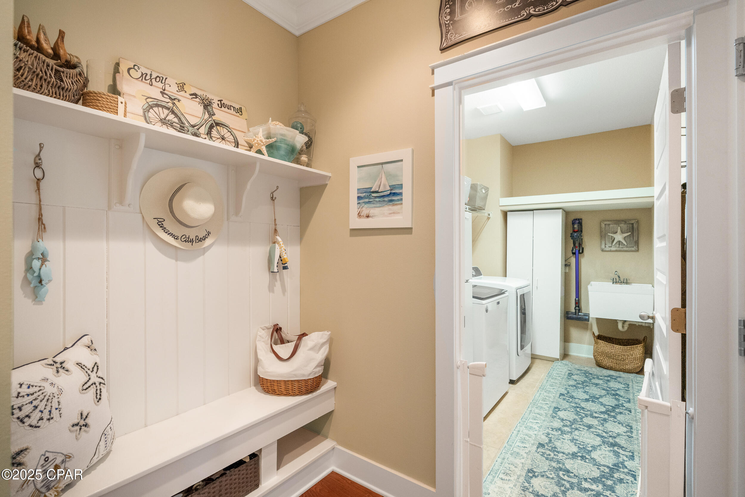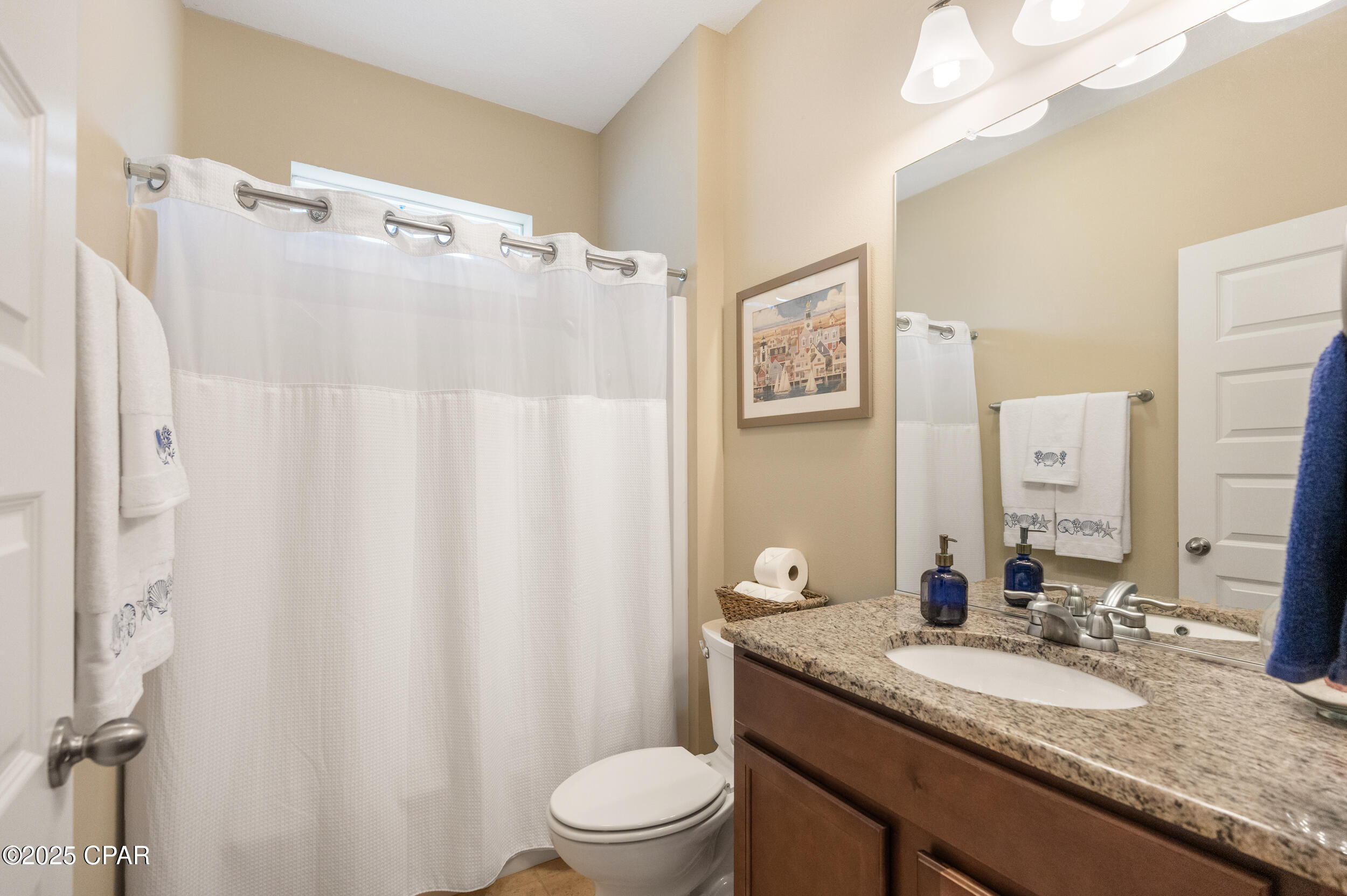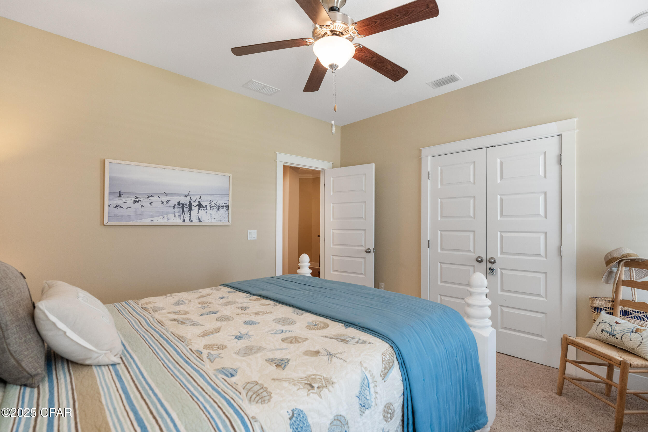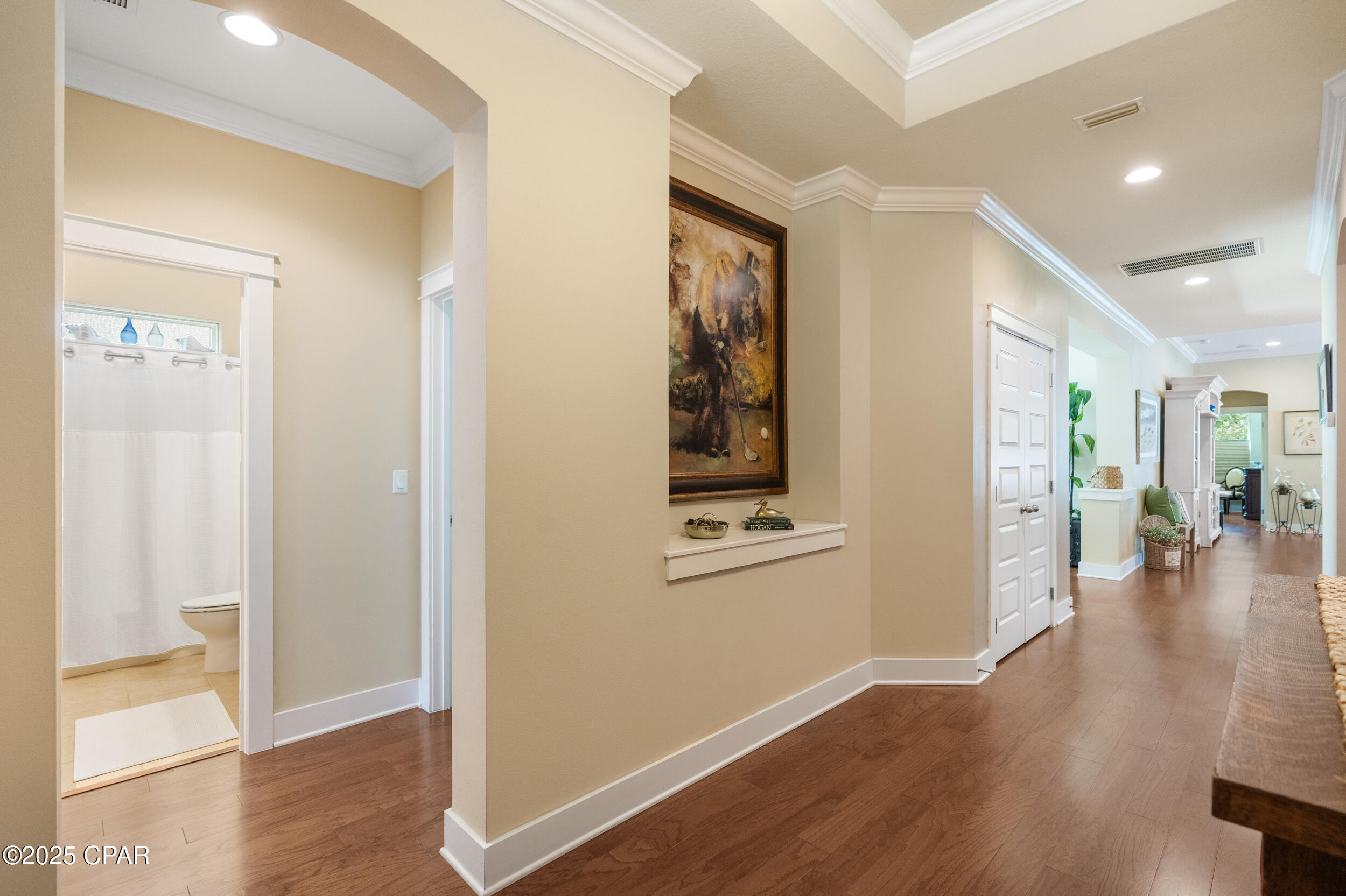 CURRENTLY UNDER CONTRACT, SELLER WILL CONSIDER BACKUP OFFERS. Set on one of the largest and most private lots in Breakfast Point, this 4BR/3BA home pairs open, modern living with a backyard designed for space and serenity. The oversized yard backs to wooded conservation land, creating a lush natural backdrop with no rear neighbors and shade in the mornings and afternoons. From the extended covered lanai, it's the perfect setting to relax, entertain, or simply enjoy the view. Inside, the open layout connects the living, dining, and kitchen areas under 10' ceilings with a tray ceiling detail in the great room. The kitchen combines style and function with granite counters, stainless steel appliances, under-cabinet lighting, a generous breakfast bar, and five pull-out cabinets for easy storage. A separate counter space makes an ideal coffee bar, while extra cabinetry keeps everything organized. The split floor plan offers flexibility, with one bedroom and bath tucked at the front of the home for guests, while the primary suite features double vanities, a soaking tub, and a walk-in glass shower. Additional highlights include a formal dining room, mudroom, ceiling speakers in the great room, cable outlets in every bedroom, composite wood flooring throughout with tile in the baths and laundry, and a 3-car garage. Out front, the home overlooks a neighborhood park with plenty of visitor parking, and a streetlight keeps the yard well lit in the evenings. Breakfast Point is known for its central location - Publix, shopping, and restaurants are just outside the neighborhood, schools are within walking distance, and the beach and Pier Park are only minutes away.