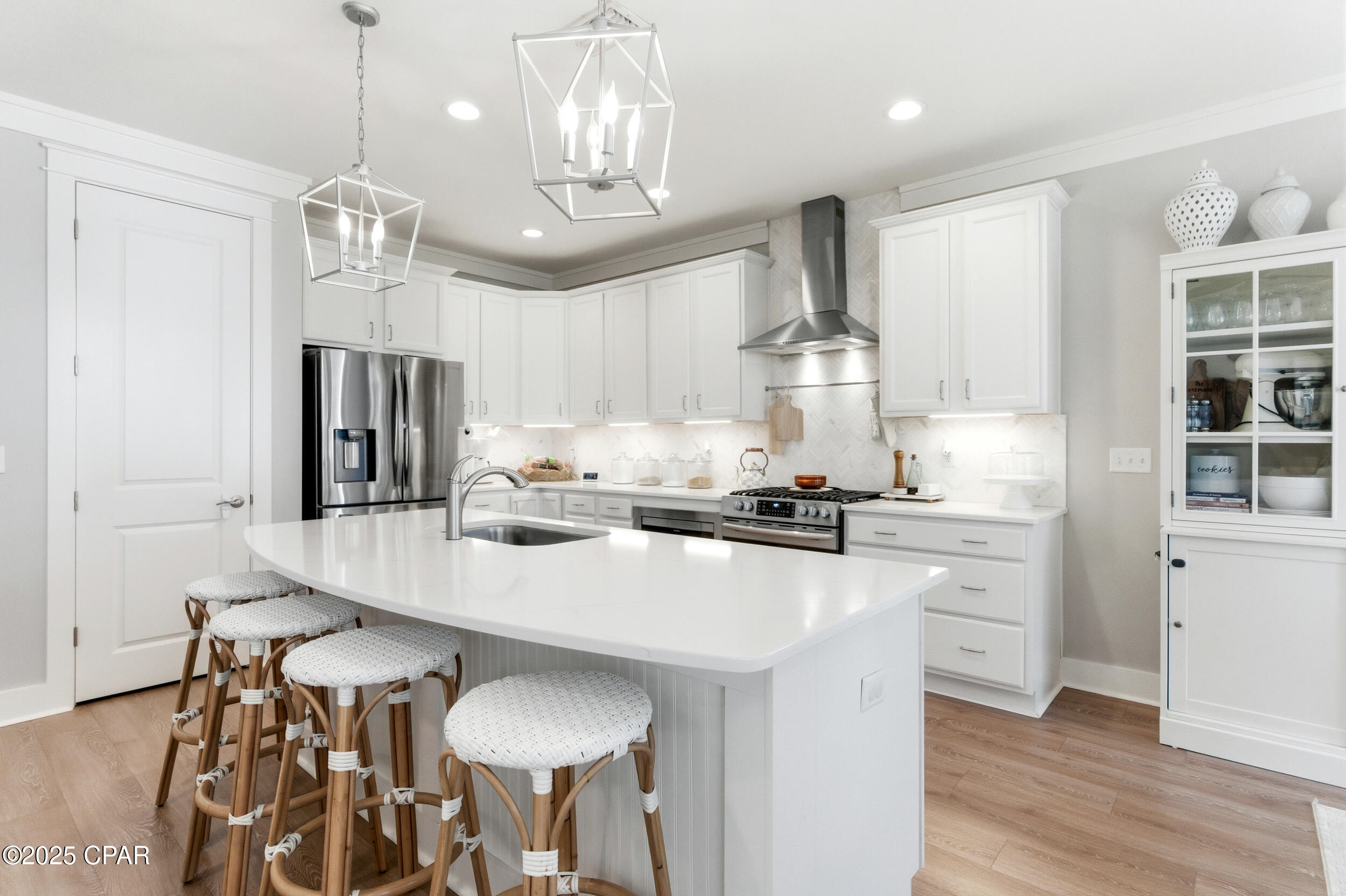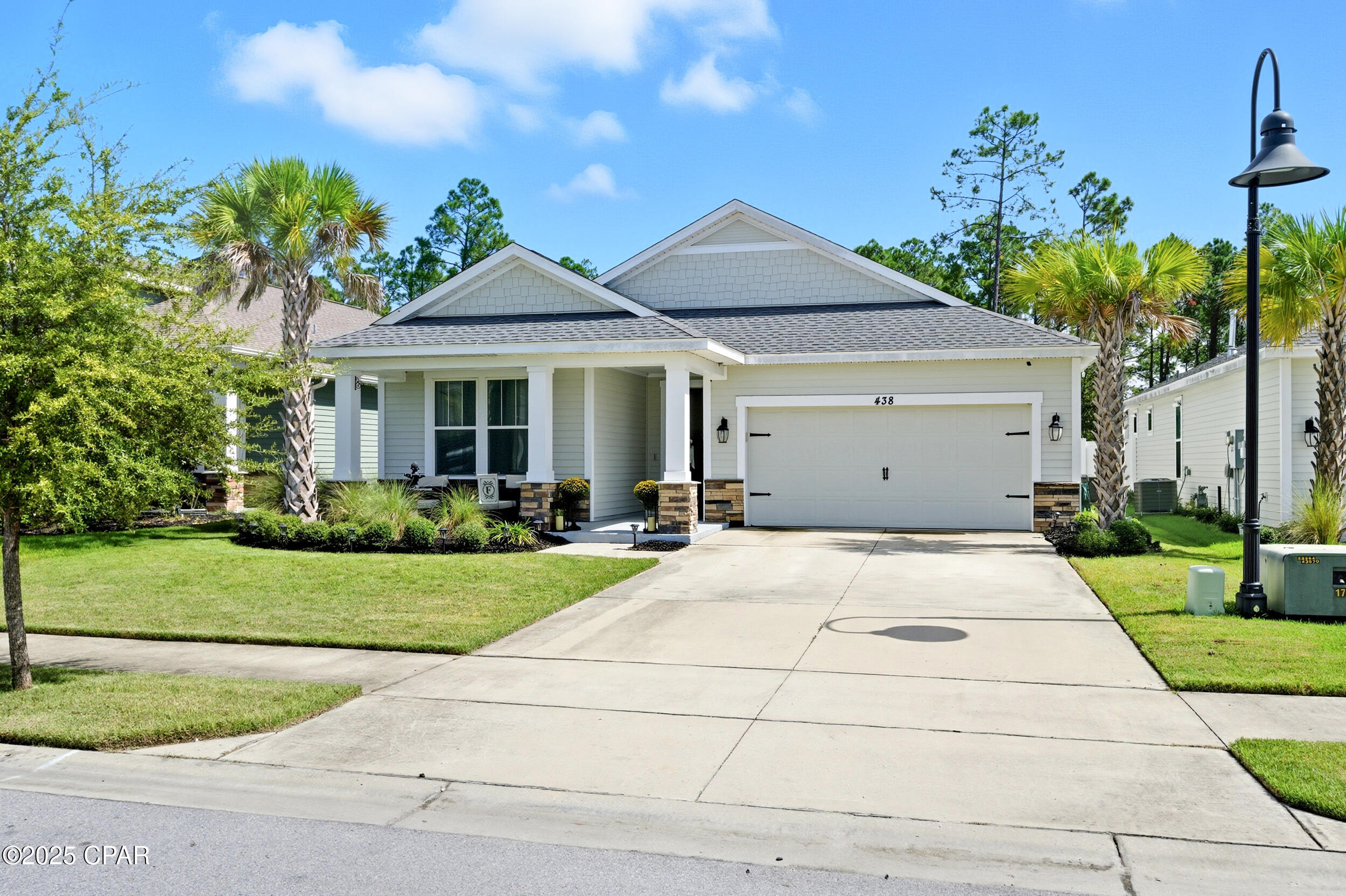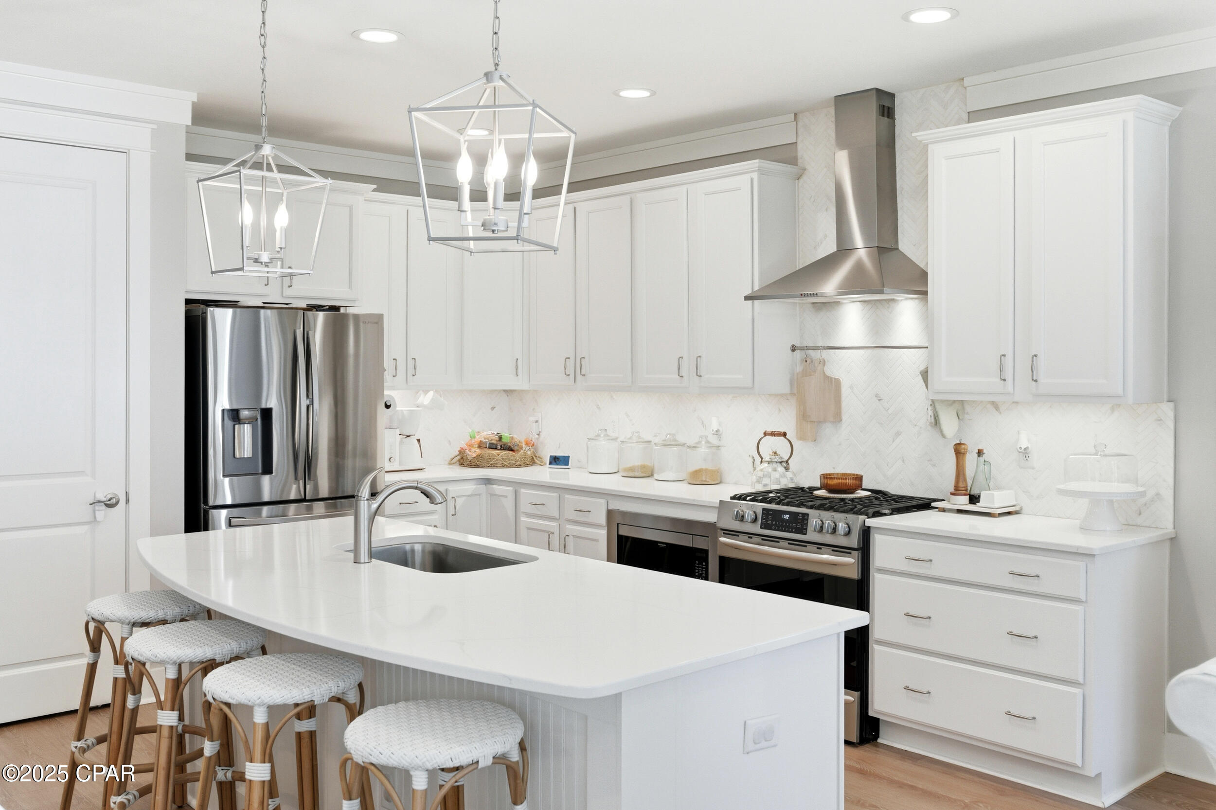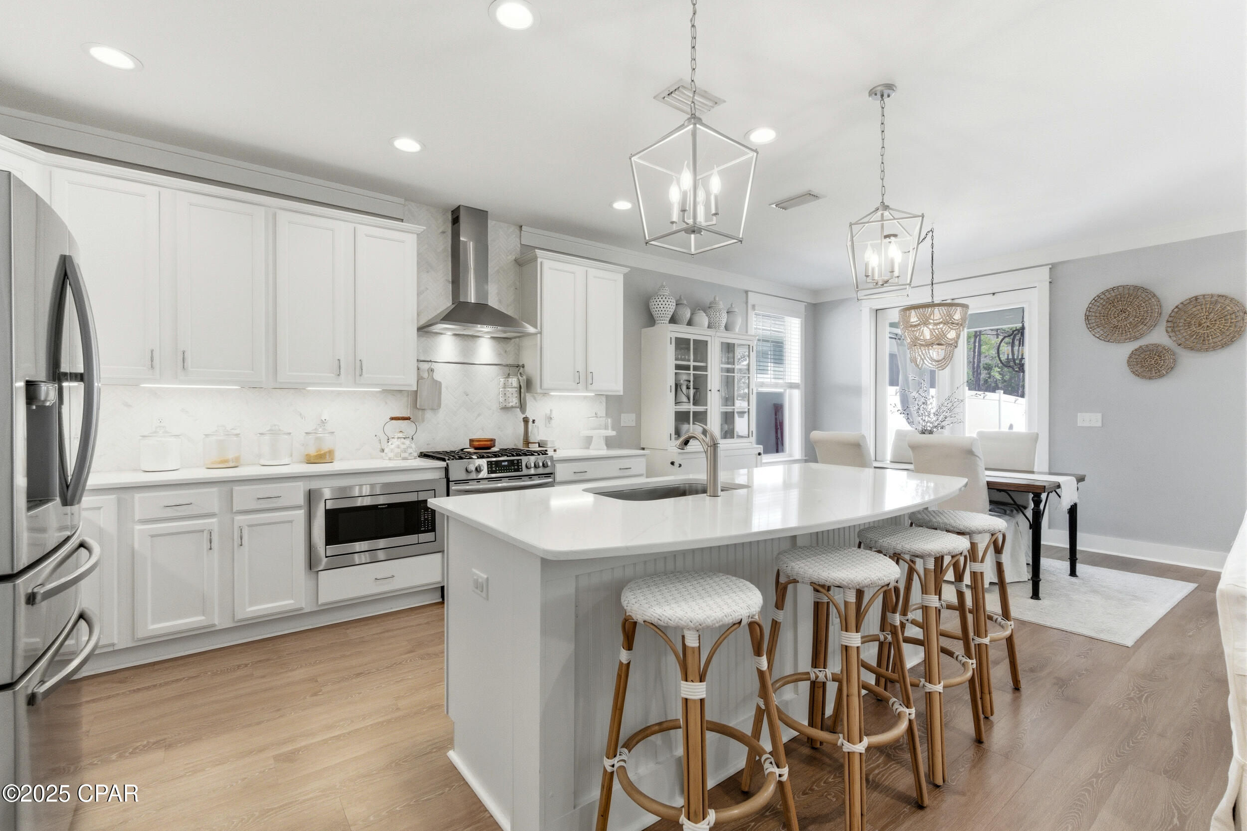 This 3BR/2BA Craftsman-style Samuel Taylor home in Breakfast Point offers a quiet, green backdrop just minutes from the beach and amenities. Designed with both comfort and style in mind, the open floor plan feels bright and spacious with 9- and 10-foot ceilings and a recessed ceiling detail in the living area. The modern kitchen features white cabinetry, quartz countertops, a herringbone tile backsplash, stainless appliances including a gas range with vent hood, and a large island with bar seating -- ideal for both cooking and gathering.