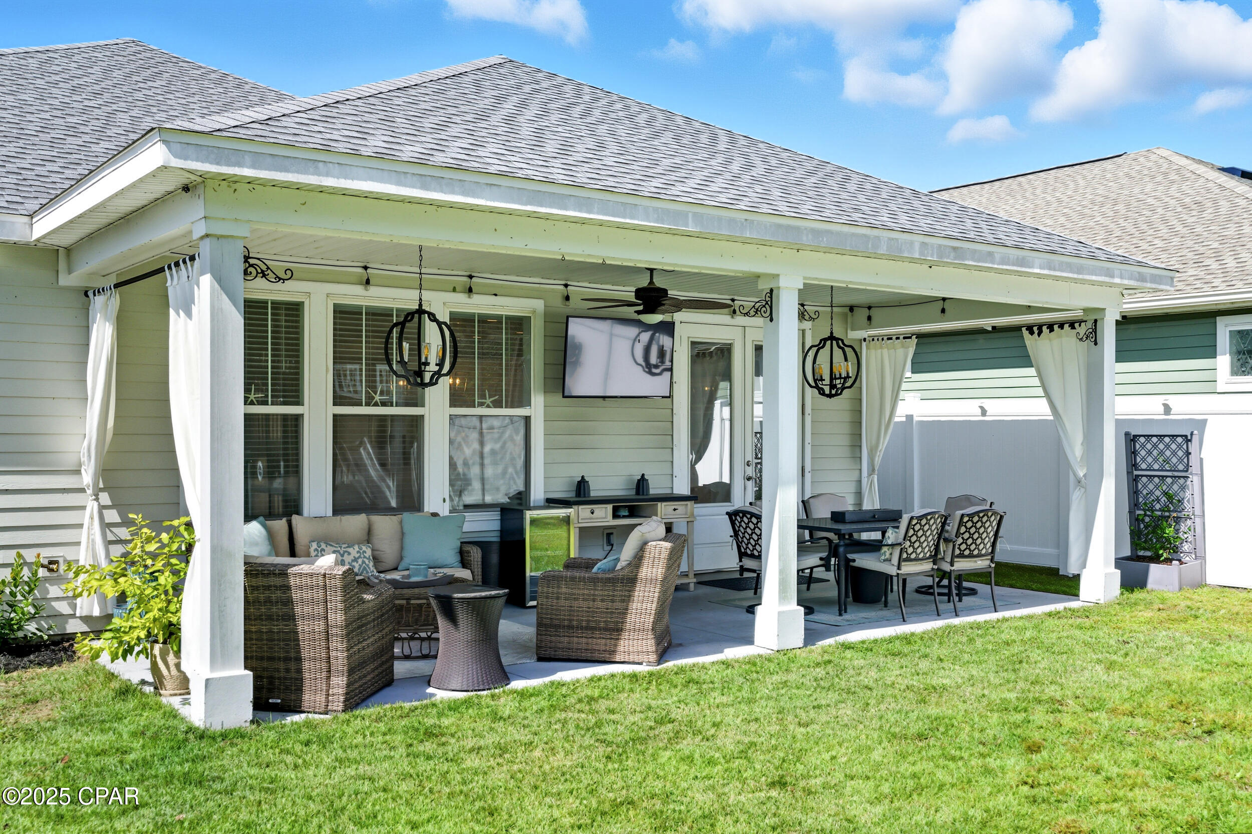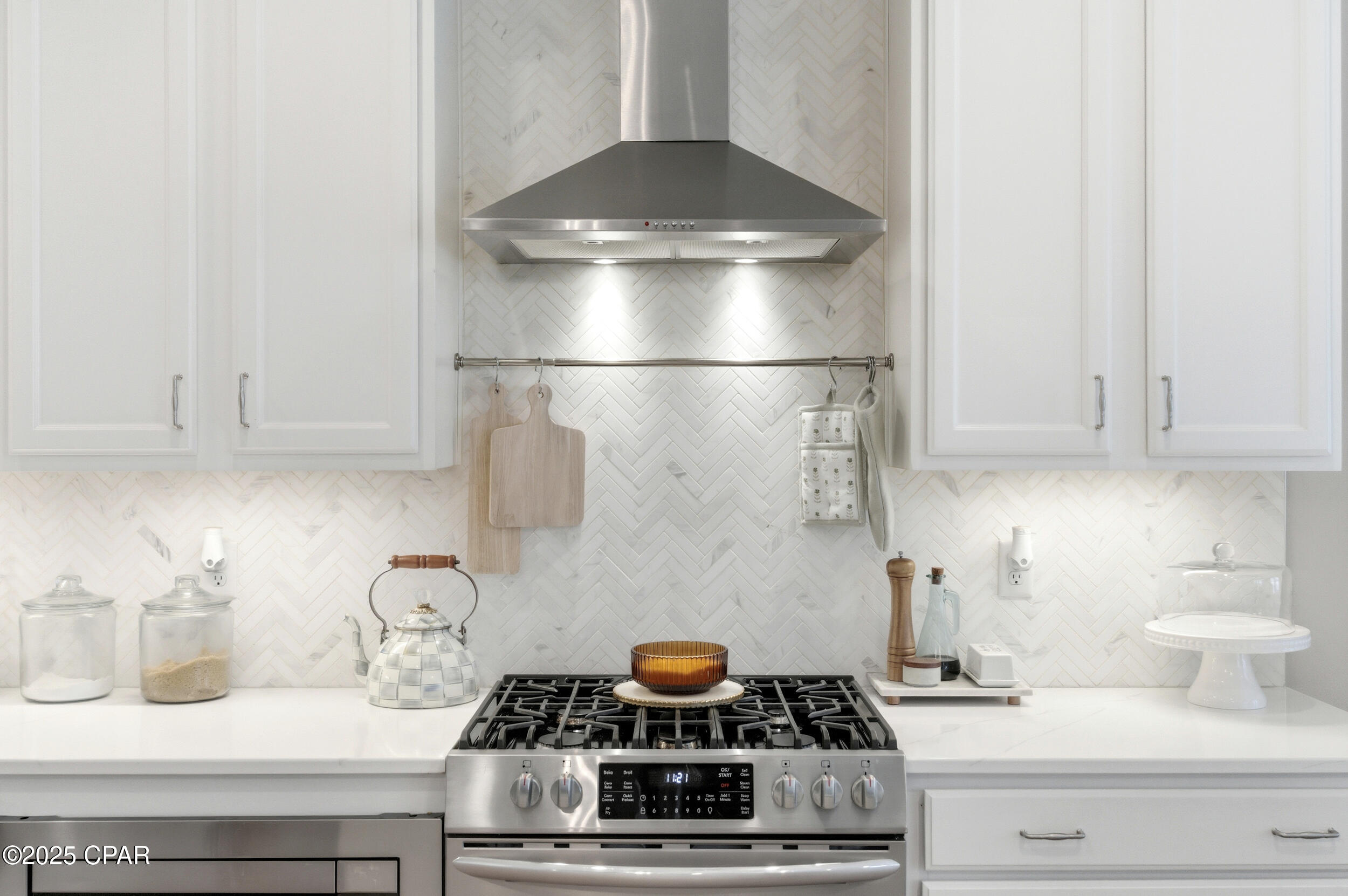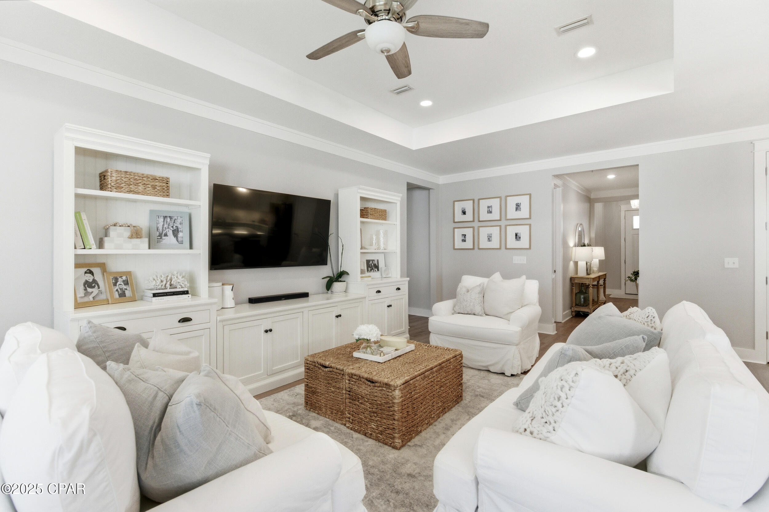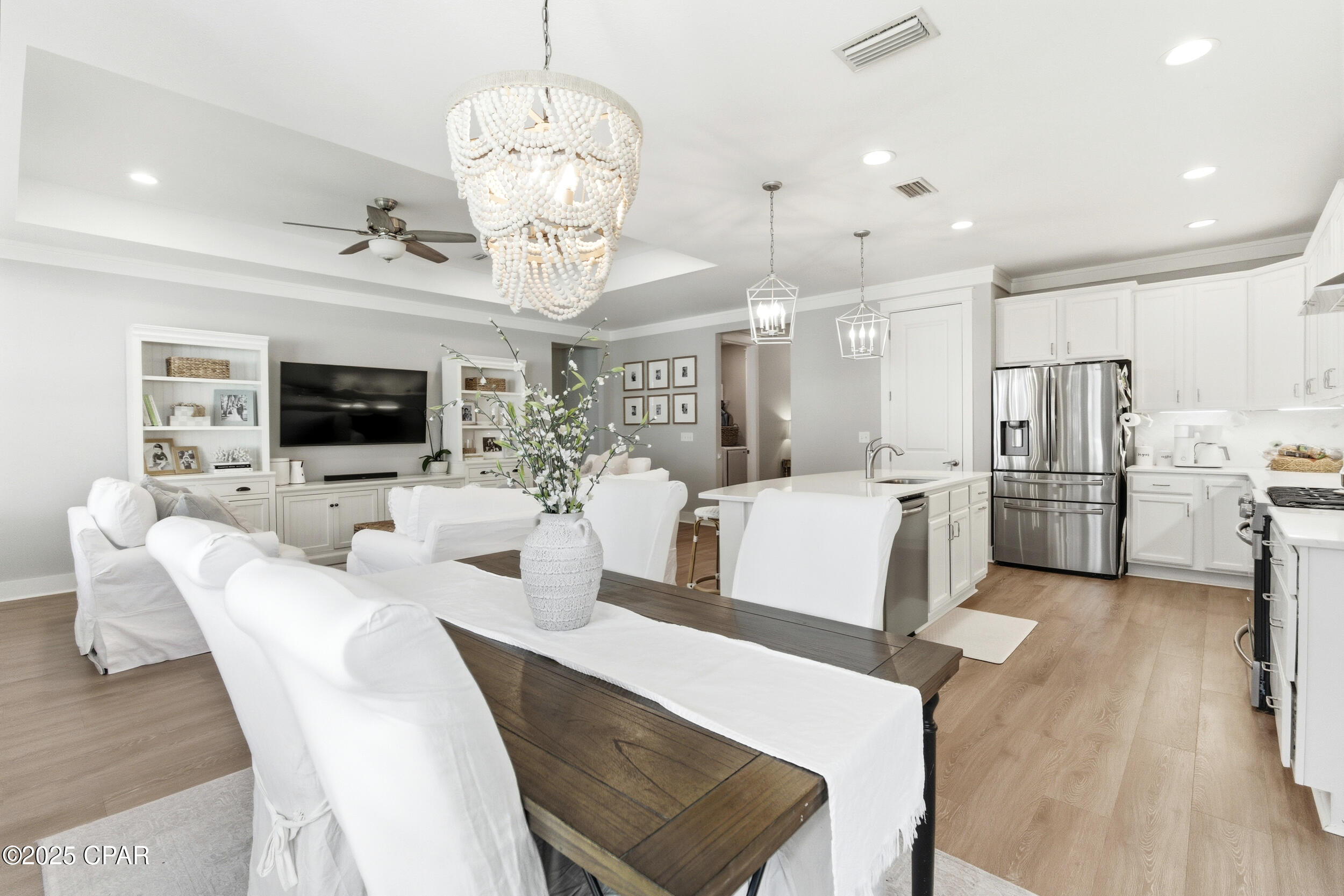 This 3BR/2BA Craftsman-style Samuel Taylor home in Breakfast Point offers a quiet, green backdrop just minutes from the beach and amenities. Designed with both comfort and style in mind, the open floor plan feels bright and spacious with 9- and 10-foot ceilings and a recessed ceiling detail in the living area. The modern kitchen features white cabinetry, quartz countertops, a herringbone tile backsplash, stainless appliances including a gas range with vent hood, and a large island with bar seating -- ideal for both cooking and gathering.