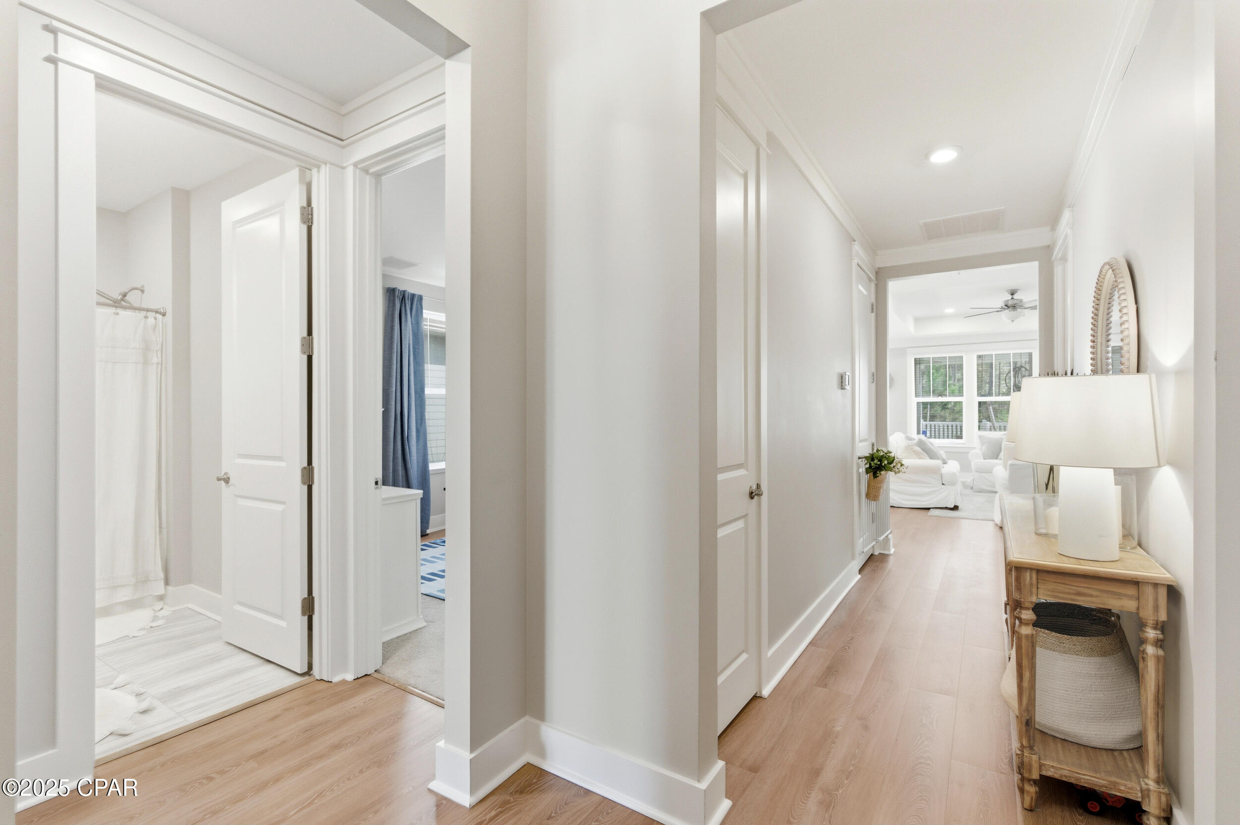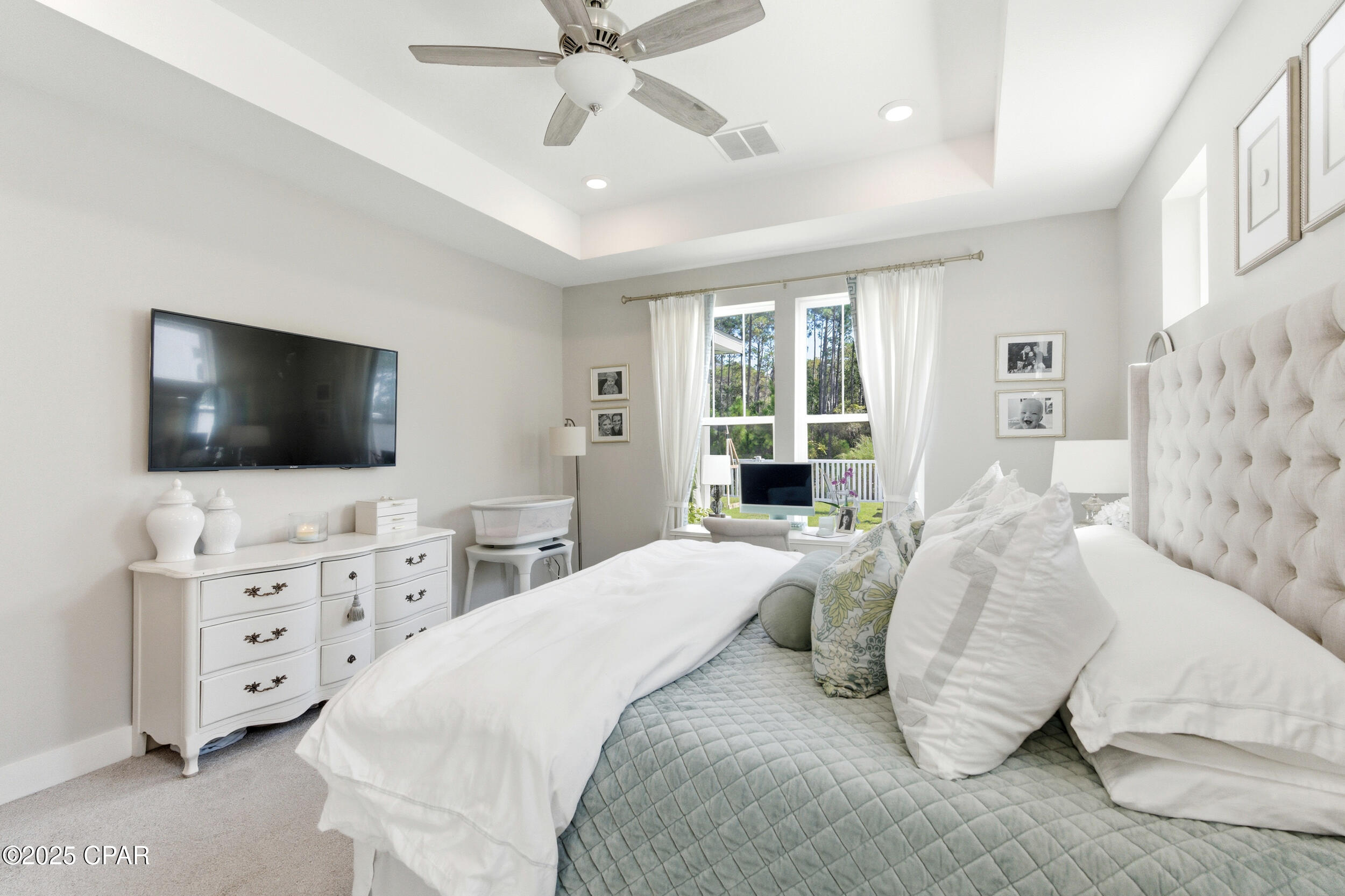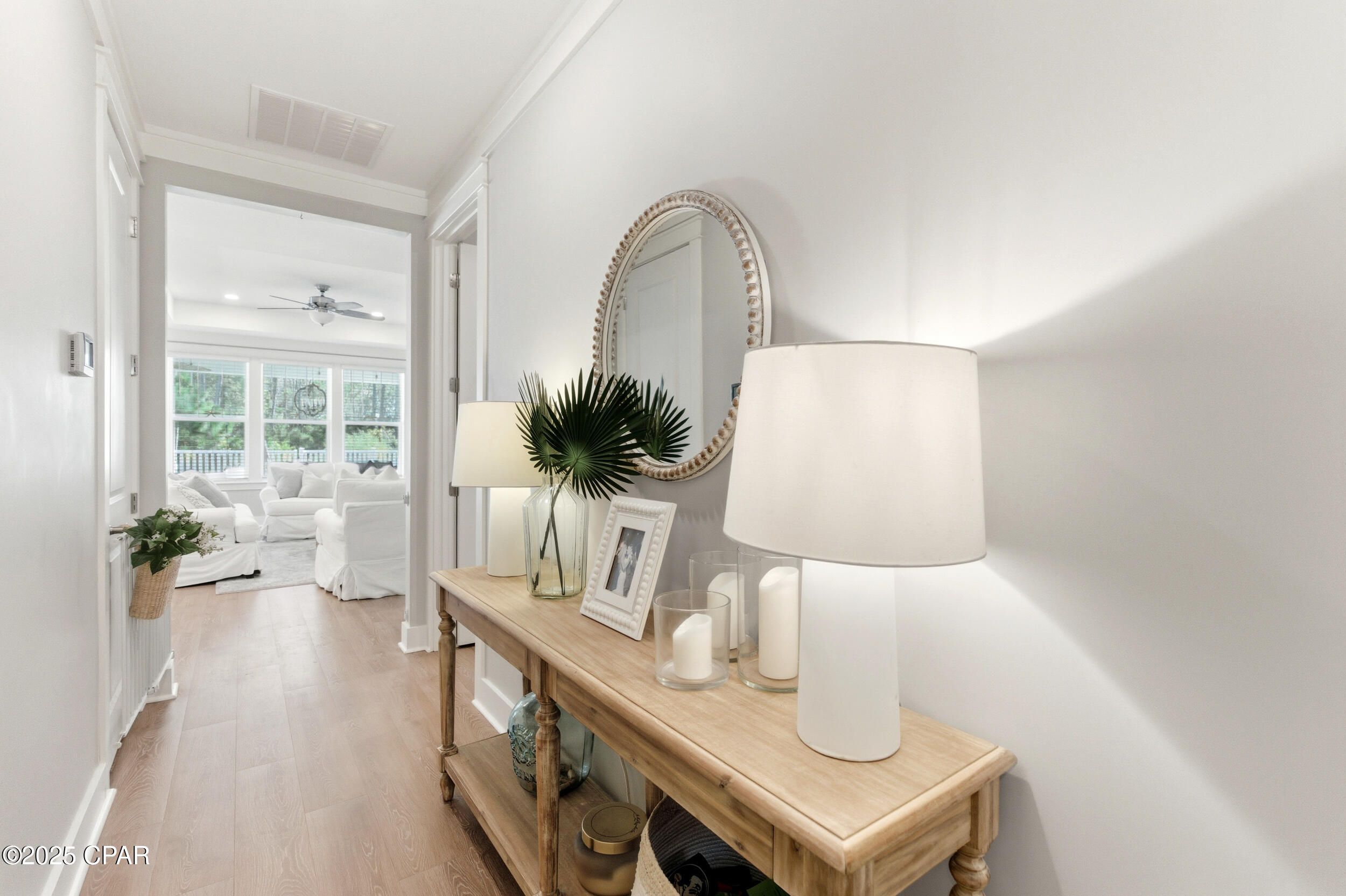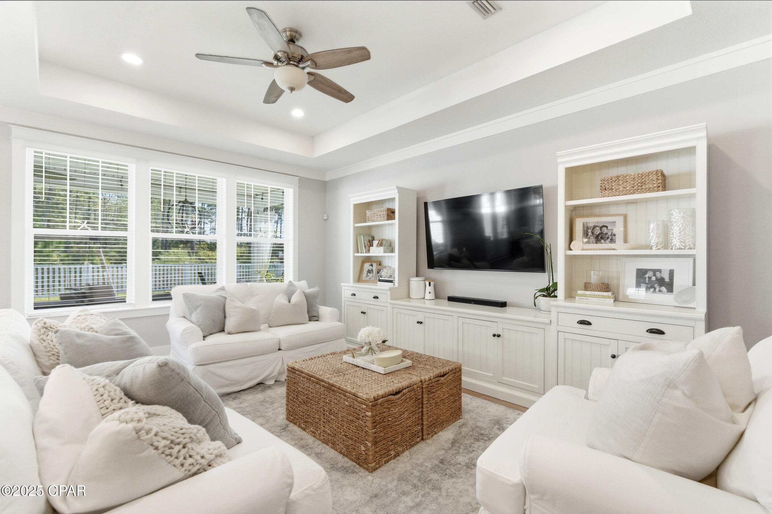 This 3BR/2BA Craftsman-style Samuel Taylor home in Breakfast Point offers a quiet, green backdrop just minutes from the beach and amenities. Designed with both comfort and style in mind, the open floor plan feels bright and spacious with 9- and 10-foot ceilings and a recessed ceiling detail in the living area. The modern kitchen features white cabinetry, quartz countertops, a herringbone tile backsplash, stainless appliances including a gas range with vent hood, and a large island with bar seating -- ideal for both cooking and gathering.