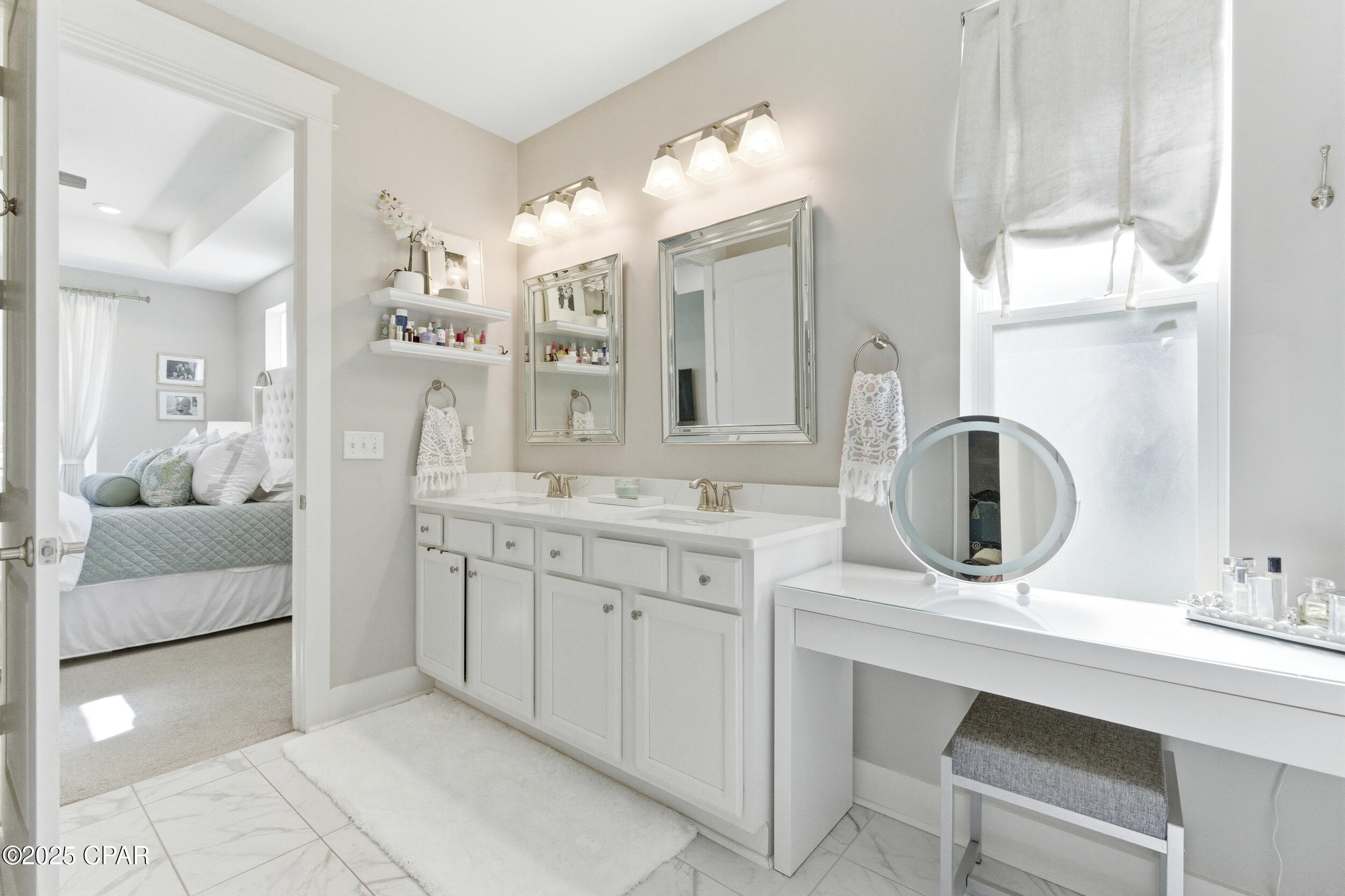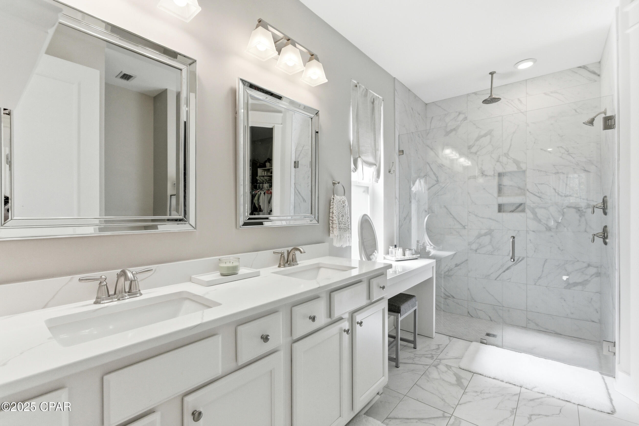 Luxury vinyl plank flooring adds a clean, low-maintenance finish throughout the main spaces, complemented by tile in the baths and plush carpet in the bedrooms. The primary suite includes a walk-in closet, dual vanities, and an oversized tile shower. Two additional bedrooms and a full bath with a tub/shower combination offer flexibility for family, guests, or a home office.