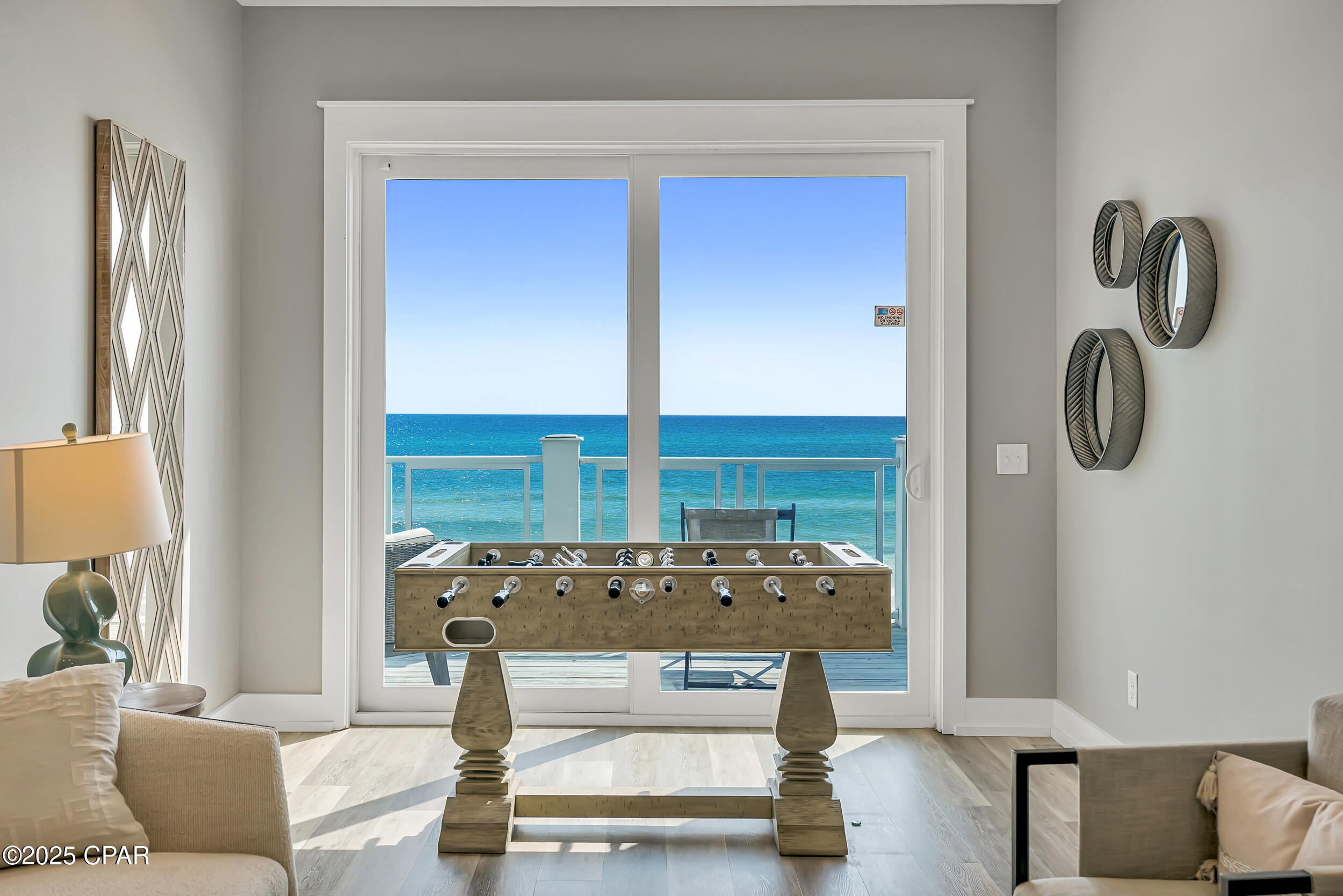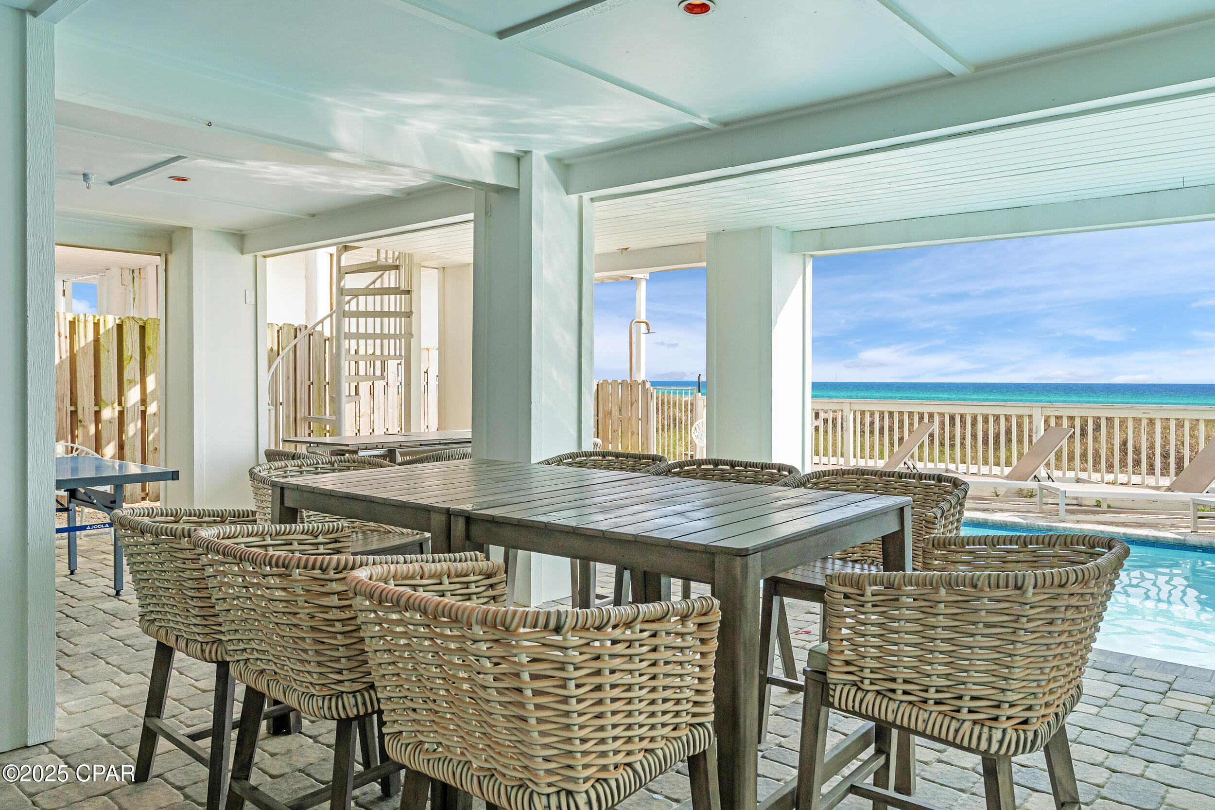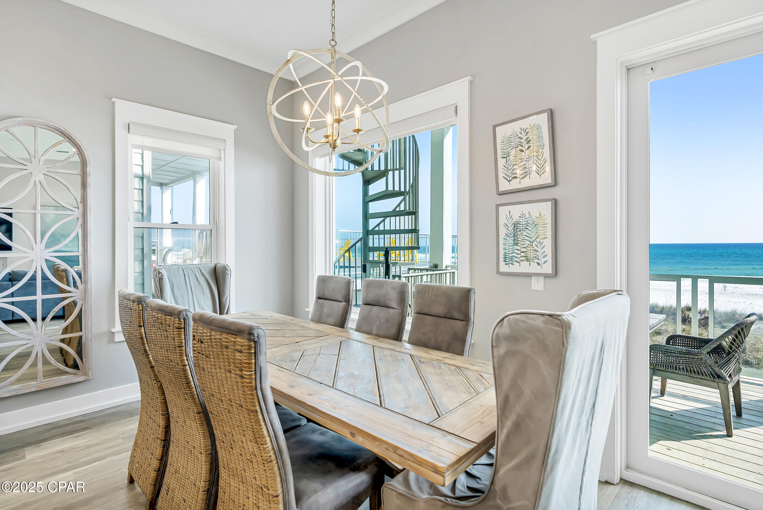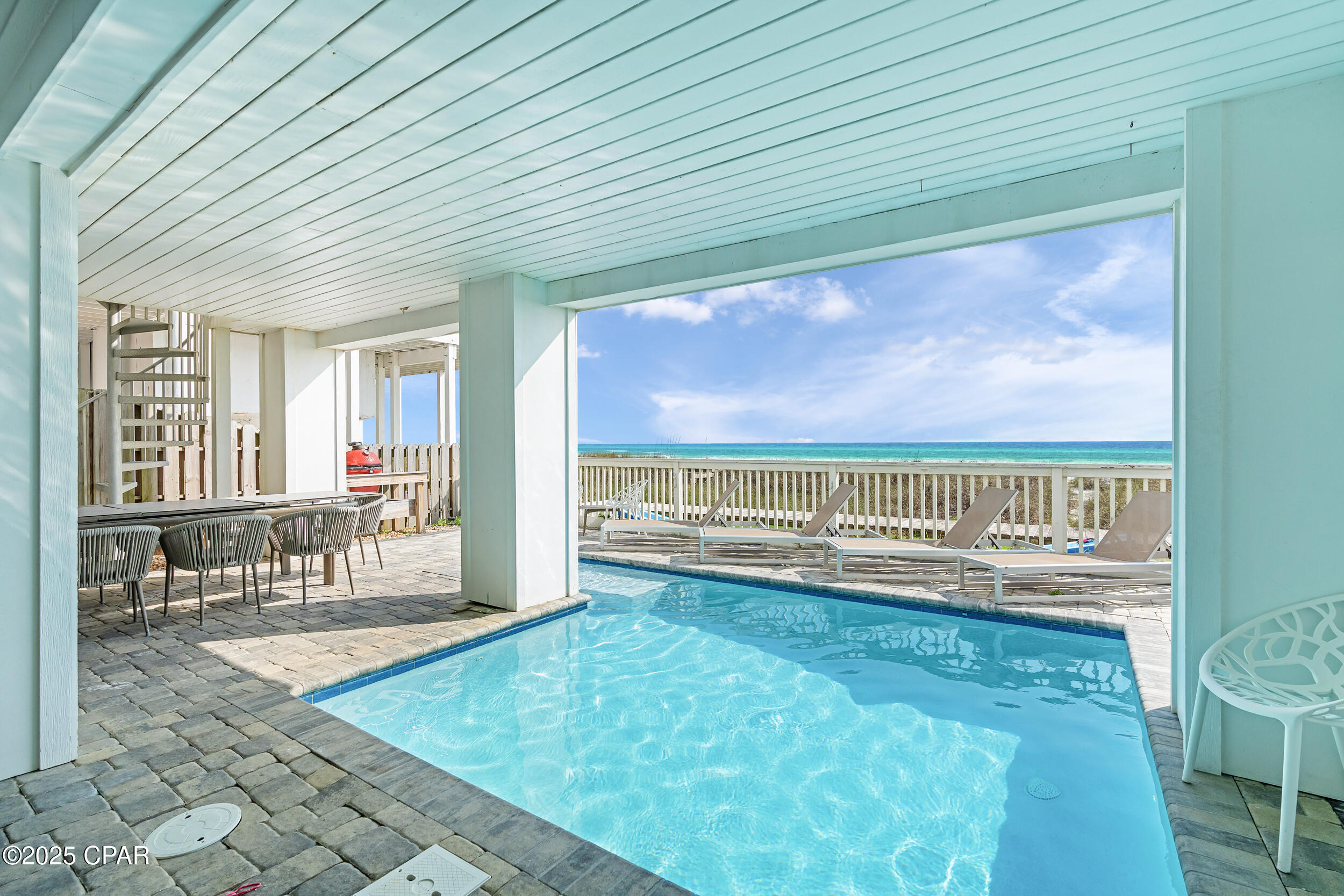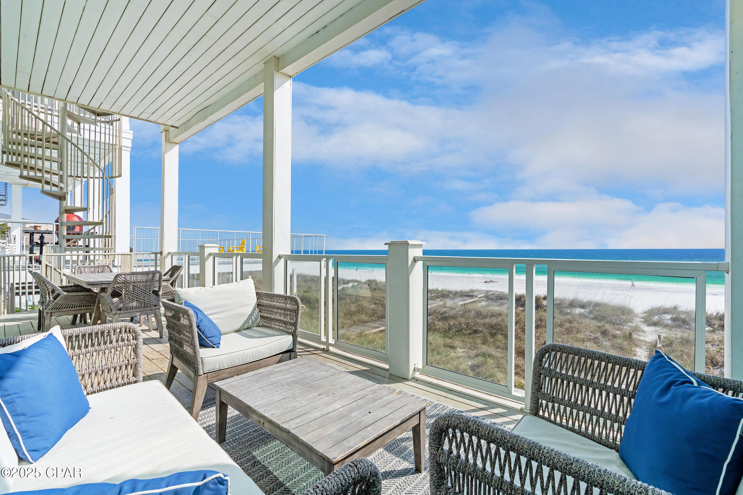 Welcome to Stay Salty, a Gulf-front luxury home located in one of the most desirable and peaceful stretches of Panama City Beach. Offered fully furnished and professionally designed, this extraordinary coastal residence delivers over 5,600 square feet of refined living space across four levels, with seven spacious bedrooms and seven and a half bathrooms. Built with longevity and comfort in mind, the home features hardwood, luxury vinyl plank, and tile flooring throughout--no carpet--and includes carefully selected furnishings, artwork, lighting, and decor that complement its elevated coastal style.