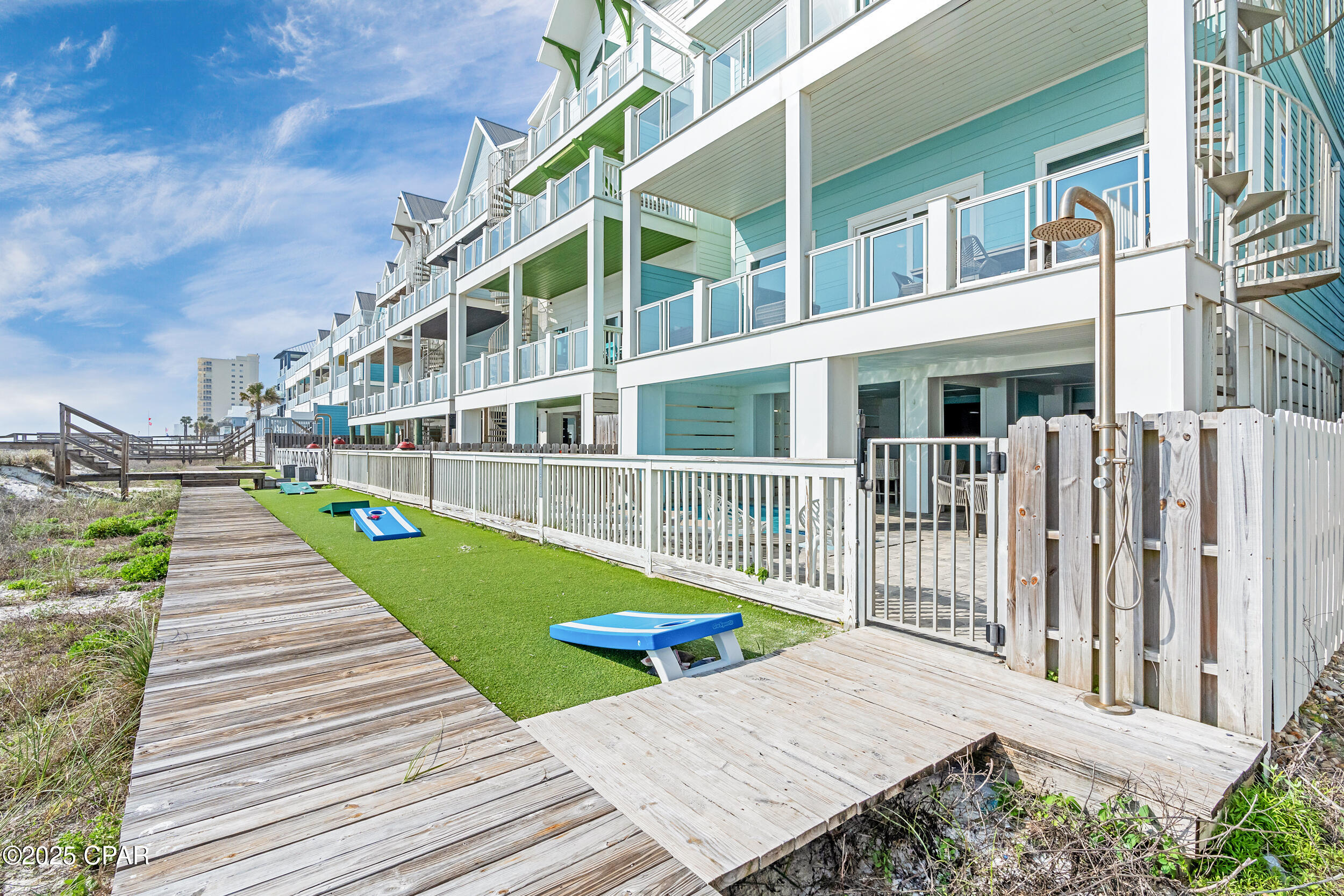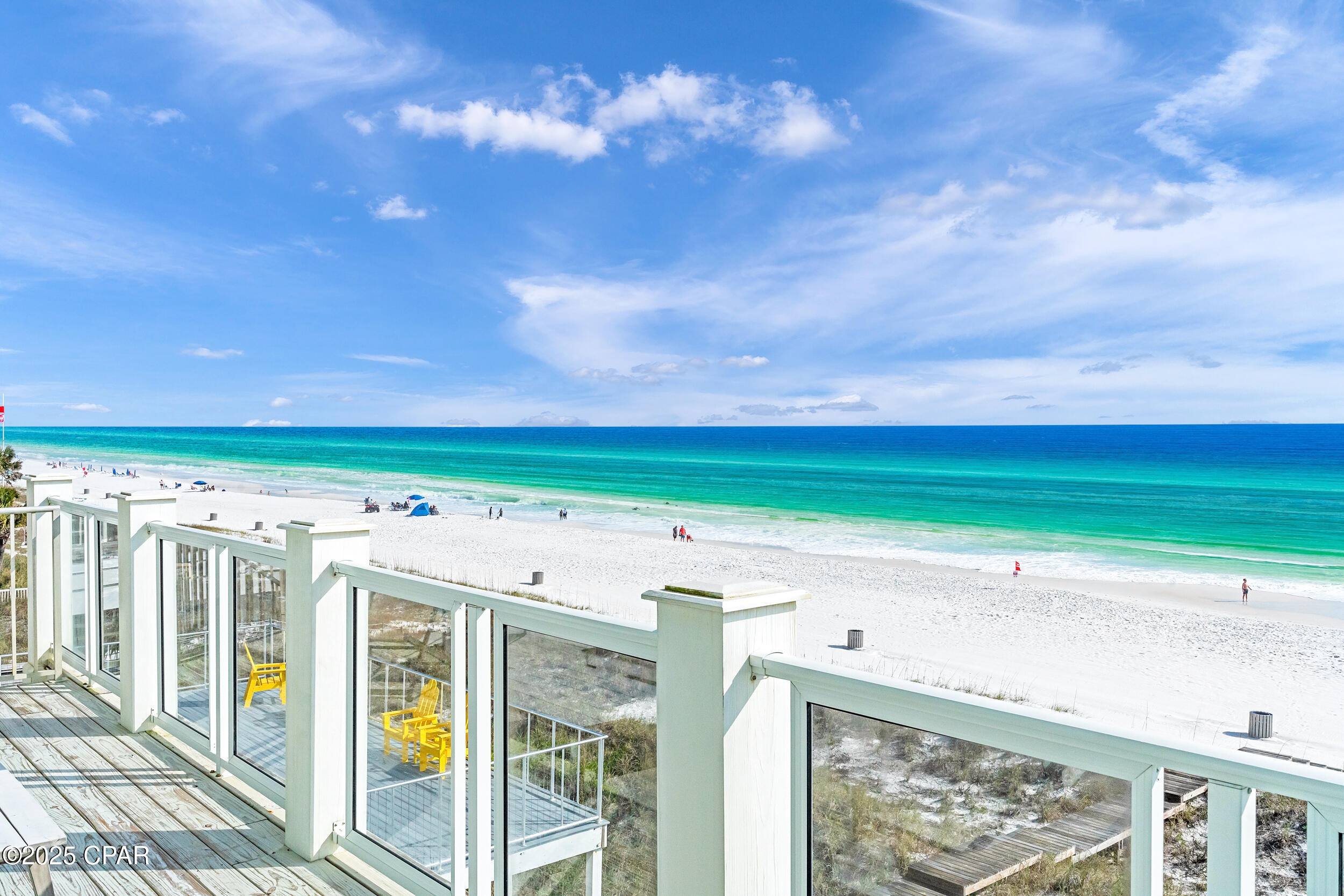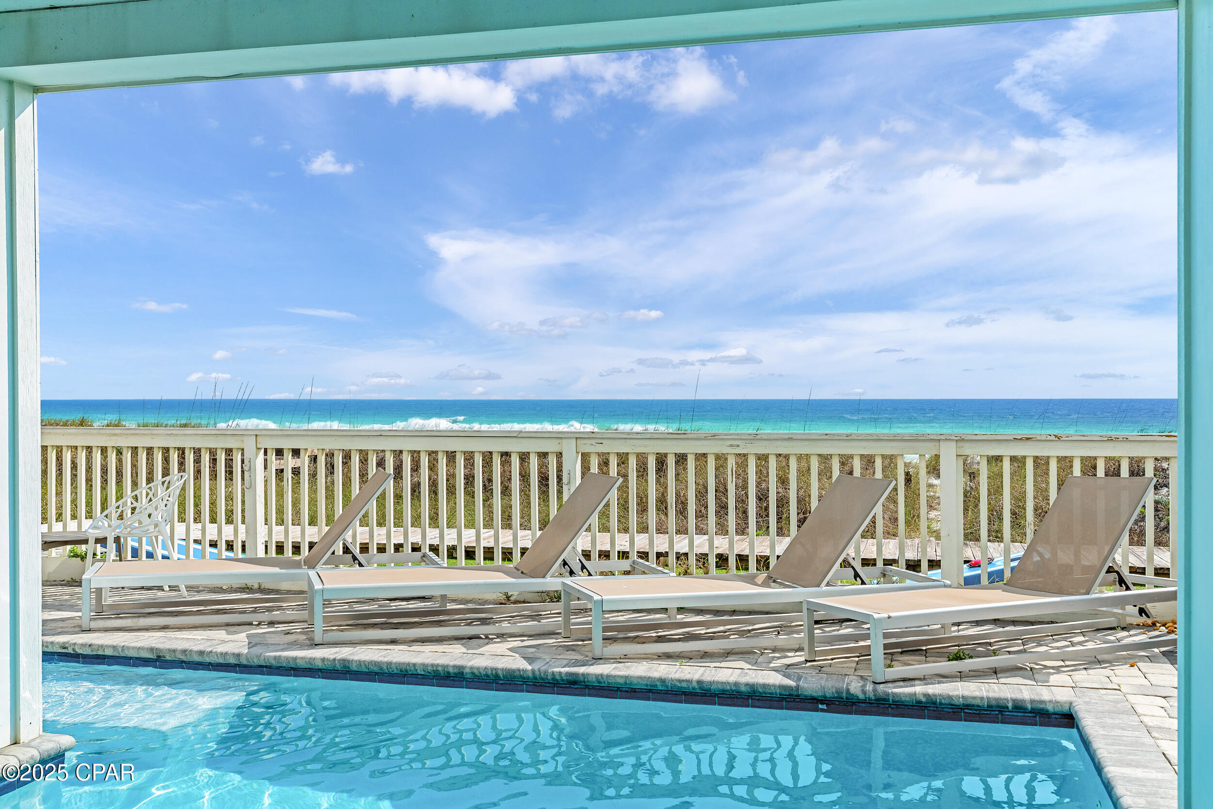 The main living area on the second floor showcases stunning Gulf views and includes a gourmet kitchen with brand-new appliances, quartz countertops, custom cabinetry, and generous space for cooking, dining, and entertaining. A first-floor media room and third-floor game room offer flexible spaces for fun and relaxation, while the fourth floor is home to a private primary suite featuring a serene sitting area, spa-like bathroom, and a private balcony overlooking the beach. Step outside to your own backyard oasis complete with a heated L-shaped pool, a lounge deck with a flat screen TV, grilling area, outdoor shower, and a private boardwalk leading directly to the sand and surf.