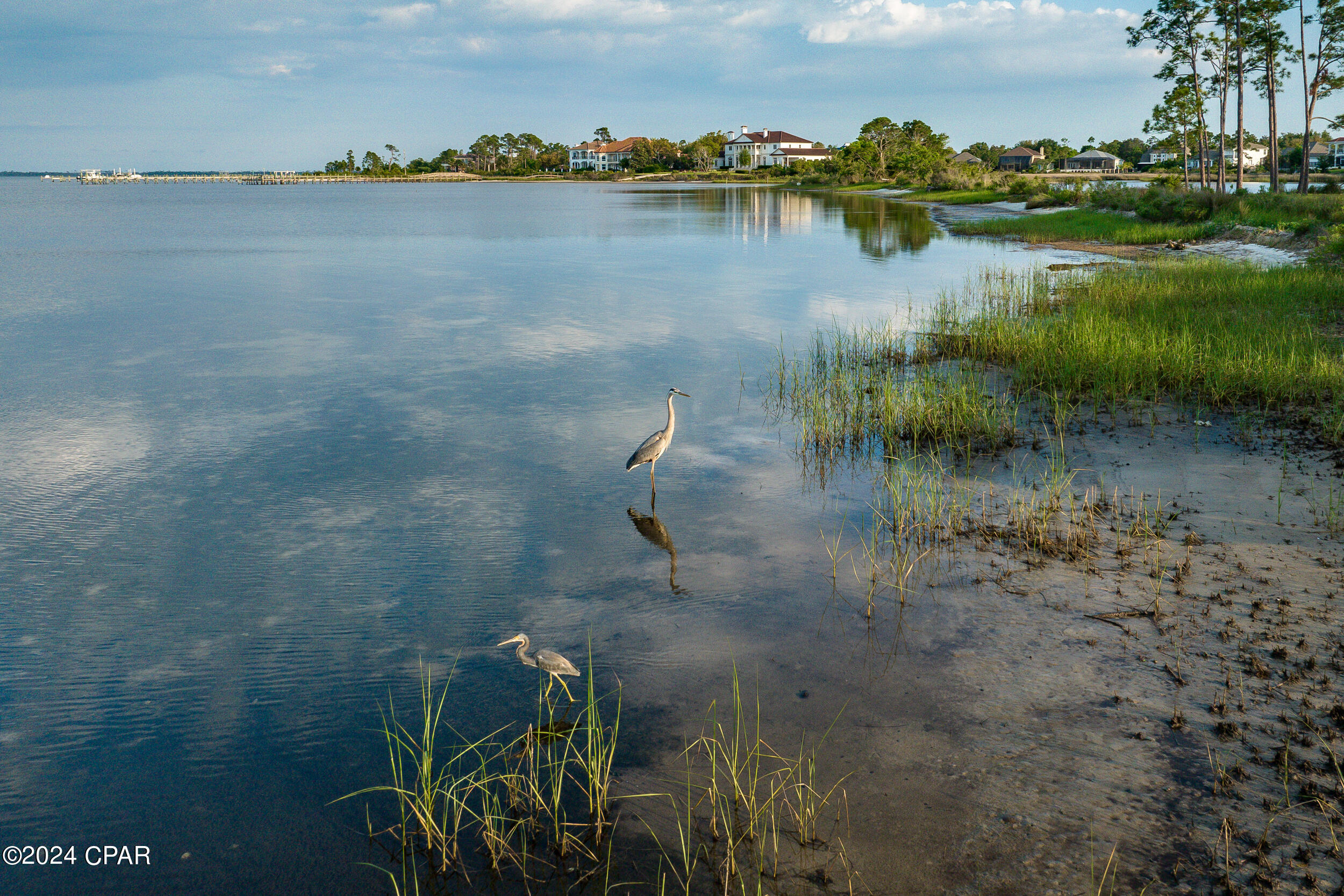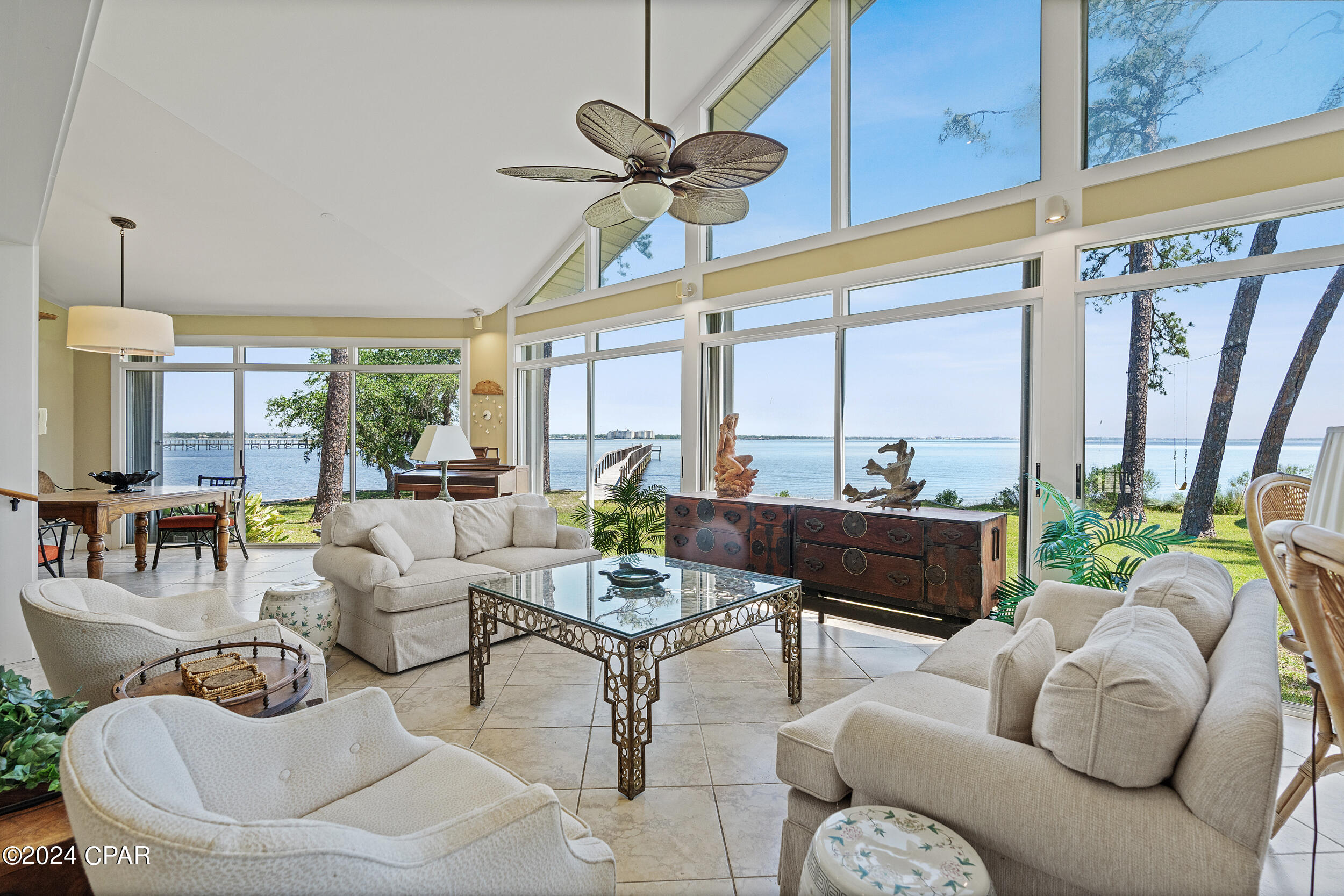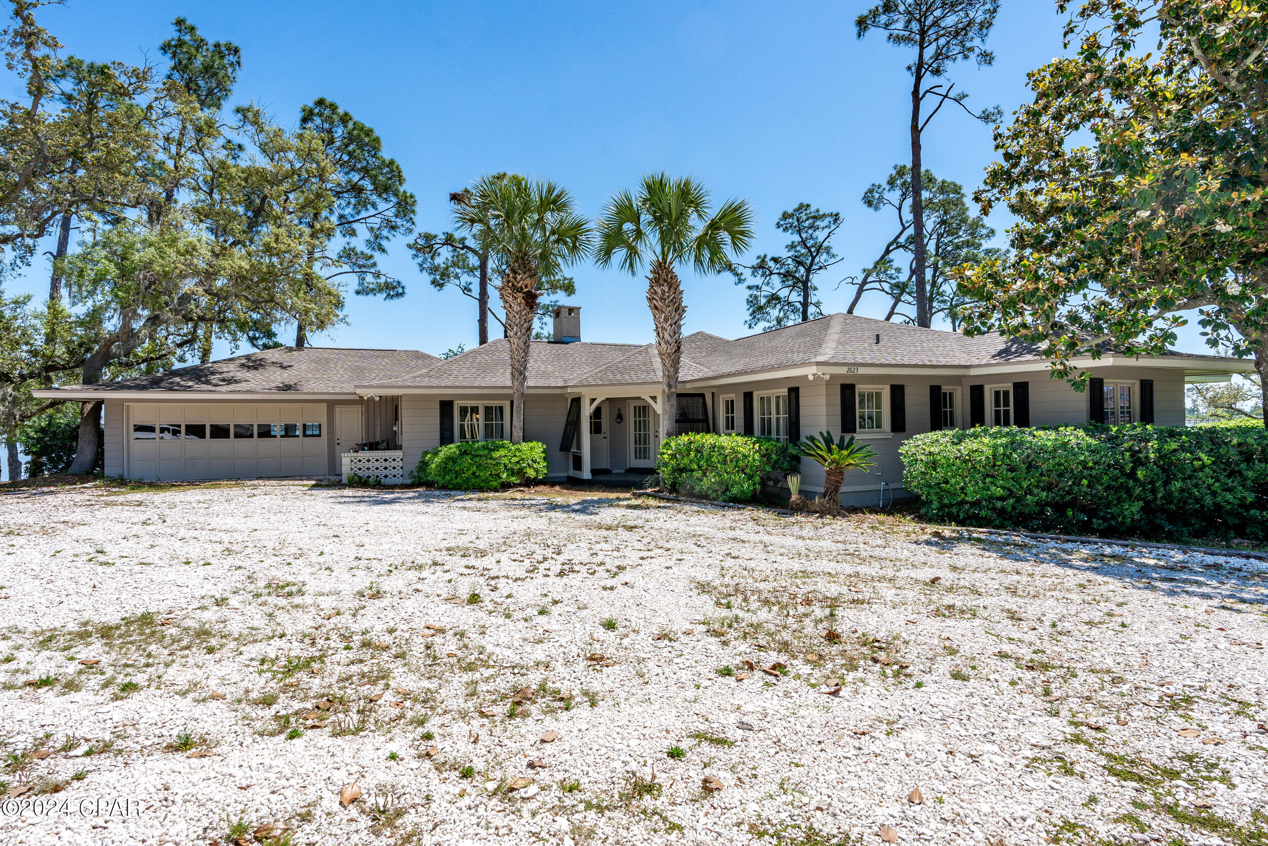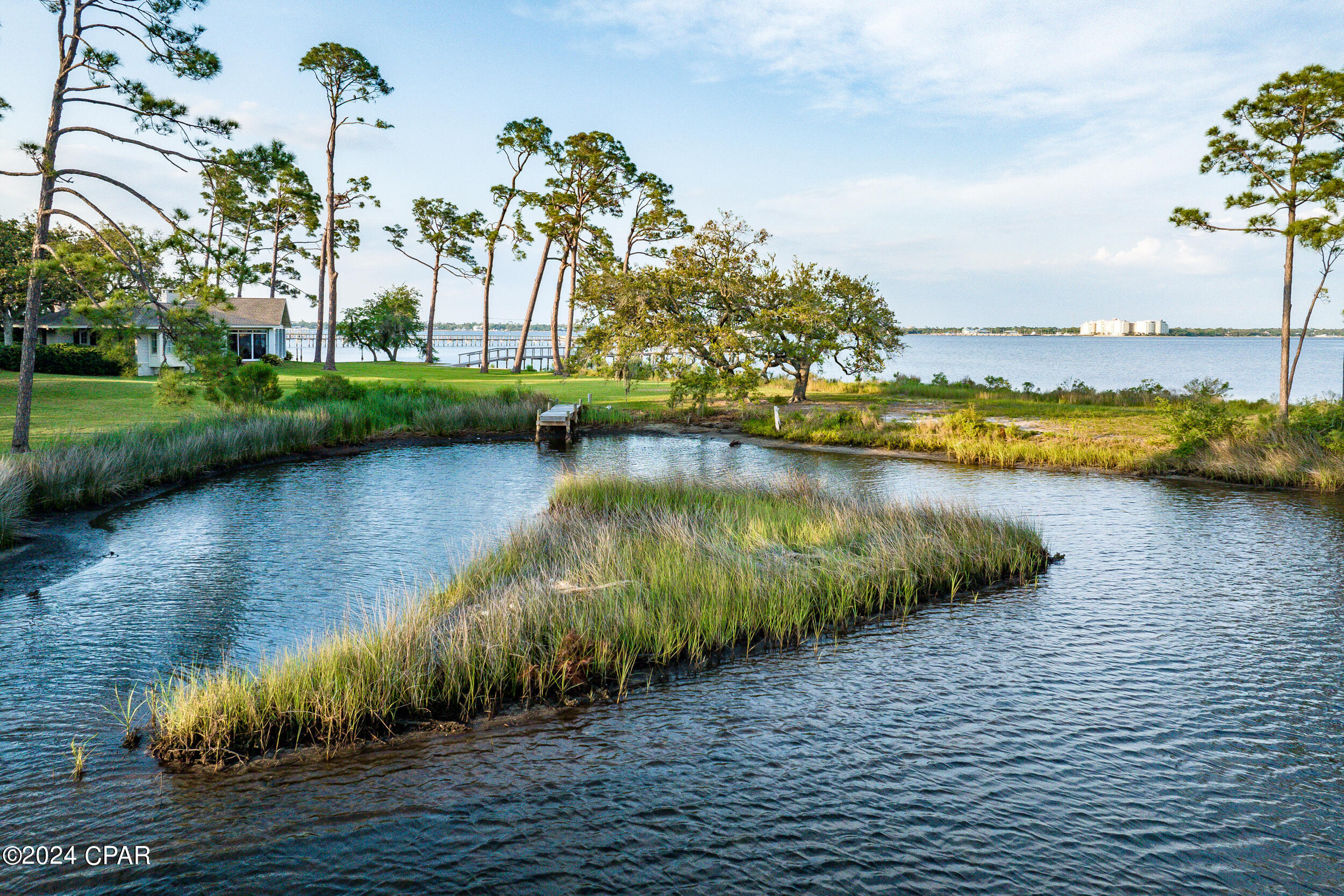 ------------ Nestled amid lush pines, oaks and magnolias, ''Fiddler's Green'' is a serene haven set on 2.98+ acres of coastal paradise. With an incredible 800 feet of water frontage, this idyllic retreat offers unparalleled views and direct access to enjoying fishing and boating in St. Andrews Bay, the Gulf beyond, or in the bayou out back. In 2005, the home was remodeled to enhance and modernize it for gracious living and easy entertaining, and now features a two-level, fan-shaped living room that elegantly divides the house into two distinct wings. Each of the three bedrooms, with private bath, is tucked within its respective wing to provide personal sanctuaries. The heart of the home lies within the spacious great room, seamlessly blending living, dining, and kitchen areas, anchored by the huge fireplace on one side and the copper-topped bar on the other. The standout feature is the expansive window wall, offering 180-degree panoramic views of the ever-changing sky, water, and shores from the comfort of home. Parades of fascinating watercraft enliven the water scene, while birds, deer and dolphins make regular appearances. With no HOA to restrict your lifestyle, a separate guest house, and a truly unique parcel of land, this extraordinary property stands as a rare find in the market. Aptly named for the perpetual joy it evokes, Fiddler's Green offers both seclusion and convenience. While providing privacy and peace, it is also just minutes away from St Andrews State Park, Bay Point amenities, and a plethora of the area's best restaurants. Schedule a viewing today to experience the romance and the magic of ''Fiddler's Green'' firsthand.