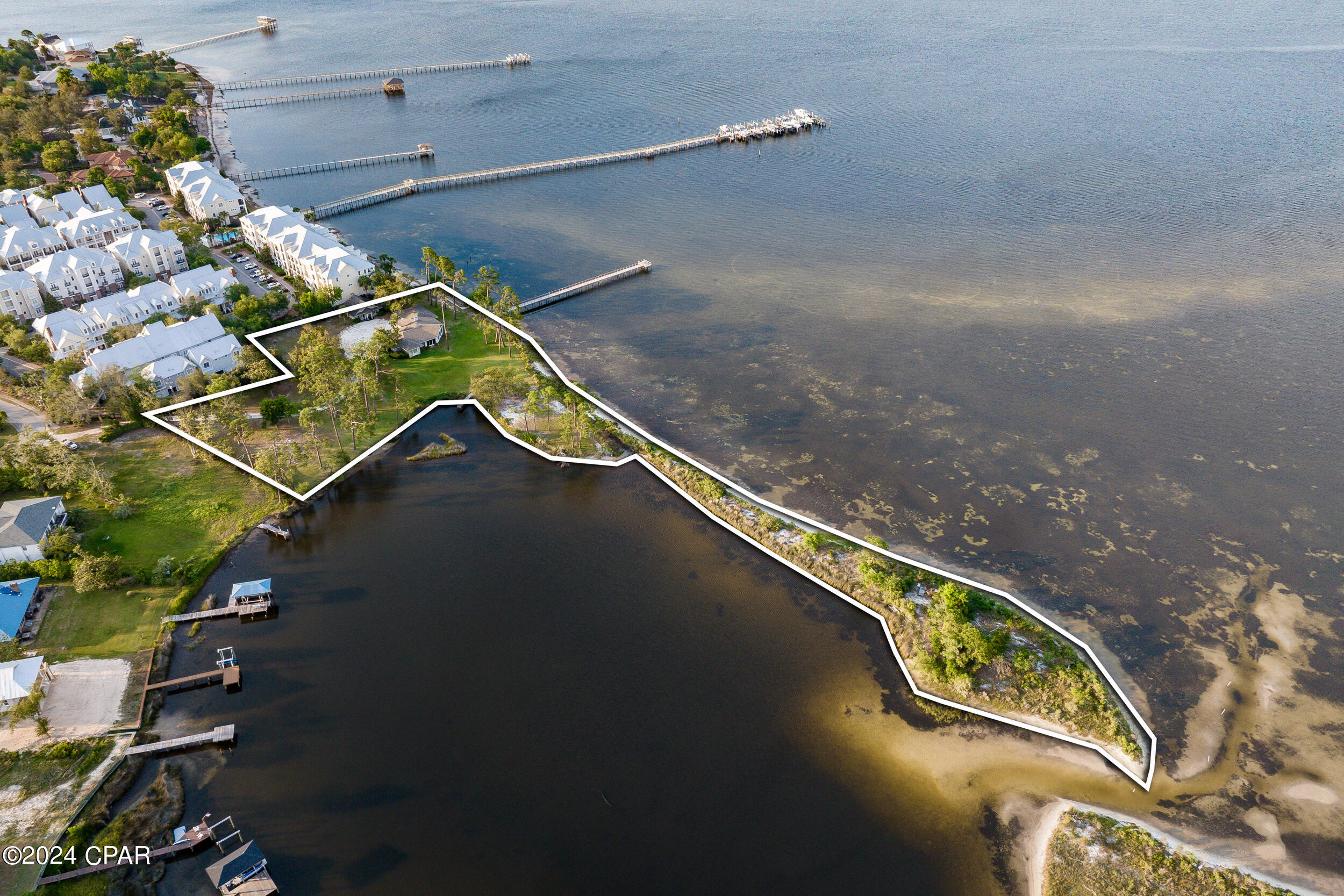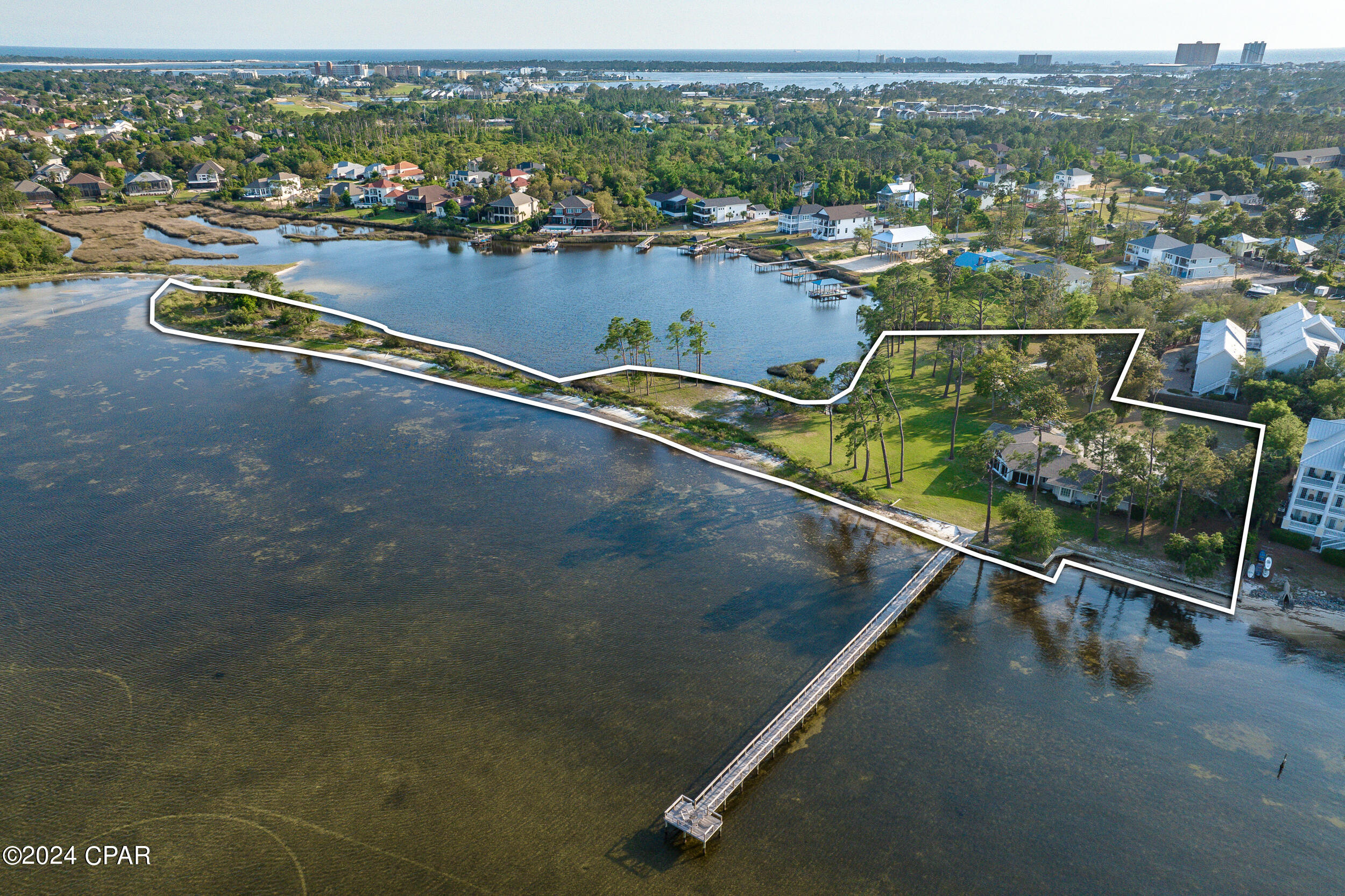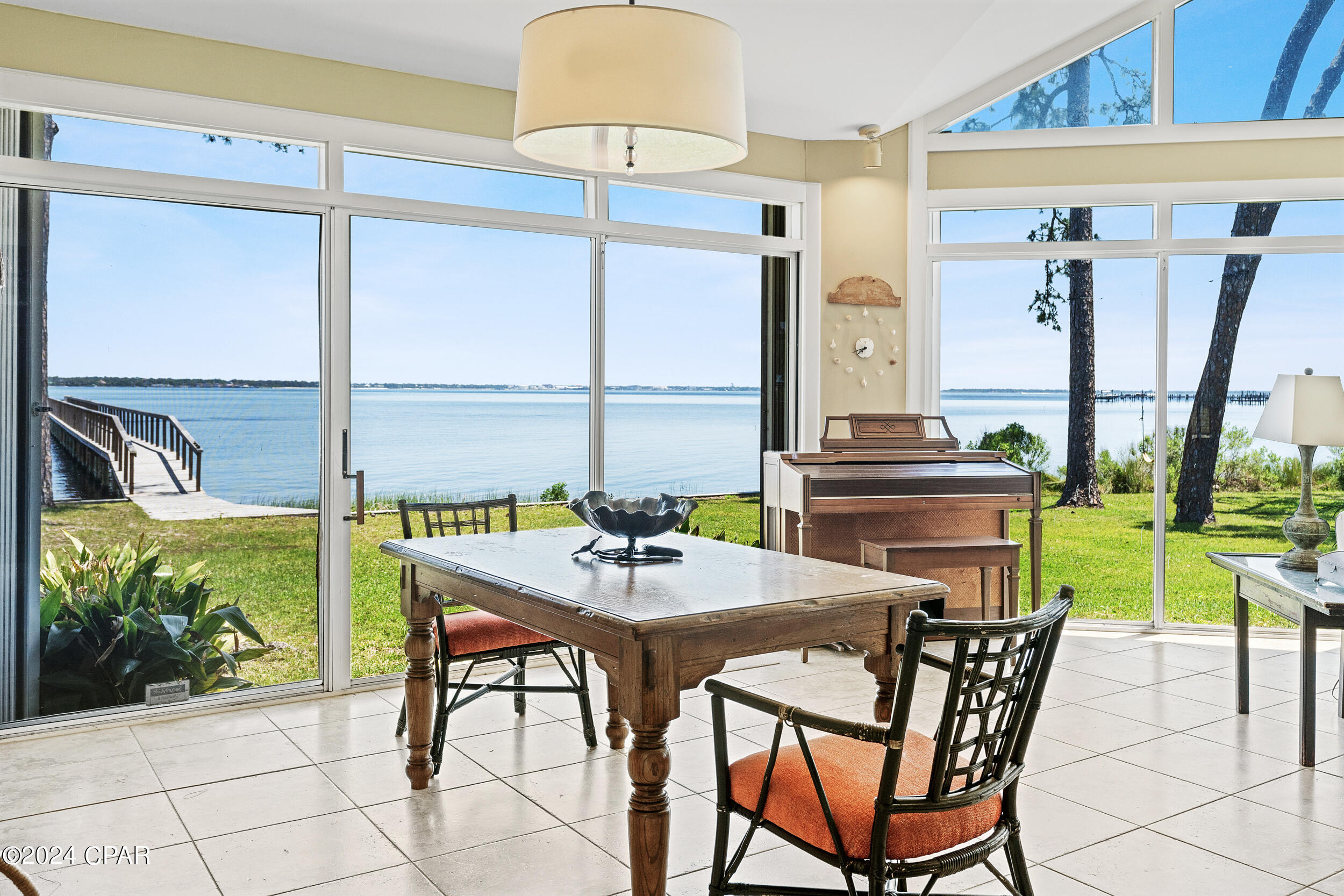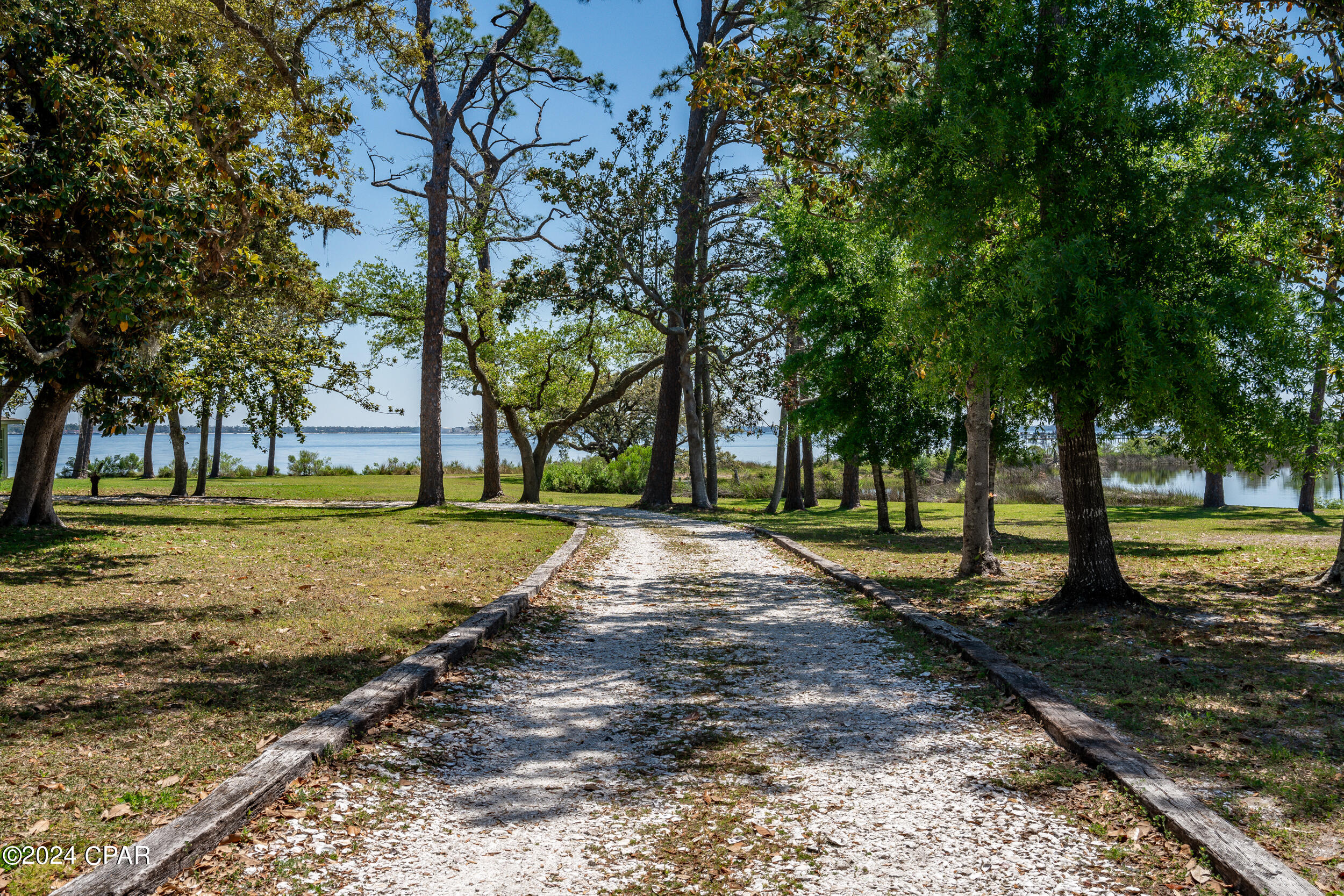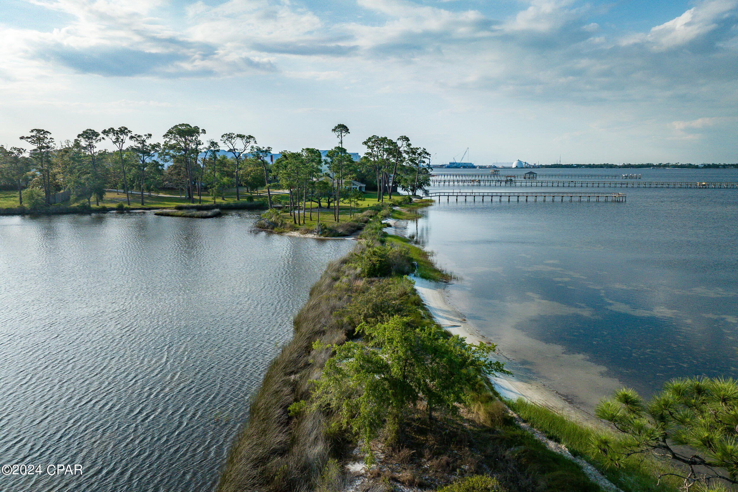 ------------ Nestled amid lush pines, oaks and magnolias, ''Fiddler's Green'' is a serene haven set on 2.98+ acres of coastal paradise. With an incredible 800 feet of water frontage, this idyllic retreat offers unparalleled views and direct access to enjoying fishing and boating in St. Andrews Bay, the Gulf beyond, or in the bayou out back. In 2005, the home was remodeled to enhance and modernize it for gracious living and easy entertaining, and now features a two-level, fan-shaped living room that elegantly divides the house into two distinct wings. Each of the three bedrooms, with private bath, is tucked within its respective wing to provide personal sanctuaries. The heart of the home lies within the spacious great room, seamlessly blending living, dining, and kitchen areas, anchored by the huge fireplace on one side and the copper-topped bar on the other. The standout feature is the expansive window wall, offering 180-degree panoramic views of the ever-changing sky, water, and shores from the comfort of home. Parades of fascinating watercraft enliven the water scene, while birds, deer and dolphins make regular appearances. With no HOA to restrict your lifestyle, a separate guest house, and a truly unique parcel of land, this extraordinary property stands as a rare find in the market. Aptly named for the perpetual joy it evokes, Fiddler's Green offers both seclusion and convenience. While providing privacy and peace, it is also just minutes away from St Andrews State Park, Bay Point amenities, and a plethora of the area's best restaurants. Schedule a viewing today to experience the romance and the magic of ''Fiddler's Green'' firsthand.
