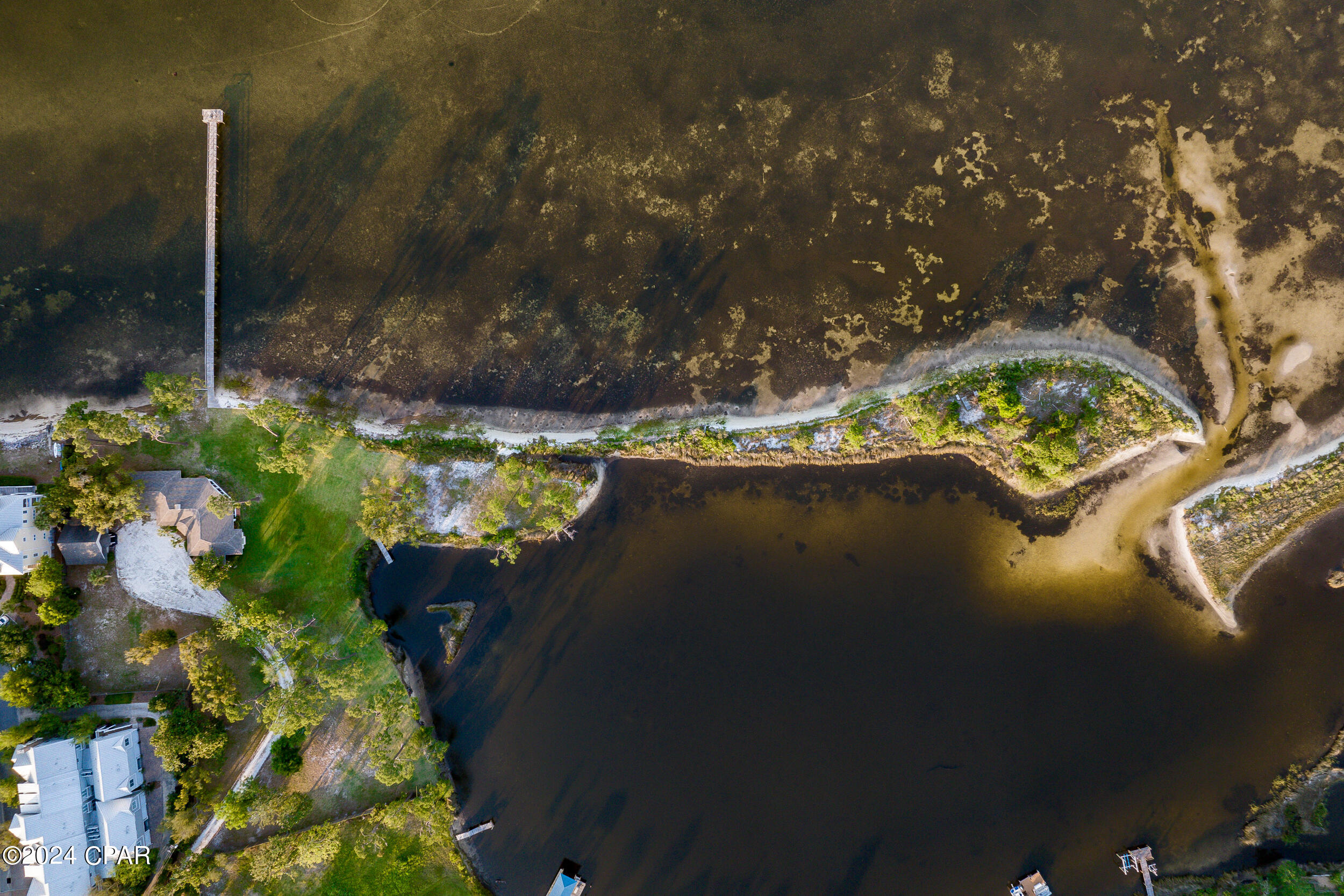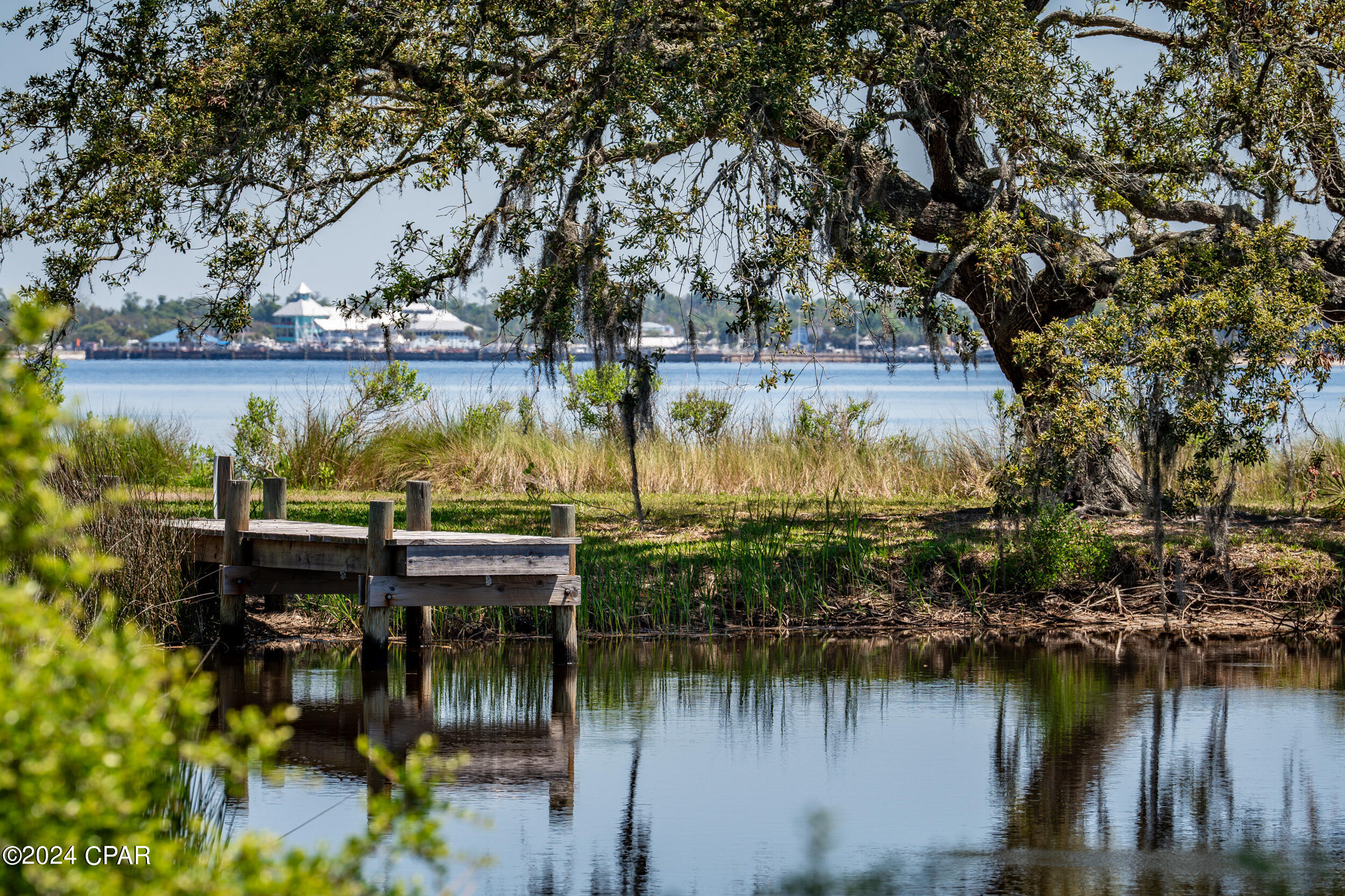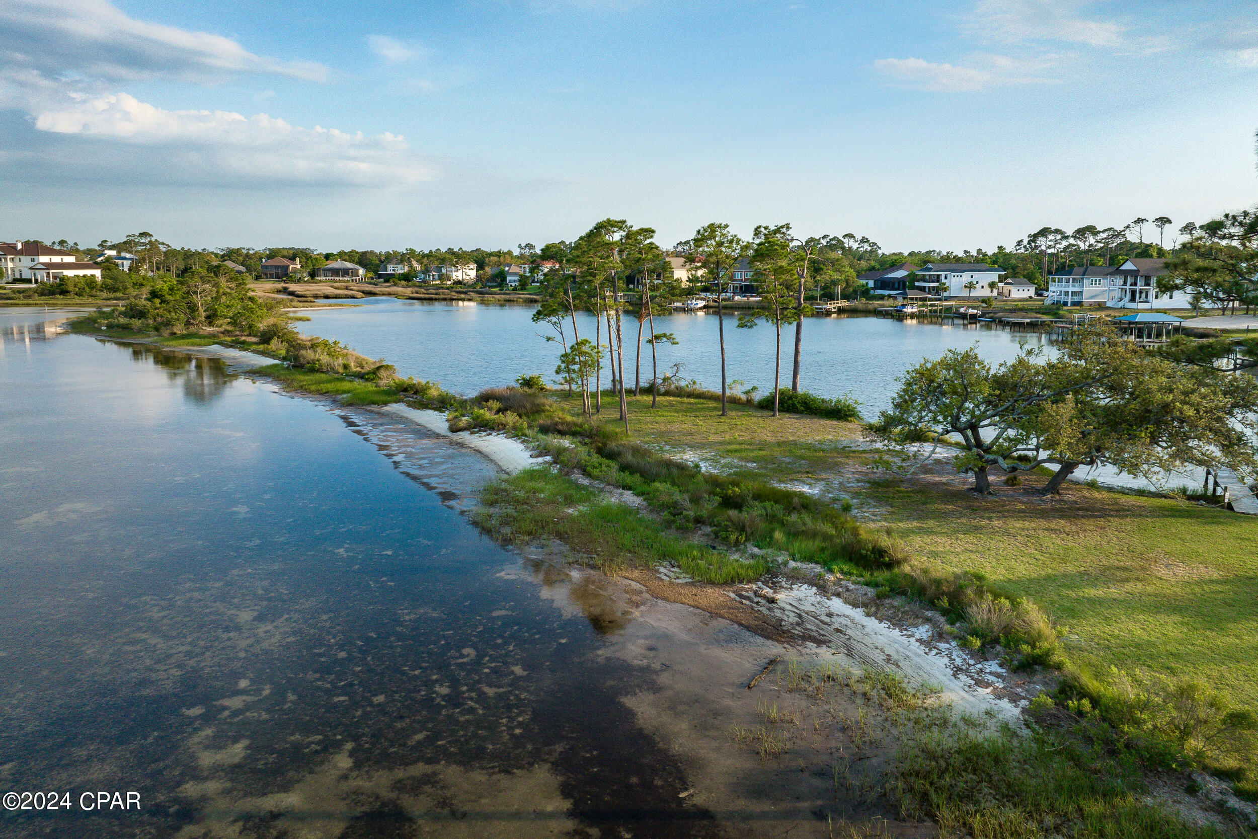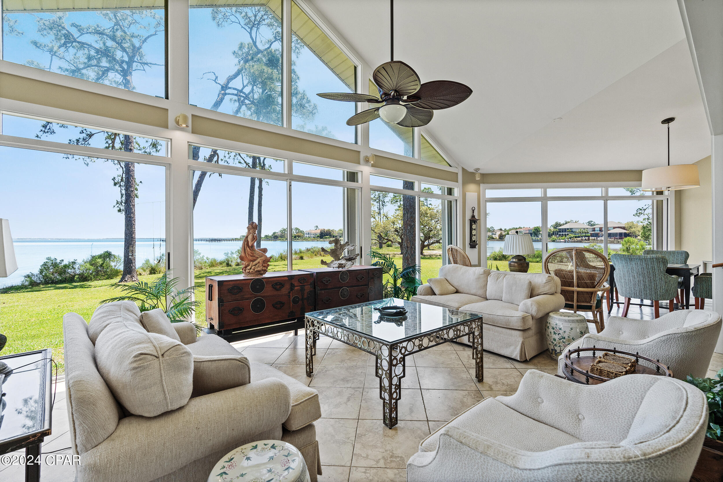 ------------ Nestled amid lush pines, oaks and magnolias, ''Fiddler's Green'' is a serene haven set on 2.98+ acres of coastal paradise. With an incredible 800 feet of water frontage, this idyllic retreat offers unparalleled views and direct access to enjoying fishing and boating in St. Andrews Bay, the Gulf beyond, or in the bayou out back. In 2005, the home was remodeled to enhance and modernize it for gracious living and easy entertaining, and now features a two-level, fan-shaped living room that elegantly divides the house into two distinct wings. Each of the three bedrooms, with private bath, is tucked within its respective wing to provide personal sanctuaries. The heart of the home lies within the spacious great room, seamlessly blending living, dining, and kitchen areas, anchored by the huge fireplace on one side and the copper-topped bar on the other. The standout feature is the expansive window wall, offering 180-degree panoramic views of the ever-changing sky, water, and shores from the comfort of home. Parades of fascinating watercraft enliven the water scene, while birds, deer and dolphins make regular appearances. With no HOA to restrict your lifestyle, a separate guest house, and a truly unique parcel of land, this extraordinary property stands as a rare find in the market. Aptly named for the perpetual joy it evokes, Fiddler's Green offers both seclusion and convenience. While providing privacy and peace, it is also just minutes away from St Andrews State Park, Bay Point amenities, and a plethora of the area's best restaurants. Schedule a viewing today to experience the romance and the magic of ''Fiddler's Green'' firsthand.