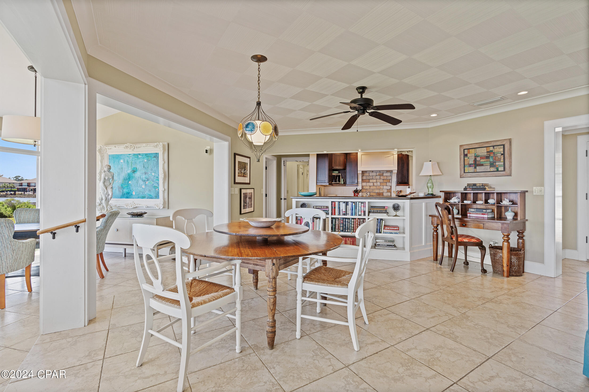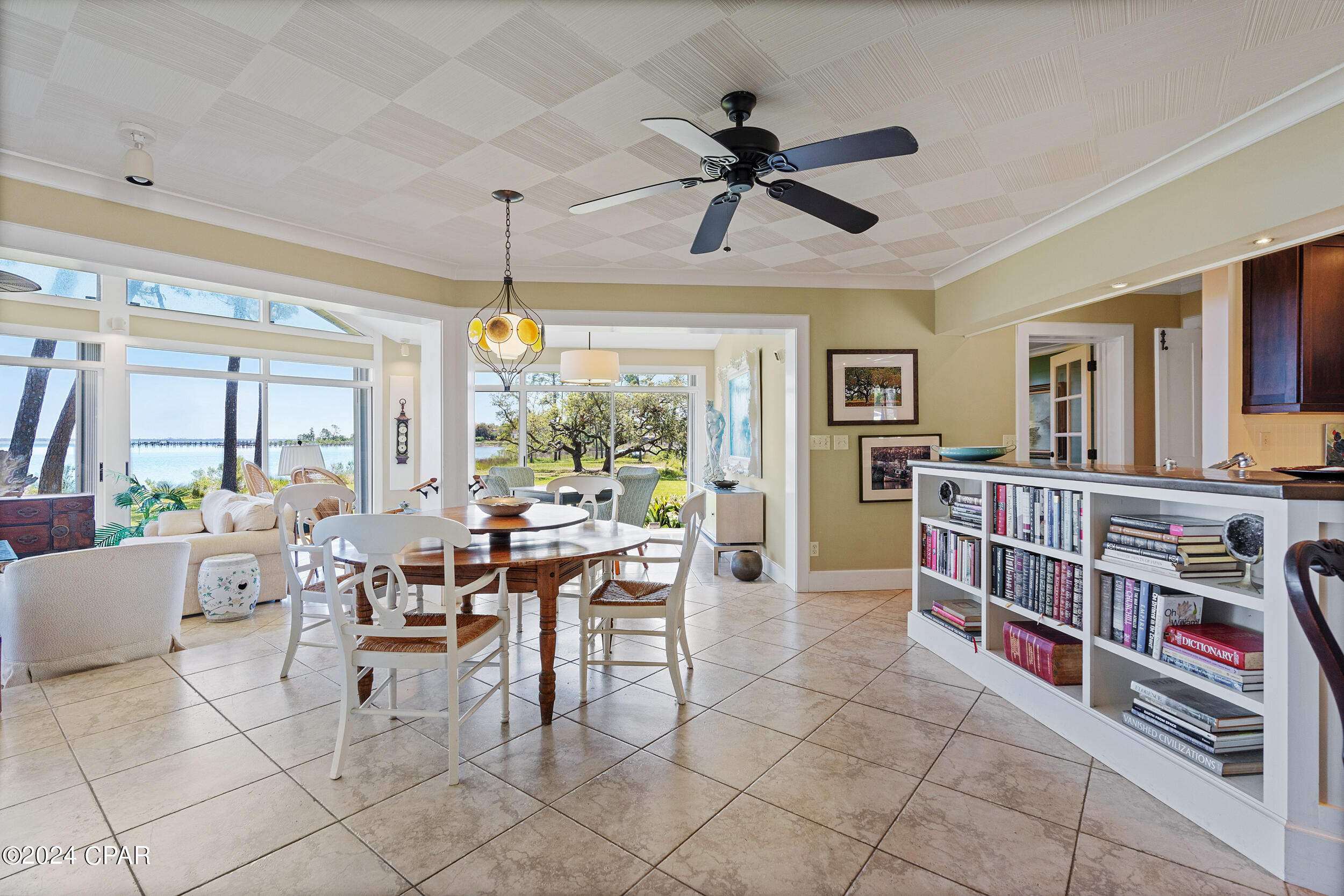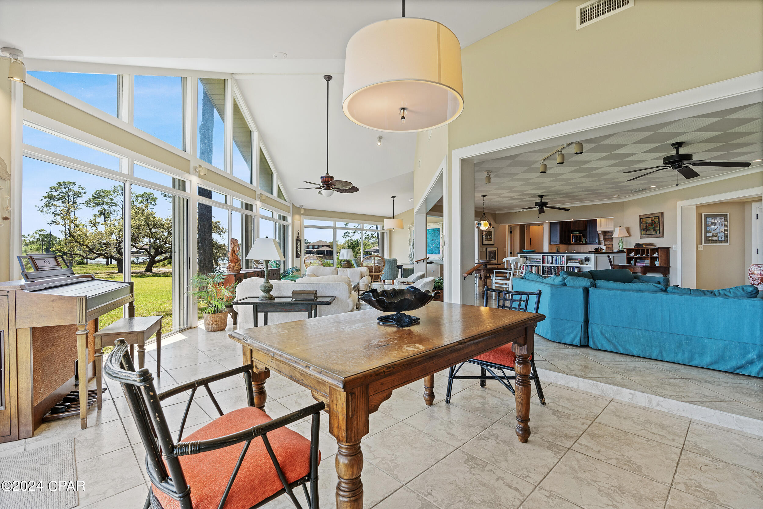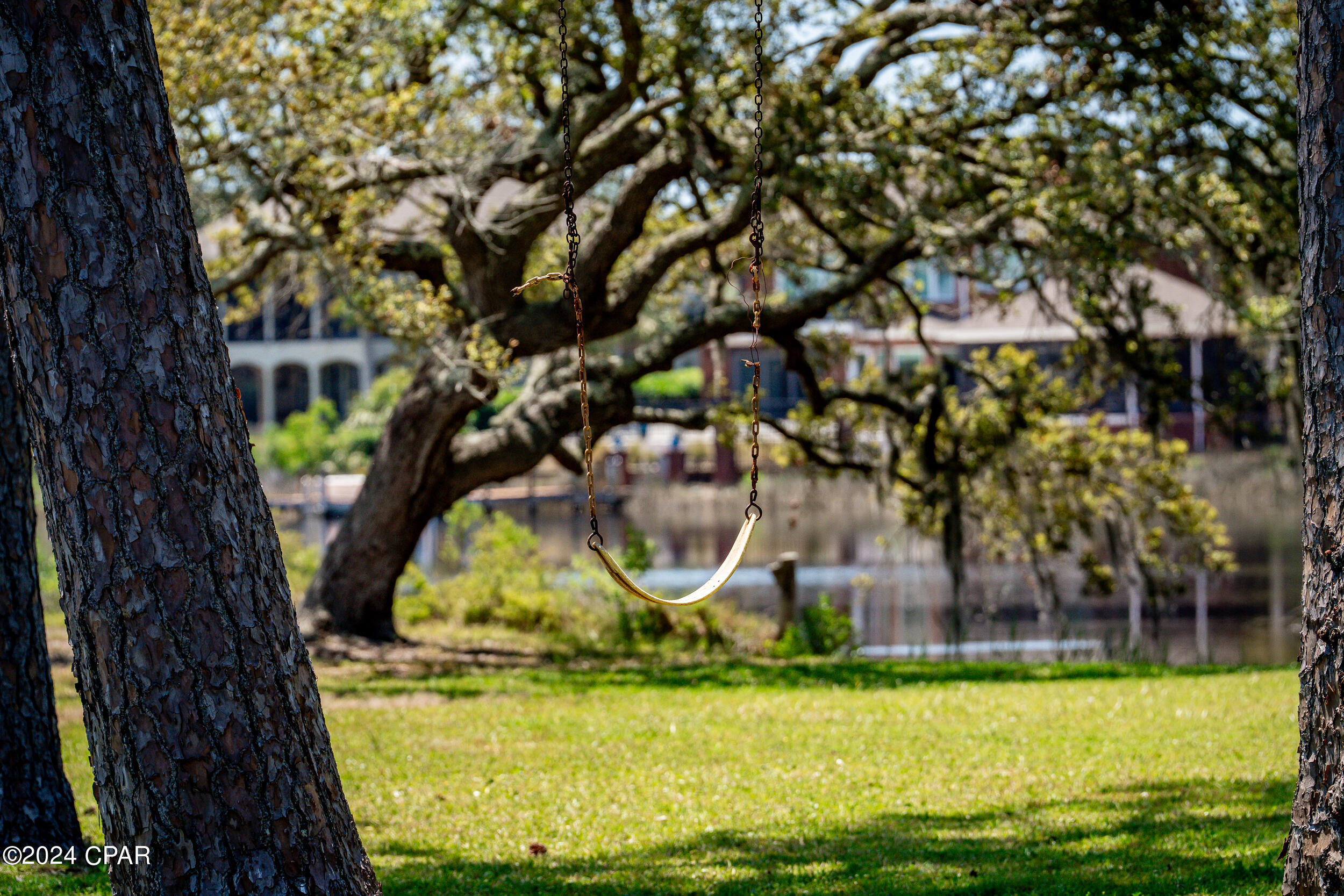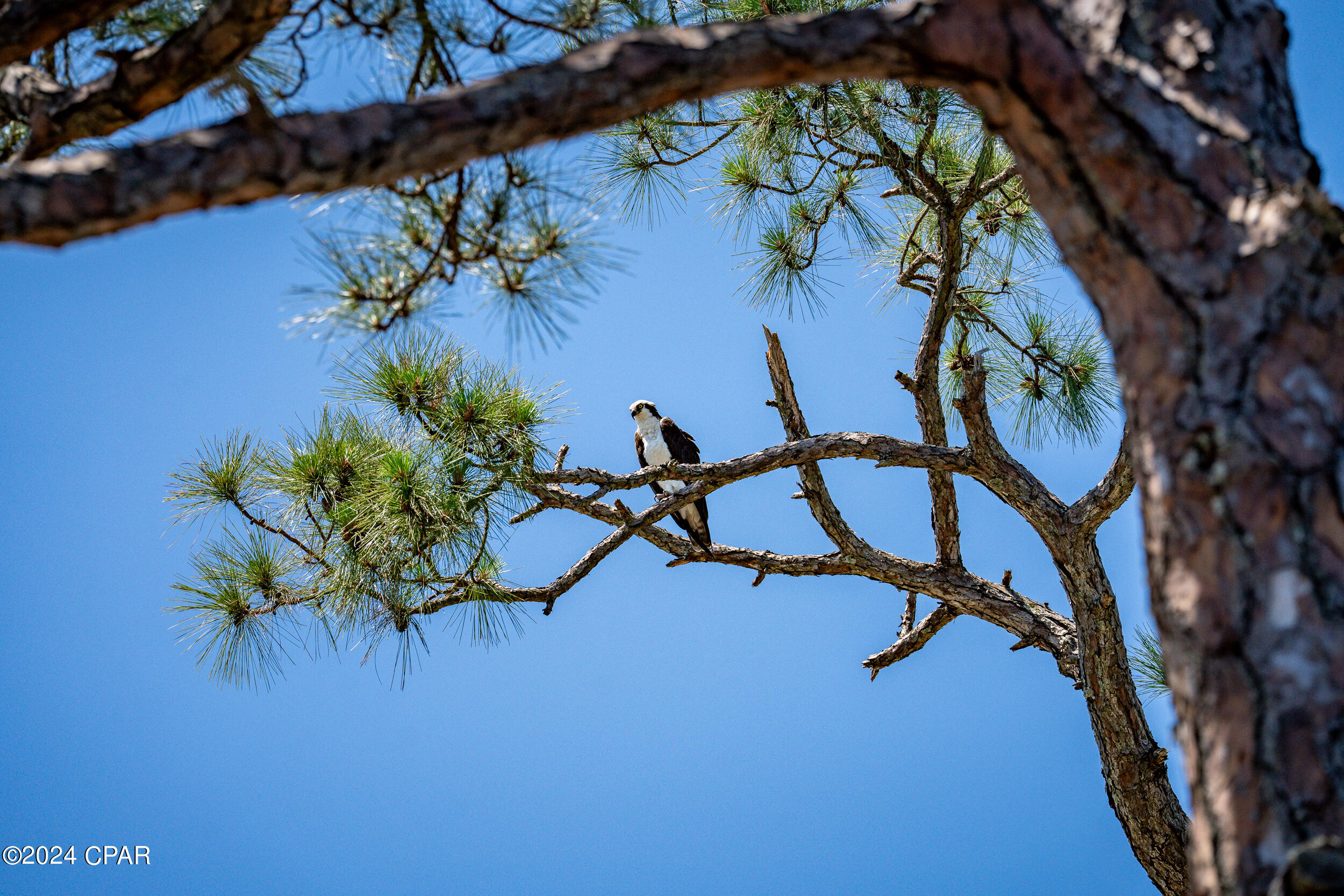 ------------ Nestled amid lush pines, oaks and magnolias, ''Fiddler's Green'' is a serene haven set on 2.98+ acres of coastal paradise. With an incredible 800 feet of water frontage, this idyllic retreat offers unparalleled views and direct access to enjoying fishing and boating in St. Andrews Bay, the Gulf beyond, or in the bayou out back. In 2005, the home was remodeled to enhance and modernize it for gracious living and easy entertaining, and now features a two-level, fan-shaped living room that elegantly divides the house into two distinct wings. Each of the three bedrooms, with private bath, is tucked within its respective wing to provide personal sanctuaries. The heart of the home lies within the spacious great room, seamlessly blending living, dining, and kitchen areas, anchored by the huge fireplace on one side and the copper-topped bar on the other. The standout feature is the expansive window wall, offering 180-degree panoramic views of the ever-changing sky, water, and shores from the comfort of home. Parades of fascinating watercraft enliven the water scene, while birds, deer and dolphins make regular appearances. With no HOA to restrict your lifestyle, a separate guest house, and a truly unique parcel of land, this extraordinary property stands as a rare find in the market. Aptly named for the perpetual joy it evokes, Fiddler's Green offers both seclusion and convenience. While providing privacy and peace, it is also just minutes away from St Andrews State Park, Bay Point amenities, and a plethora of the area's best restaurants. Schedule a viewing today to experience the romance and the magic of ''Fiddler's Green'' firsthand.