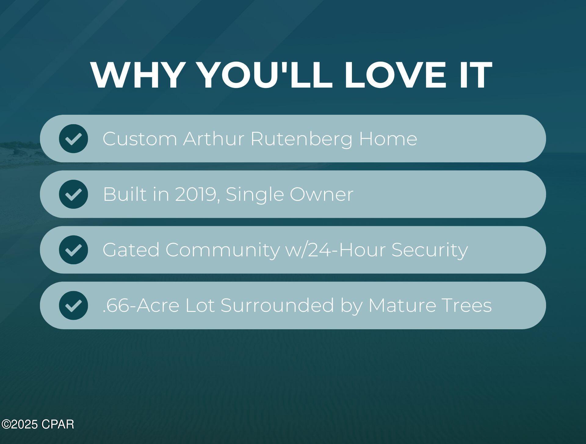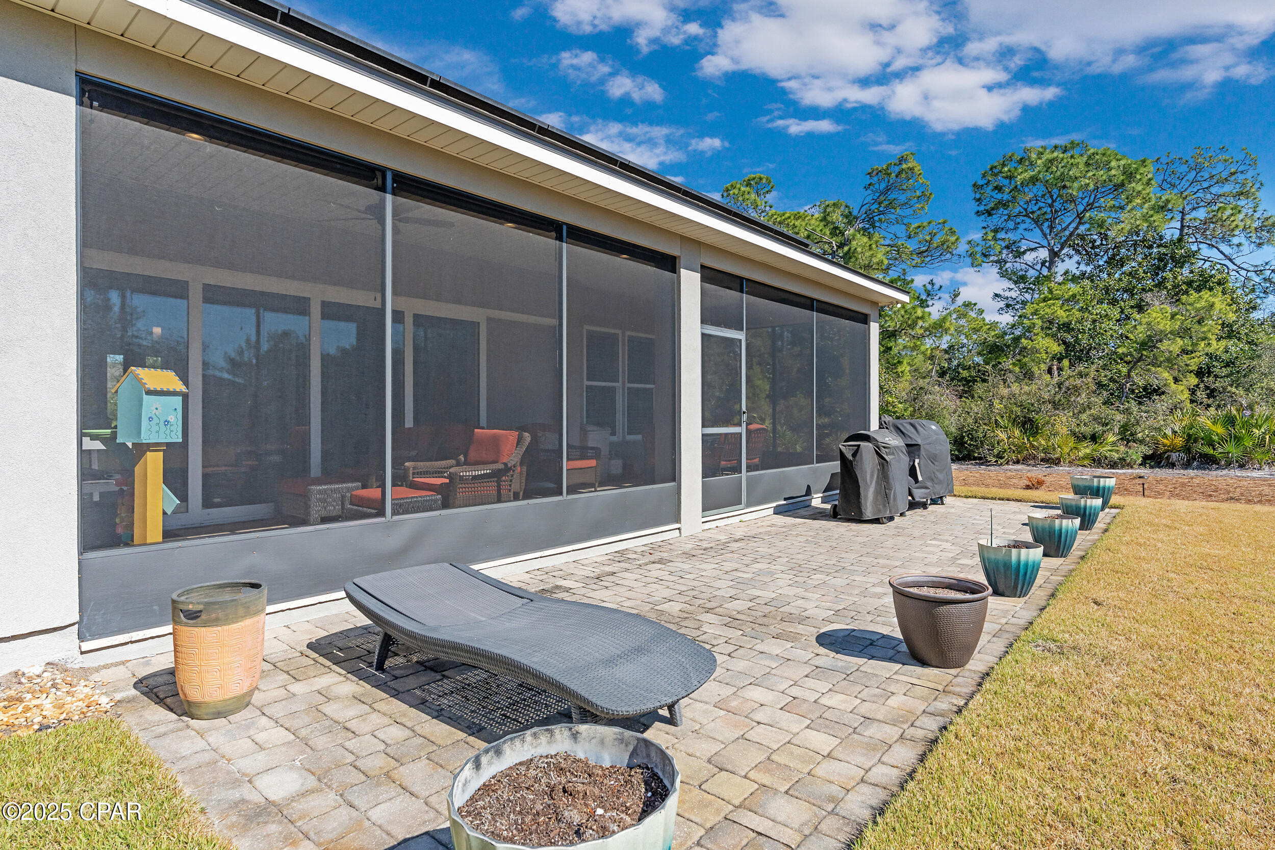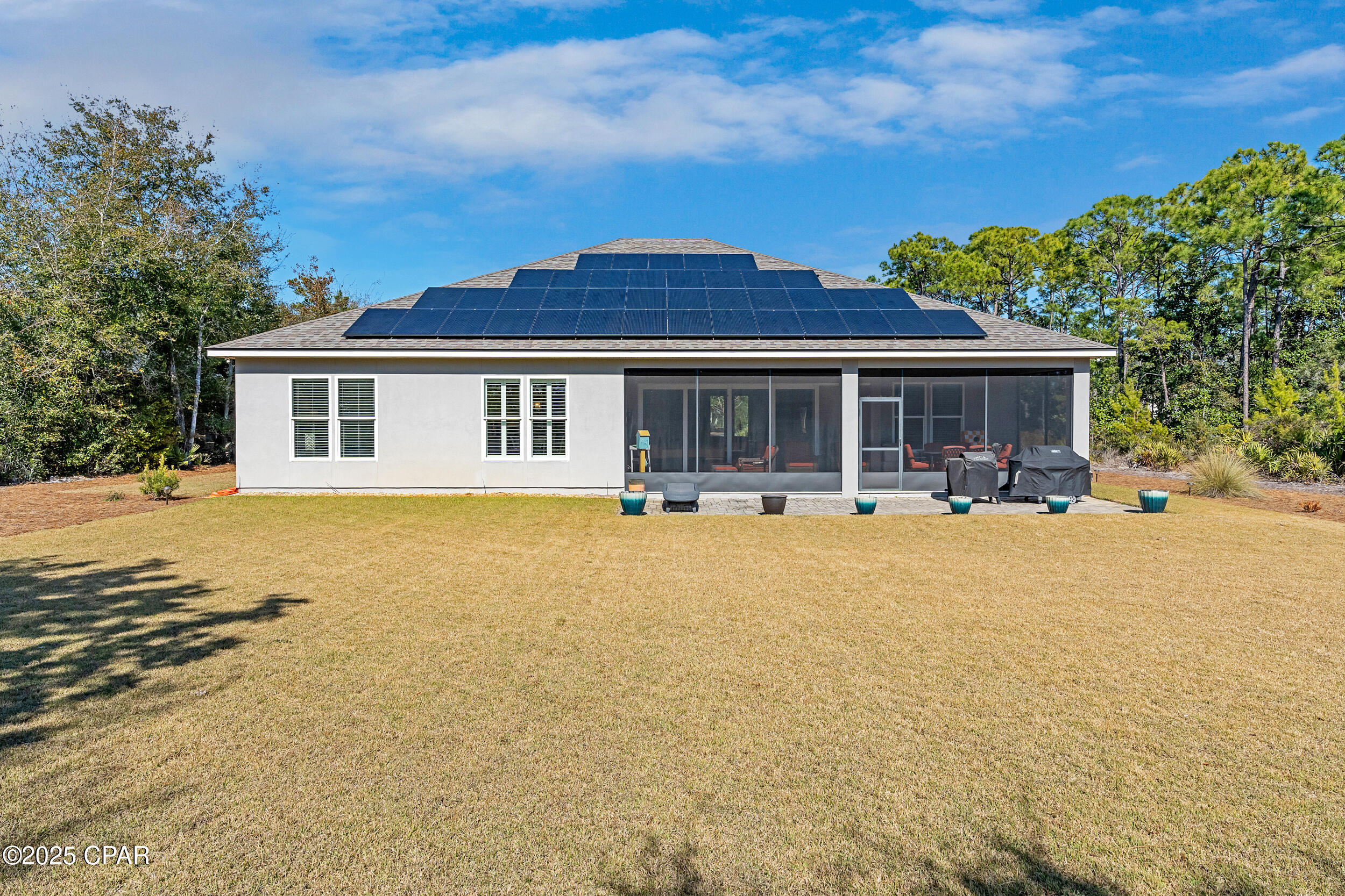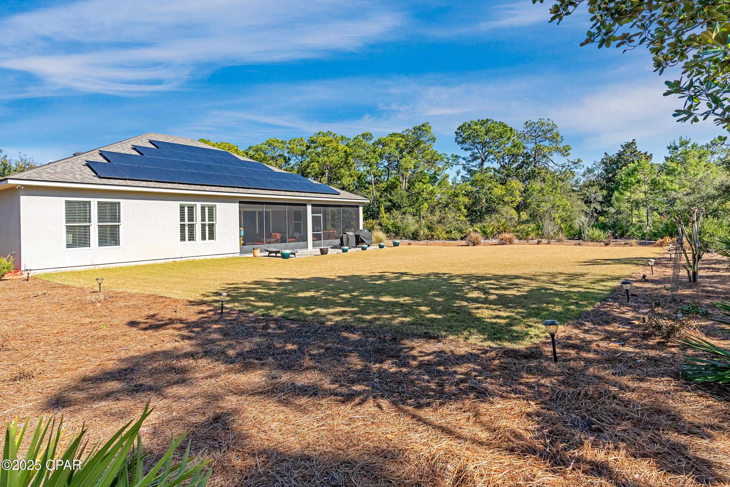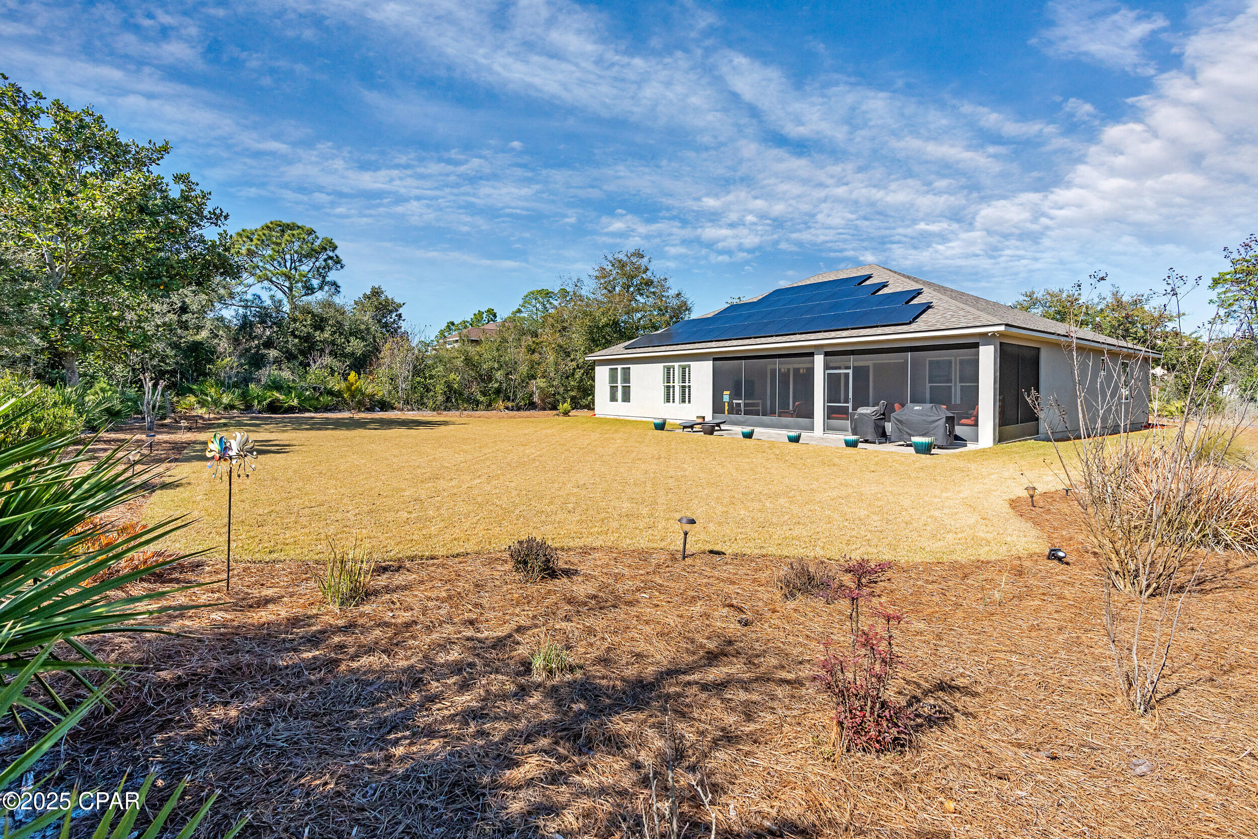 This property has sold! Discover similar listings by reaching out to us for an updated list of available properties that match your preferences. **FOUR LARGE BEDROOMS WITH BONUS/OFFICE SPACE** This custom Arthur Rutenberg home is located in the exclusive, gated community of The Preserve on The Bay, where 24-hour staffed security ensures privacy and peace of mind. Built in 2019 and impeccably maintained by its single, pet-free, non-smoking owner, this home feels practically brand new. The thoughtfully designed split floor plan offers both openness and privacy, with a spacious primary suite tucked away on one side, featuring a luxurious bathroom with a walk-in shower, dual vanities, and an enviable custom closet. The three additional large bedrooms are on the opposite side, with two sharing a bath and one enjoying its own private ensuite. A versatile bonus room provides the flexibility to create a home office, entertainment space, or playroom. The gourmet kitchen boasts a five-burner gas cooktop, quartz countertops, a large island, abundant cabinetry, and a vent hood. A separate laundry room with a sink and space for an extra fridge adds even more convenience. Natural light pours in through a stunning four-panel sliding glass door that opens to the screened-in travertine lanai, overlooking the expansive .66-acre backyard - lush, private, and surrounded by mature trees and protected green space. This home is as energy-efficient as it is beautiful, featuring paid-off solar panels that keep utility costs impressively low - the average electric bill is just $45 per month and, there is even a well for the irrigation system.Additional smart energy features include foamed insulation and a Rinnai tankless water heater. The three-car garage, complete with EV charging and overhead storage, rounds out this exceptional home. A rare opportunity to own in one of Panama City Beach's most sought-after communities - schedule your private tour today.