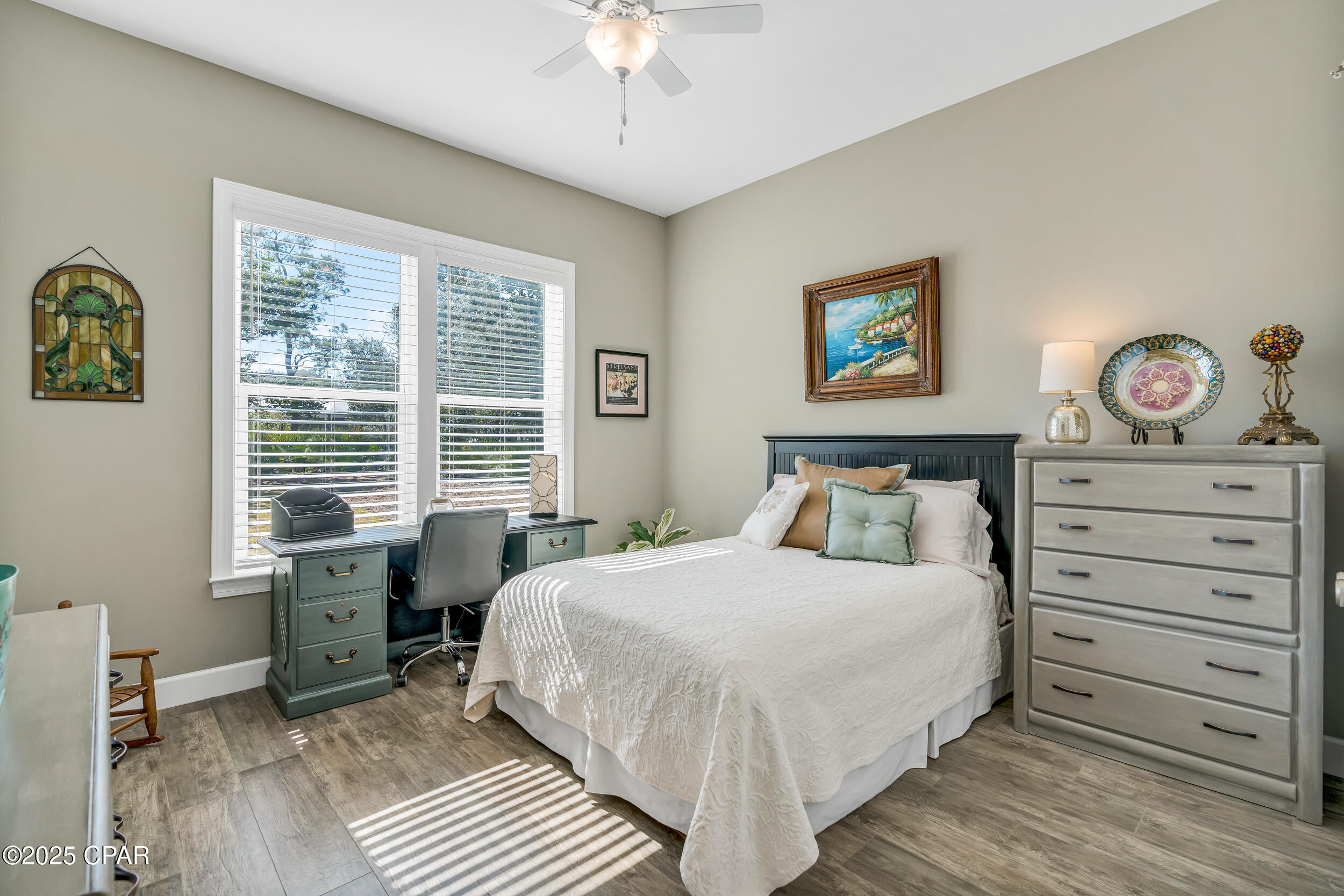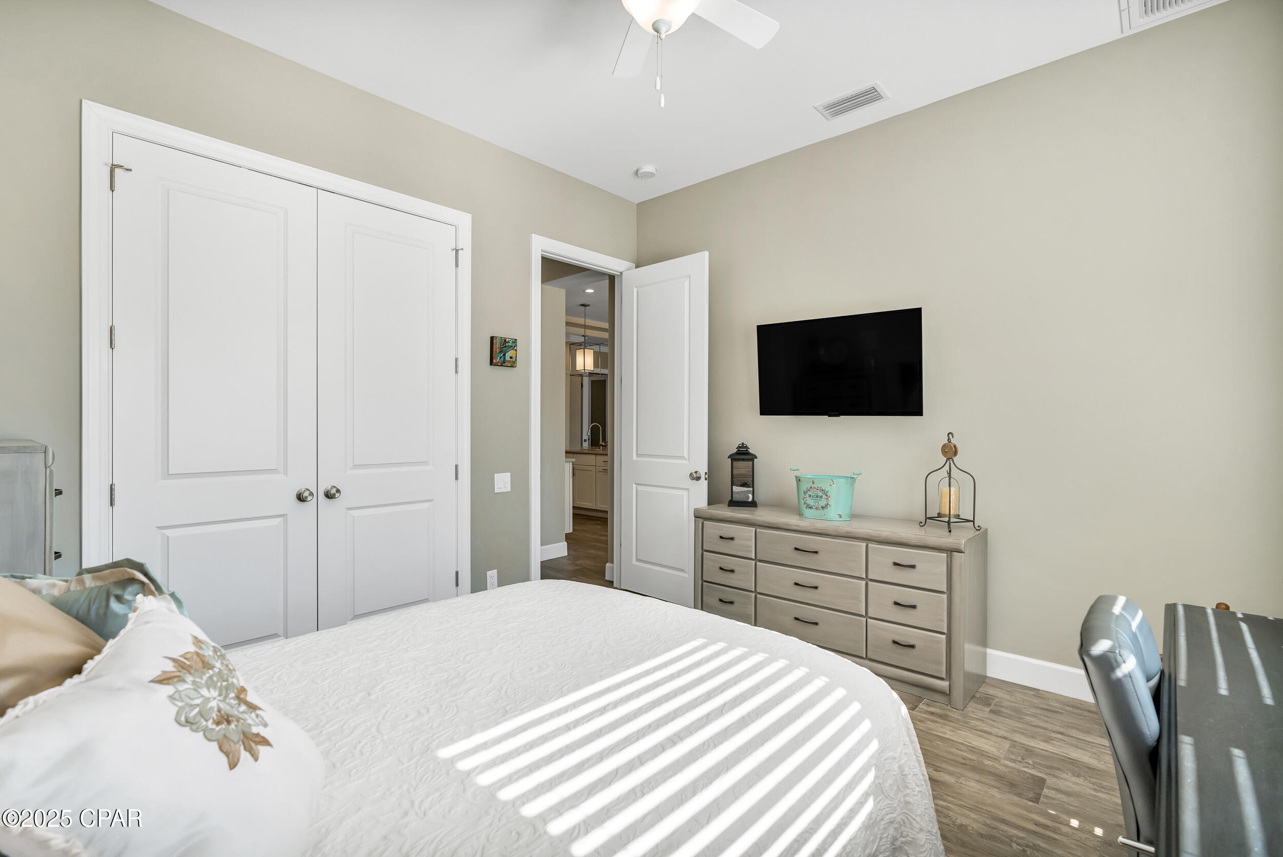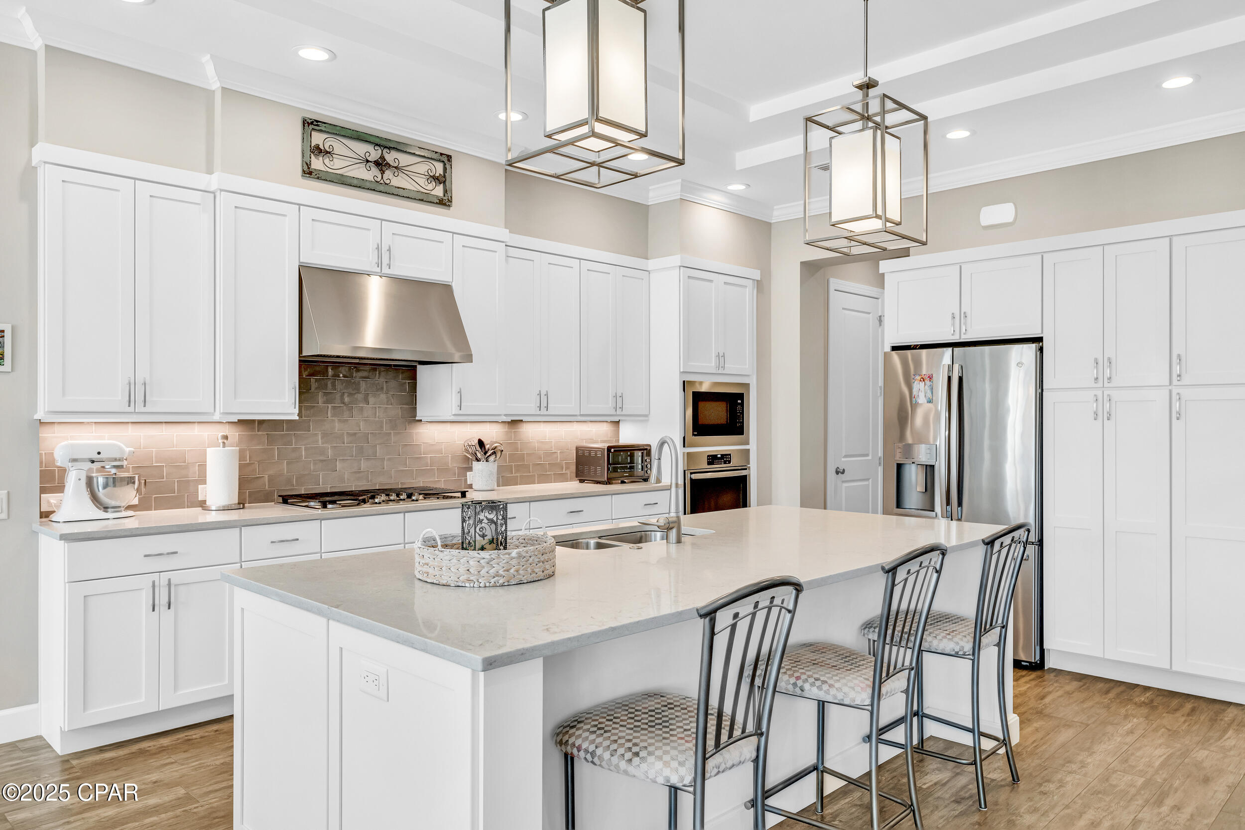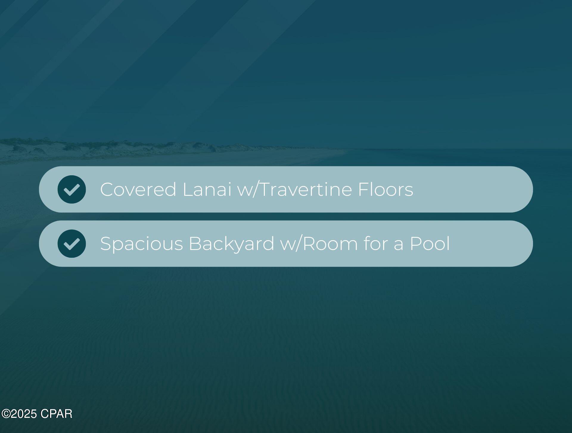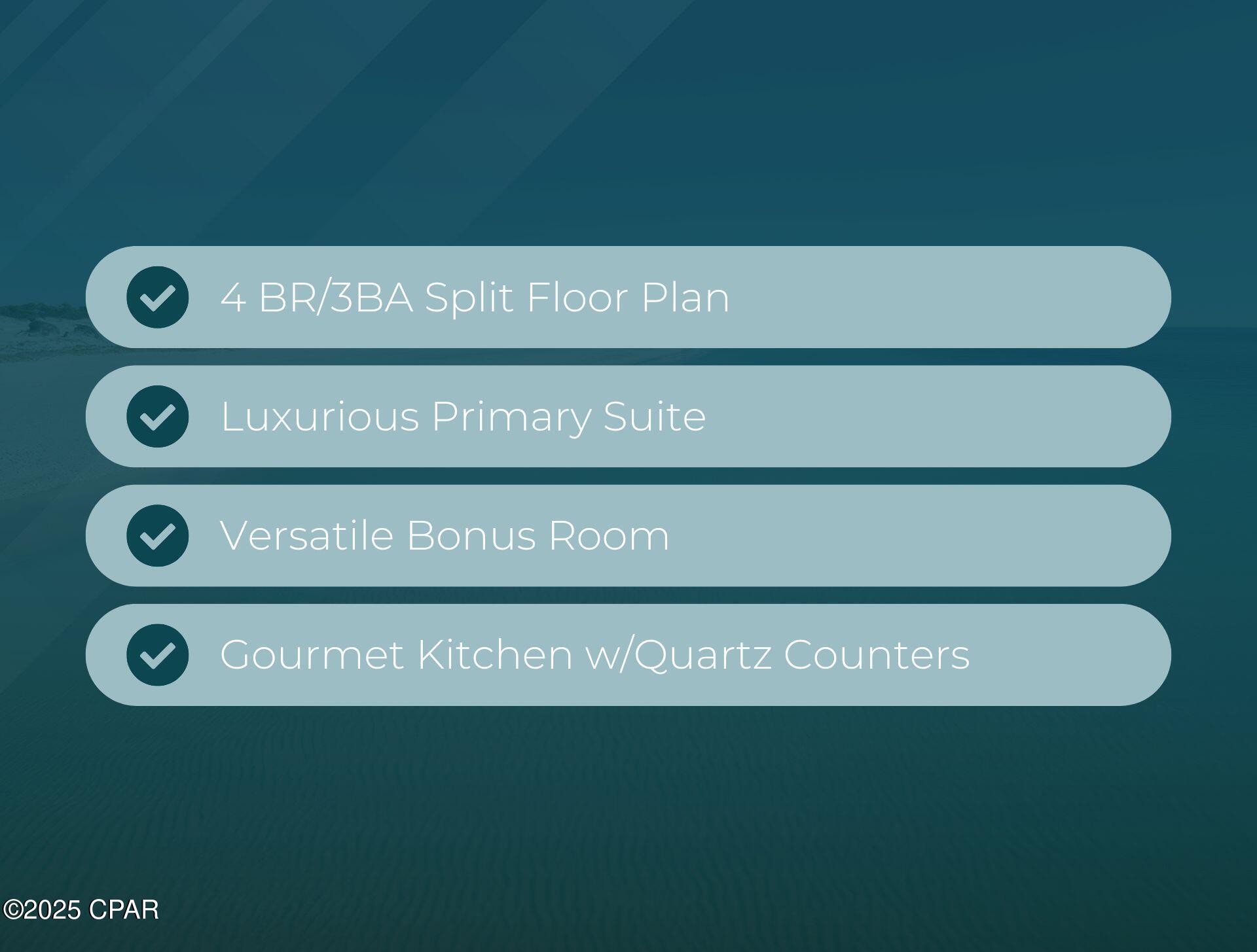 This property has sold! Discover similar listings by reaching out to us for an updated list of available properties that match your preferences. **FOUR LARGE BEDROOMS WITH BONUS/OFFICE SPACE** This custom Arthur Rutenberg home is located in the exclusive, gated community of The Preserve on The Bay, where 24-hour staffed security ensures privacy and peace of mind. Built in 2019 and impeccably maintained by its single, pet-free, non-smoking owner, this home feels practically brand new. The thoughtfully designed split floor plan offers both openness and privacy, with a spacious primary suite tucked away on one side, featuring a luxurious bathroom with a walk-in shower, dual vanities, and an enviable custom closet. The three additional large bedrooms are on the opposite side, with two sharing a bath and one enjoying its own private ensuite. A versatile bonus room provides the flexibility to create a home office, entertainment space, or playroom. The gourmet kitchen boasts a five-burner gas cooktop, quartz countertops, a large island, abundant cabinetry, and a vent hood. A separate laundry room with a sink and space for an extra fridge adds even more convenience. Natural light pours in through a stunning four-panel sliding glass door that opens to the screened-in travertine lanai, overlooking the expansive .66-acre backyard - lush, private, and surrounded by mature trees and protected green space. This home is as energy-efficient as it is beautiful, featuring paid-off solar panels that keep utility costs impressively low - the average electric bill is just $45 per month and, there is even a well for the irrigation system.Additional smart energy features include foamed insulation and a Rinnai tankless water heater. The three-car garage, complete with EV charging and overhead storage, rounds out this exceptional home. A rare opportunity to own in one of Panama City Beach's most sought-after communities - schedule your private tour today.