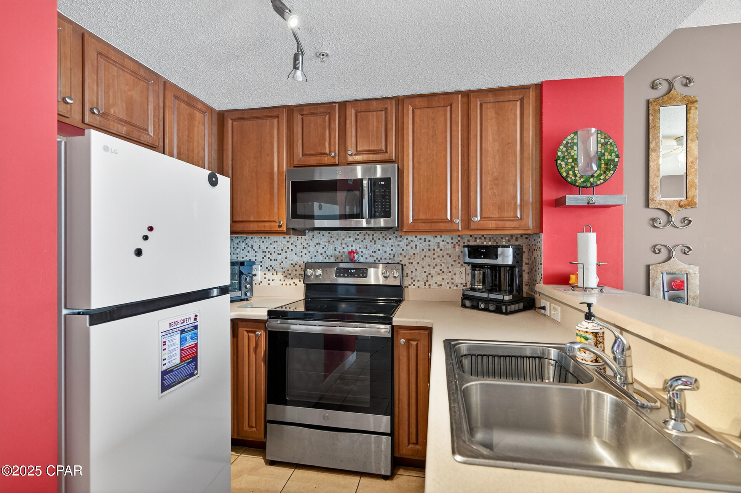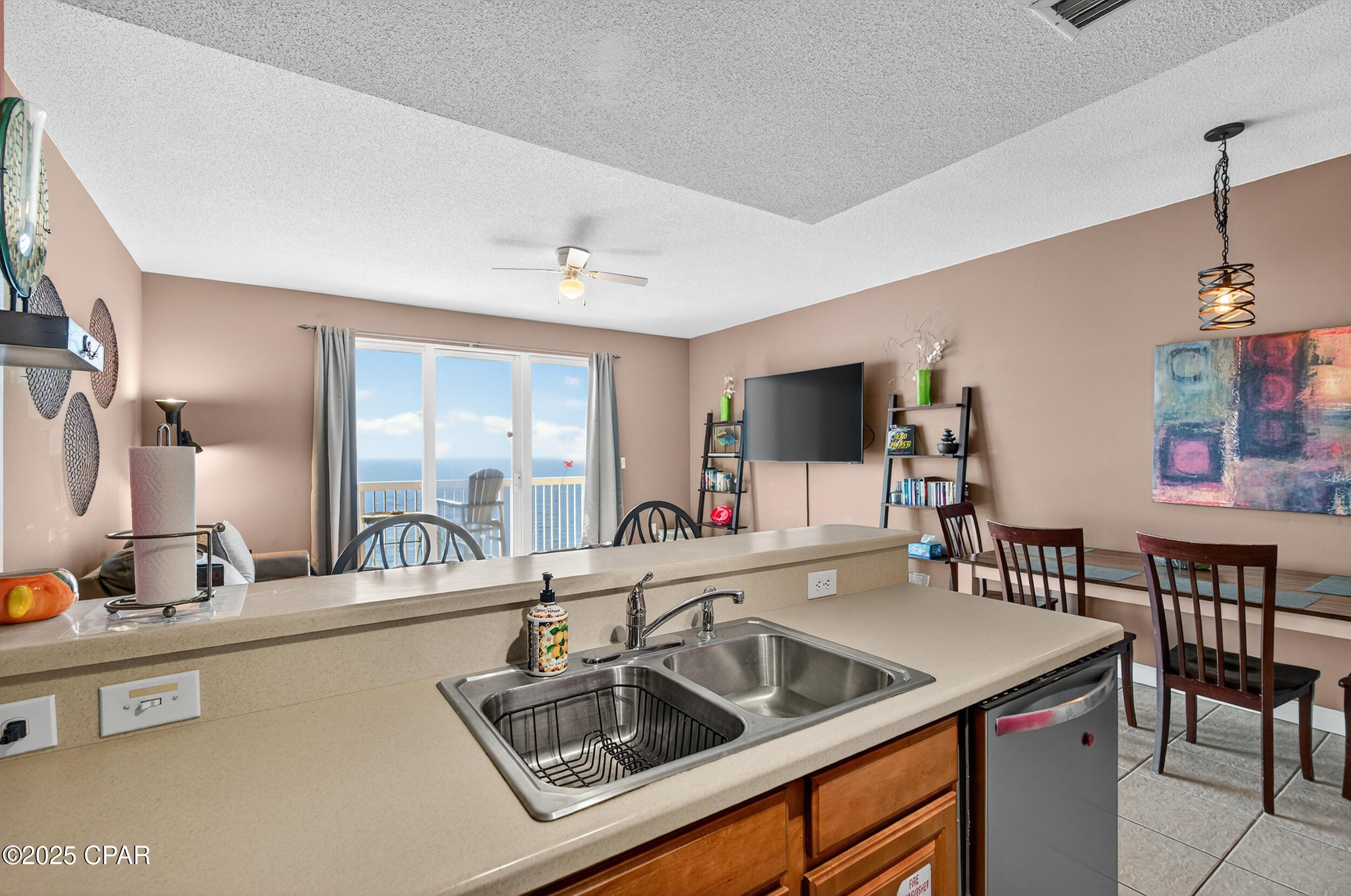 Step through sliding glass doors onto a spacious private balcony with sweeping east and west coast views. Inside, 9-foot ceilings and hard flooring throughout (luxury vinyl plank in the bedroom, tile elsewhere) create a modern, low-maintenance aesthetic. The kitchen is equipped with stainless appliances, while a stacked washer and dryer add convenience for longer stays.