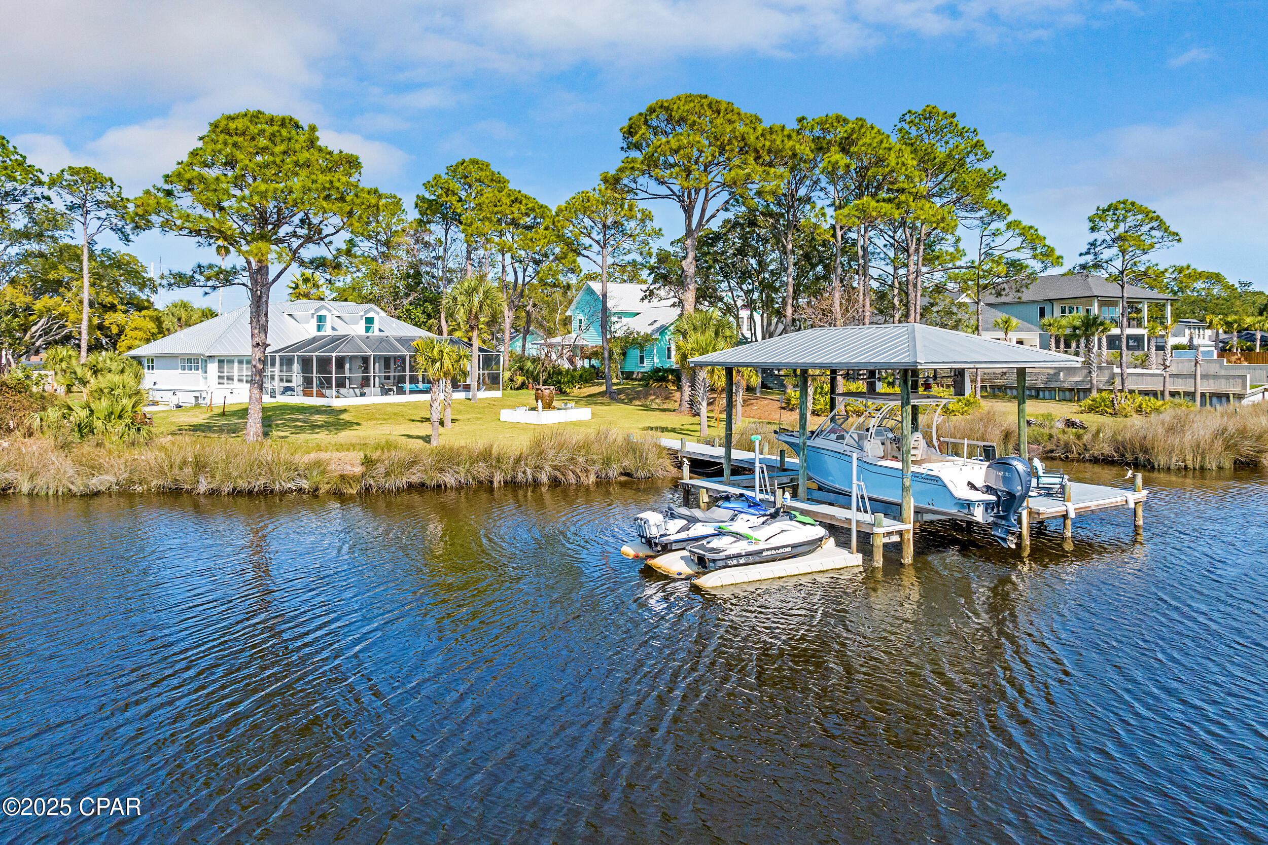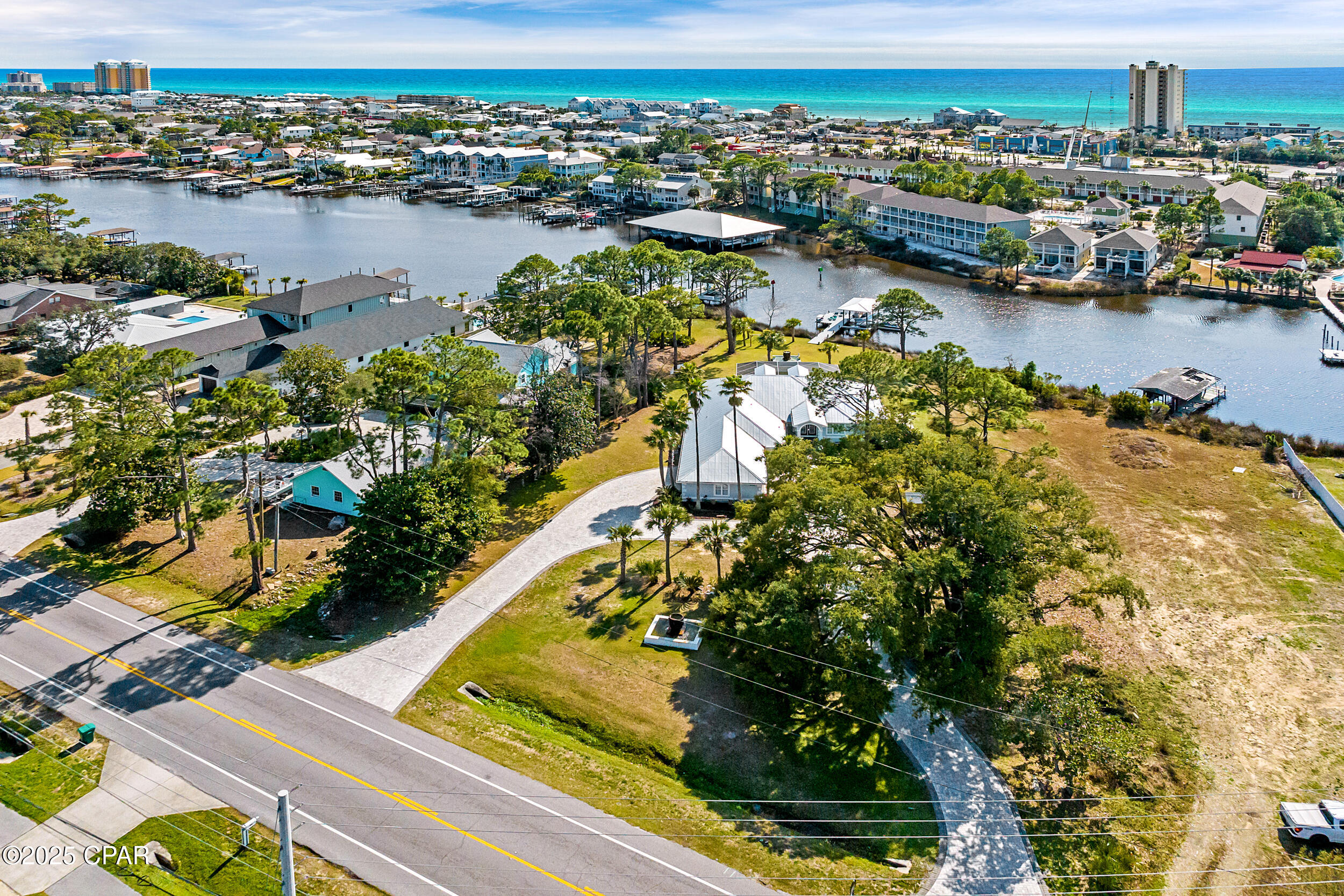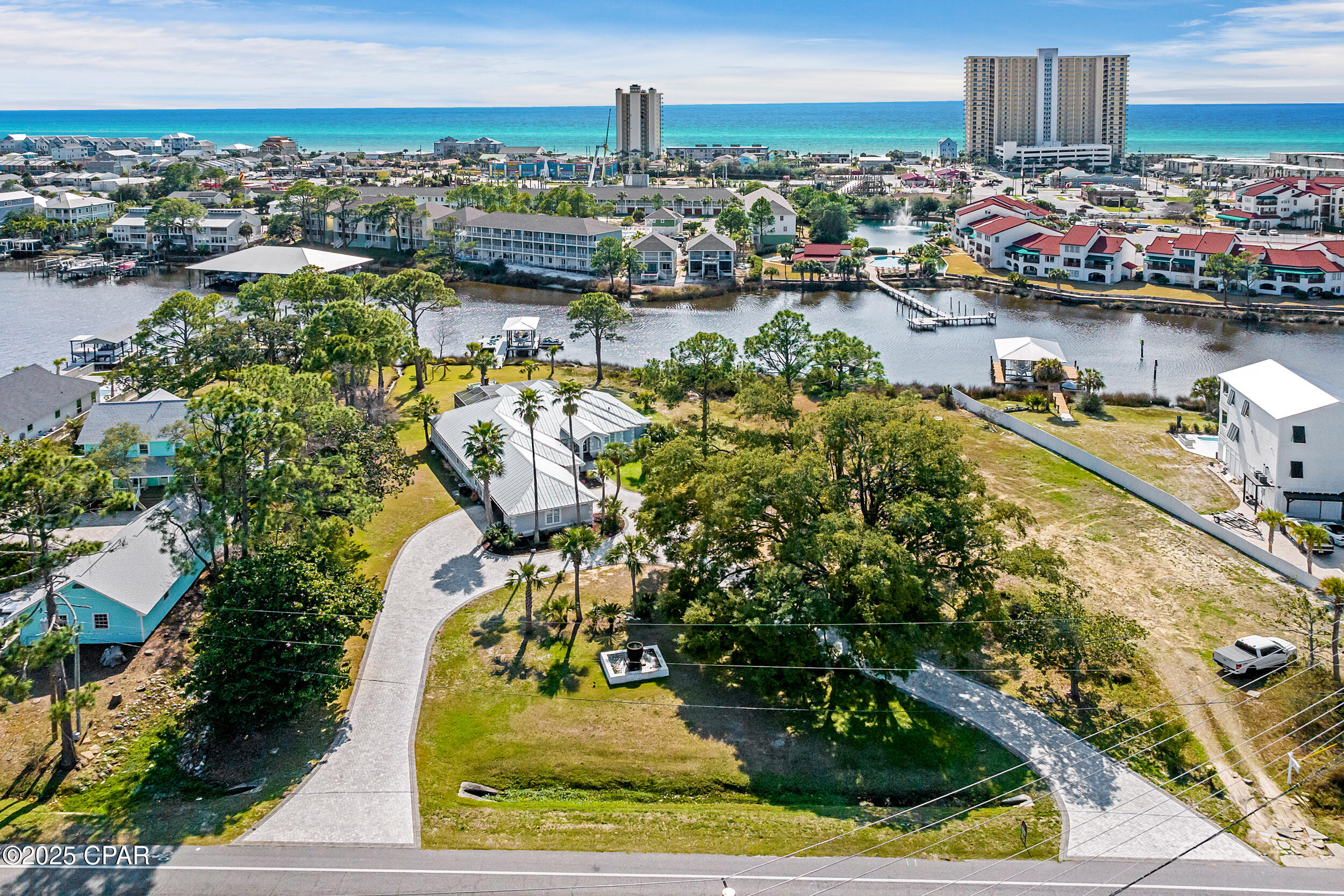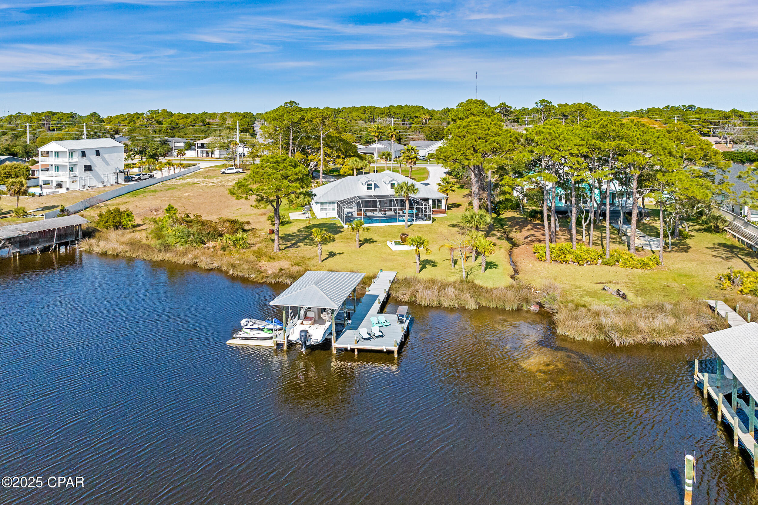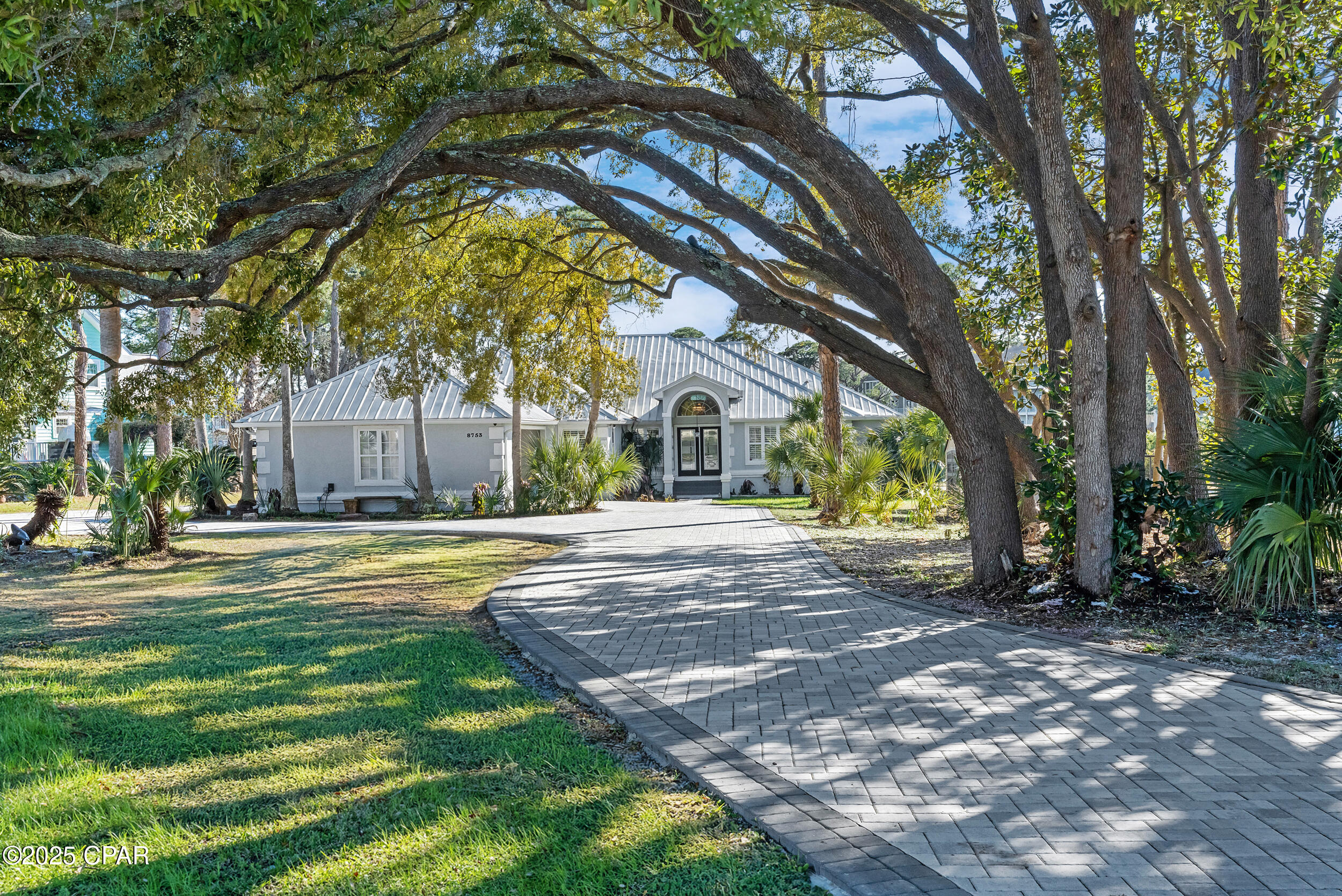 **WATERFRONT WITH GULF ACCESS** PRICED TO MOVE** ALL UPDATES DONE IN THE LAST THREE YEARS** Tucked away beneath a breathtaking canopy of towering Live Oaks, this exceptional waterfront estate creates a dramatic and lasting first impression. Offering the rare combination of private Gulf access and proximity to the beach, it provides the best of both worlds - launch your boat from your own dock or take a short stroll to Panama City Beach's sugar-white sands via Beach Access 24. Despite its serene waterfront setting, this home is located in the heart of PCB, keeping you just minutes from the area's best dining, shopping, and entertainment. A beautifully designed circular driveway, finished with high-end pavers and framed by lush greenery, sets the stage for the elegance within. Step inside to a refined yet inviting interior, where vaulted ceilings and an open-concept layout enhance the sense of space and light. Luxury vinyl plank flooring flows seamlessly throughout, leading to five generously sized bedrooms - each with a private bath featuring quartz counters, marble tile, and shiplap accents. The master suite is a true sanctuary, boasting a spa-like bath with a marble soaking tub and a walk-in glass shower. The kitchen impresses with an oversized island and bar, marble counters, stainless appliances, ample cabinets, and a striking ceiling pot rack, all offering style and functionality. A charming breakfast nook overlooks the lagoon and resort-style enclosed pool area, complete with a cabana, bath, and outdoor kitchen - perfect for effortless alfresco entertaining. The expansive backyard is a true waterfront oasis, offering plenty of space to relax, entertain, fish off the dock, or simply take in the views. Beyond, an updated boat dock with a 12,000 lb lift invites you to explore the area, with the Gulf just minutes away via the iconic Grand Lagoon. This is more than just a house - it's a dream home where lifelong memories are made. With short-term rentals allowed and no HOA, you'll have the flexibility to make it your full-time residence while still having options for the future. Schedule your private tour today and experience the best of Panama City Beach living.