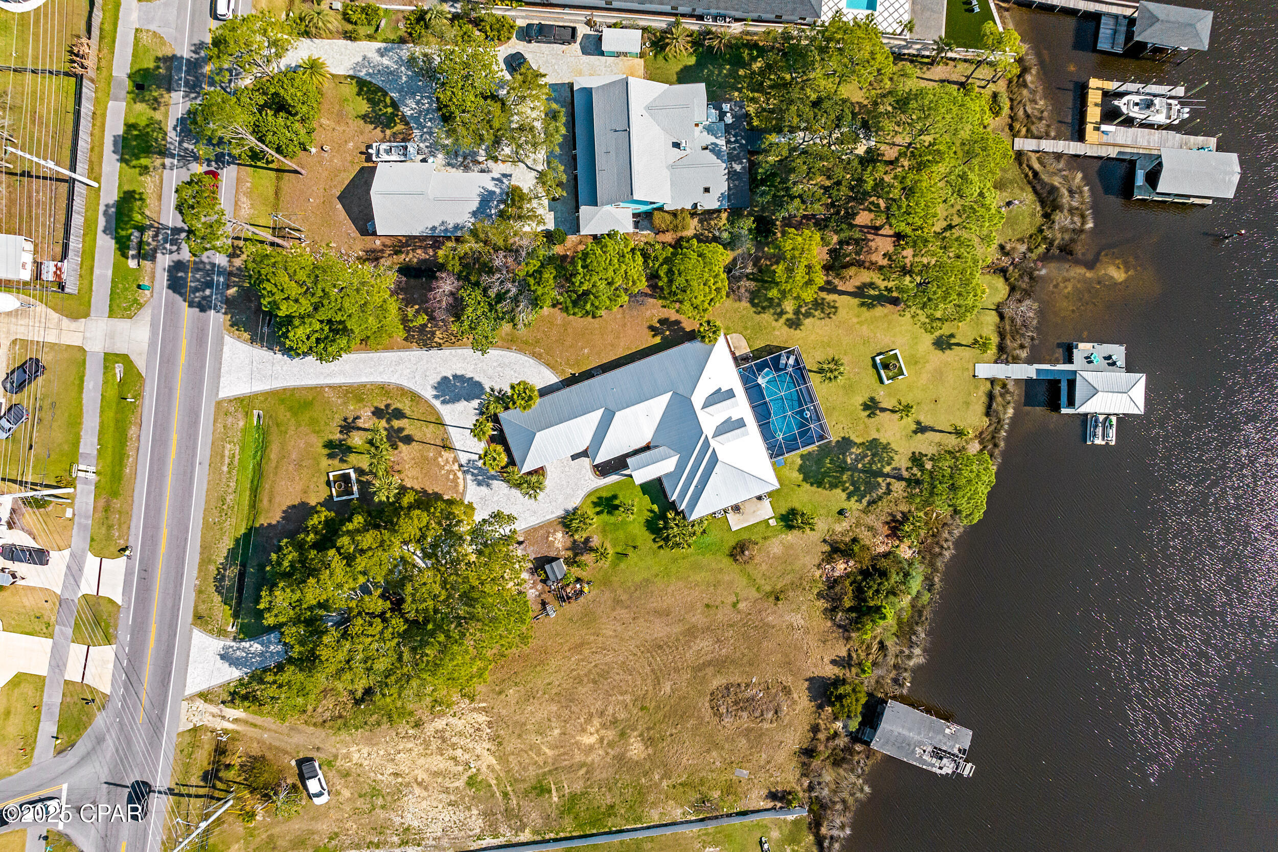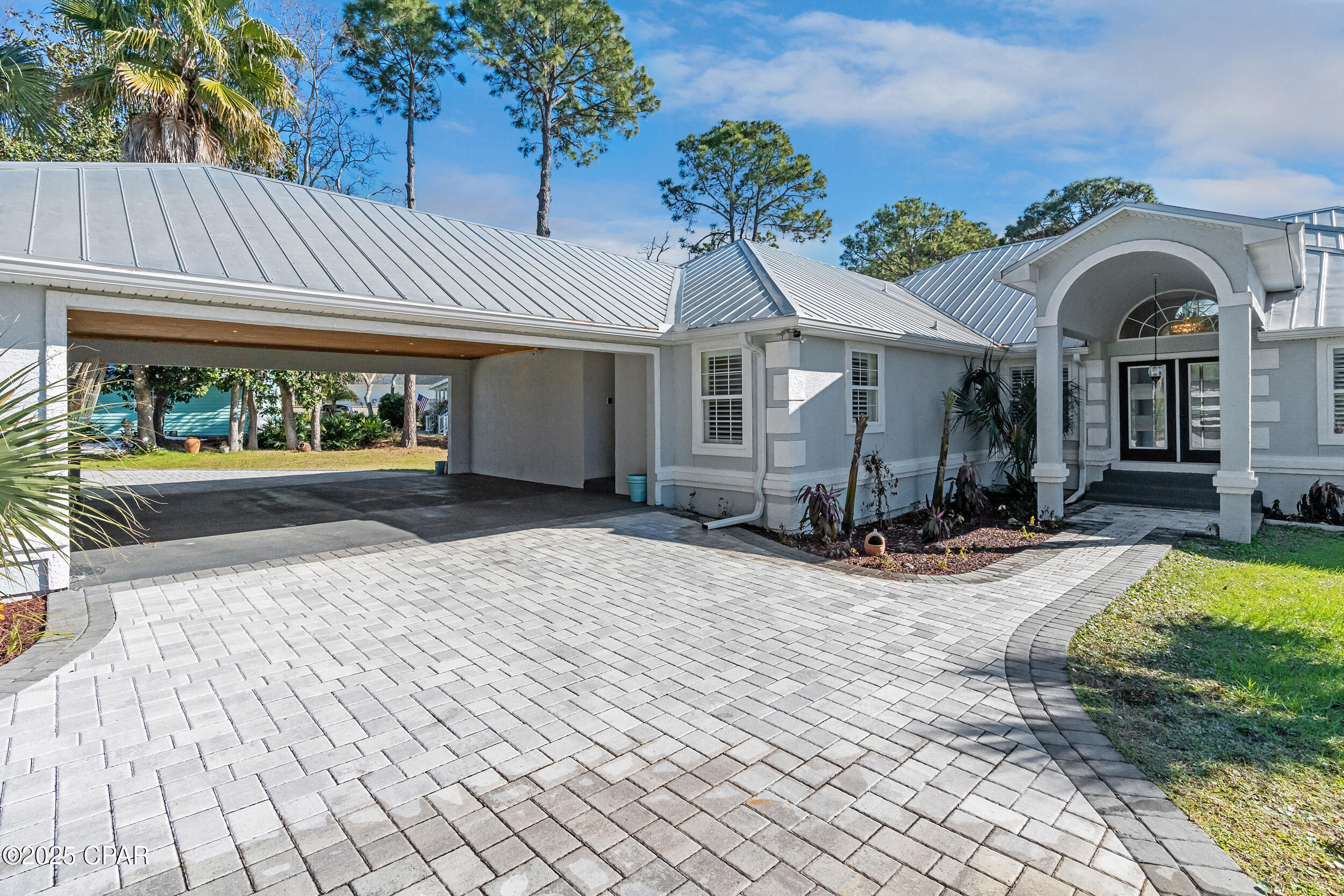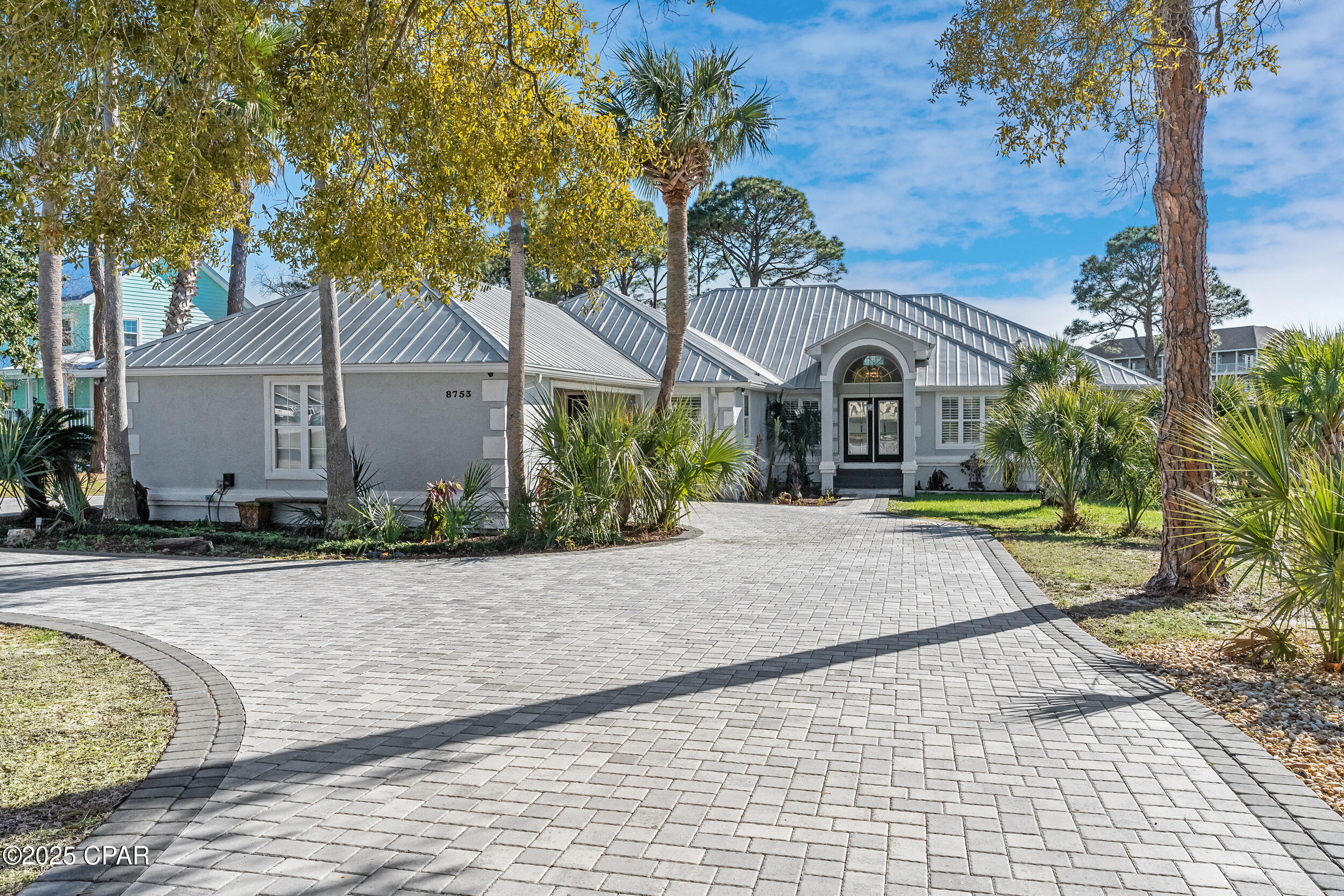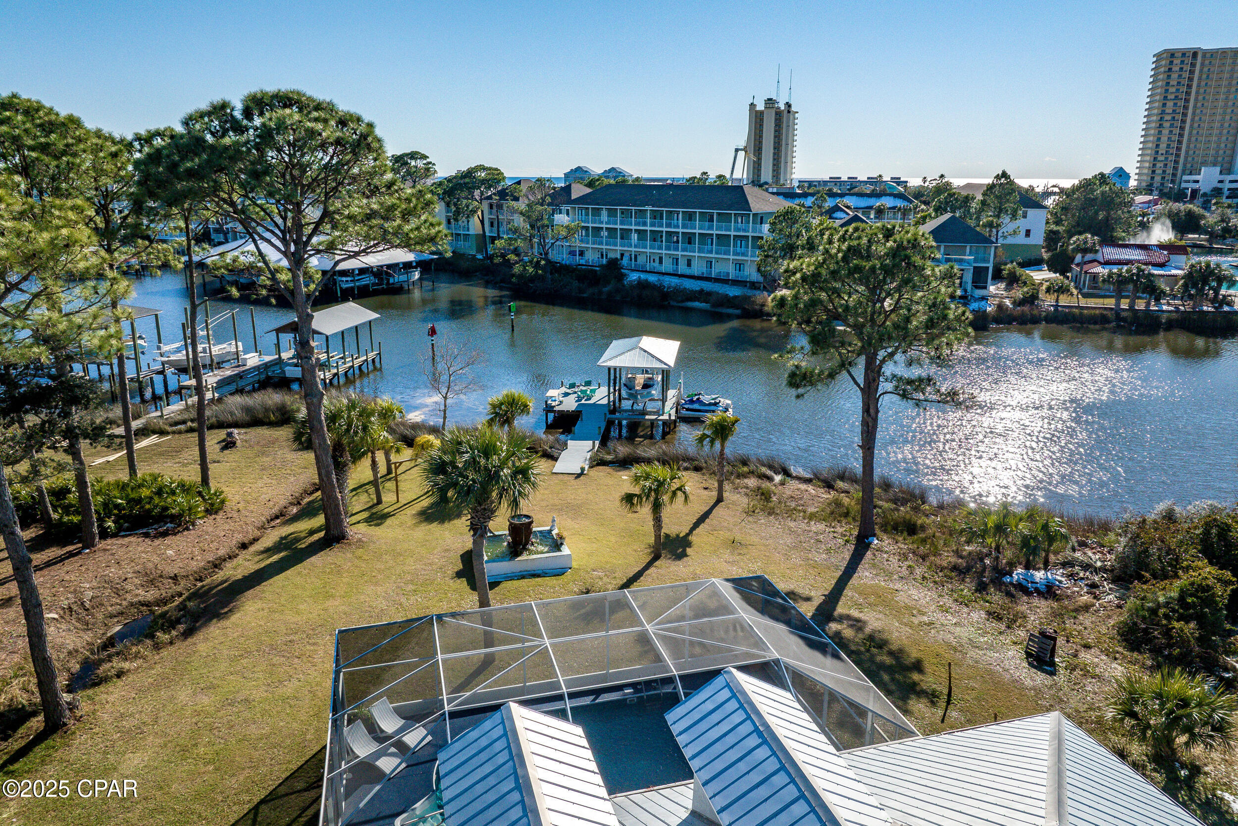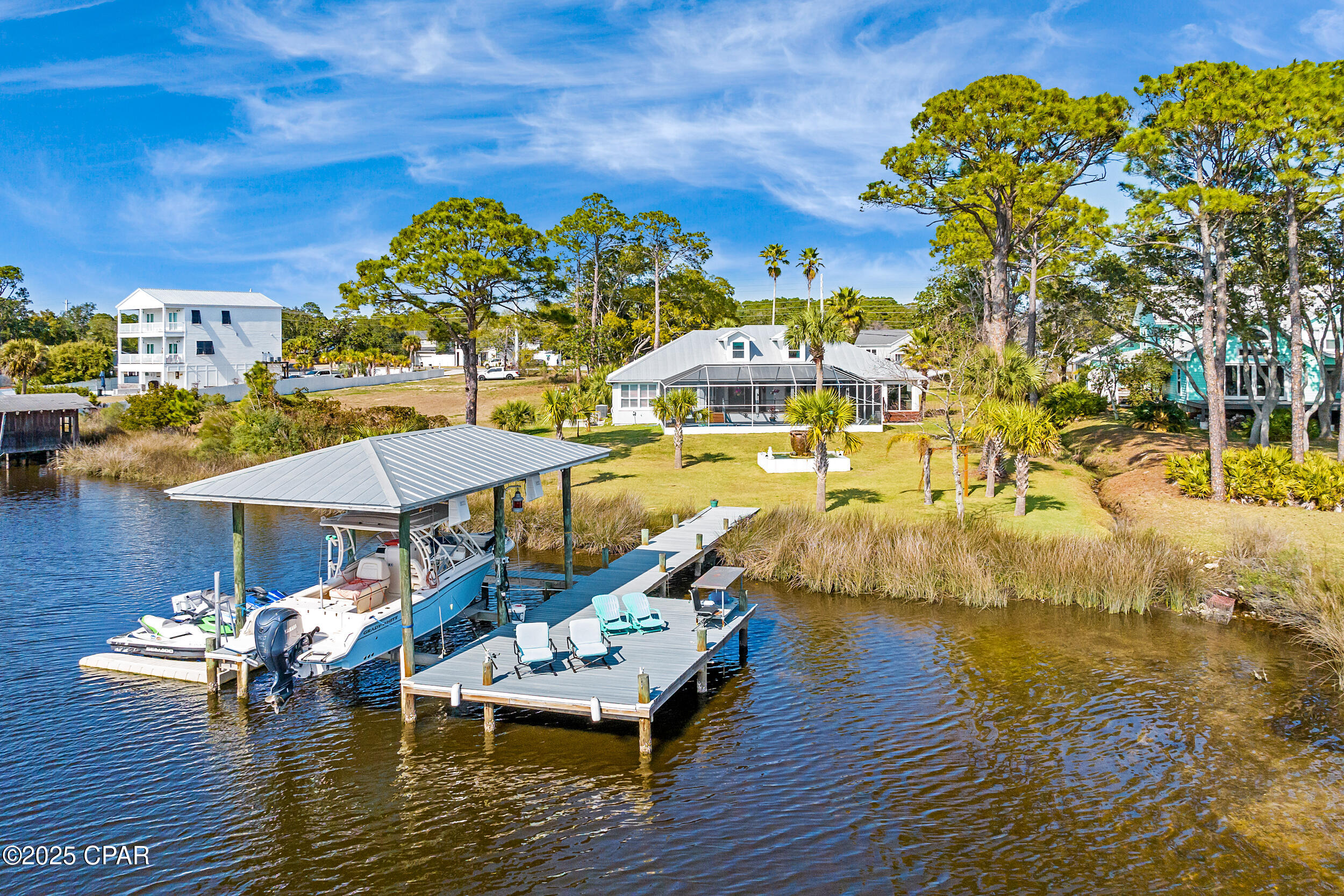 **WATERFRONT WITH GULF ACCESS** PRICED TO MOVE** ALL UPDATES DONE IN THE LAST THREE YEARS** Tucked away beneath a breathtaking canopy of towering Live Oaks, this exceptional waterfront estate creates a dramatic and lasting first impression. Offering the rare combination of private Gulf access and proximity to the beach, it provides the best of both worlds - launch your boat from your own dock or take a short stroll to Panama City Beach's sugar-white sands via Beach Access 24. Despite its serene waterfront setting, this home is located in the heart of PCB, keeping you just minutes from the area's best dining, shopping, and entertainment. A beautifully designed circular driveway, finished with high-end pavers and framed by lush greenery, sets the stage for the elegance within. Step inside to a refined yet inviting interior, where vaulted ceilings and an open-concept layout enhance the sense of space and light. Luxury vinyl plank flooring flows seamlessly throughout, leading to five generously sized bedrooms - each with a private bath featuring quartz counters, marble tile, and shiplap accents. The master suite is a true sanctuary, boasting a spa-like bath with a marble soaking tub and a walk-in glass shower. The kitchen impresses with an oversized island and bar, marble counters, stainless appliances, ample cabinets, and a striking ceiling pot rack, all offering style and functionality. A charming breakfast nook overlooks the lagoon and resort-style enclosed pool area, complete with a cabana, bath, and outdoor kitchen - perfect for effortless alfresco entertaining. The expansive backyard is a true waterfront oasis, offering plenty of space to relax, entertain, fish off the dock, or simply take in the views. Beyond, an updated boat dock with a 12,000 lb lift invites you to explore the area, with the Gulf just minutes away via the iconic Grand Lagoon. This is more than just a house - it's a dream home where lifelong memories are made. With short-term rentals allowed and no HOA, you'll have the flexibility to make it your full-time residence while still having options for the future. Schedule your private tour today and experience the best of Panama City Beach living.