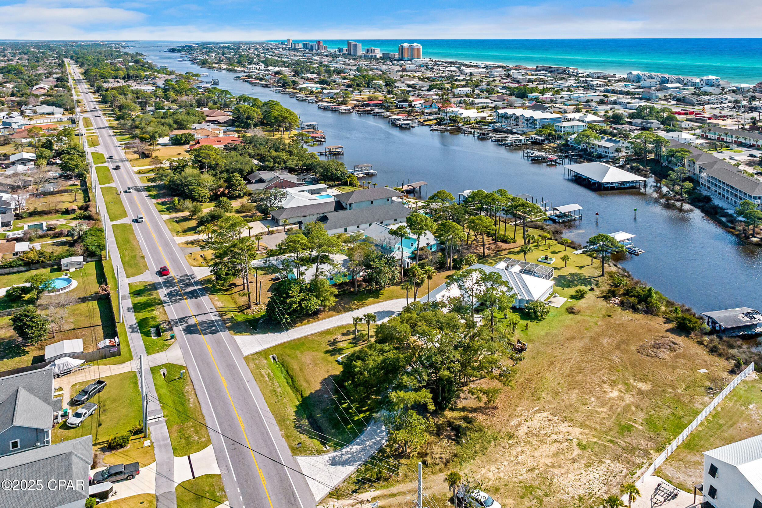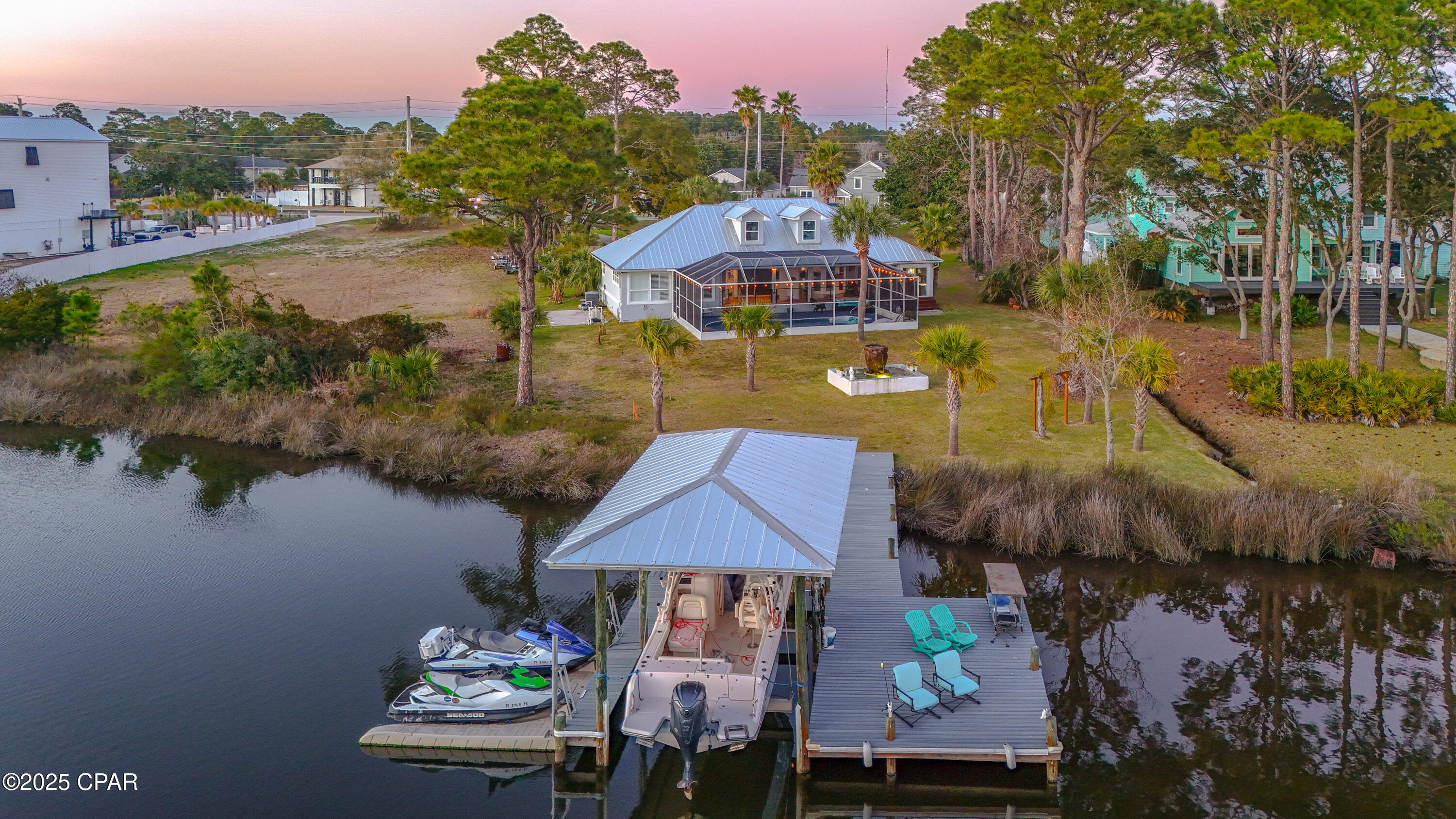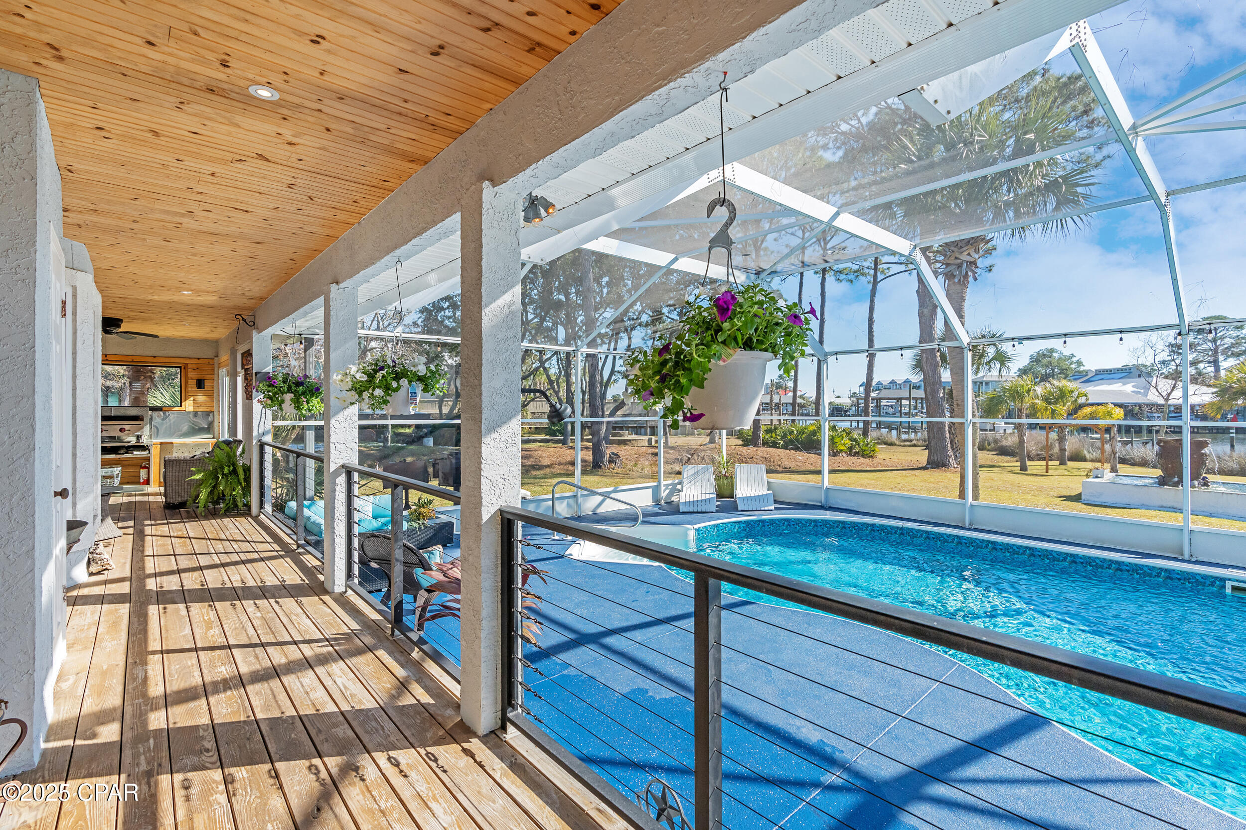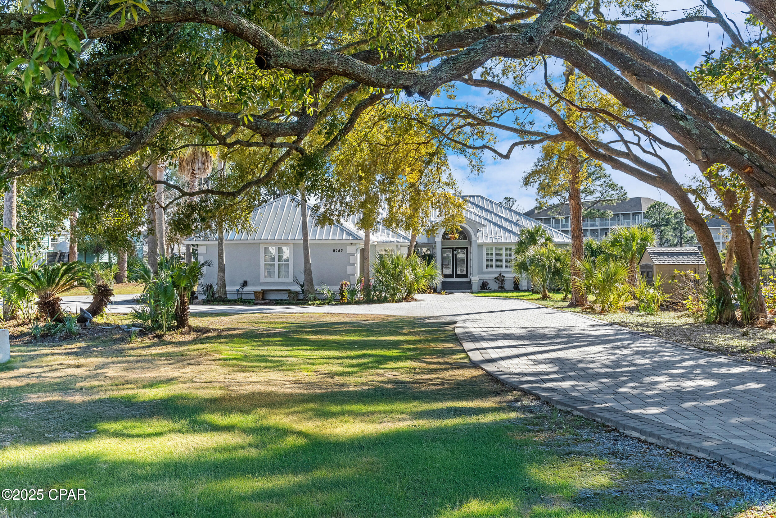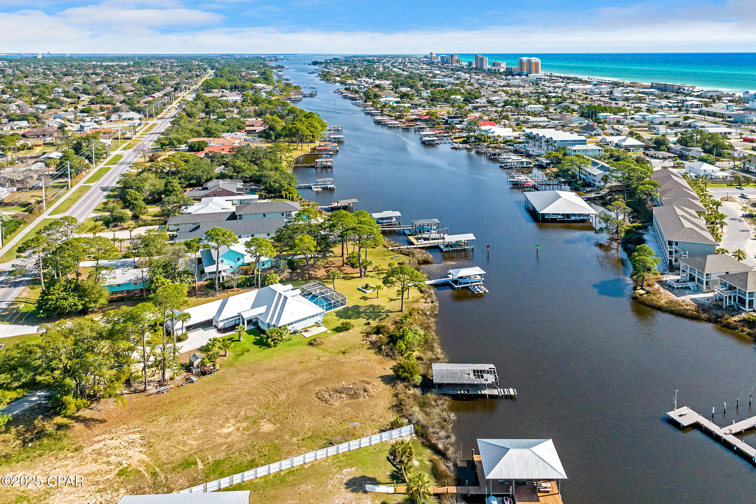 **WATERFRONT WITH GULF ACCESS** PRICED TO MOVE** ALL UPDATES DONE IN THE LAST THREE YEARS** Tucked away beneath a breathtaking canopy of towering Live Oaks, this exceptional waterfront estate creates a dramatic and lasting first impression. Offering the rare combination of private Gulf access and proximity to the beach, it provides the best of both worlds - launch your boat from your own dock or take a short stroll to Panama City Beach's sugar-white sands via Beach Access 24. Despite its serene waterfront setting, this home is located in the heart of PCB, keeping you just minutes from the area's best dining, shopping, and entertainment. A beautifully designed circular driveway, finished with high-end pavers and framed by lush greenery, sets the stage for the elegance within. Step inside to a refined yet inviting interior, where vaulted ceilings and an open-concept layout enhance the sense of space and light. Luxury vinyl plank flooring flows seamlessly throughout, leading to five generously sized bedrooms - each with a private bath featuring quartz counters, marble tile, and shiplap accents. The master suite is a true sanctuary, boasting a spa-like bath with a marble soaking tub and a walk-in glass shower. The kitchen impresses with an oversized island and bar, marble counters, stainless appliances, ample cabinets, and a striking ceiling pot rack, all offering style and functionality. A charming breakfast nook overlooks the lagoon and resort-style enclosed pool area, complete with a cabana, bath, and outdoor kitchen - perfect for effortless alfresco entertaining. The expansive backyard is a true waterfront oasis, offering plenty of space to relax, entertain, fish off the dock, or simply take in the views. Beyond, an updated boat dock with a 12,000 lb lift invites you to explore the area, with the Gulf just minutes away via the iconic Grand Lagoon. This is more than just a house - it's a dream home where lifelong memories are made. With short-term rentals allowed and no HOA, you'll have the flexibility to make it your full-time residence while still having options for the future. Schedule your private tour today and experience the best of Panama City Beach living.