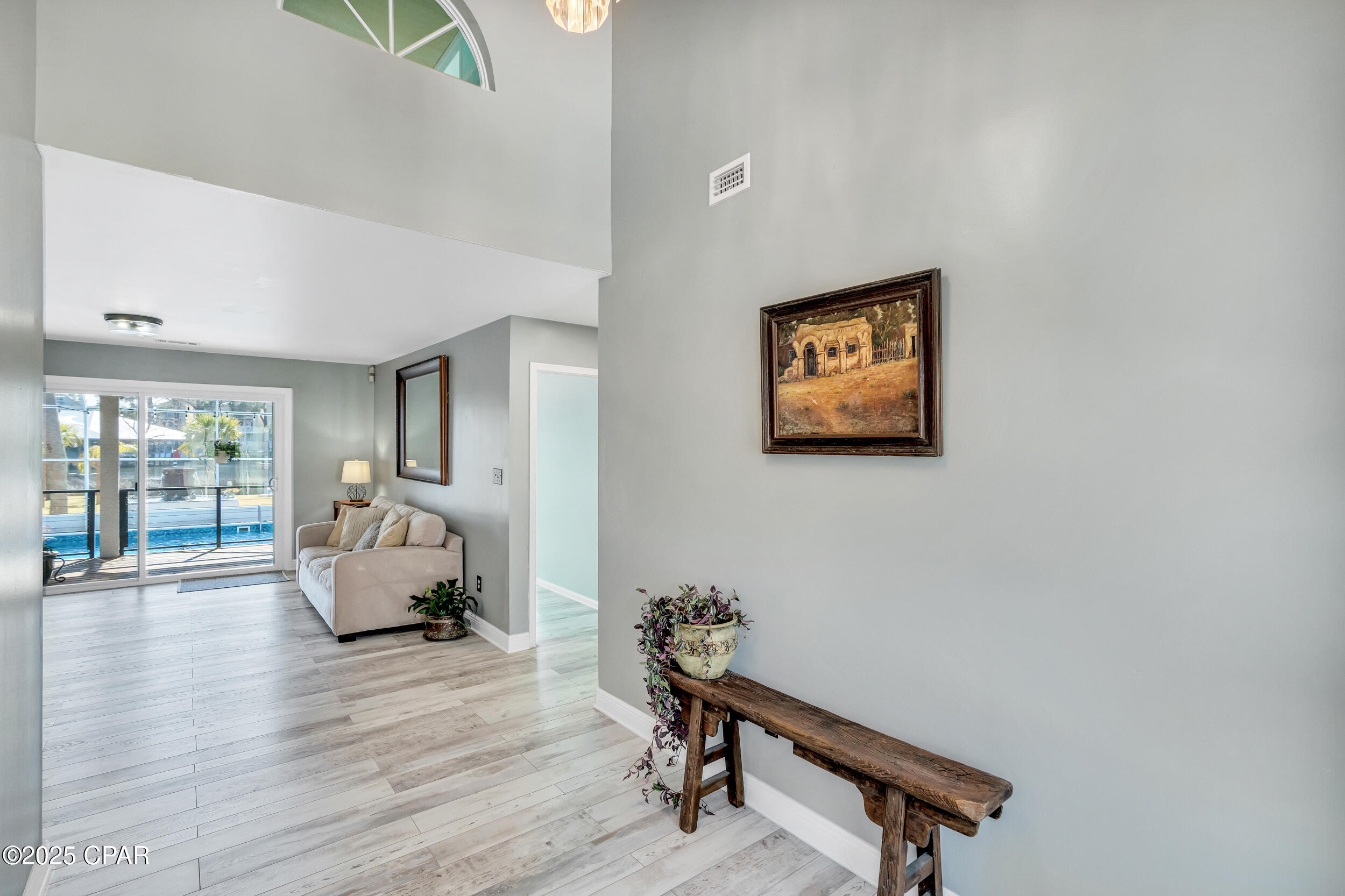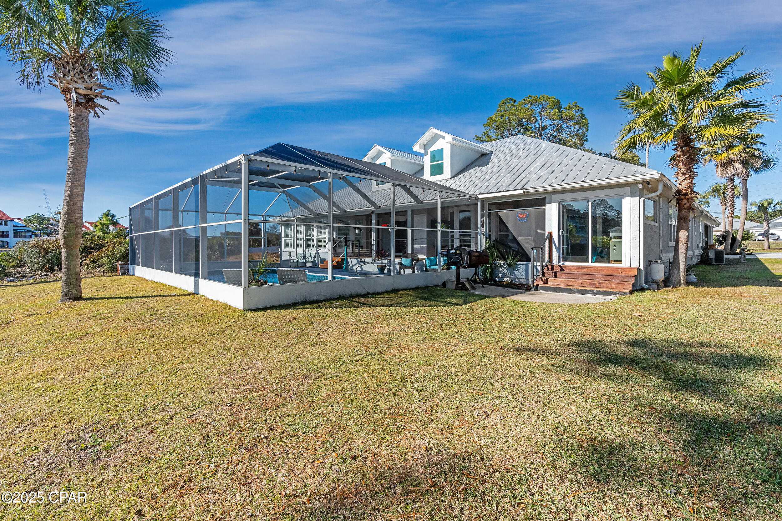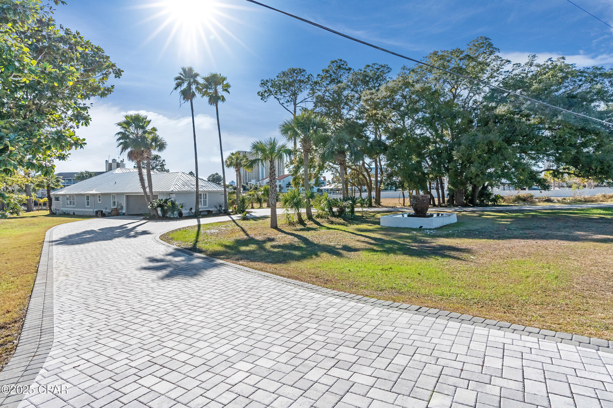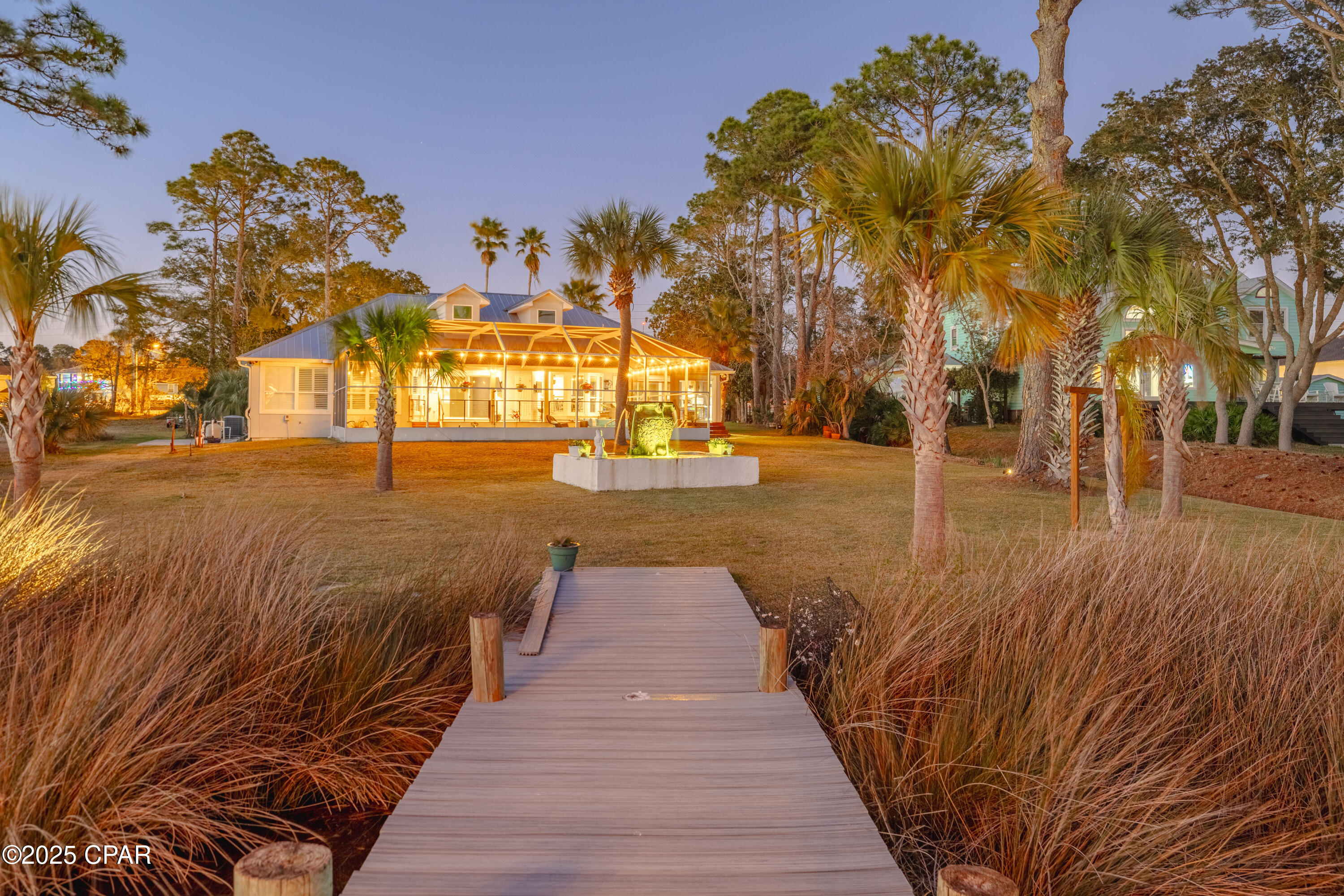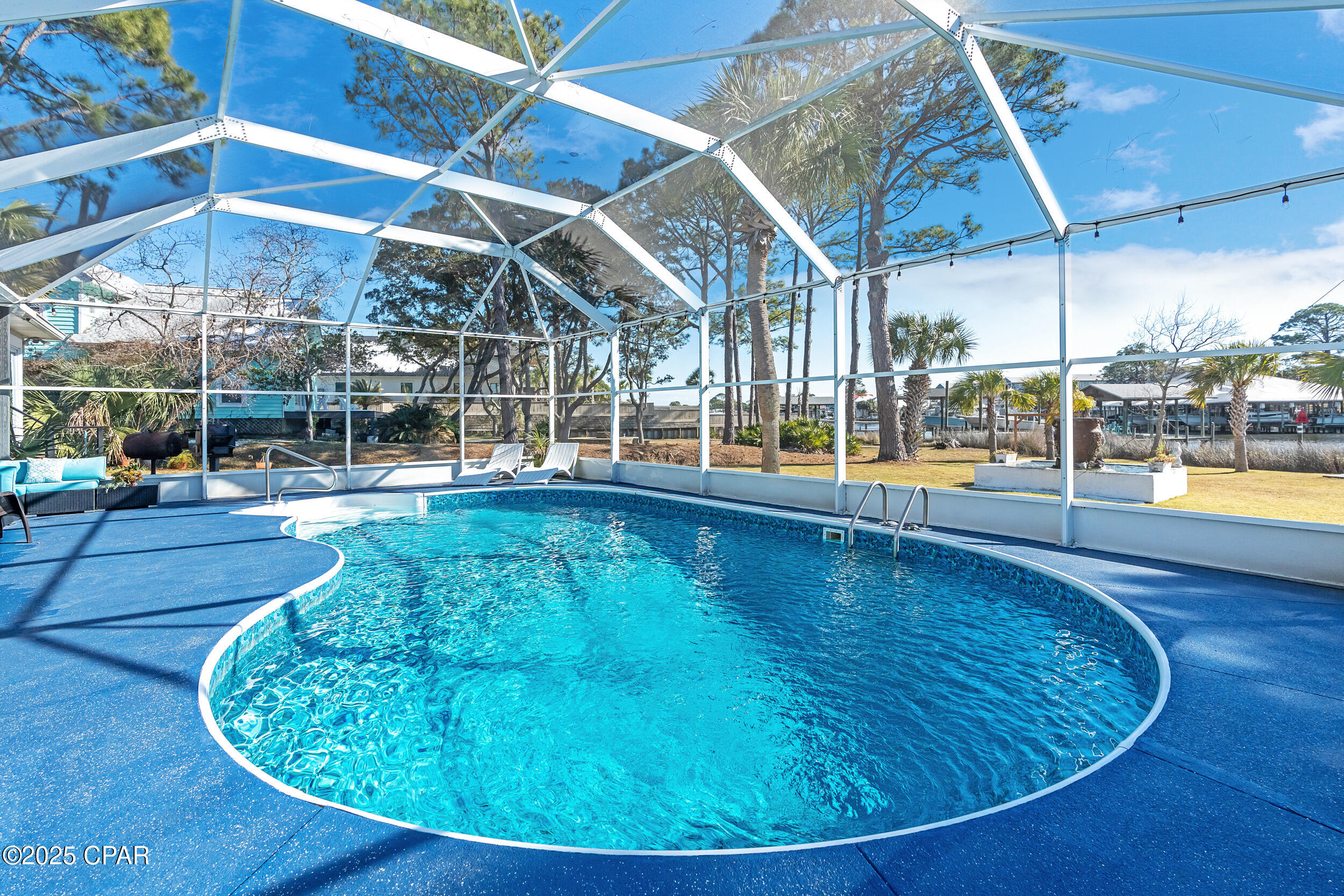 **WATERFRONT WITH GULF ACCESS** PRICED TO MOVE** ALL UPDATES DONE IN THE LAST THREE YEARS** Tucked away beneath a breathtaking canopy of towering Live Oaks, this exceptional waterfront estate creates a dramatic and lasting first impression. Offering the rare combination of private Gulf access and proximity to the beach, it provides the best of both worlds - launch your boat from your own dock or take a short stroll to Panama City Beach's sugar-white sands via Beach Access 24. Despite its serene waterfront setting, this home is located in the heart of PCB, keeping you just minutes from the area's best dining, shopping, and entertainment. A beautifully designed circular driveway, finished with high-end pavers and framed by lush greenery, sets the stage for the elegance within. Step inside to a refined yet inviting interior, where vaulted ceilings and an open-concept layout enhance the sense of space and light. Luxury vinyl plank flooring flows seamlessly throughout, leading to five generously sized bedrooms - each with a private bath featuring quartz counters, marble tile, and shiplap accents. The master suite is a true sanctuary, boasting a spa-like bath with a marble soaking tub and a walk-in glass shower. The kitchen impresses with an oversized island and bar, marble counters, stainless appliances, ample cabinets, and a striking ceiling pot rack, all offering style and functionality. A charming breakfast nook overlooks the lagoon and resort-style enclosed pool area, complete with a cabana, bath, and outdoor kitchen - perfect for effortless alfresco entertaining. The expansive backyard is a true waterfront oasis, offering plenty of space to relax, entertain, fish off the dock, or simply take in the views. Beyond, an updated boat dock with a 12,000 lb lift invites you to explore the area, with the Gulf just minutes away via the iconic Grand Lagoon. This is more than just a house - it's a dream home where lifelong memories are made. With short-term rentals allowed and no HOA, you'll have the flexibility to make it your full-time residence while still having options for the future. Schedule your private tour today and experience the best of Panama City Beach living.