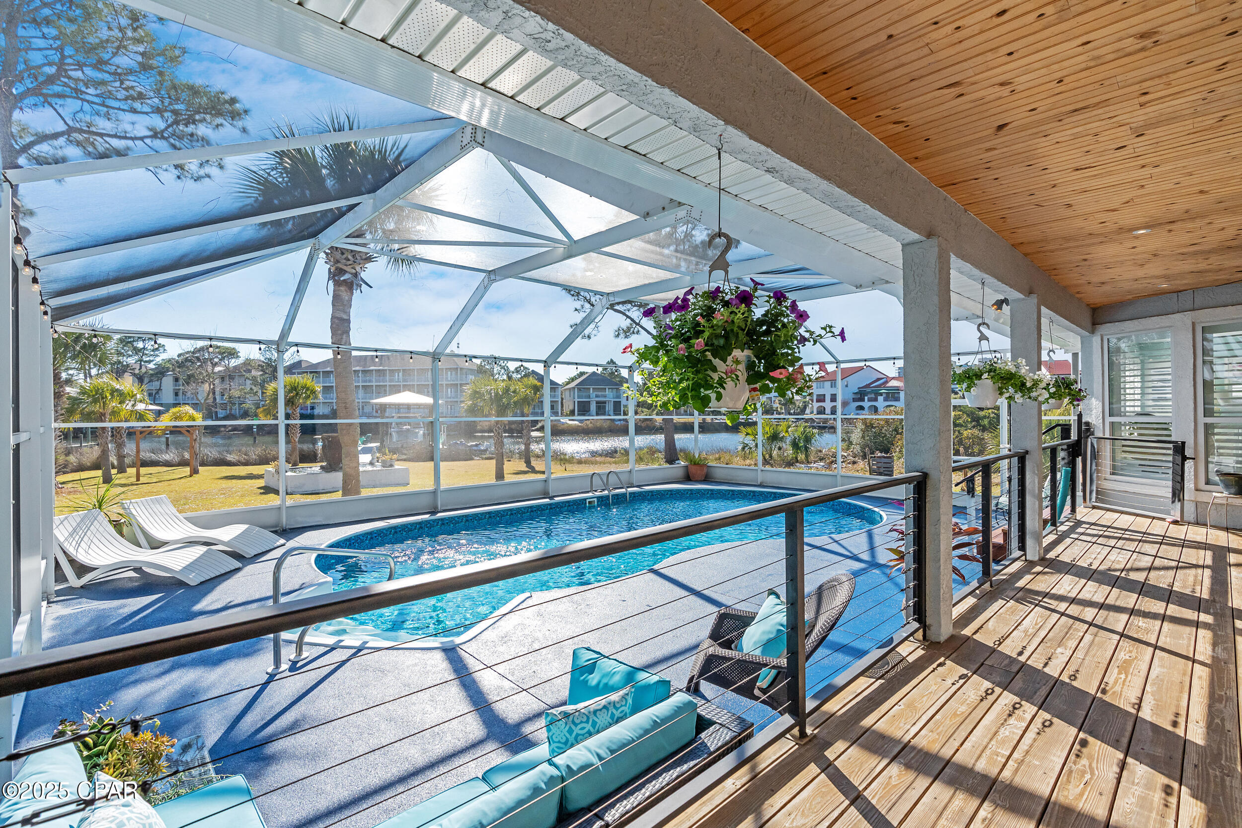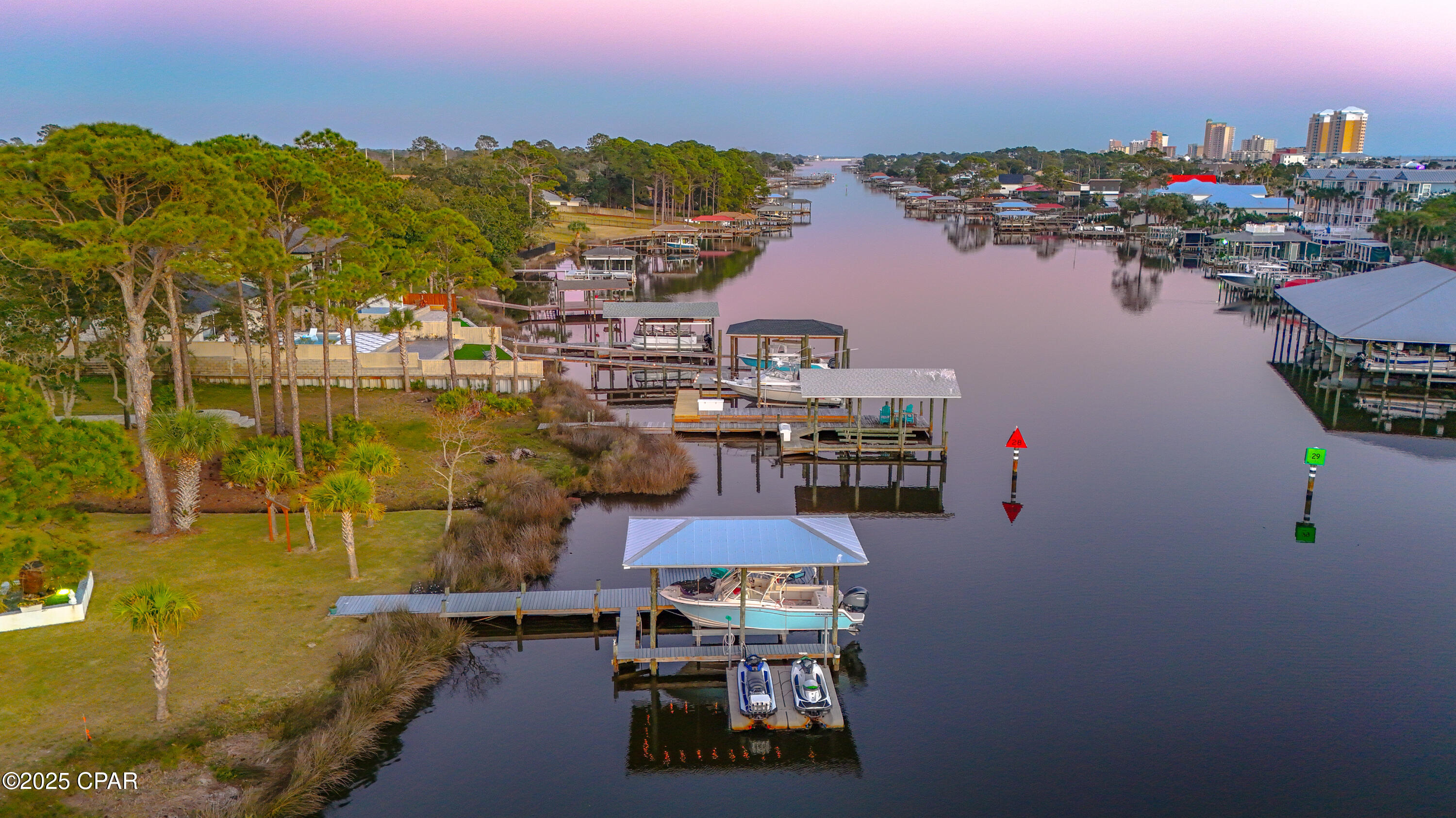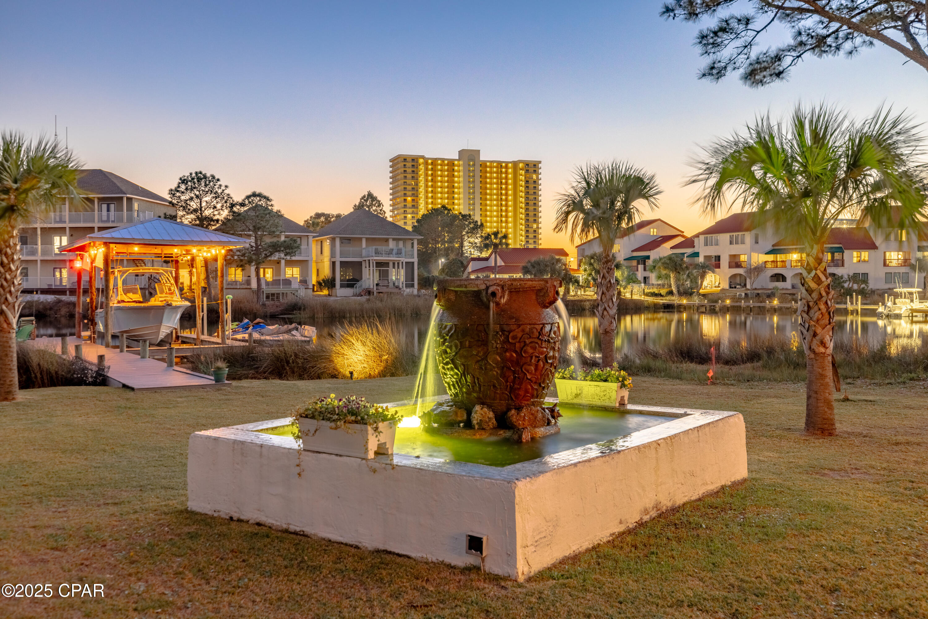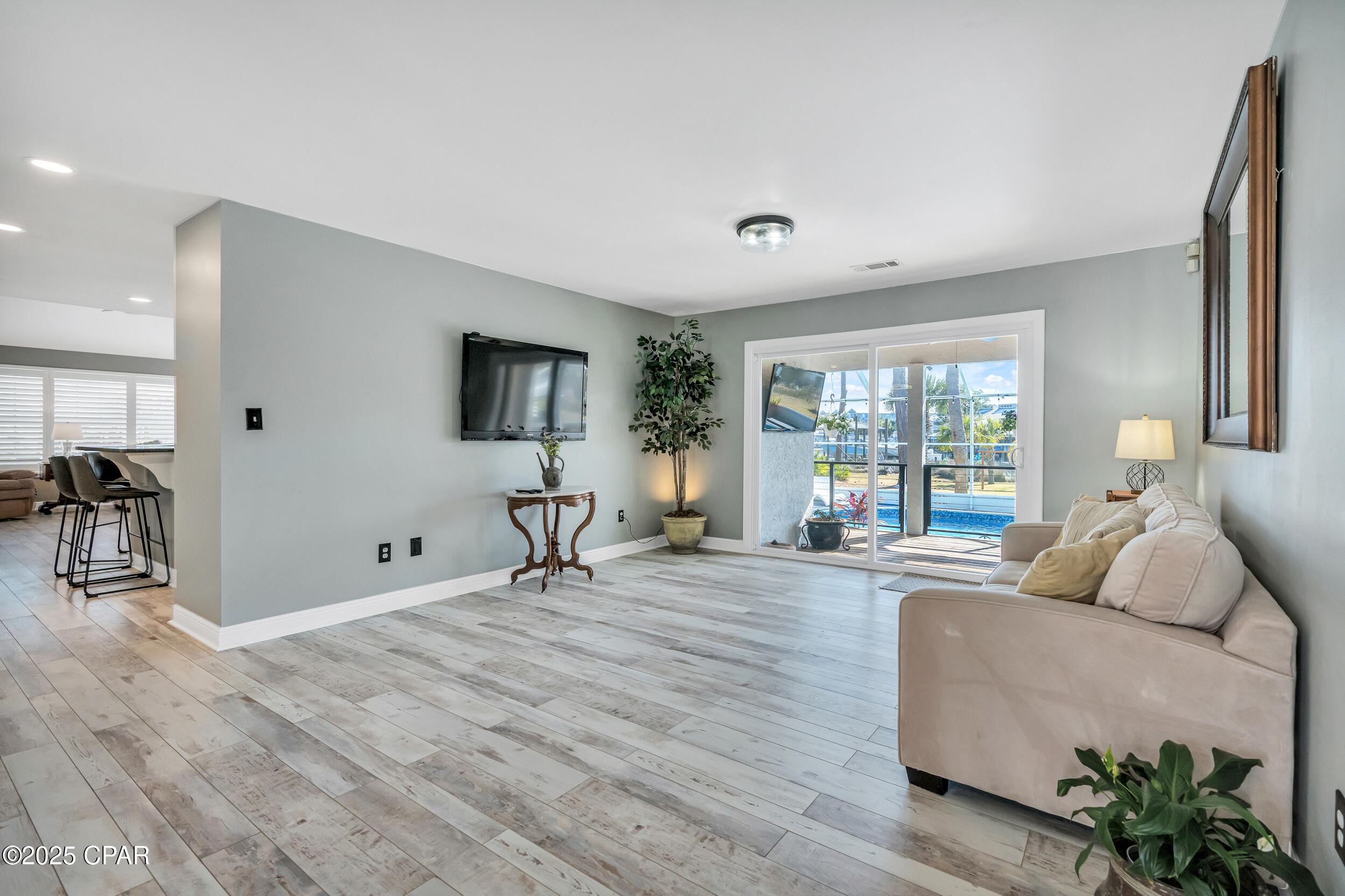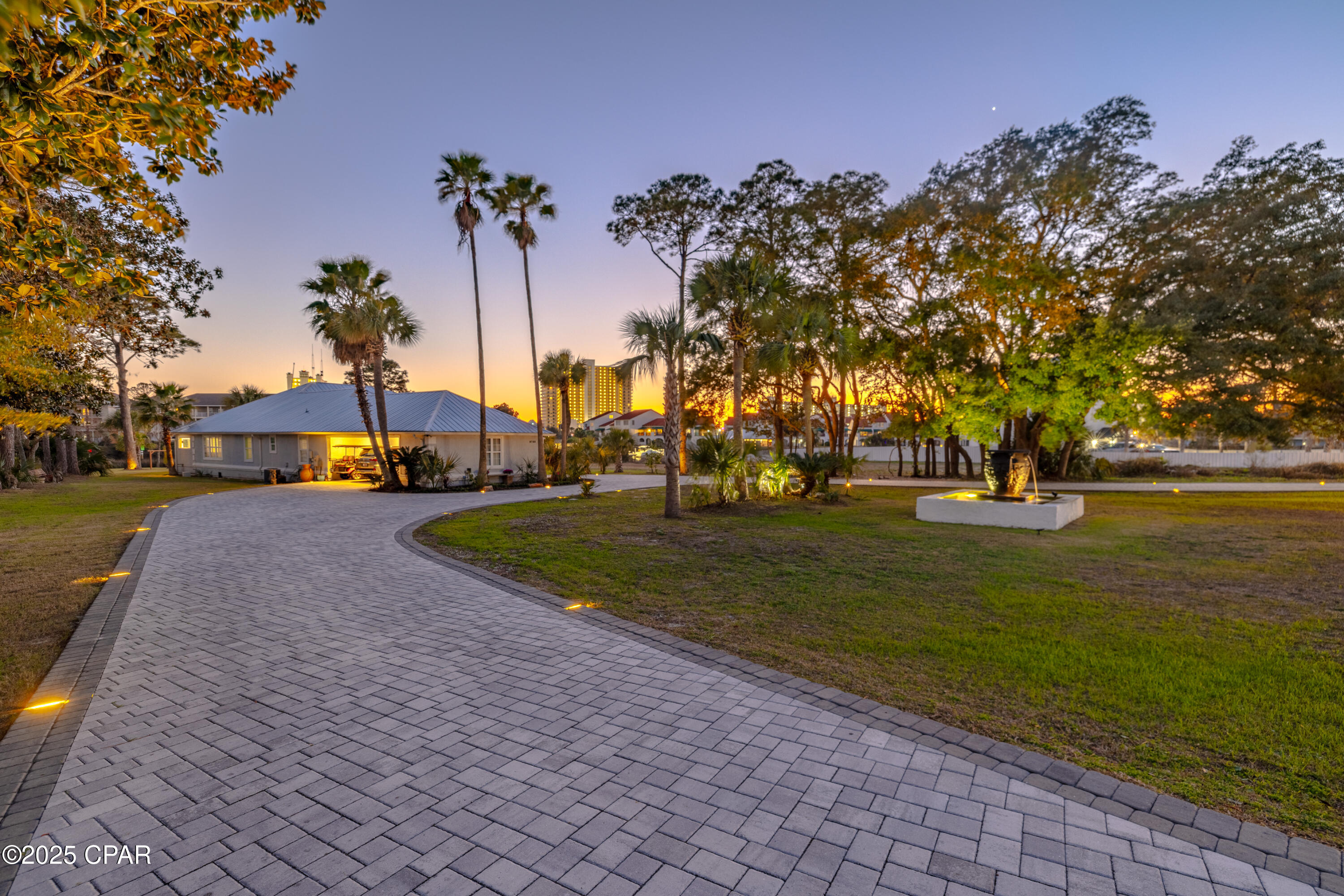 **WATERFRONT WITH GULF ACCESS** PRICED TO MOVE** ALL UPDATES DONE IN THE LAST THREE YEARS** Tucked away beneath a breathtaking canopy of towering Live Oaks, this exceptional waterfront estate creates a dramatic and lasting first impression. Offering the rare combination of private Gulf access and proximity to the beach, it provides the best of both worlds - launch your boat from your own dock or take a short stroll to Panama City Beach's sugar-white sands via Beach Access 24. Despite its serene waterfront setting, this home is located in the heart of PCB, keeping you just minutes from the area's best dining, shopping, and entertainment. A beautifully designed circular driveway, finished with high-end pavers and framed by lush greenery, sets the stage for the elegance within. Step inside to a refined yet inviting interior, where vaulted ceilings and an open-concept layout enhance the sense of space and light. Luxury vinyl plank flooring flows seamlessly throughout, leading to five generously sized bedrooms - each with a private bath featuring quartz counters, marble tile, and shiplap accents. The master suite is a true sanctuary, boasting a spa-like bath with a marble soaking tub and a walk-in glass shower. The kitchen impresses with an oversized island and bar, marble counters, stainless appliances, ample cabinets, and a striking ceiling pot rack, all offering style and functionality. A charming breakfast nook overlooks the lagoon and resort-style enclosed pool area, complete with a cabana, bath, and outdoor kitchen - perfect for effortless alfresco entertaining. The expansive backyard is a true waterfront oasis, offering plenty of space to relax, entertain, fish off the dock, or simply take in the views. Beyond, an updated boat dock with a 12,000 lb lift invites you to explore the area, with the Gulf just minutes away via the iconic Grand Lagoon. This is more than just a house - it's a dream home where lifelong memories are made. With short-term rentals allowed and no HOA, you'll have the flexibility to make it your full-time residence while still having options for the future. Schedule your private tour today and experience the best of Panama City Beach living.