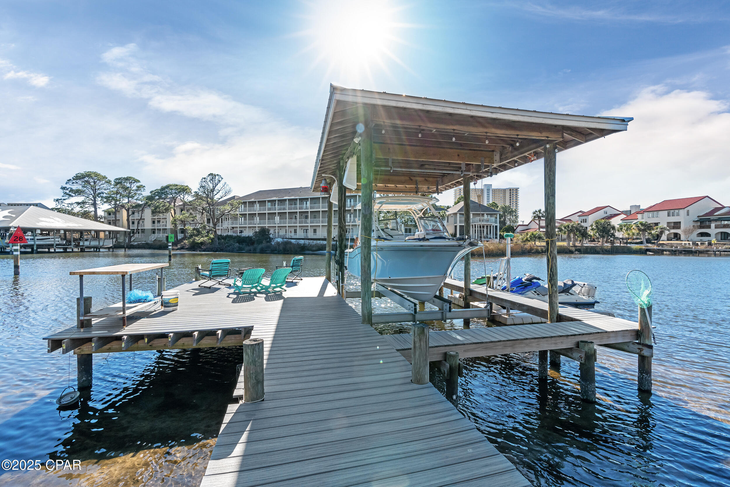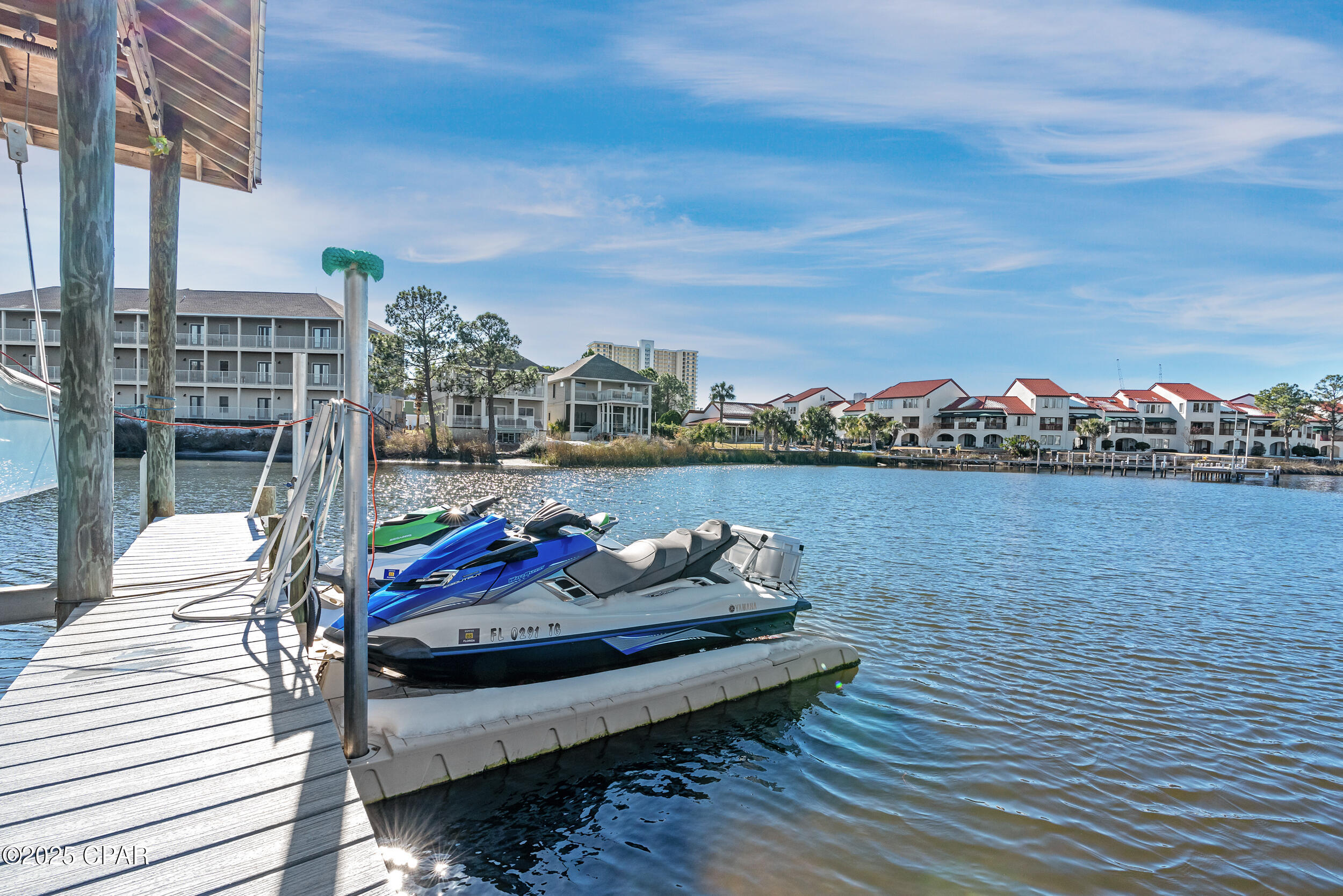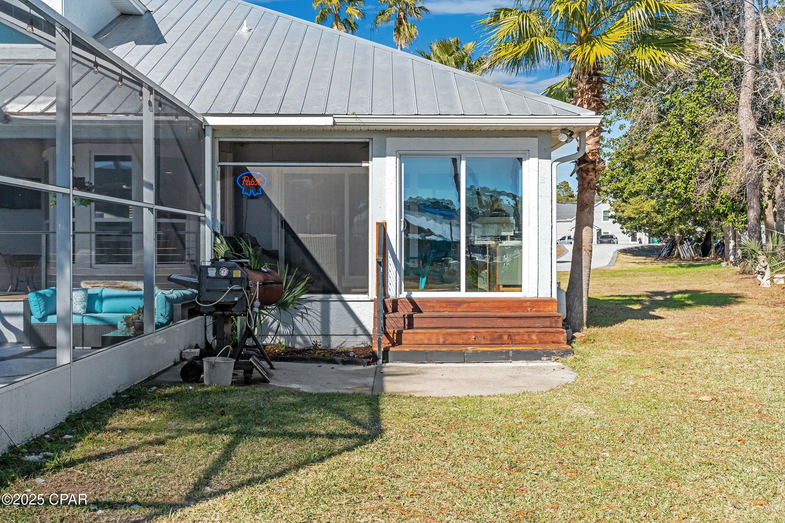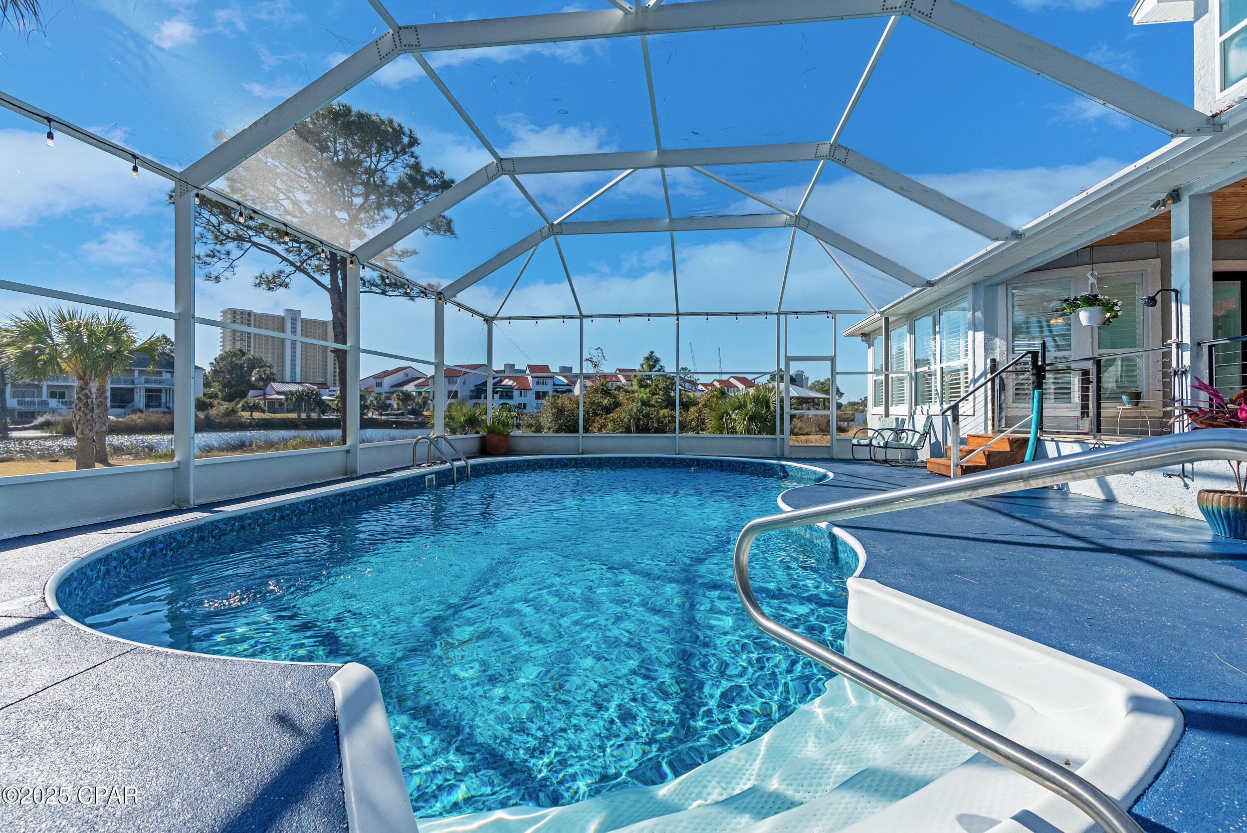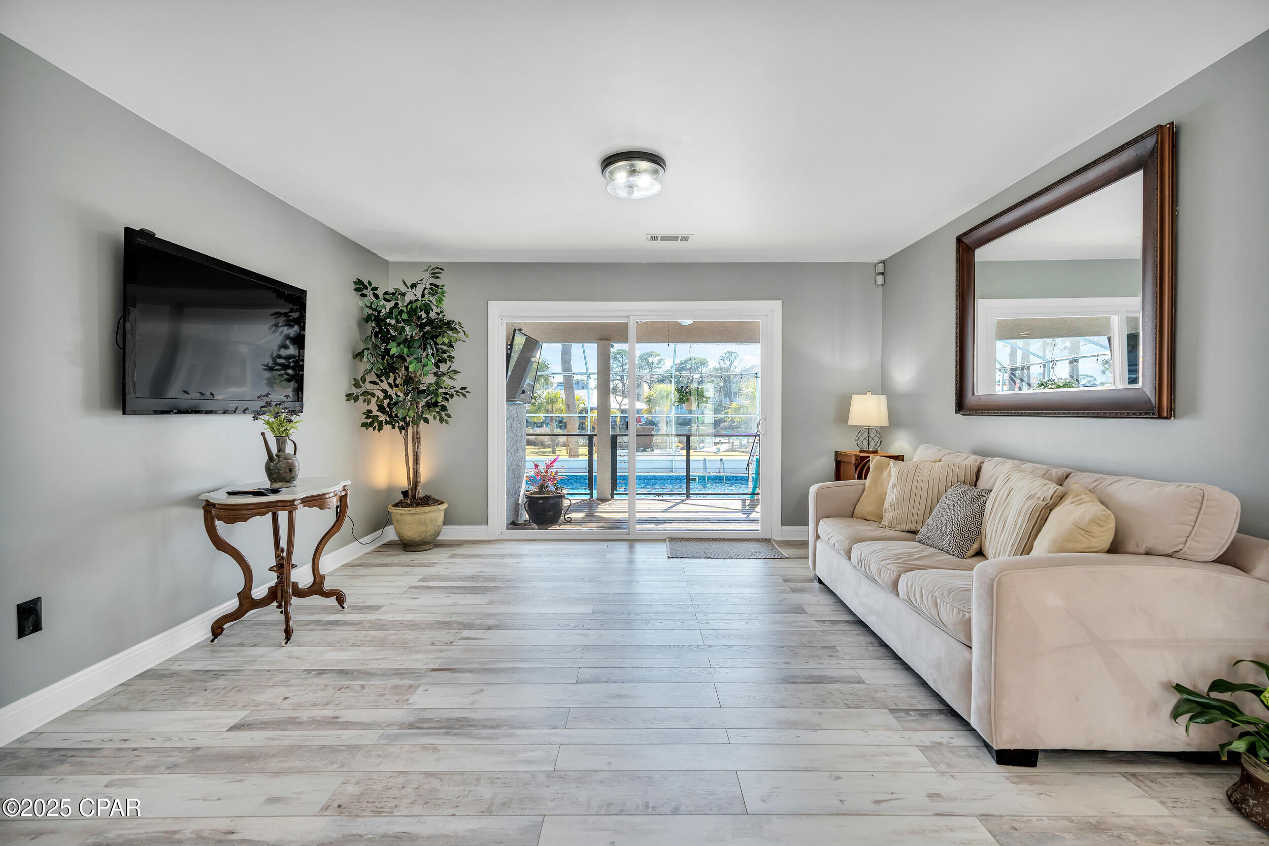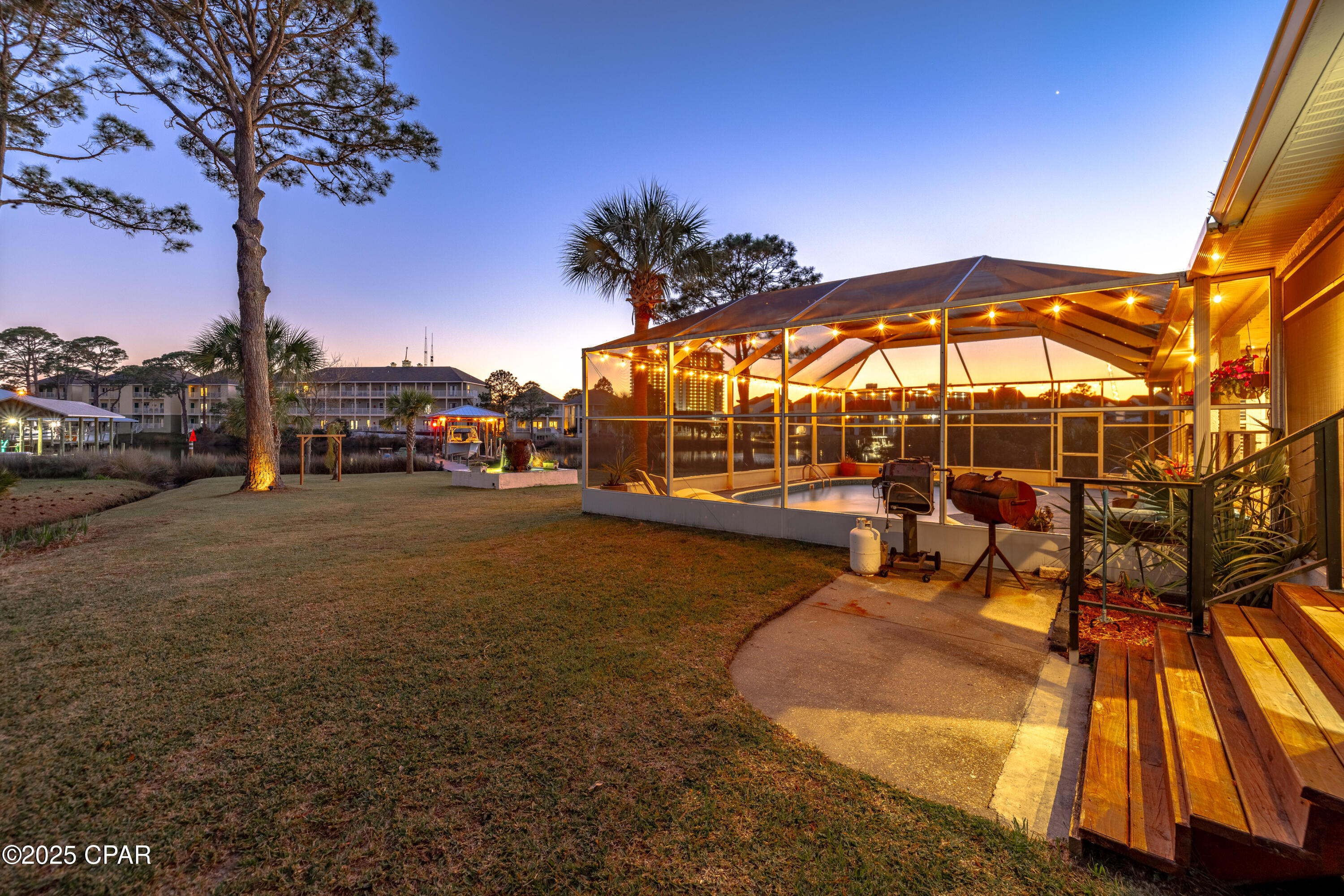 **WATERFRONT WITH GULF ACCESS** PRICED TO MOVE** ALL UPDATES DONE IN THE LAST THREE YEARS** Tucked away beneath a breathtaking canopy of towering Live Oaks, this exceptional waterfront estate creates a dramatic and lasting first impression. Offering the rare combination of private Gulf access and proximity to the beach, it provides the best of both worlds - launch your boat from your own dock or take a short stroll to Panama City Beach's sugar-white sands via Beach Access 24. Despite its serene waterfront setting, this home is located in the heart of PCB, keeping you just minutes from the area's best dining, shopping, and entertainment. A beautifully designed circular driveway, finished with high-end pavers and framed by lush greenery, sets the stage for the elegance within. Step inside to a refined yet inviting interior, where vaulted ceilings and an open-concept layout enhance the sense of space and light. Luxury vinyl plank flooring flows seamlessly throughout, leading to five generously sized bedrooms - each with a private bath featuring quartz counters, marble tile, and shiplap accents. The master suite is a true sanctuary, boasting a spa-like bath with a marble soaking tub and a walk-in glass shower. The kitchen impresses with an oversized island and bar, marble counters, stainless appliances, ample cabinets, and a striking ceiling pot rack, all offering style and functionality. A charming breakfast nook overlooks the lagoon and resort-style enclosed pool area, complete with a cabana, bath, and outdoor kitchen - perfect for effortless alfresco entertaining. The expansive backyard is a true waterfront oasis, offering plenty of space to relax, entertain, fish off the dock, or simply take in the views. Beyond, an updated boat dock with a 12,000 lb lift invites you to explore the area, with the Gulf just minutes away via the iconic Grand Lagoon. This is more than just a house - it's a dream home where lifelong memories are made. With short-term rentals allowed and no HOA, you'll have the flexibility to make it your full-time residence while still having options for the future. Schedule your private tour today and experience the best of Panama City Beach living.