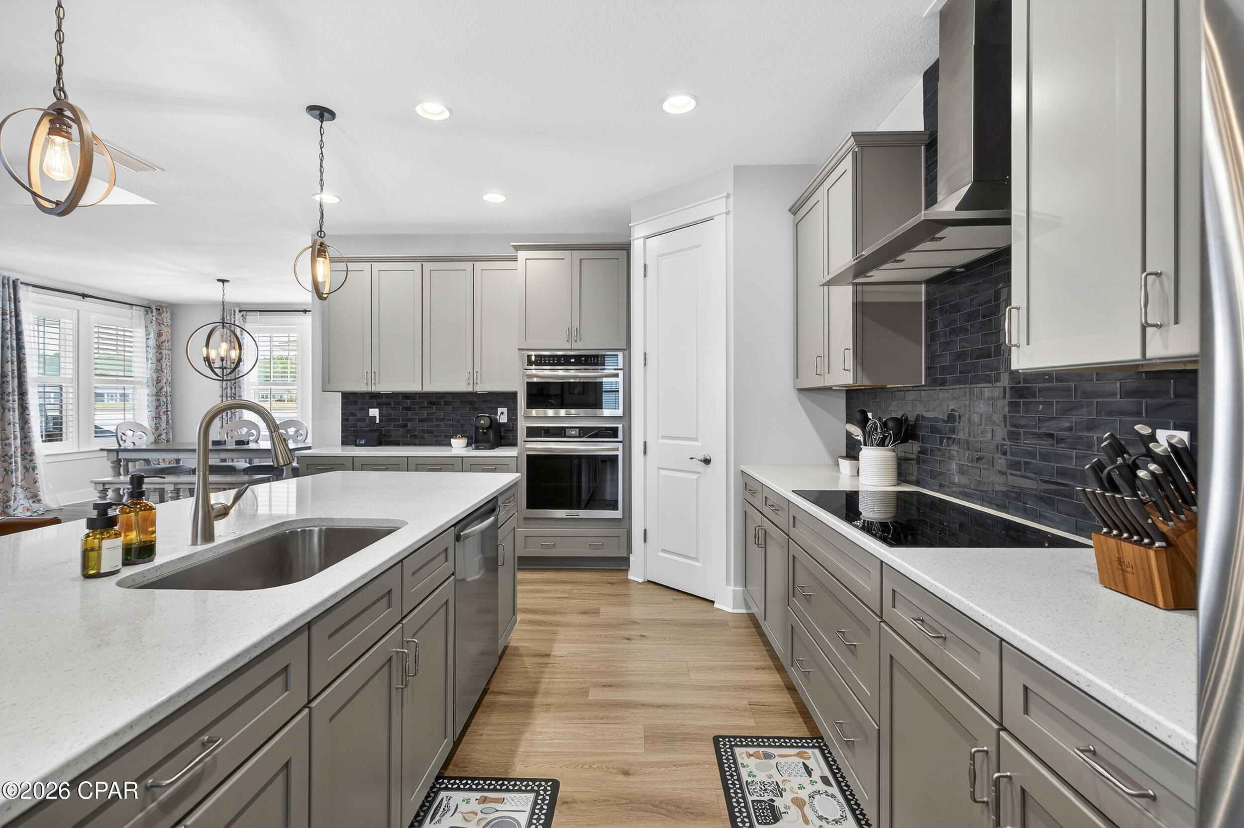 The open-concept design connects the family room and dining area seamlessly to the gourmet kitchen, creating a bright, central gathering space. An oversized pantry with custom shelving, quartz island, stainless appliances, abundant cabinetry, and an induction cooktop (with both gas and electric connections in place) provide flexibility and performance for everyday living or entertaining.