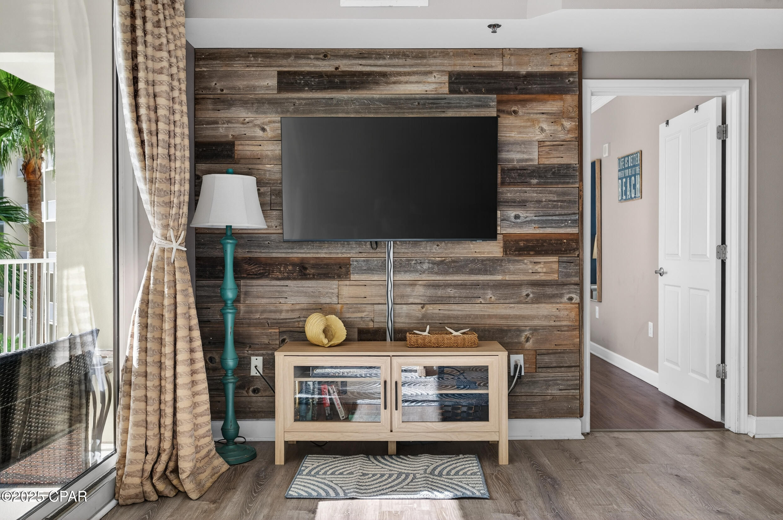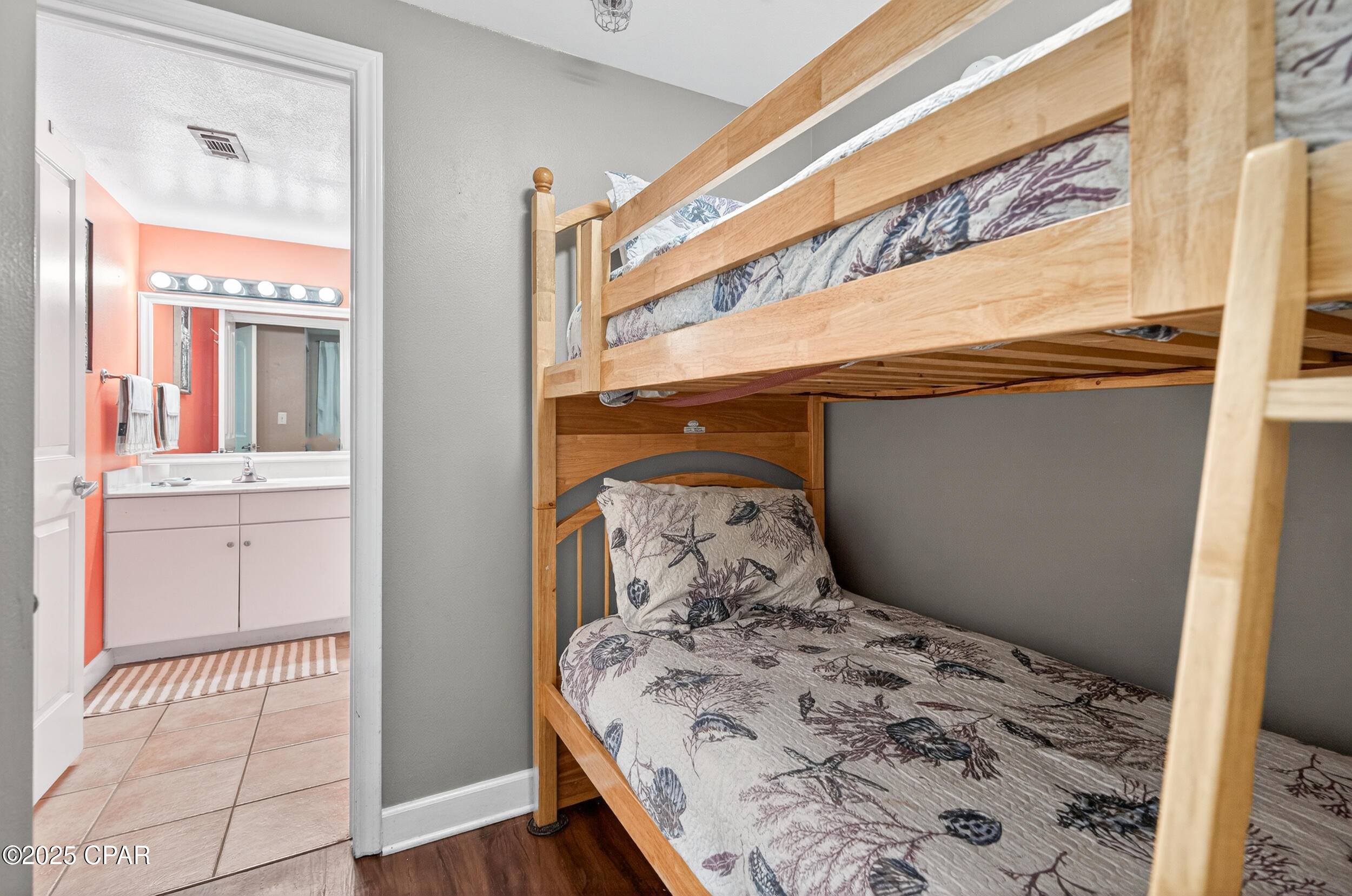 The living room and primary suite open to the oversized 30+ ft balcony, wrapping along two sides of the unit with unobstructed views of emerald gulf waters and the lagoon-style pool. The bunk area has its own door, creating a private sleeping space that functions almost like a second bedroom. Its low-floor location provides quick access to parking, amenities, and the beach - making it both convenient and popular with renters. The condo has been updated with hard-surface flooring throughout - wood-look in the living areas and bedrooms, tile in the kitchen and baths for easy upkeep and a reclaimed wood accent wall adds warmth and character.