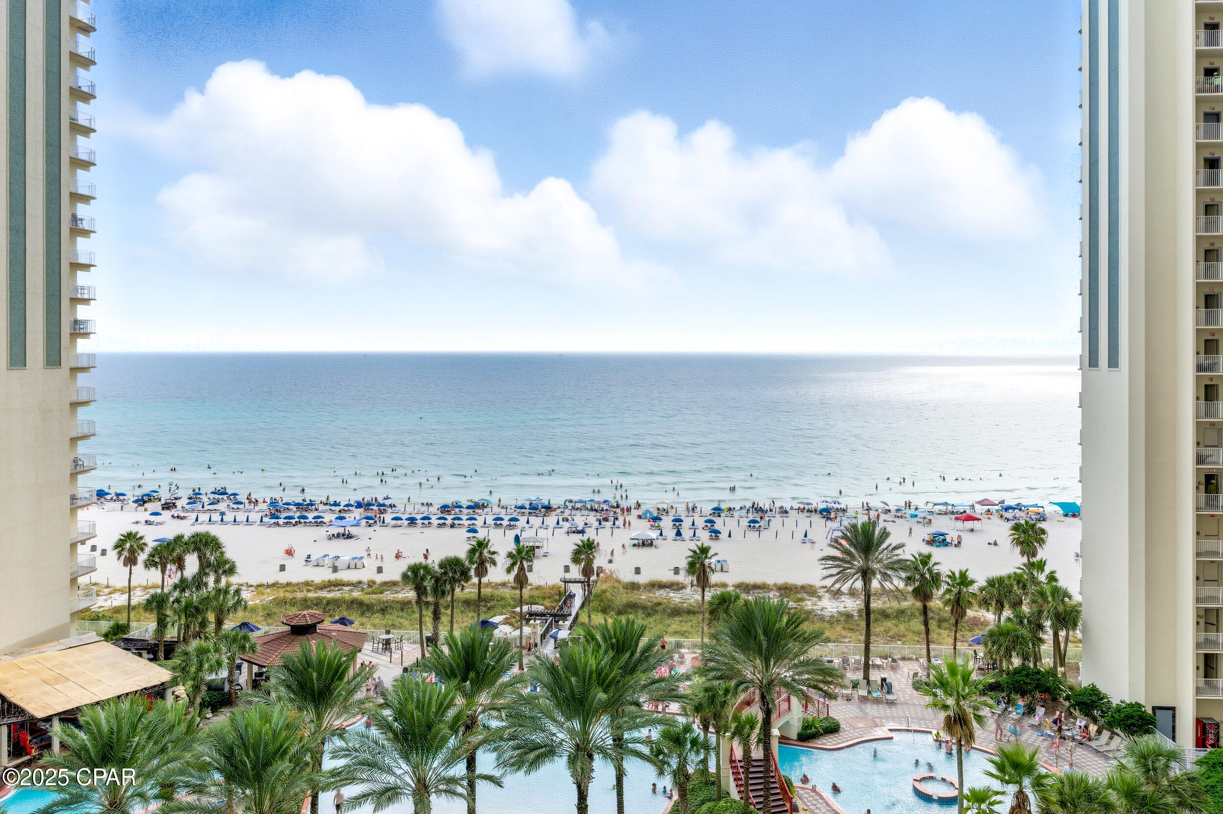 Enjoy stunning gulf views and relaxed coastal living in this 2BR/2BA Shores of Panama condo. This highly popular ''C'' floor plan features floor-to-ceiling windows that fill the space with natural light and open to an extra-wide balcony overlooking the beach and tropical pool. The gulf-front master bedroom has a private ensuite, and the second bedroom plus living area comfortably sleep up to six guests. The bright, modern kitchen offers quartz countertops, white cabinets, a bar counter, and stainless appliances, complemented by tile flooring throughout for easy maintenance. Recent updates include new toilets (March 2025), beds (May 2025), HVAC (July 2025), and stacked washer and dryer (August 2025). The unit comes fully furnished in a relaxed coastal style with one assigned parking spot.